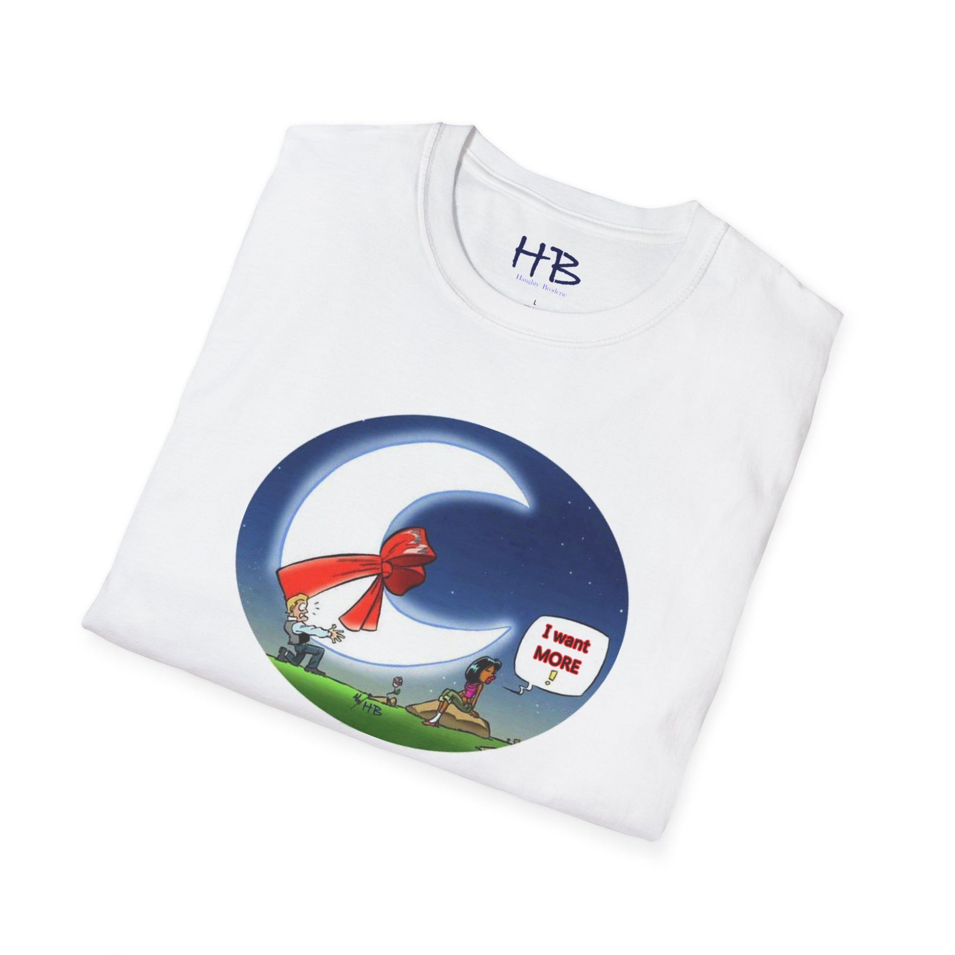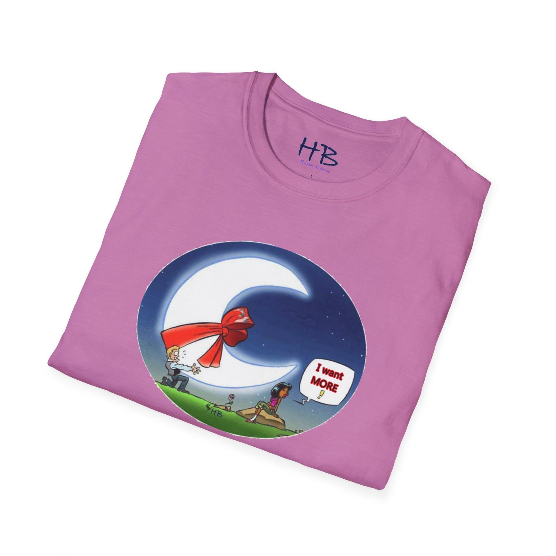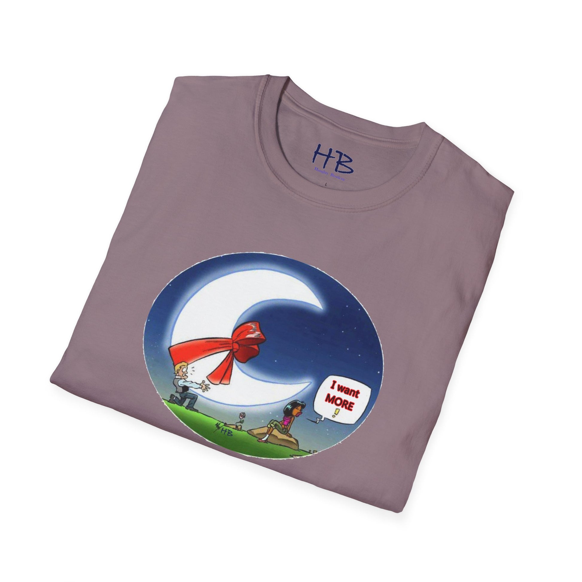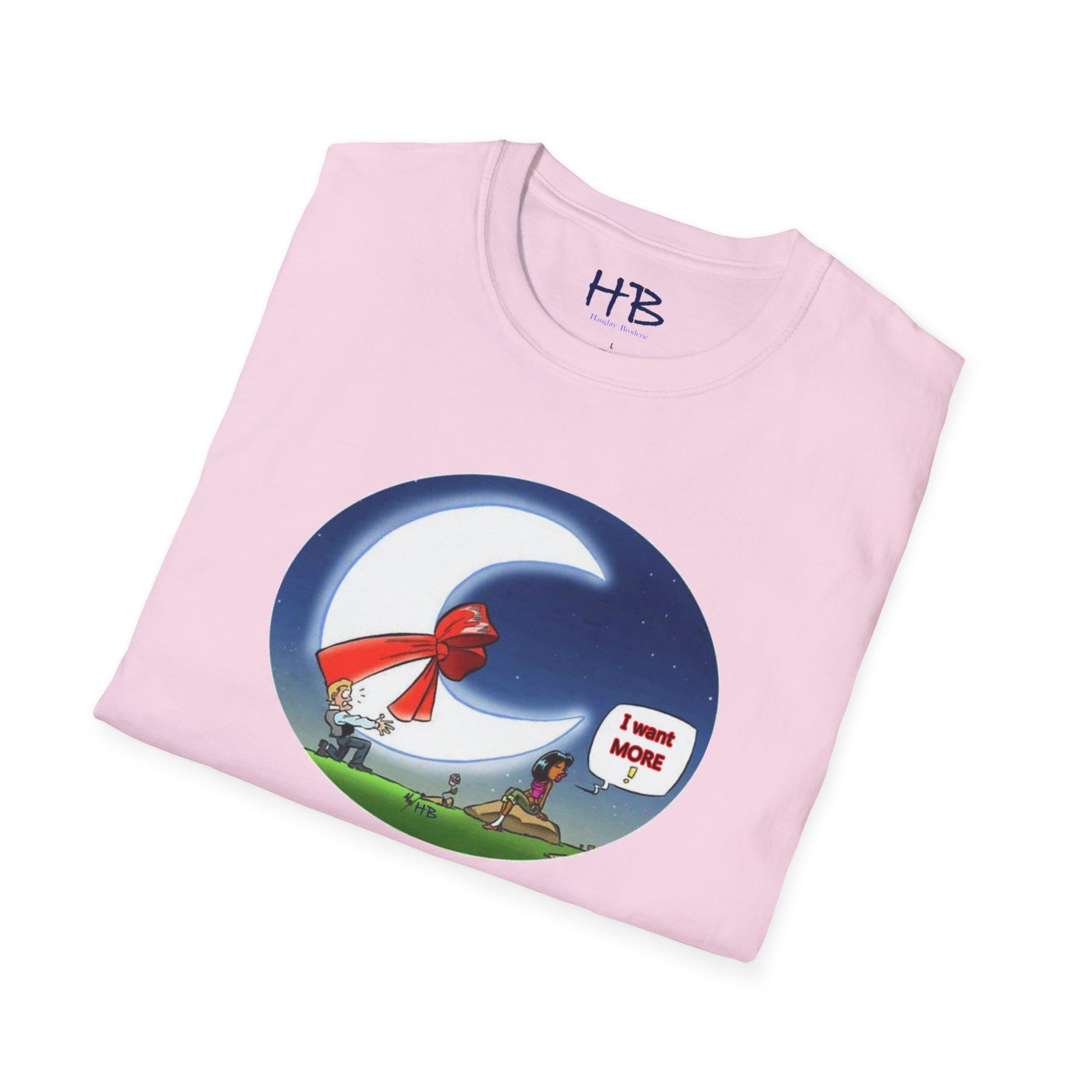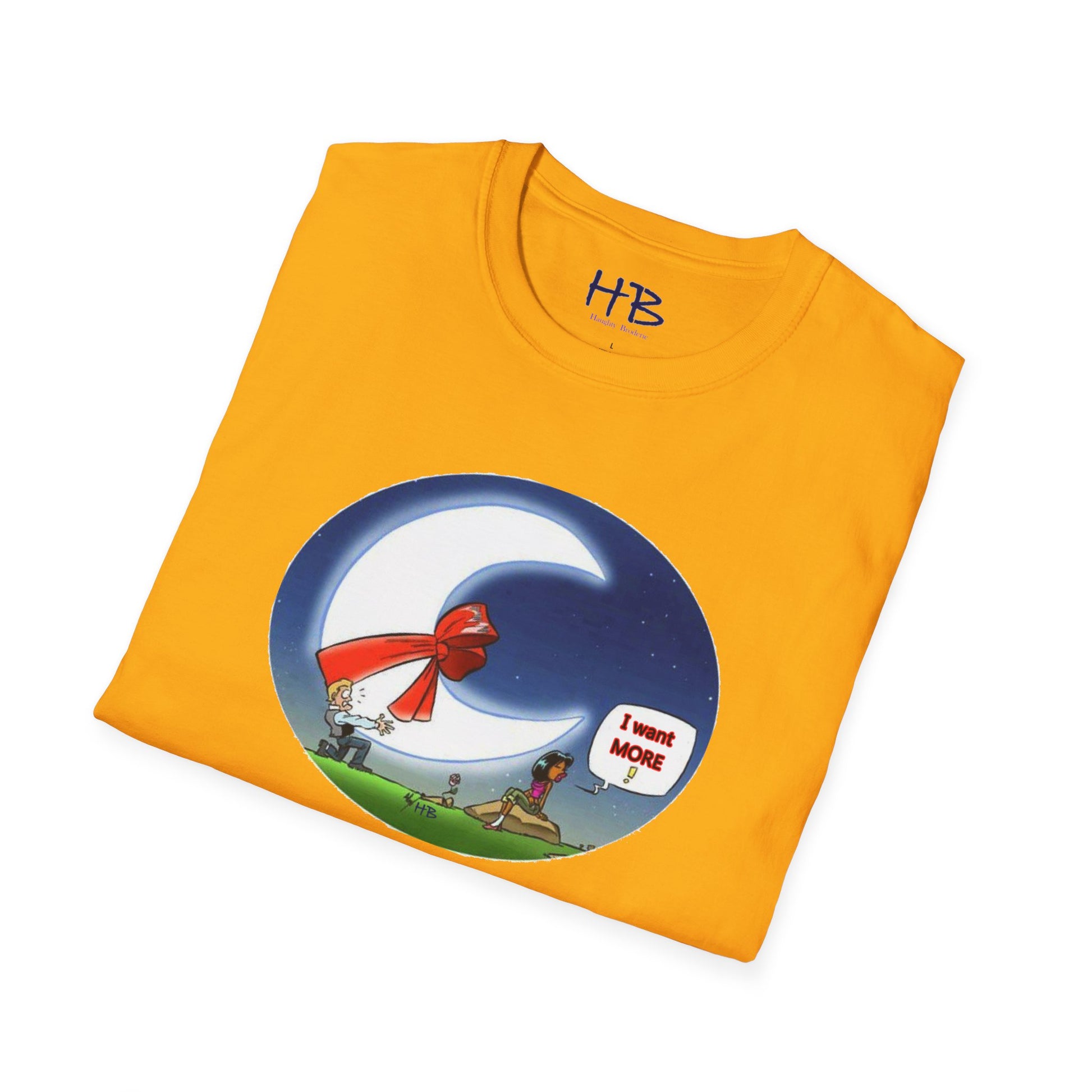 The shirt features a stunning image of a man on his knees, struggling to carry a GIGANTIC crescent moon adorned with a big red gift bow. The man offers this celestial gift to a pretty lady sitting on a rock, but to his dismay, she turns her head away from him and screams, "I WANT MORE!!"