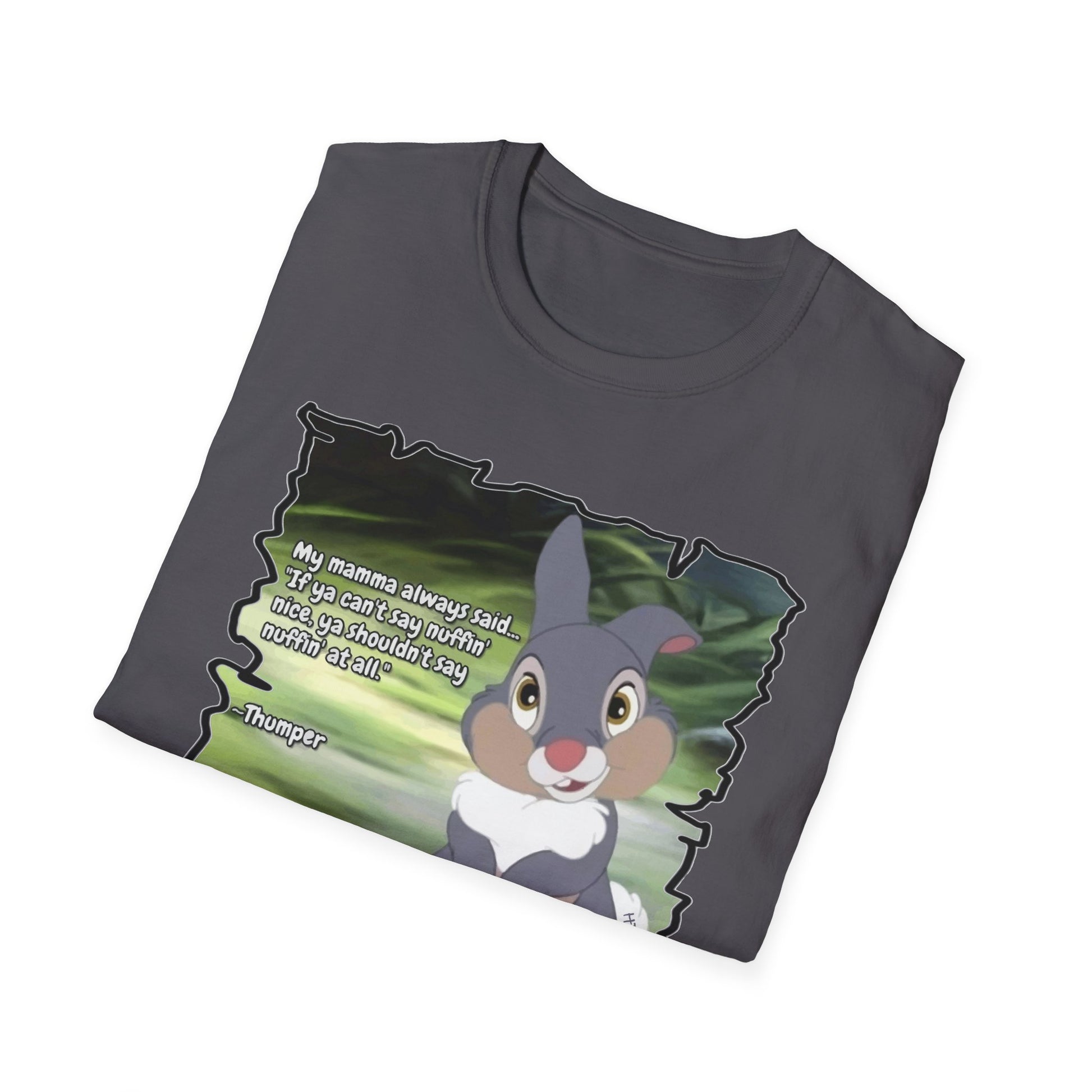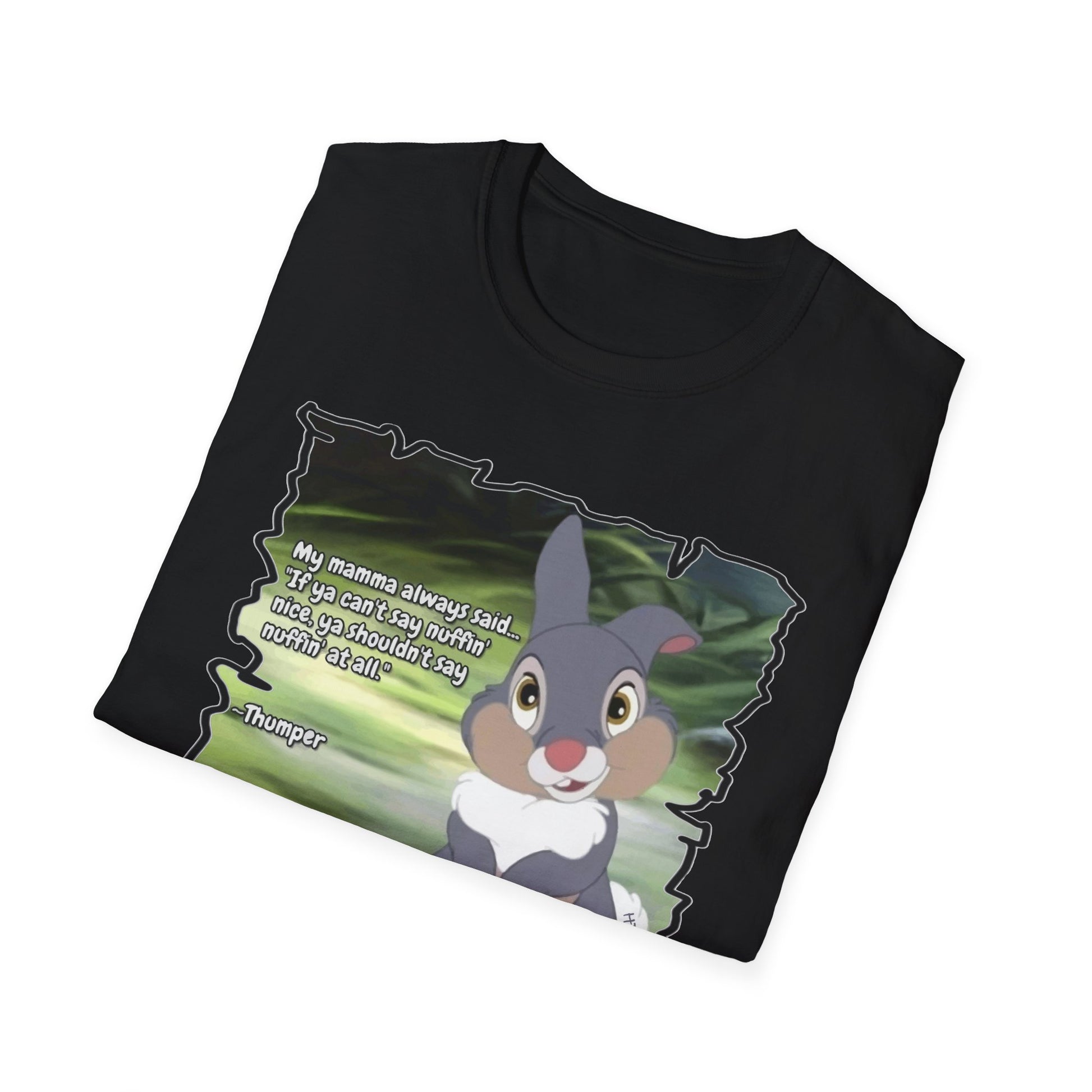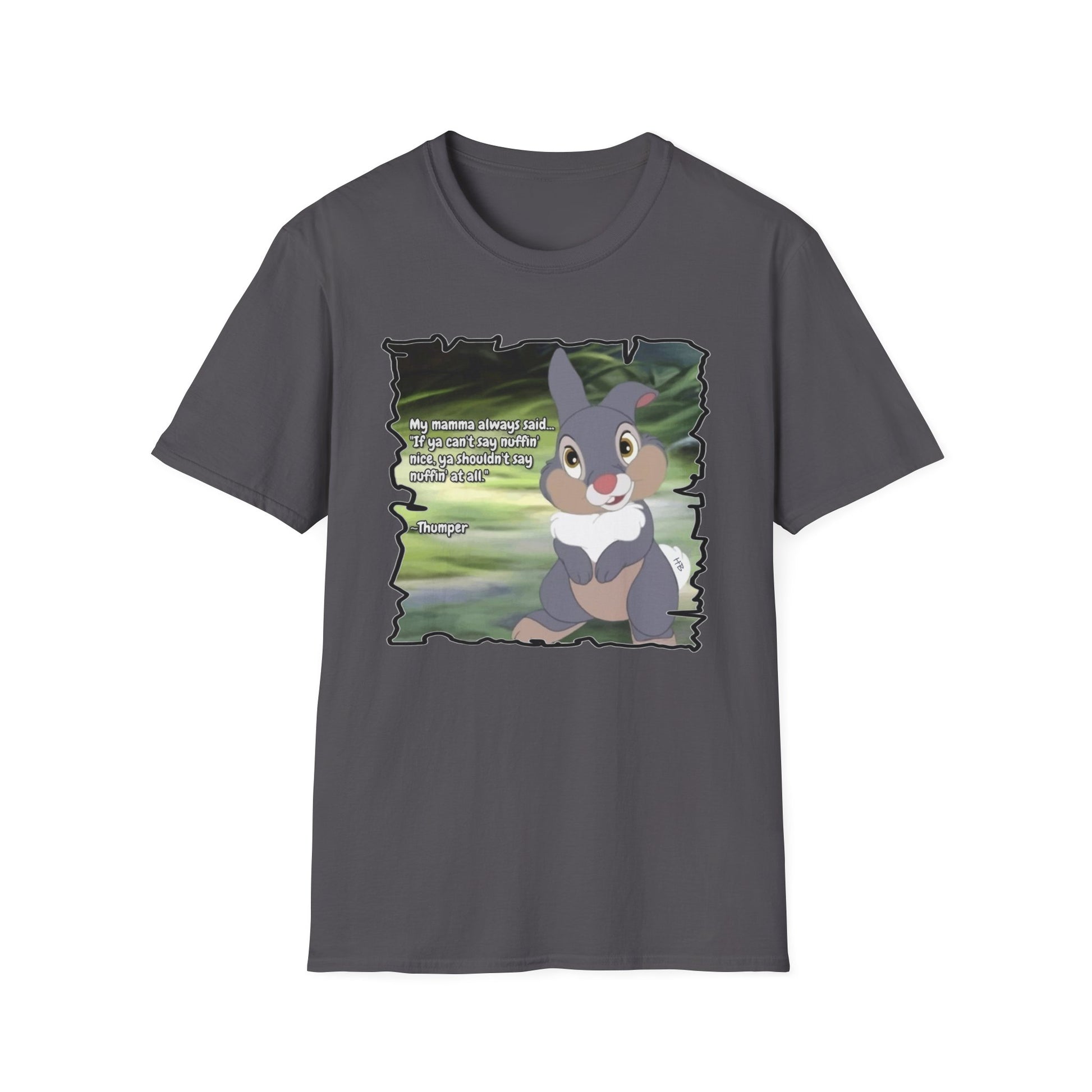 Introducing our latest addition to the collection - a fantastic tee shirt featuring none other than the adored cartoon hare Thumper, alongside a charming message that reads "My mama always said.... 'If ya can't say nuffin' nice, ya shouldn't says nuffin' at all" If you cannot articulate anything positive, it's best to remain silent. This soft and comfortable t-shirt is a must-have for all Thumper enthusiasts, complete with a delightful depiction of the iconic rabbit in all his glory. the sentence contains a subtle nod to the importance of empathy and consideration for others. By suggesting that silence is preferable to negative speech, the sentence acknowledges the potential harm that thoughtless or hurtful words can cause to those around us.