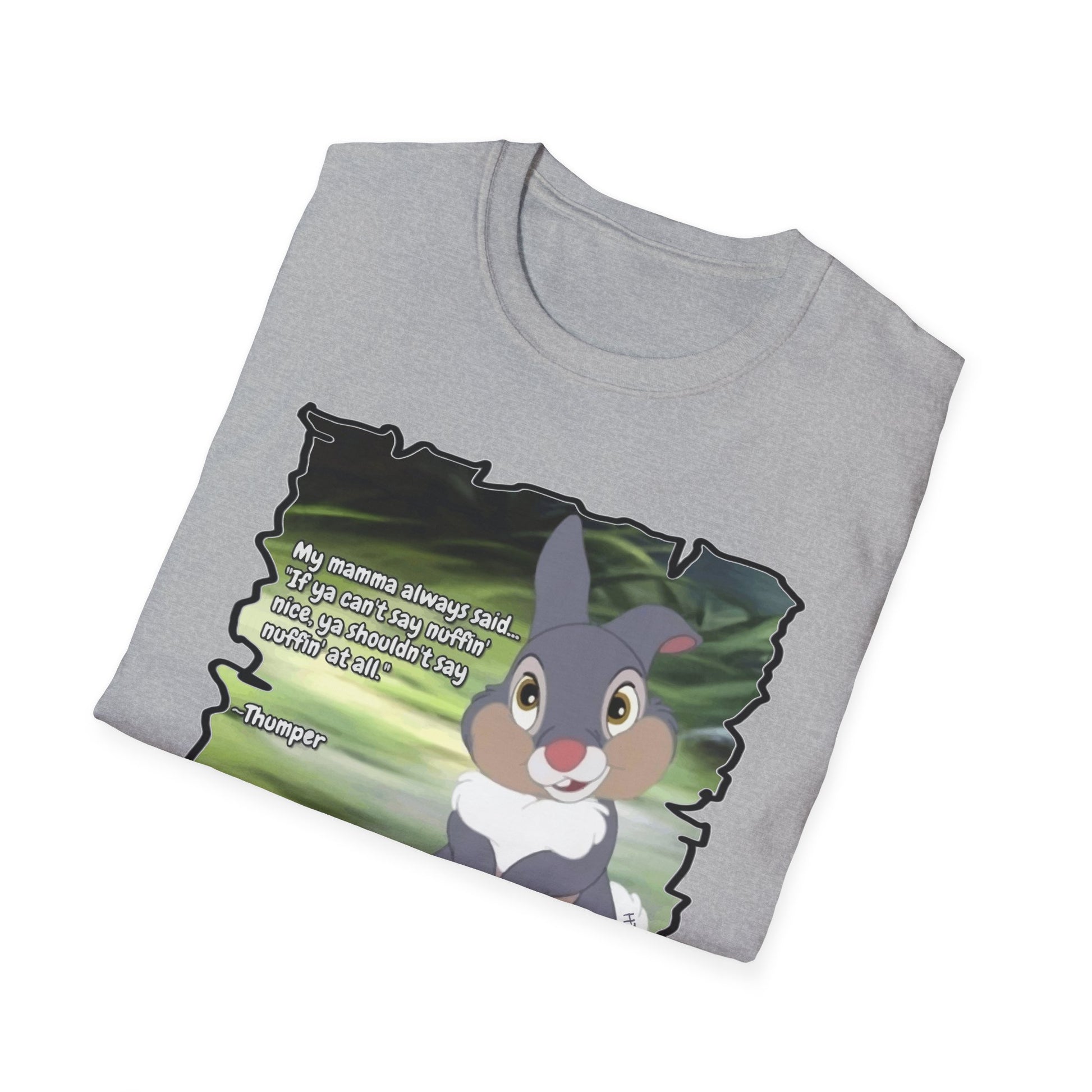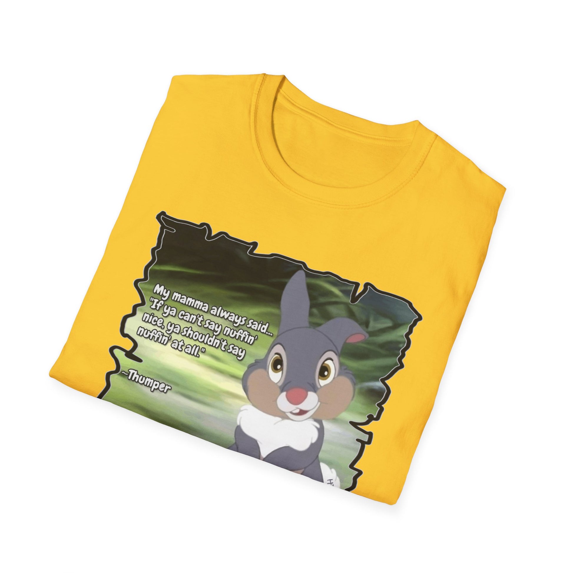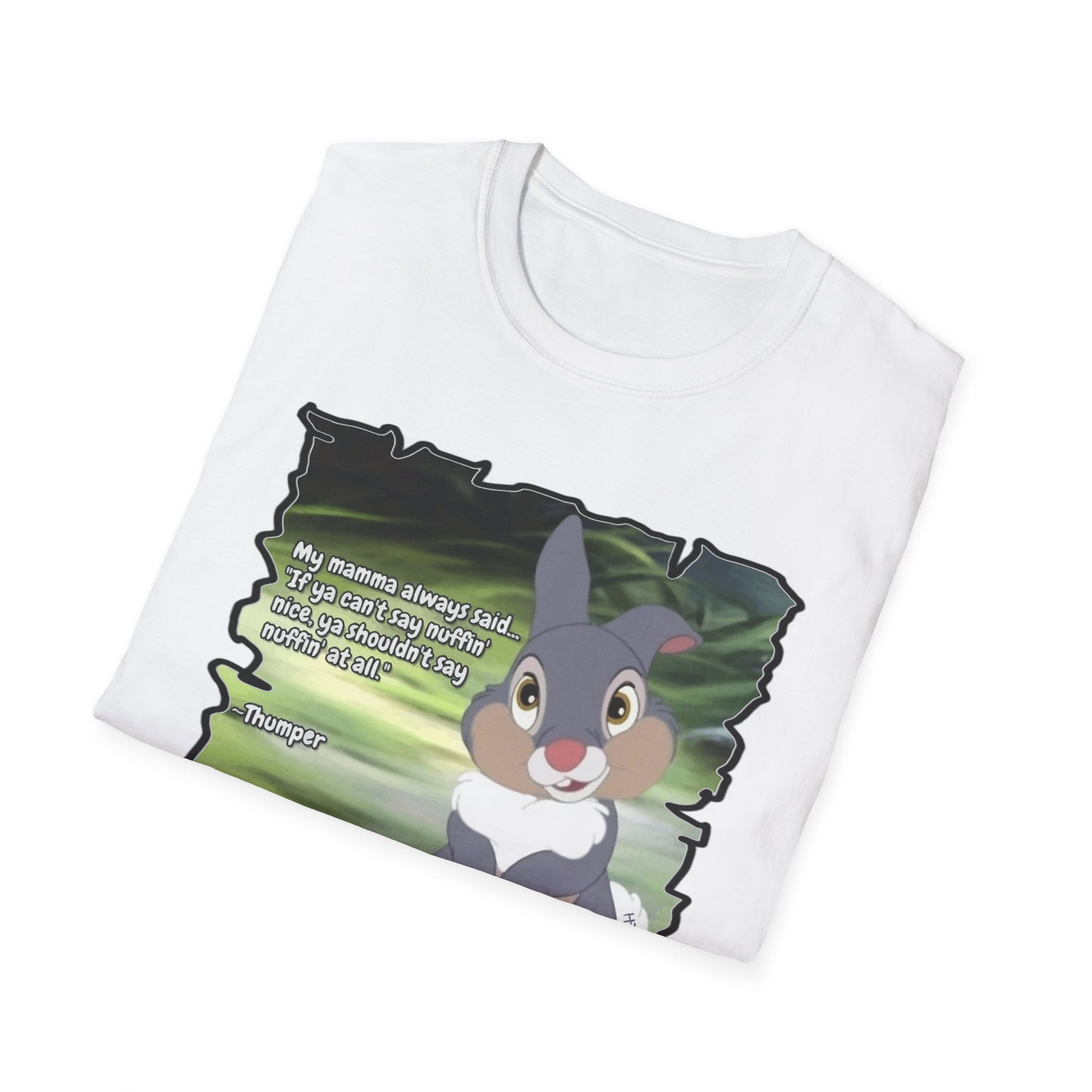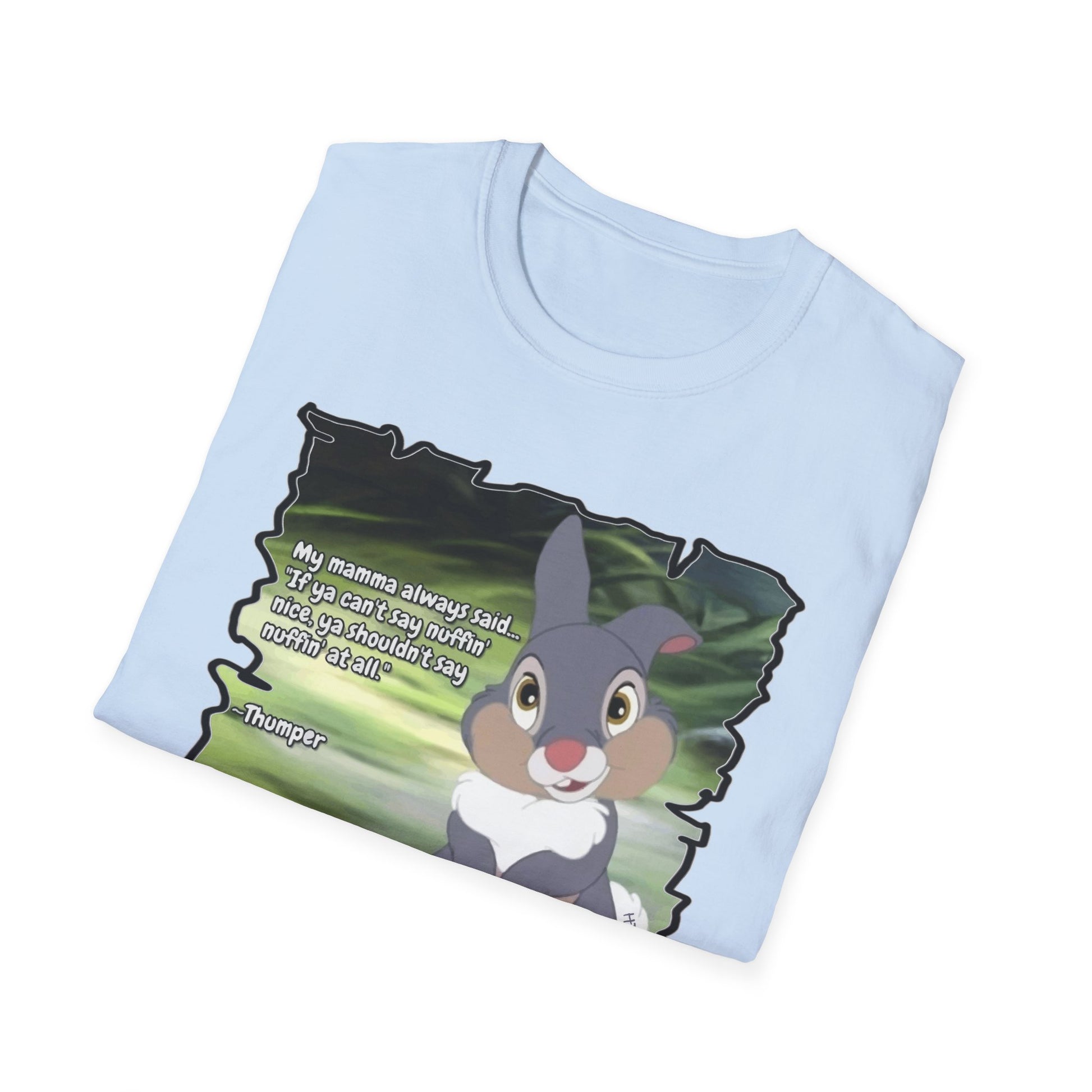 Introducing our latest addition to the collection - a fantastic tee shirt featuring none other than the adored cartoon hare Thumper, alongside a charming message that reads "My mama always said.... 'If ya can't say nuffin' nice, ya shouldn't says nuffin' at all" If you cannot articulate anything positive, it's best to remain silent. This soft and comfortable t-shirt is a must-have for all Thumper enthusiasts, complete with a delightful depiction of the iconic rabbit in all his glory. the sentence contains a subtle nod to the importance of empathy and consideration for others. By suggesting that silence is preferable to negative speech, the sentence acknowledges the potential harm that thoughtless or hurtful words can cause to those around us.