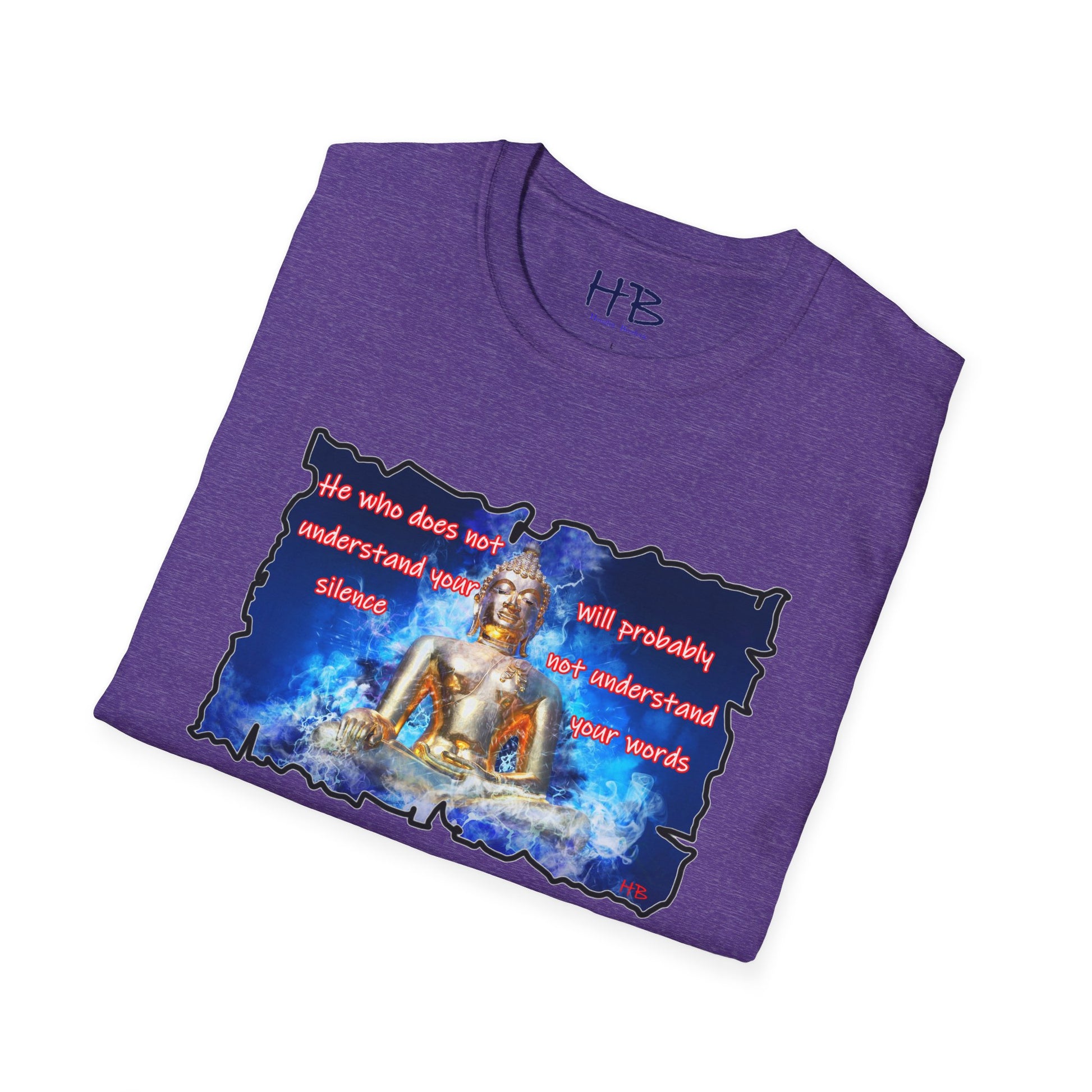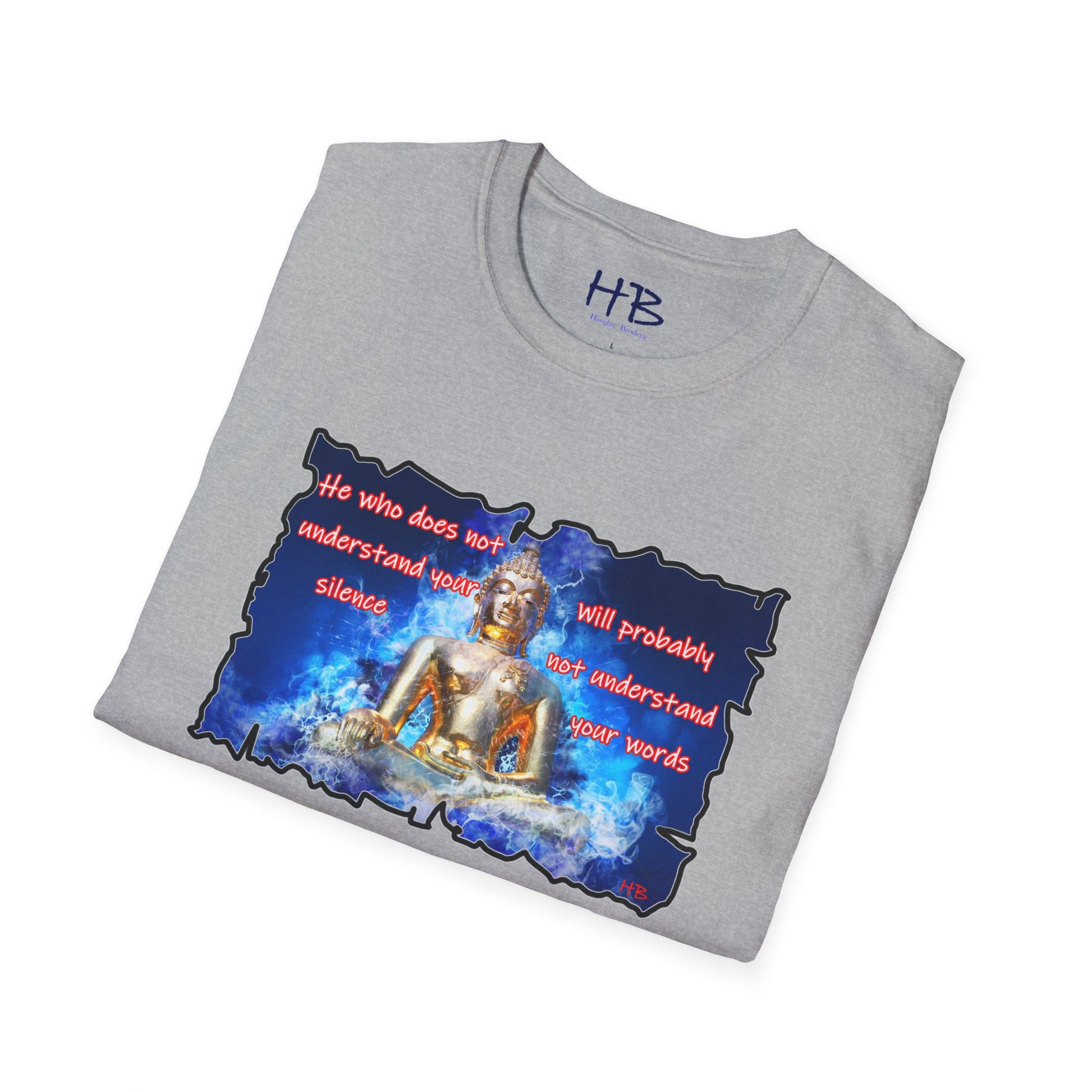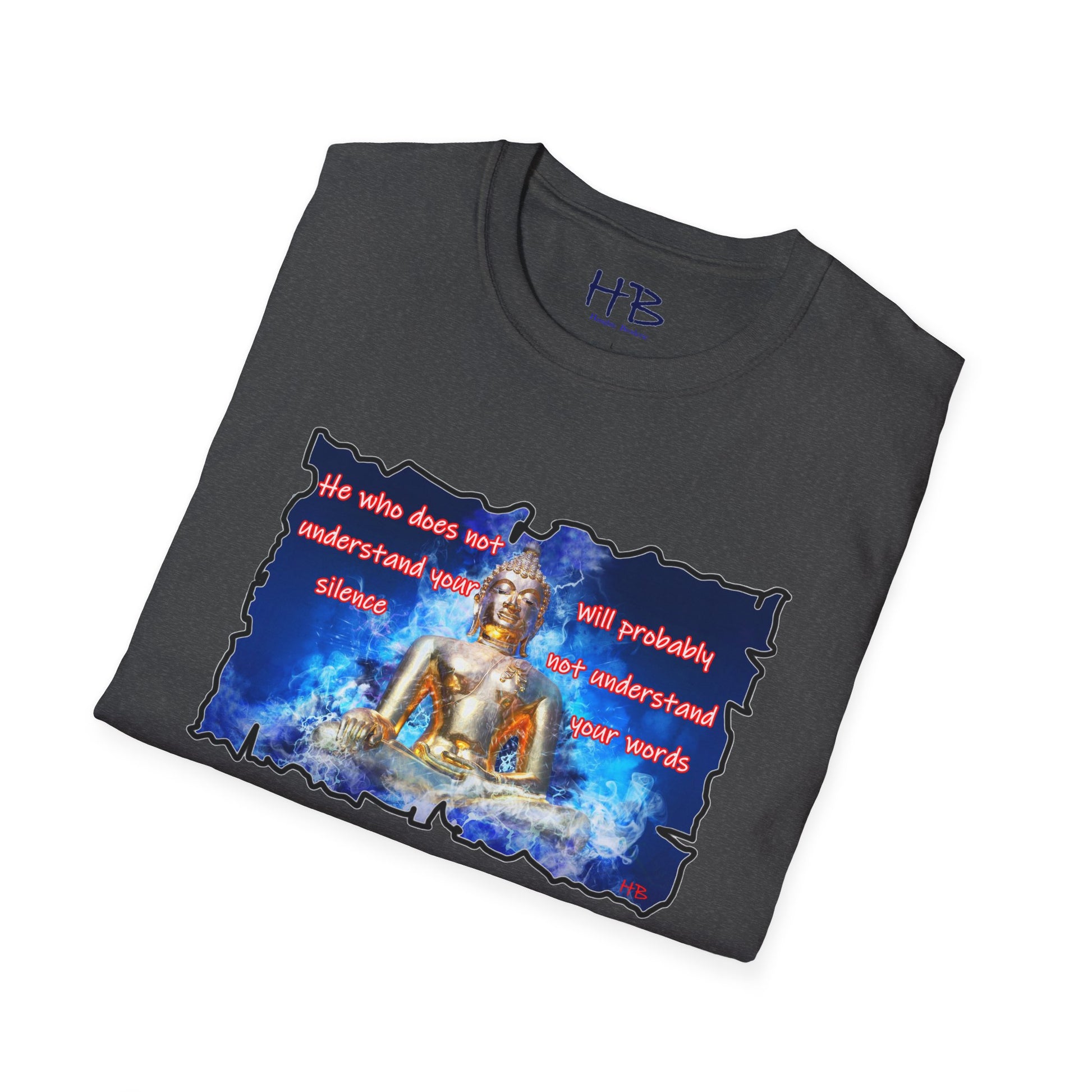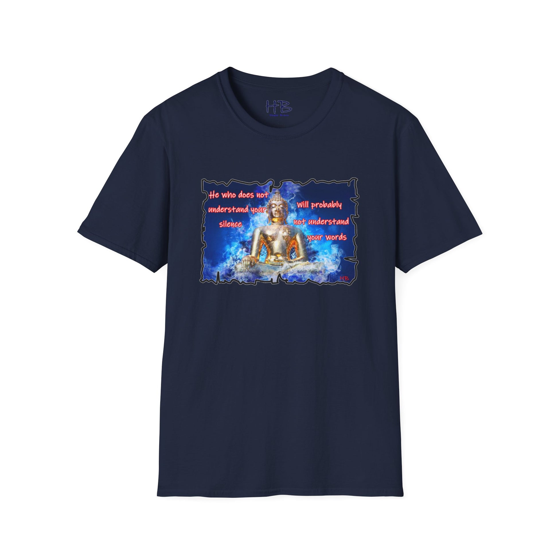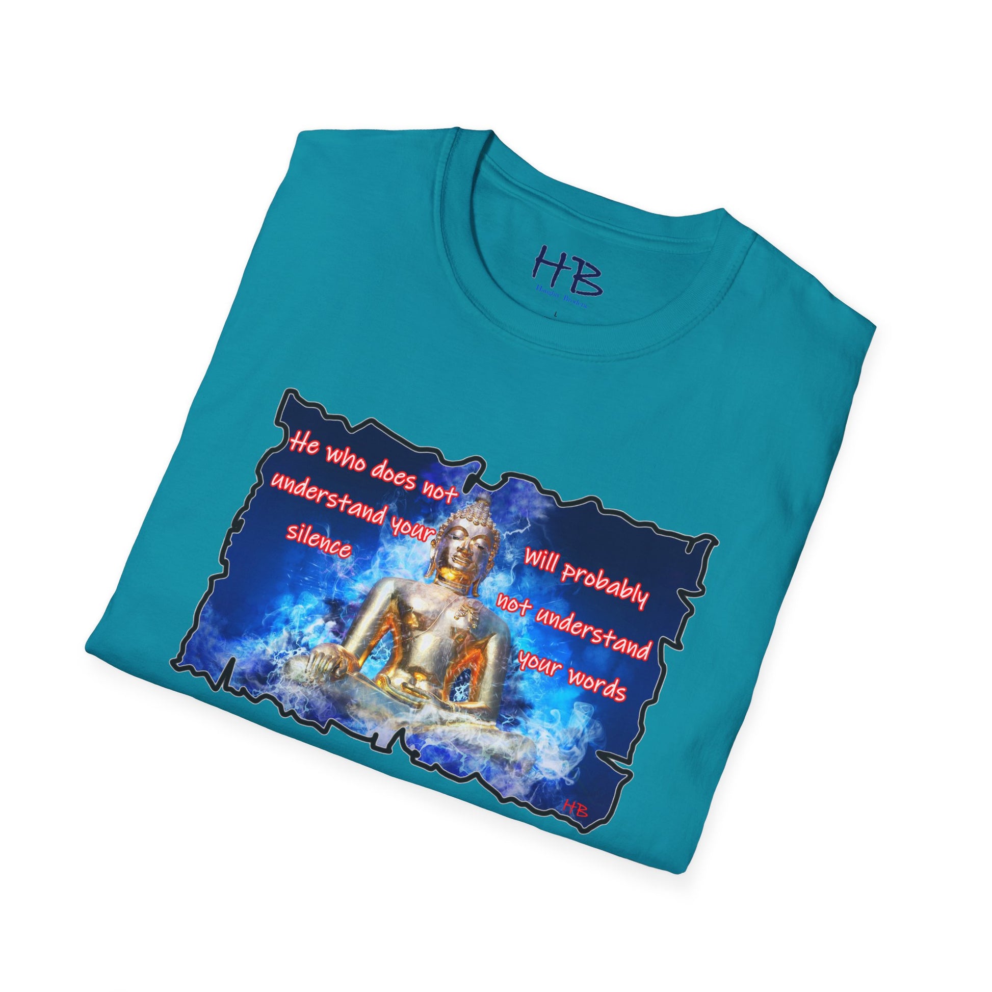Presenting our latest tee shirt design featuring an inspiring quote that reads "He who does not understand your silence, will probably not understand your words," alongside a serene statue of Buddha in the background.