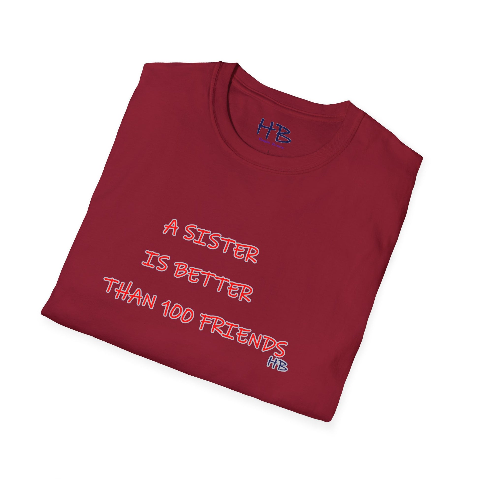 Introducing a fabulous garment adorned with a powerful visual message, this striking apparel proudly bears the inscription "A sister is better than 100 friends." This exquisite tee shirt encapsulates the essence of meaningful relationships, celebrating the extraordinary bond one shares with their sister.