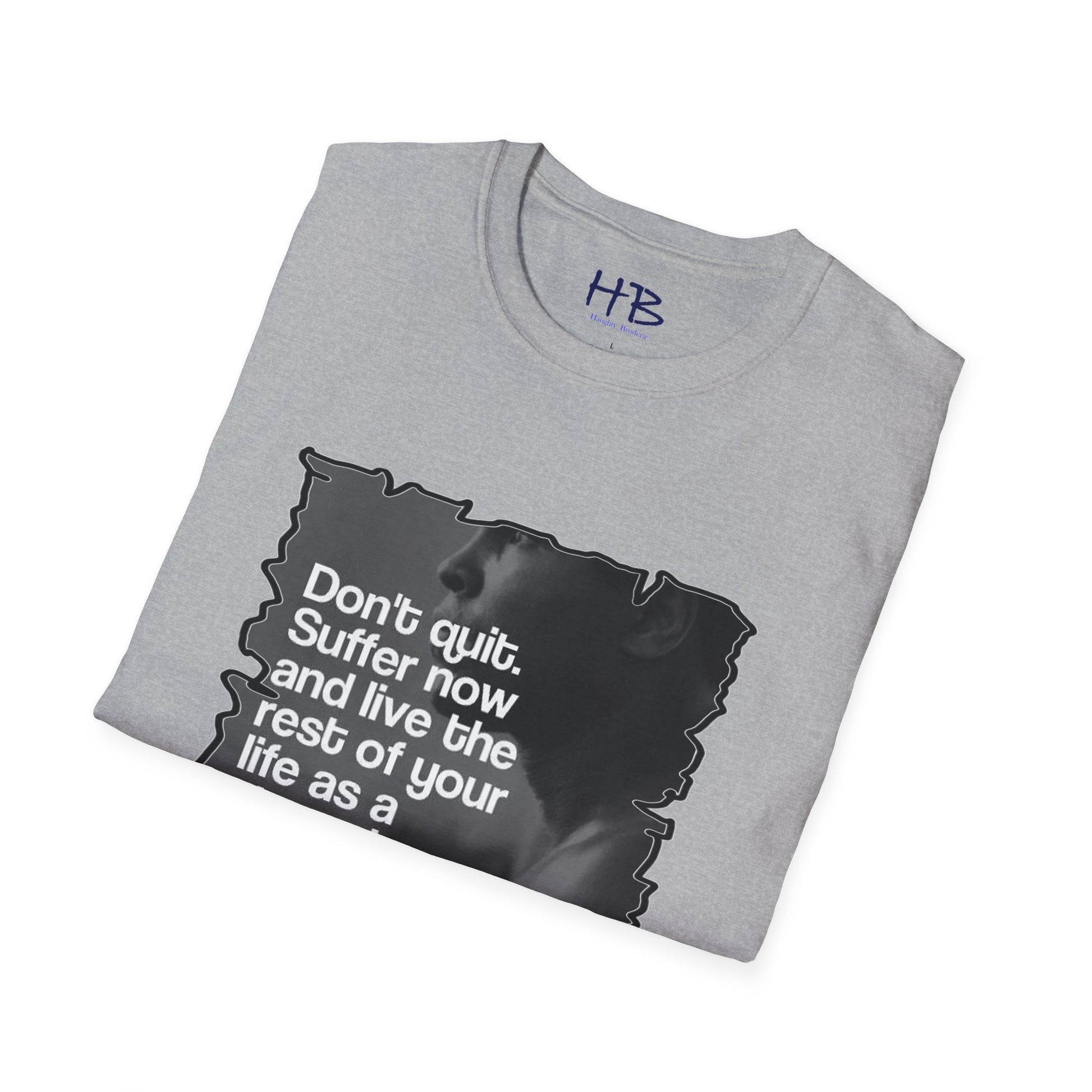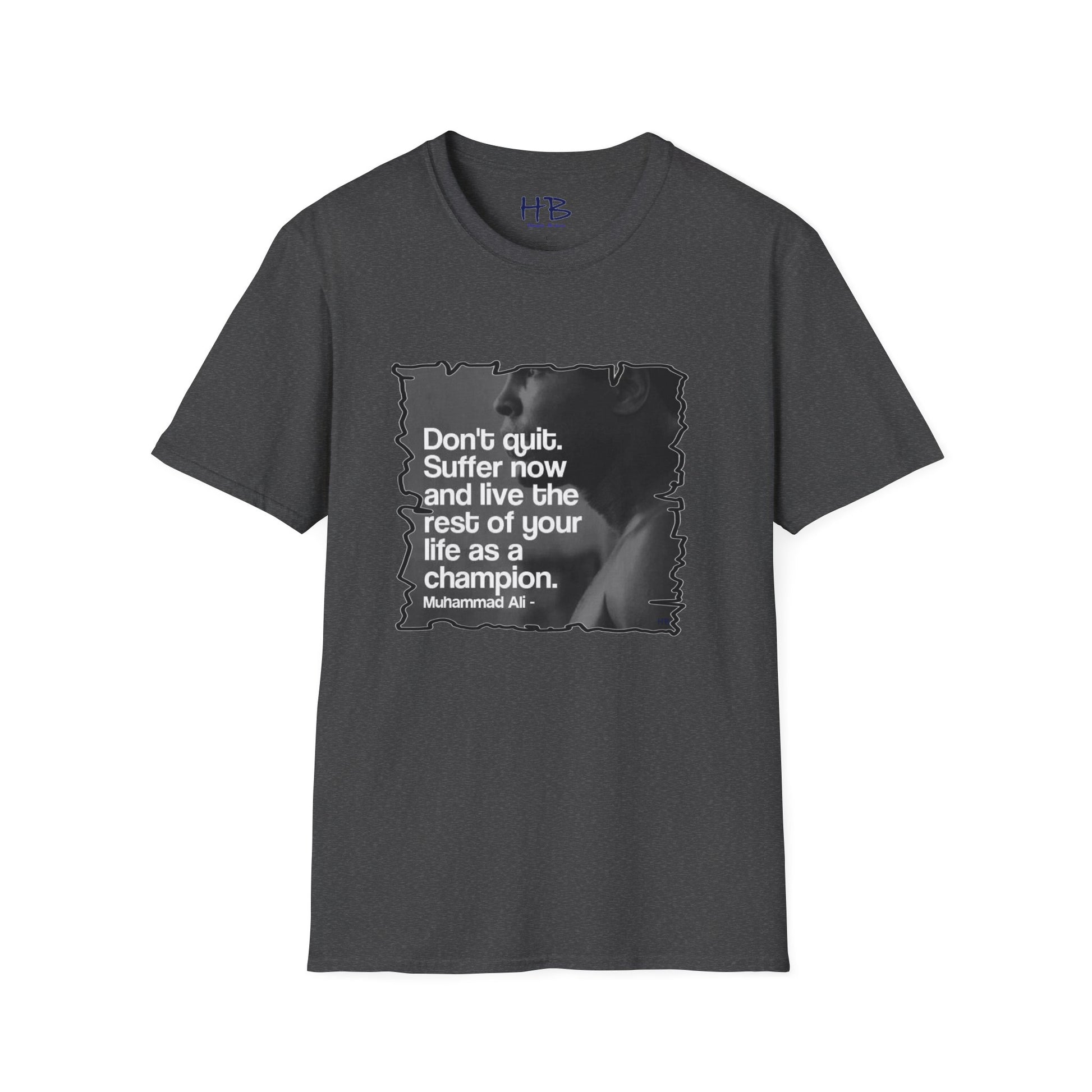Imagine a tee shirt that embodies the spirit of never giving up, beautifully showcasing the profound words of Muhammad Ali, "Don't quit. Suffer now and love the rest of your life as a champion." This profound quote serves as a reminder that one should never abandon their dreams or aspirations. It encapsulates the idea that enduring the hardships and struggles today will lead to a life filled with victory and glory tomorrow.