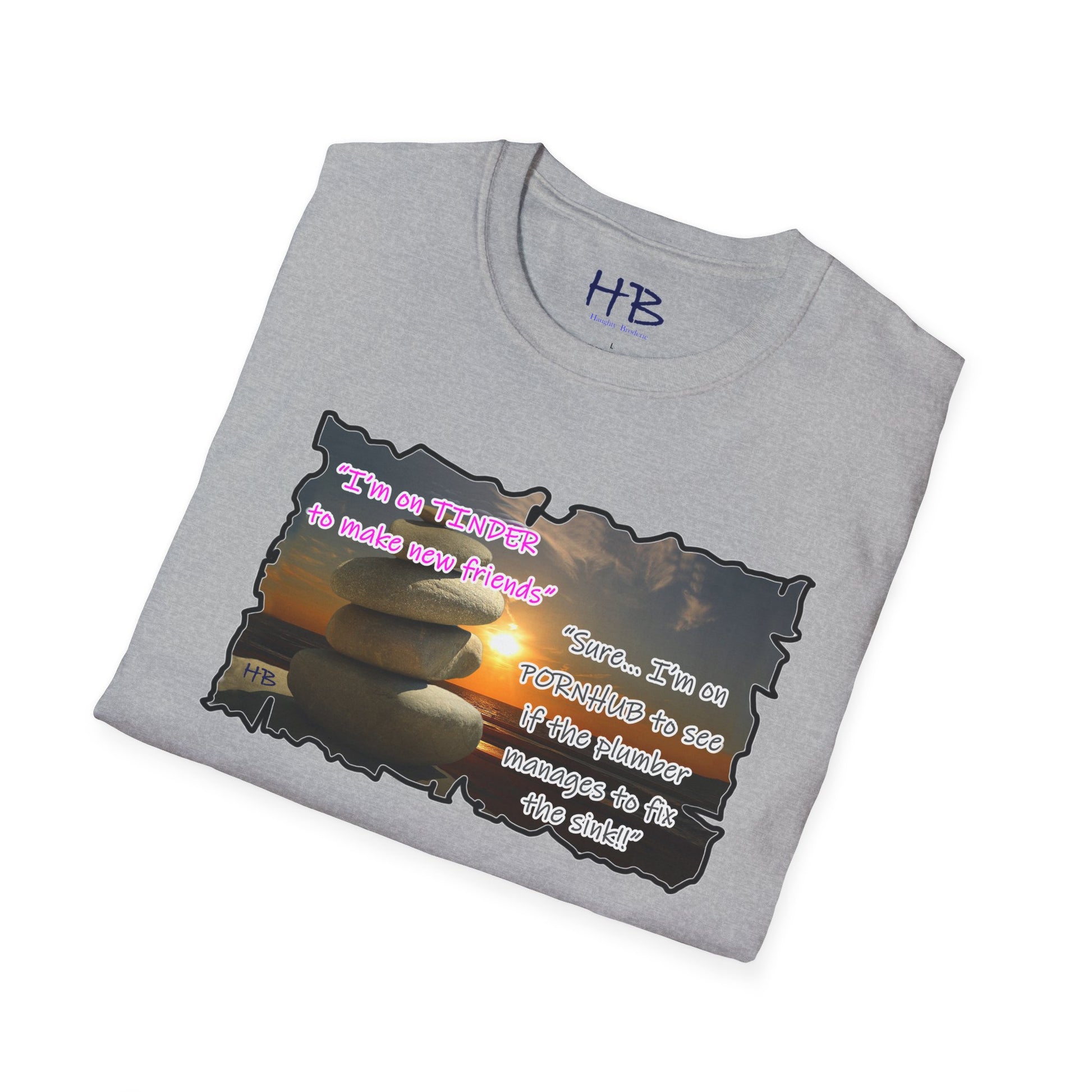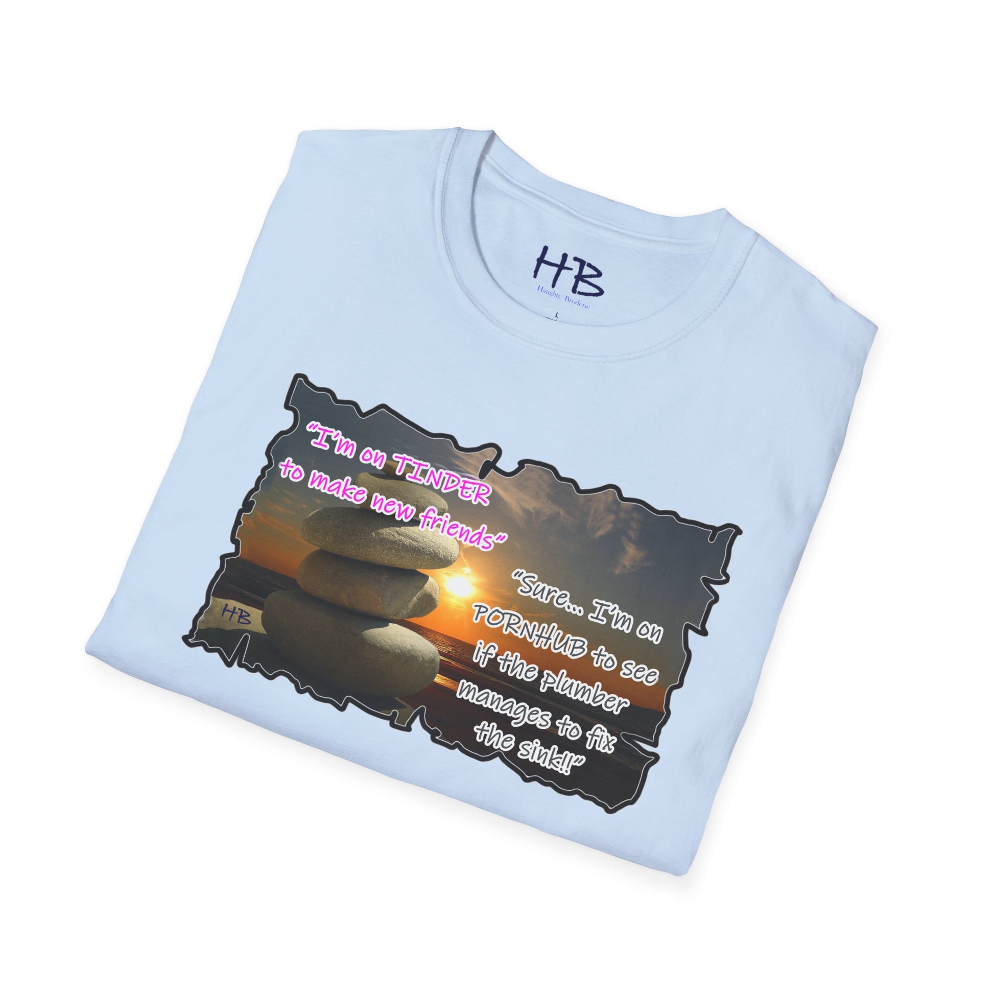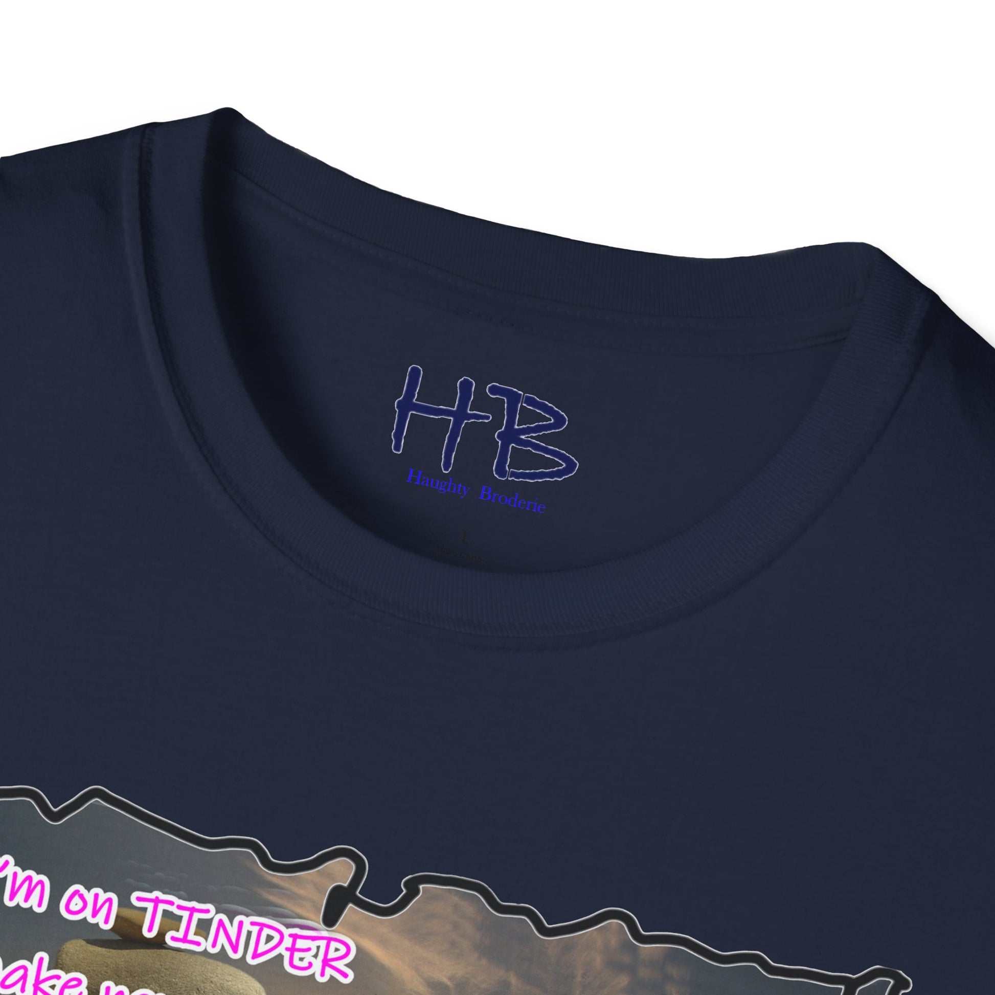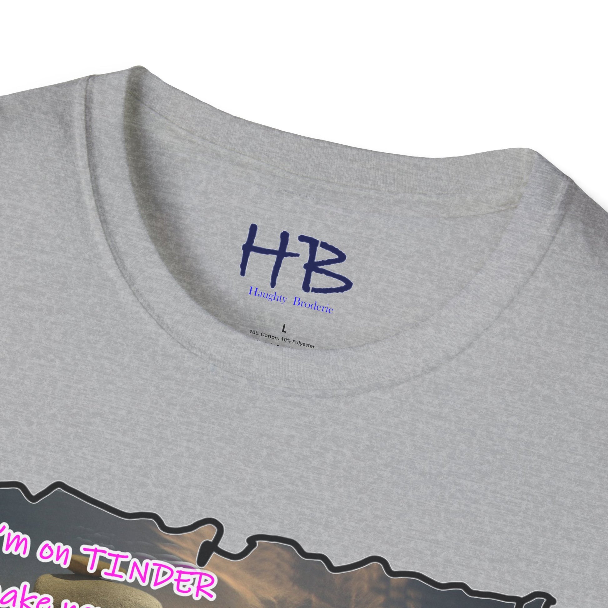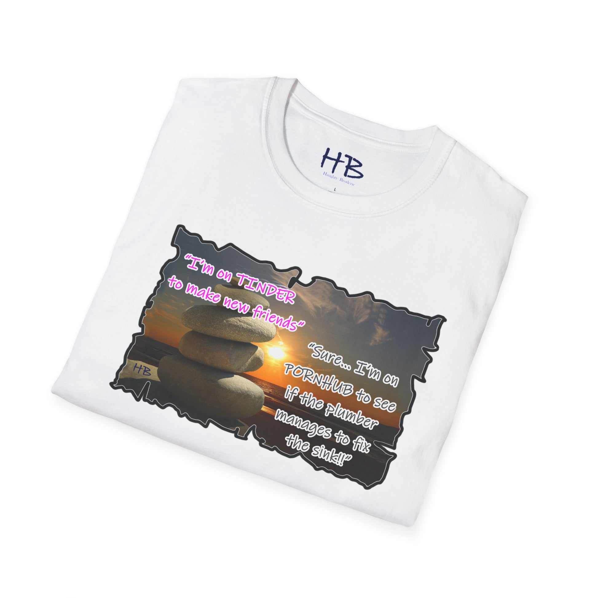 Imprinted on the front are two playful quotes, sparking laughter and lightheartedness. The first quote in charming pink reads, "I'm on TINDER to make new friends." This witty statement reflects the modern world of digital connections and the desire for social interaction.