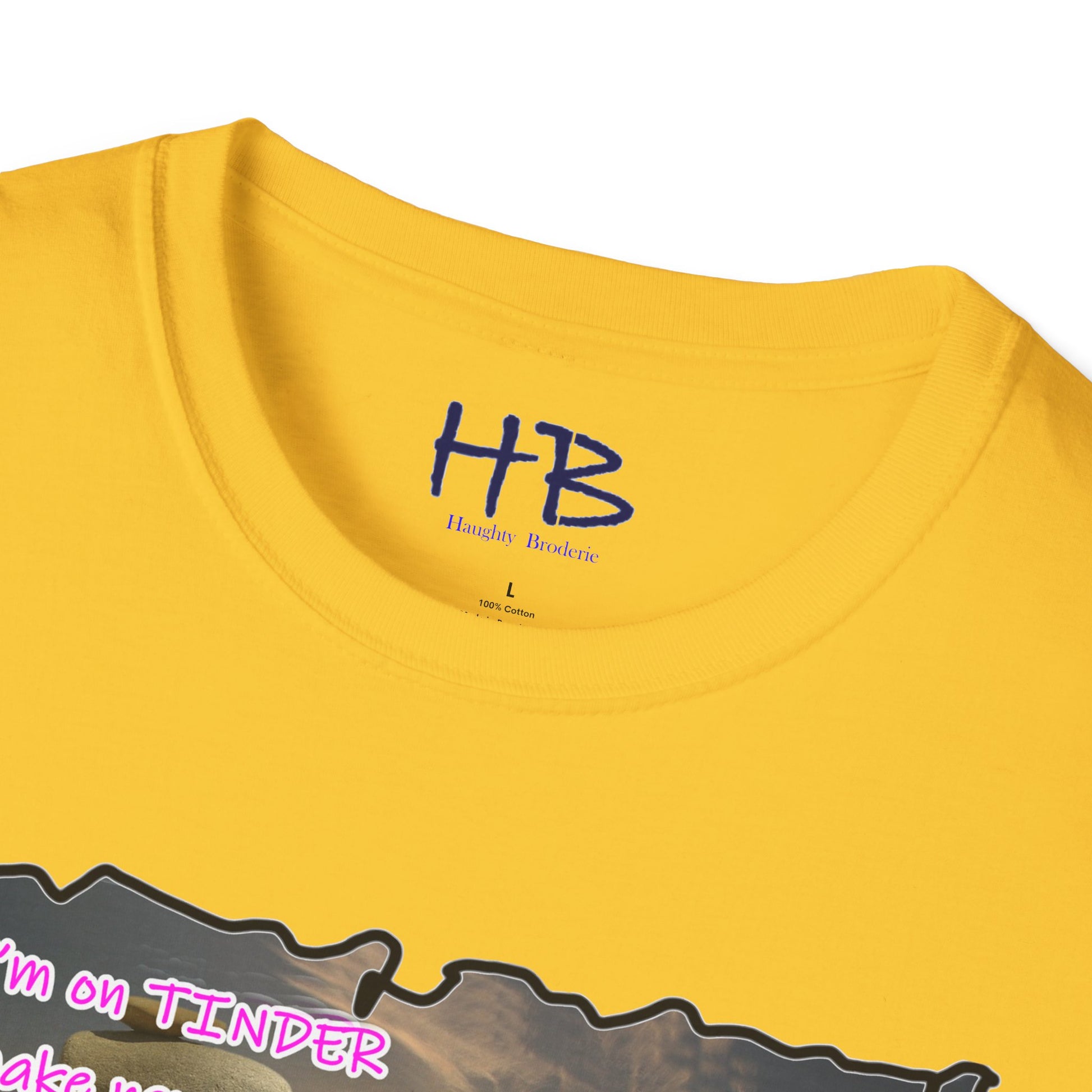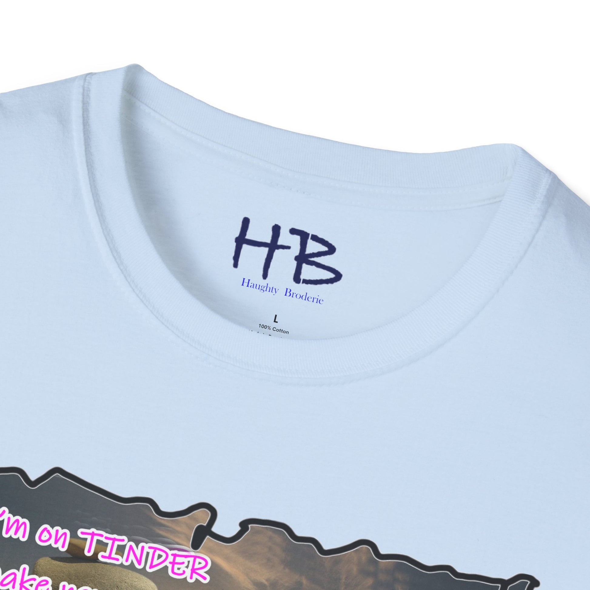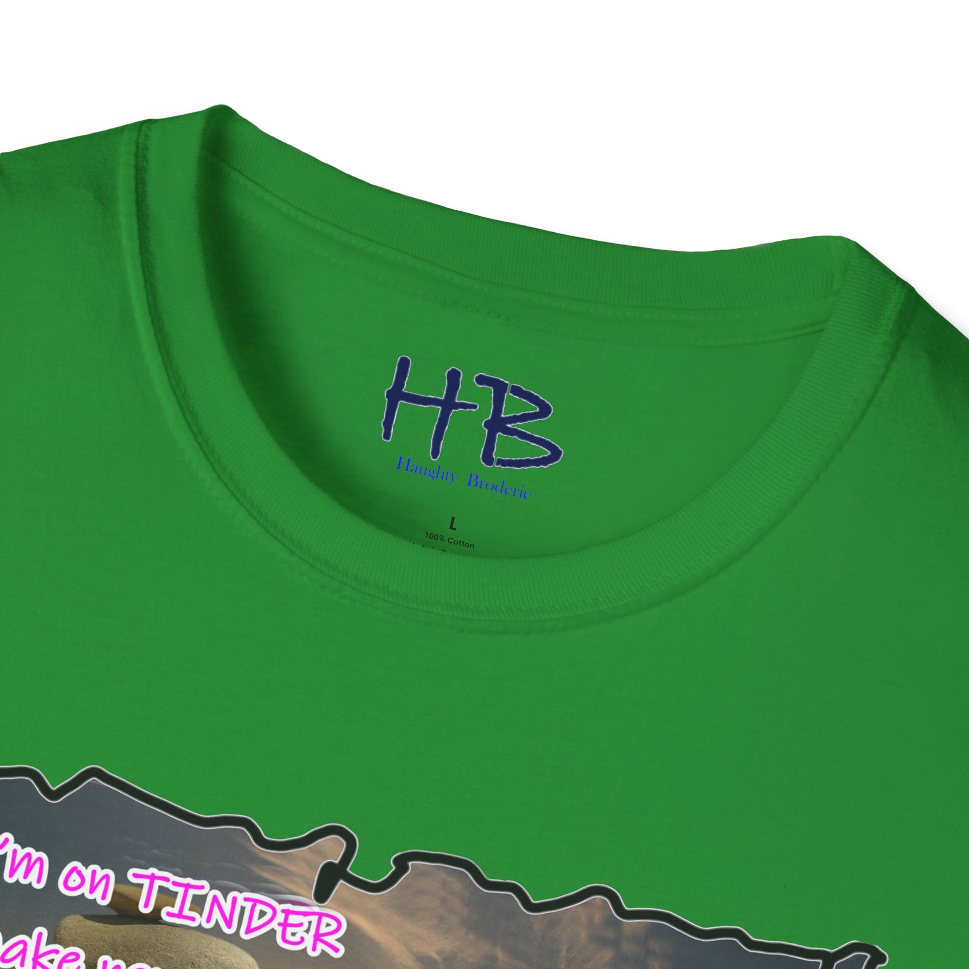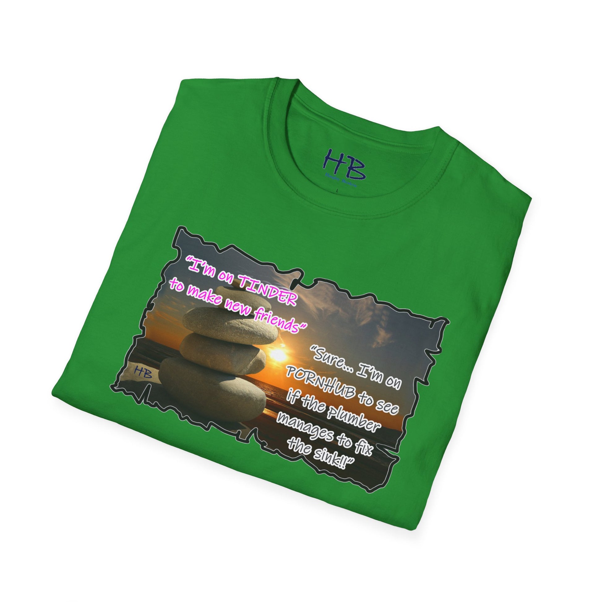 Imprinted on the front are two playful quotes, sparking laughter and lightheartedness. The first quote in charming pink reads, "I'm on TINDER to make new friends." This witty statement reflects the modern world of digital connections and the desire for social interaction.