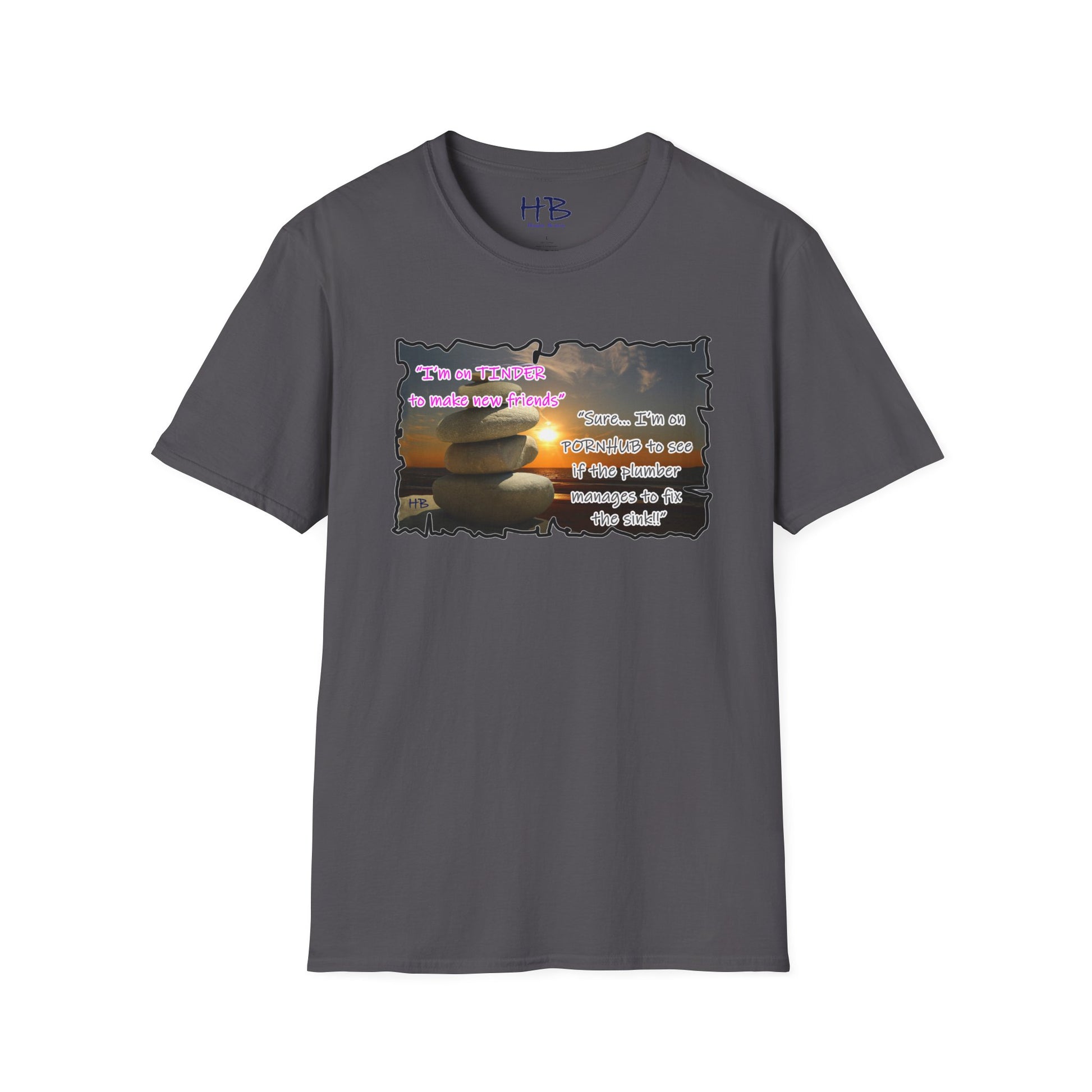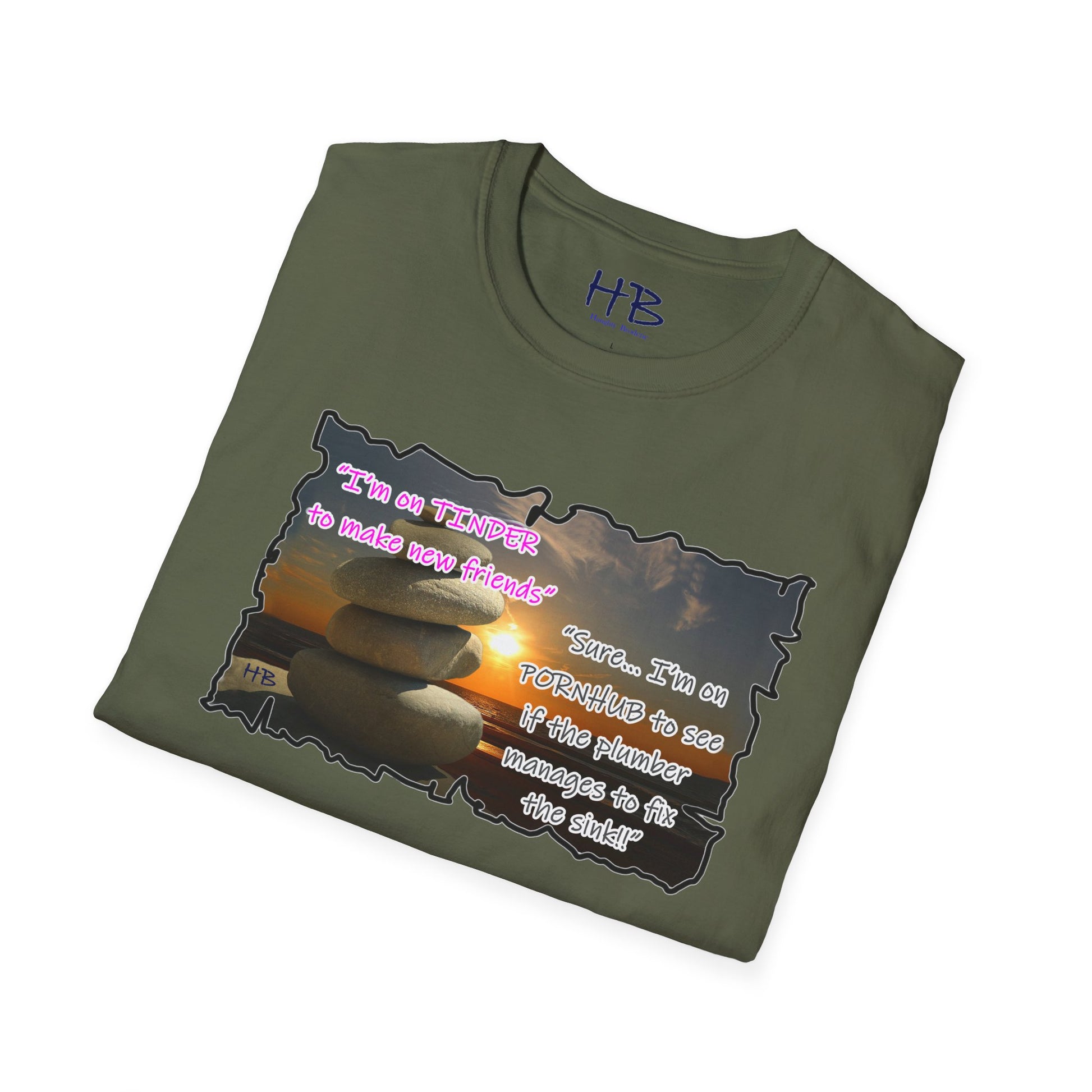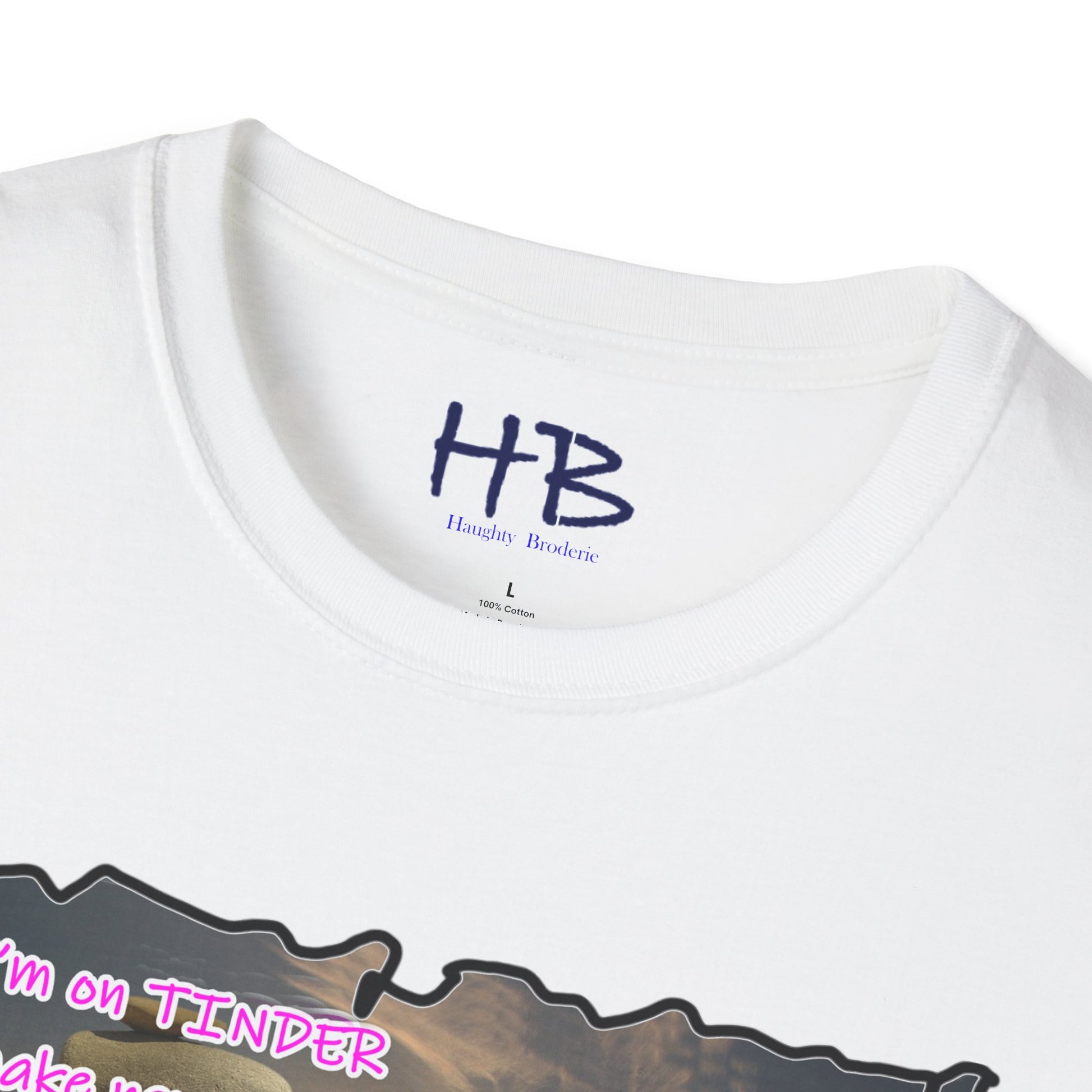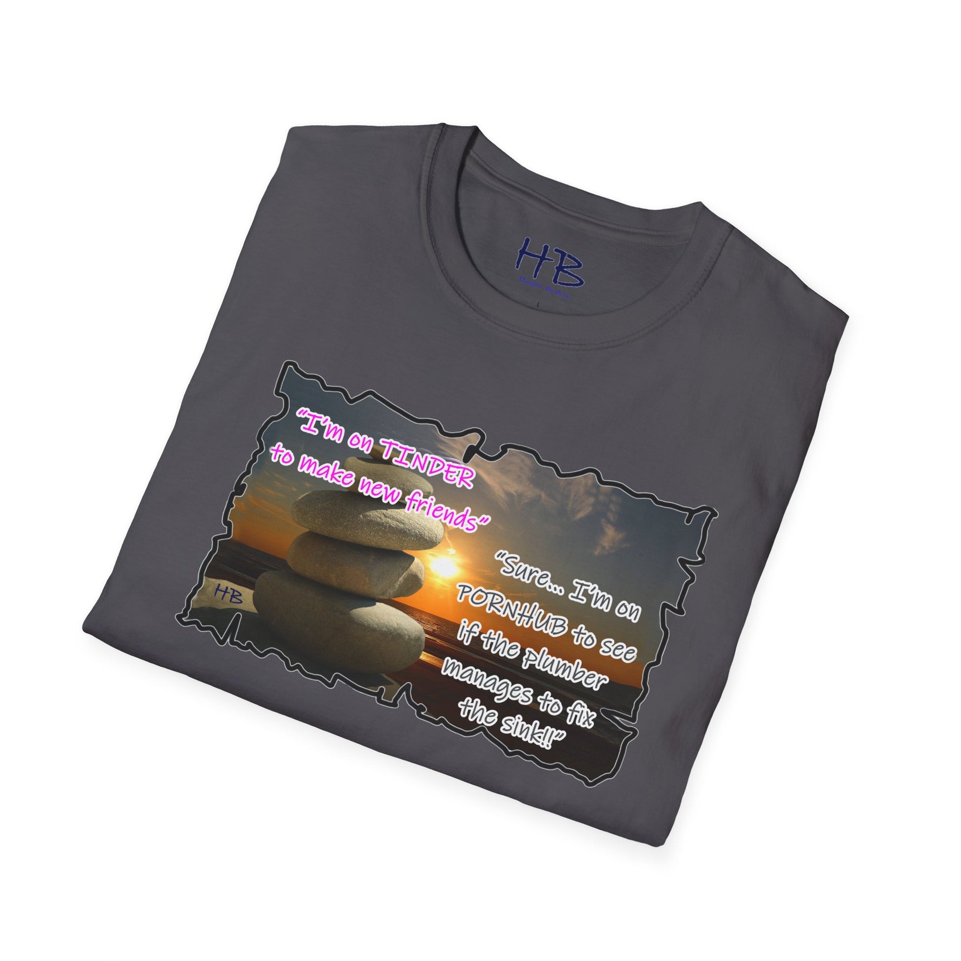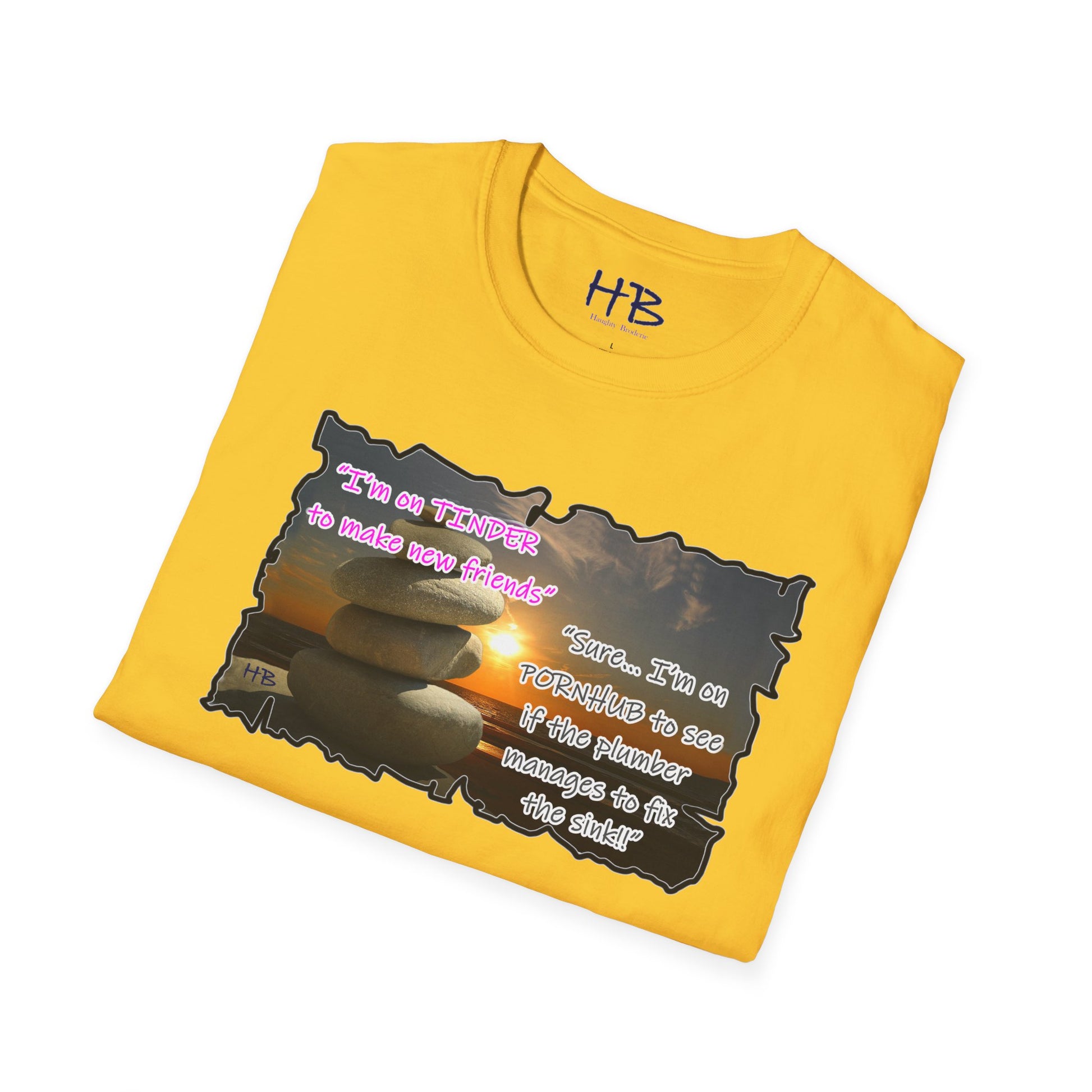 Imprinted on the front are two playful quotes, sparking laughter and lightheartedness. The first quote in charming pink reads, "I'm on TINDER to make new friends." This witty statement reflects the modern world of digital connections and the desire for social interaction.