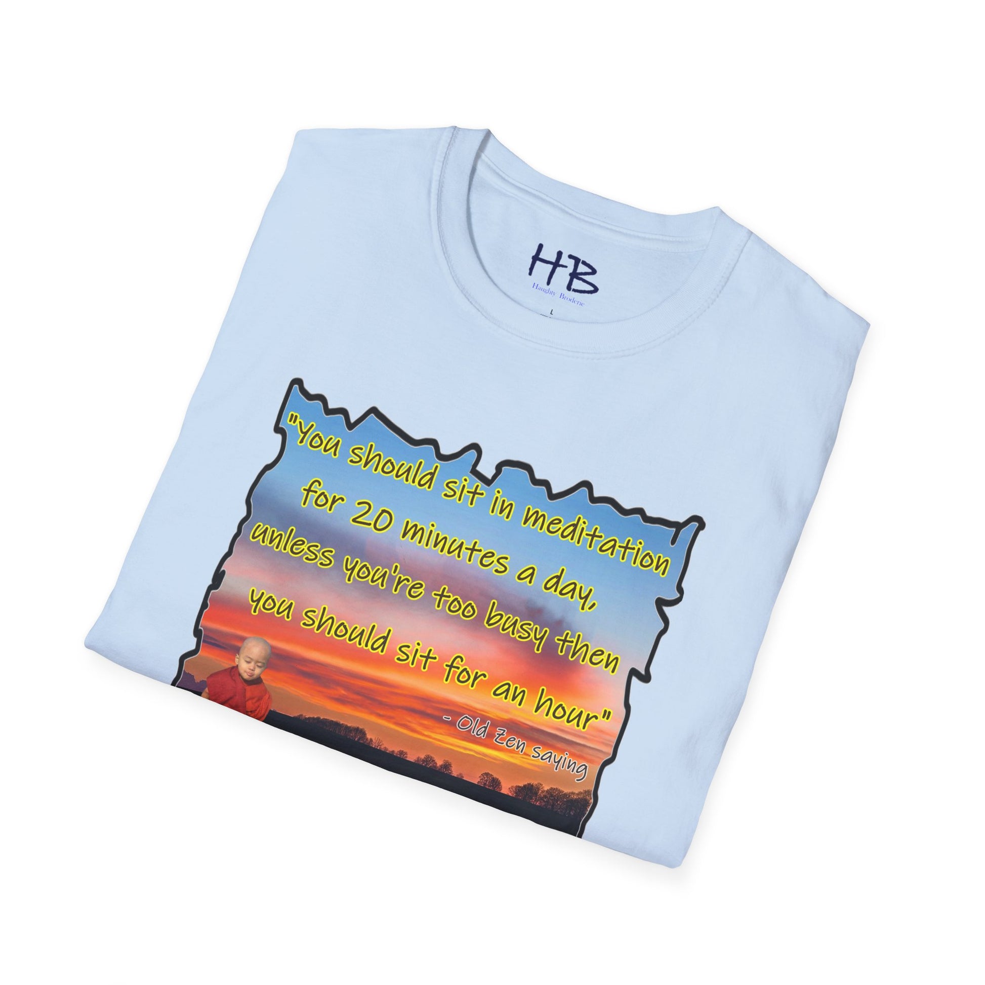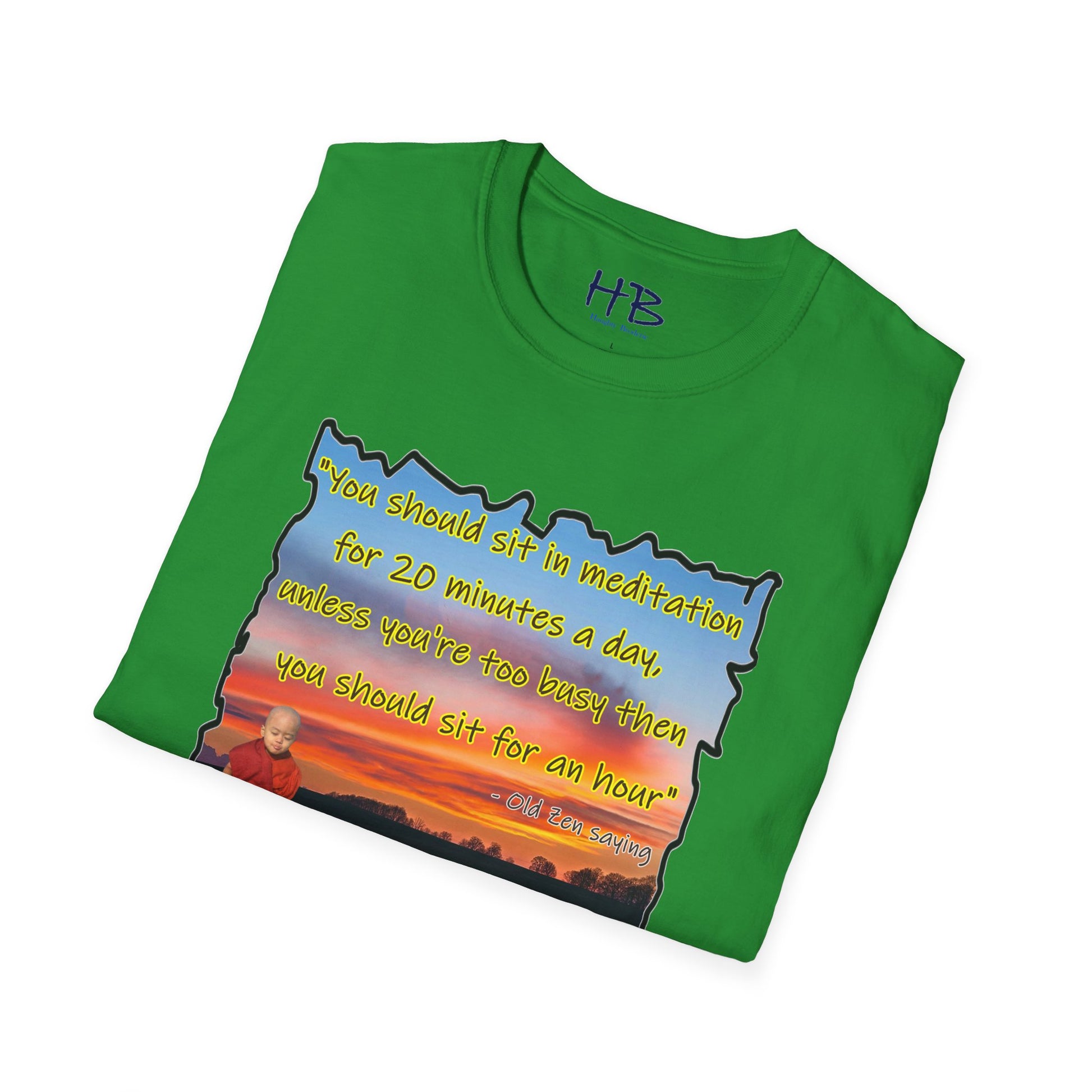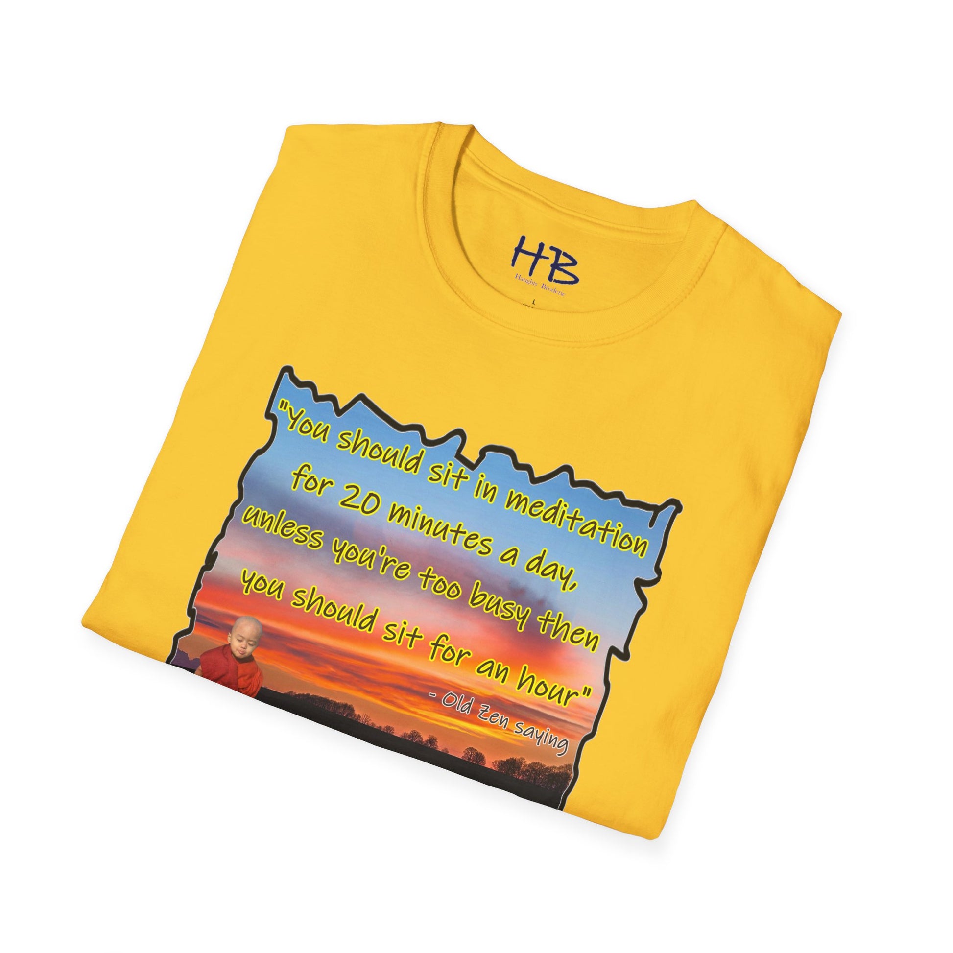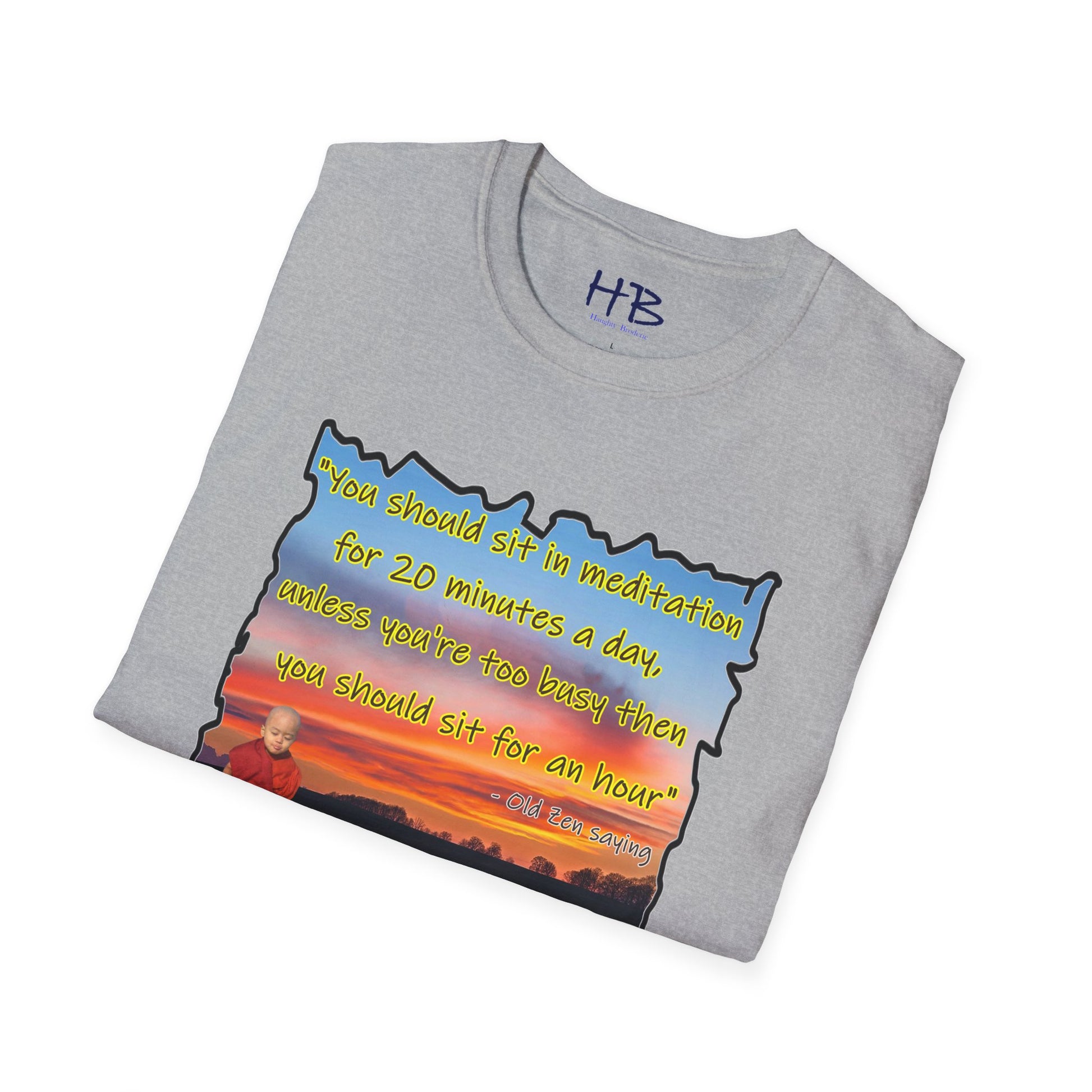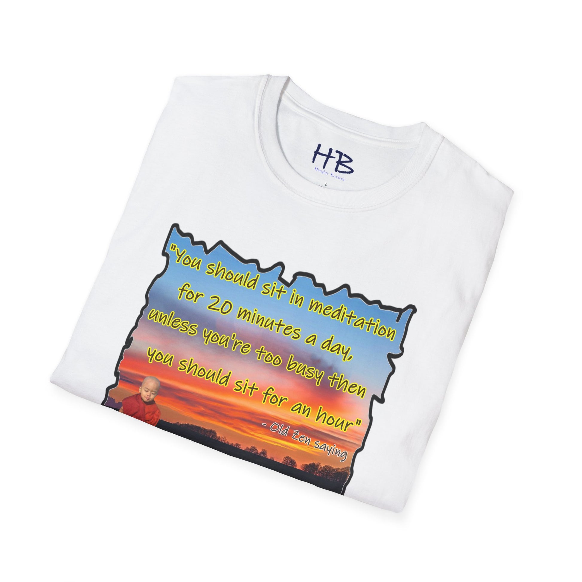 Accompanying the captivating illustration is an insightful text, echoing an ancient Zen saying: "You should sit in meditation for 20 minutes a day, unless you're too busy then you should sit for an hour." These wise words inspire contemplation on the significance of carving out moments of stillness and introspection, especially during hectic times.