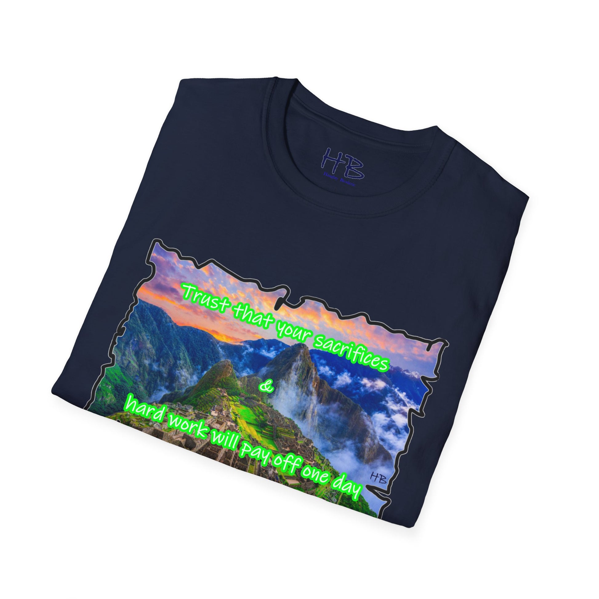 Embodied in the image is a profound message, elegantly scripted across the landscape, a beacon of inspiration for those who toil relentlessly year-round, sacrificing the ephemeral pleasures of life for the promise of a grand tomorrow. "Trust that your sacrifices & hard work will pay off one day" – a rallying cry for the valiant souls laboring diligently, committed to manifesting their dreams into tangible reality.