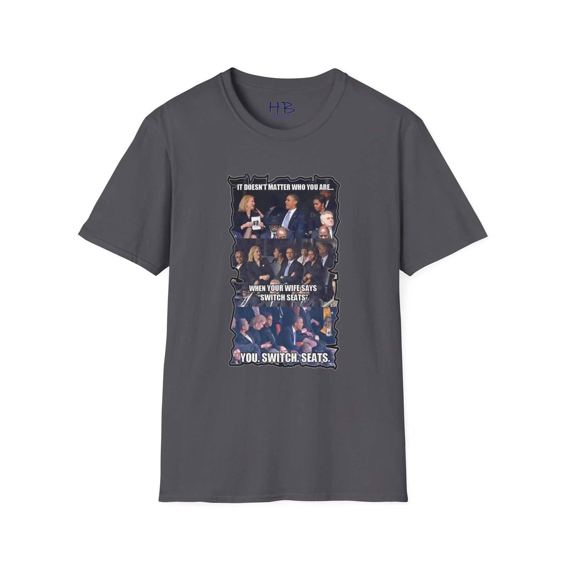 The final image reveals the aftermath of the wife's decree. The blond lady, head bowed, seems engrossed in her phone, contemplating the consequences of her actions. Michelle Obama has embraced the new seating arrangement, positioned beside the blond lady with a triumphant aura, confidently surveying the crowd. Barack Obama, reluctantly adhering to his wife's command, sits alone, his back slightly arched, conveying a sense of defeat. The text powerfully emphasizes the command, "YOU. SWITCH. SEATS".