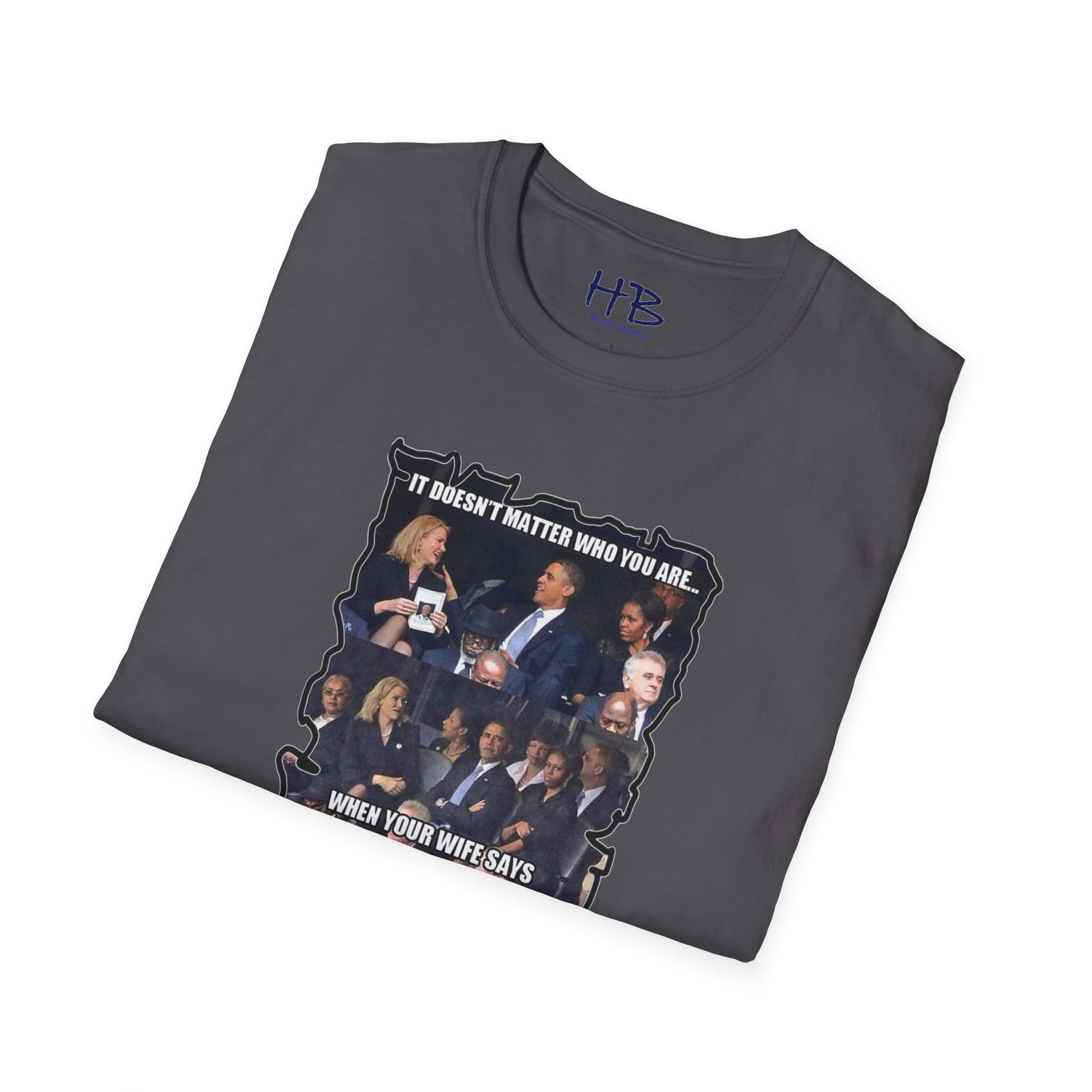 The second image unveils a pivotal moment in this unfolding story. The blond lady, previously immersed in laughter, now finds herself struck with astonishment. Her gaze fixates upon the Obamas, who appear to have received some disconcerting news. President Obama, his arms crossed, looks away, perhaps processing the unforeseen turn of events. Michelle Obama, rolling up her sleeves, emanates a sense of determination, as if she has uttered something fierce. The text accompanying this image profoundly declares, "When your wife says 'SWITCH SEATS'".