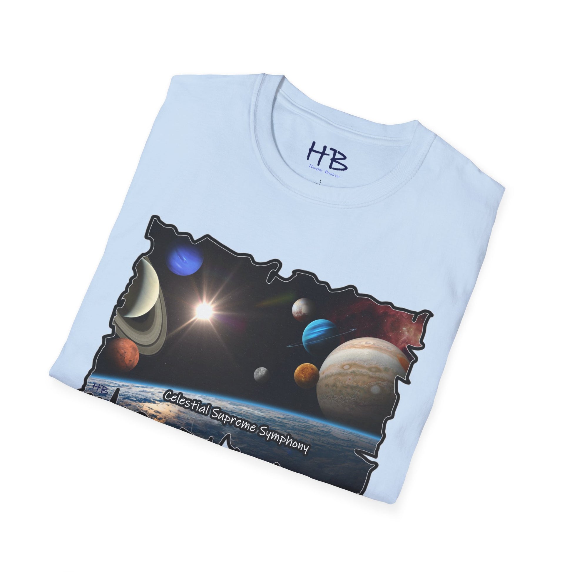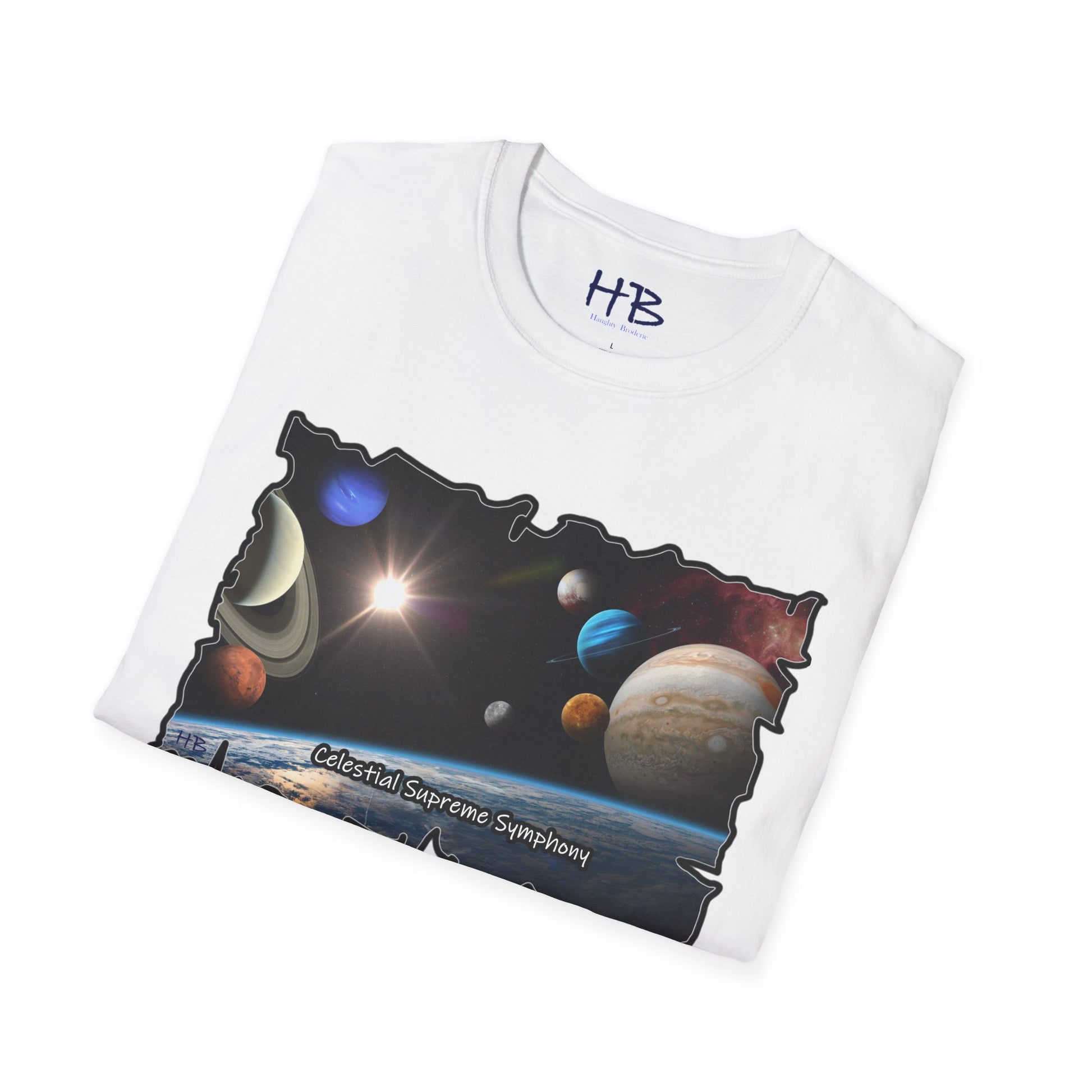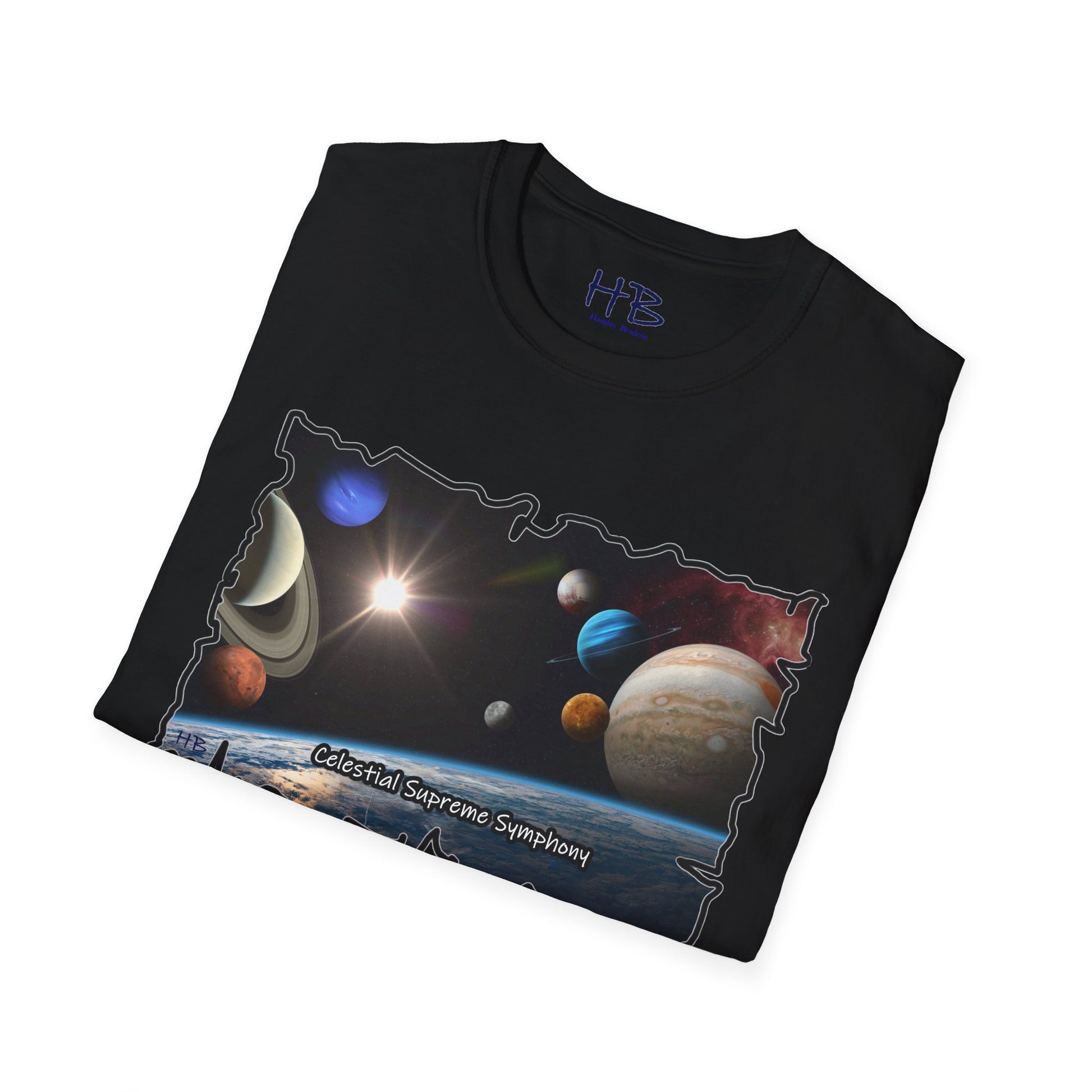 Embark on a cosmic odyssey with our Celestial Supreme Symphony masterpiece, meticulously emblazoned on this exquisite garment. Crafted to captivate, this extraordinary t-shirt unveils a mesmerizing panorama from the pinnacle of our celestial abode. Behold, Earth takes center stage, surrounded by a cosmic congregation of other planets, all paying homage to the resplendent sun. The universe unfurls its mysterious tapestry, a delicate dance between the brilliance of the sun and the enigmatic darkness that lurks beyond. The celestial fog, a harmonious backdrop, swirls in a cosmic ballet that transcends time and space.