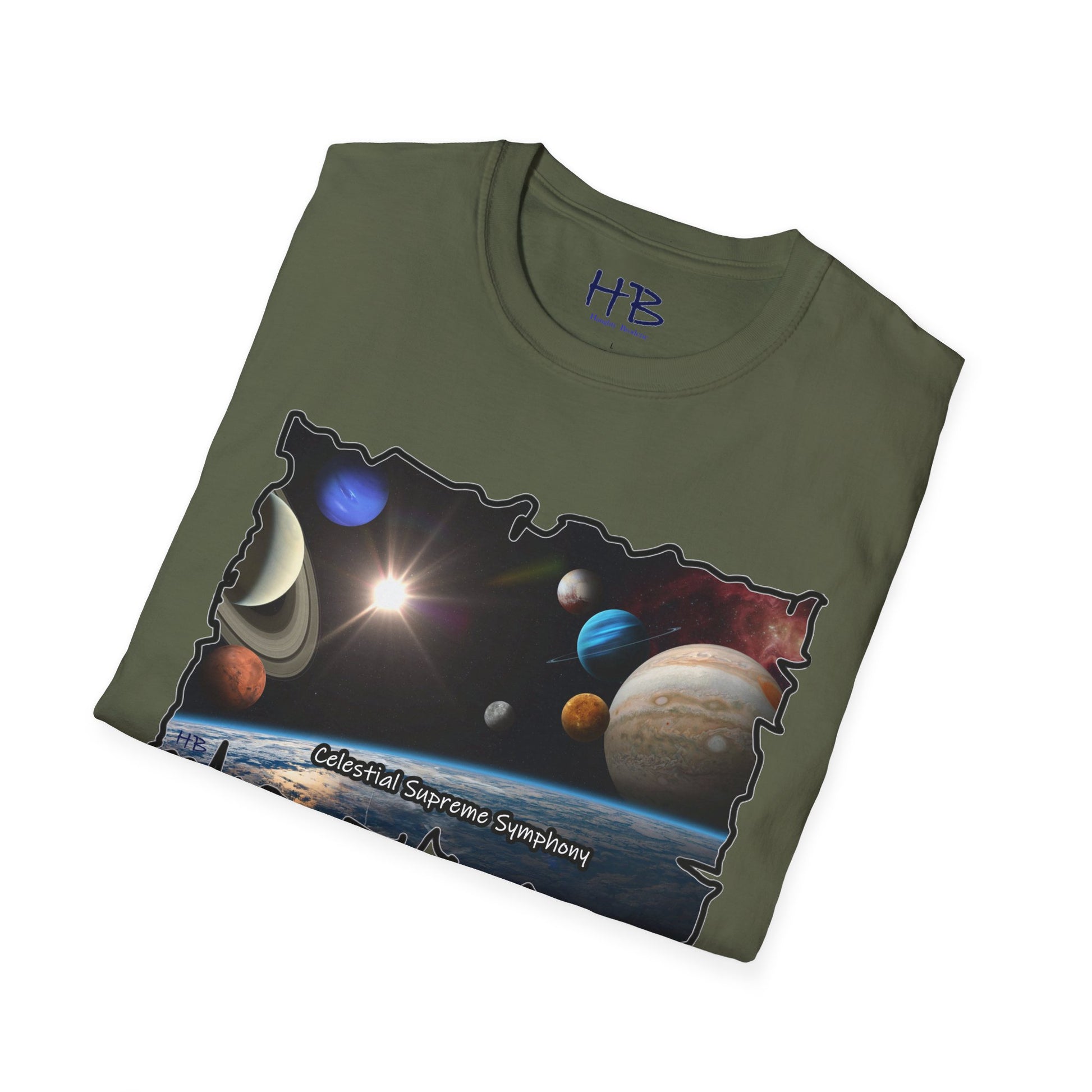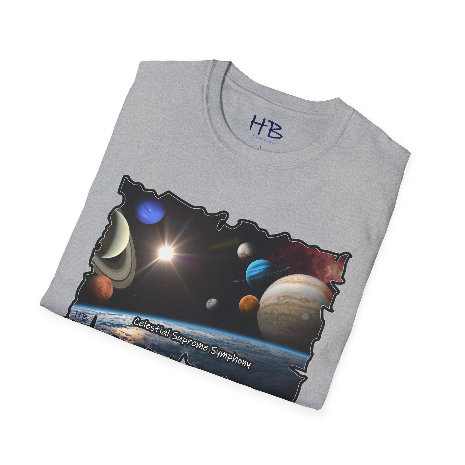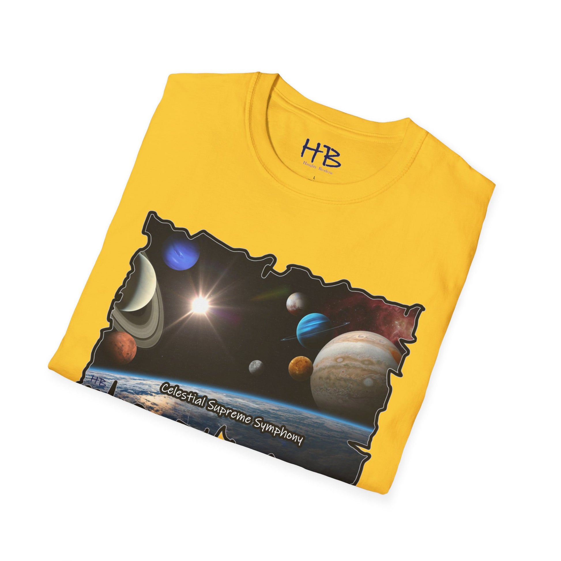 Embark on a cosmic odyssey with our Celestial Supreme Symphony masterpiece, meticulously emblazoned on this exquisite garment. Crafted to captivate, this extraordinary t-shirt unveils a mesmerizing panorama from the pinnacle of our celestial abode. Behold, Earth takes center stage, surrounded by a cosmic congregation of other planets, all paying homage to the resplendent sun. The universe unfurls its mysterious tapestry, a delicate dance between the brilliance of the sun and the enigmatic darkness that lurks beyond. The celestial fog, a harmonious backdrop, swirls in a cosmic ballet that transcends time and space.