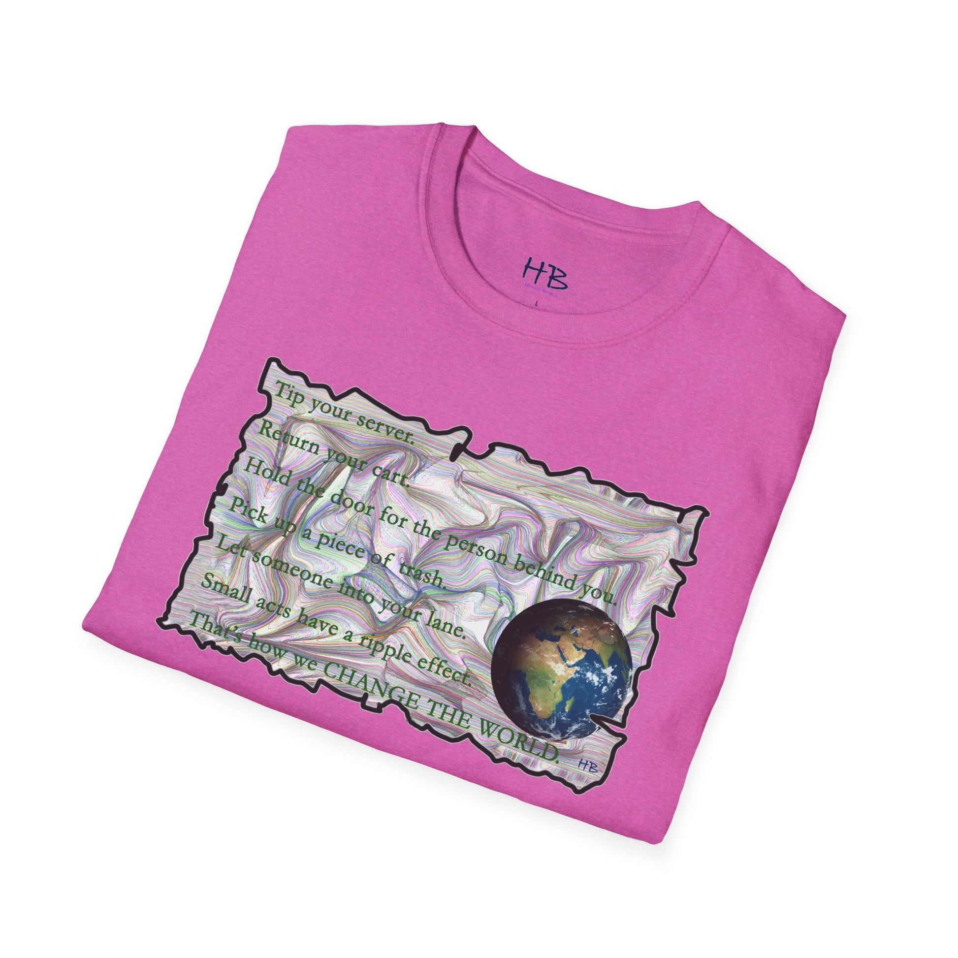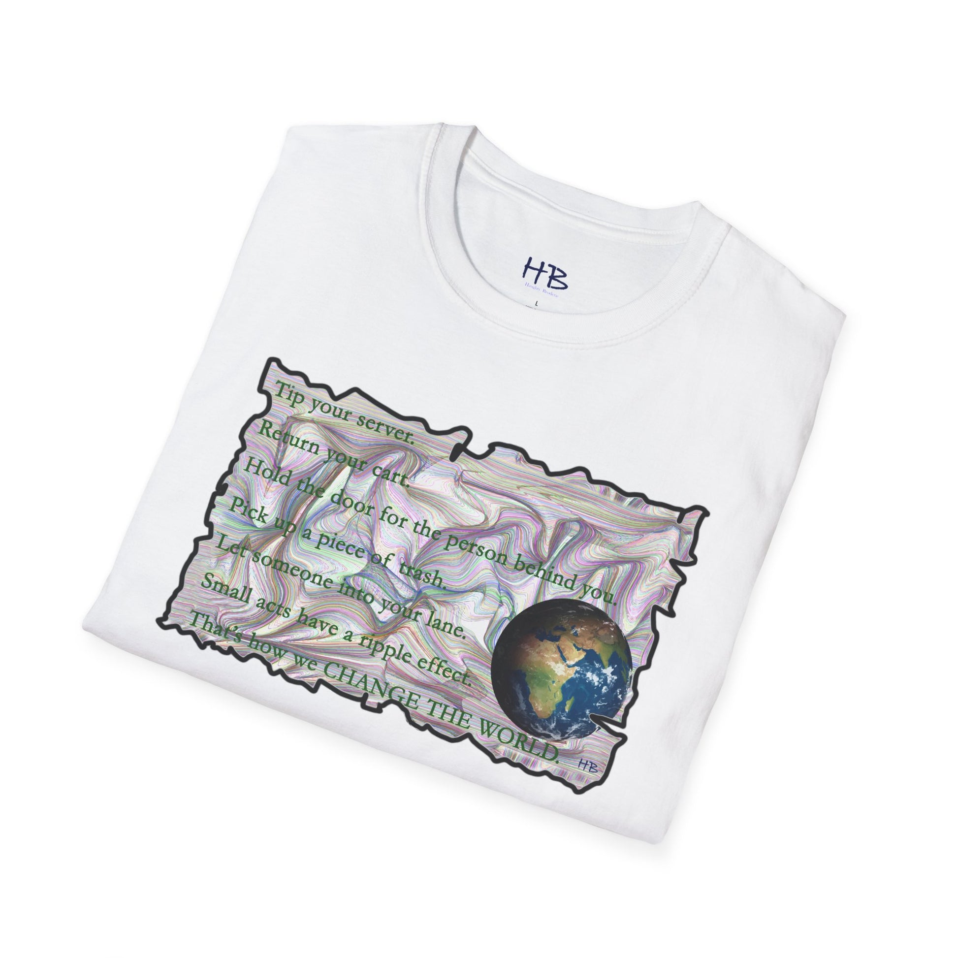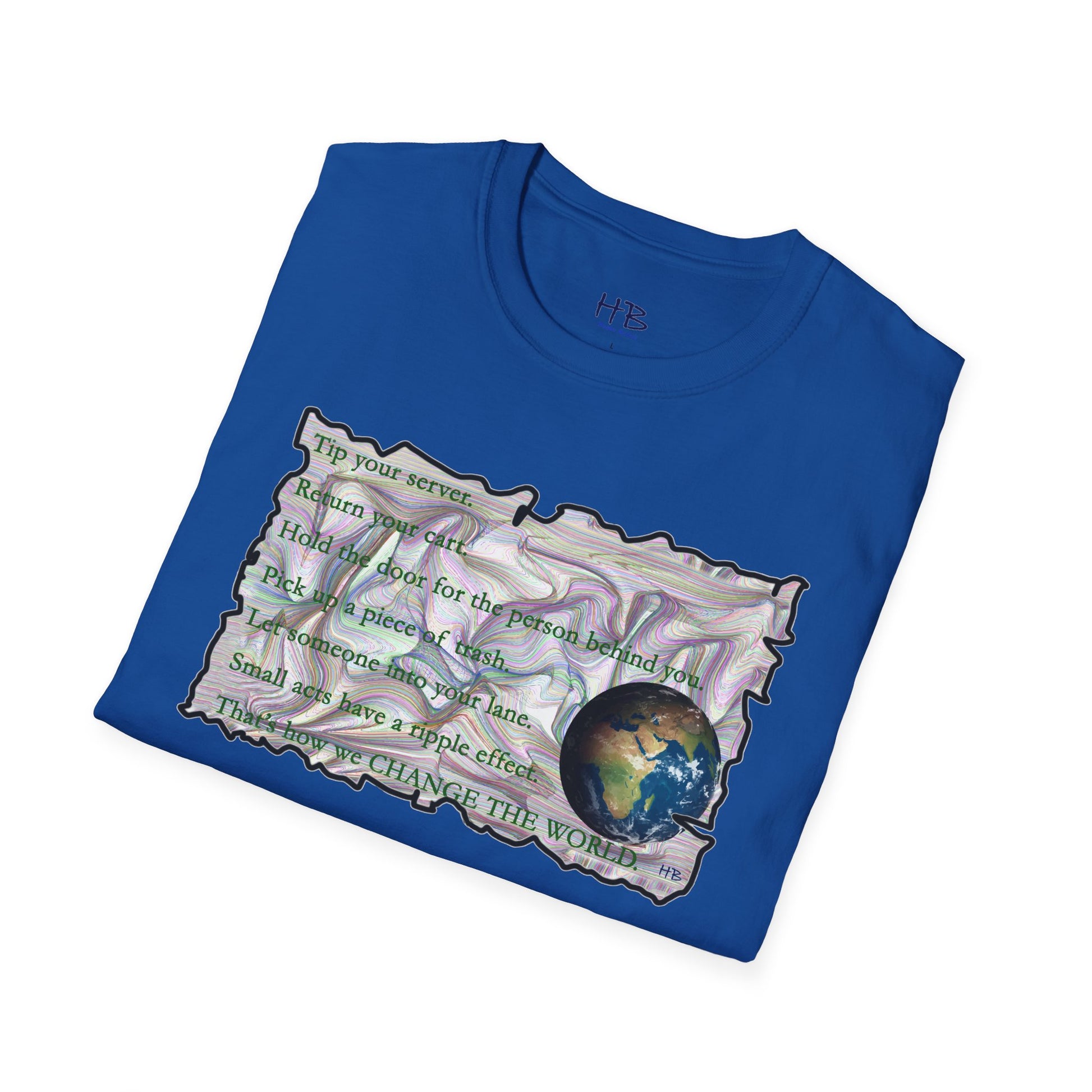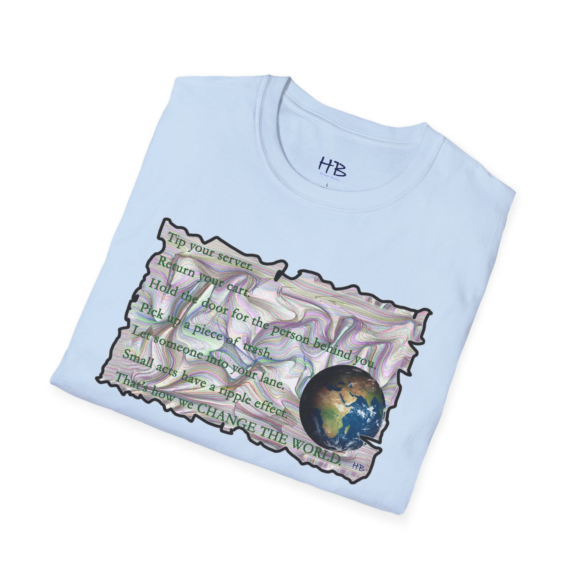Introducing our stunning t-shirt featuring a breathtaking and vibrant wavy backdrop adorned with the gorgeous planet earth situated gracefully on its side. The design is accentuated by a powerful message presented in bold letters that reads, "Tip your server, Return your cart, Hold the door for the person behind you, Pick up a piece of trash, let someone into your lane, Small acts have a ripple effect, That's how we CHANGE THE WORLD."