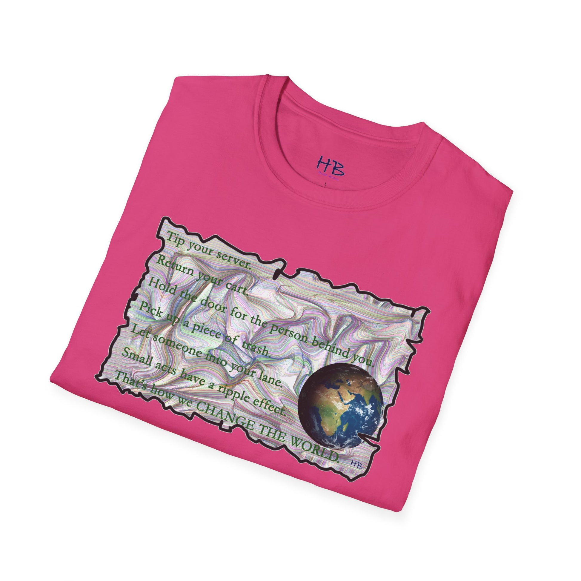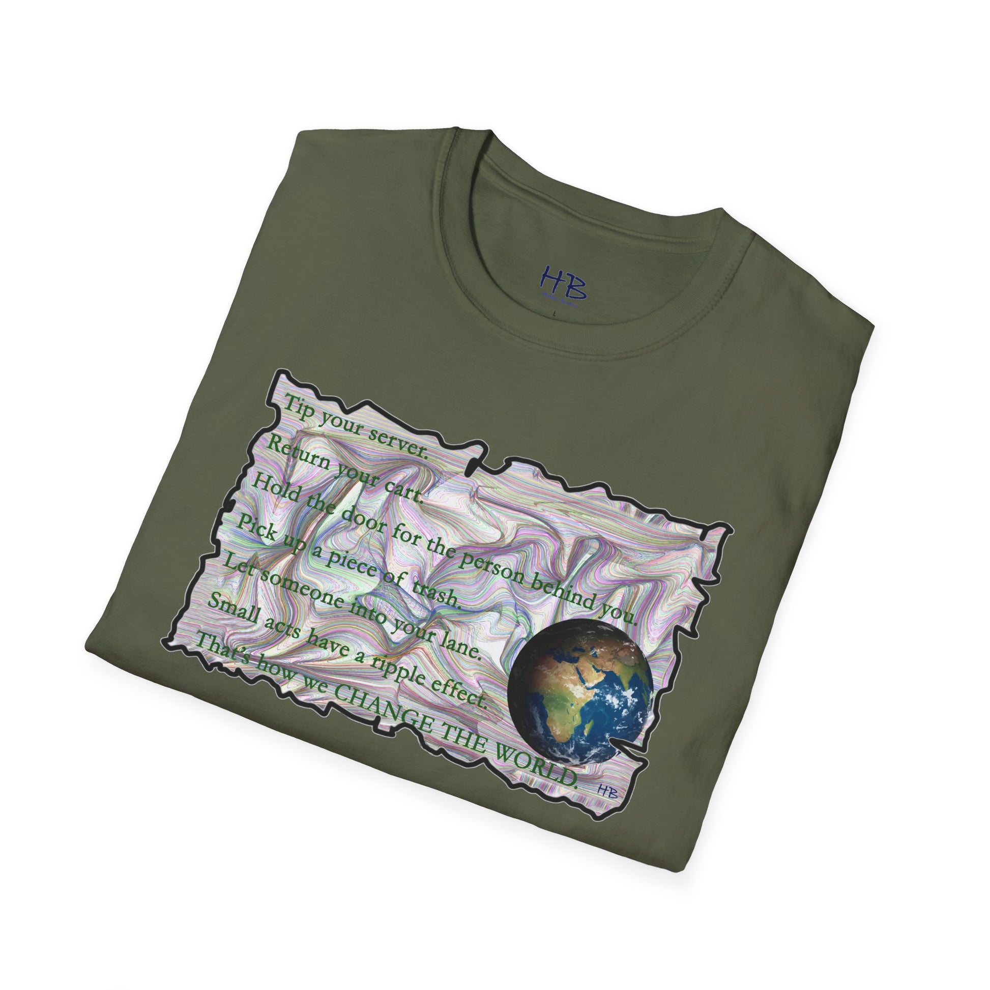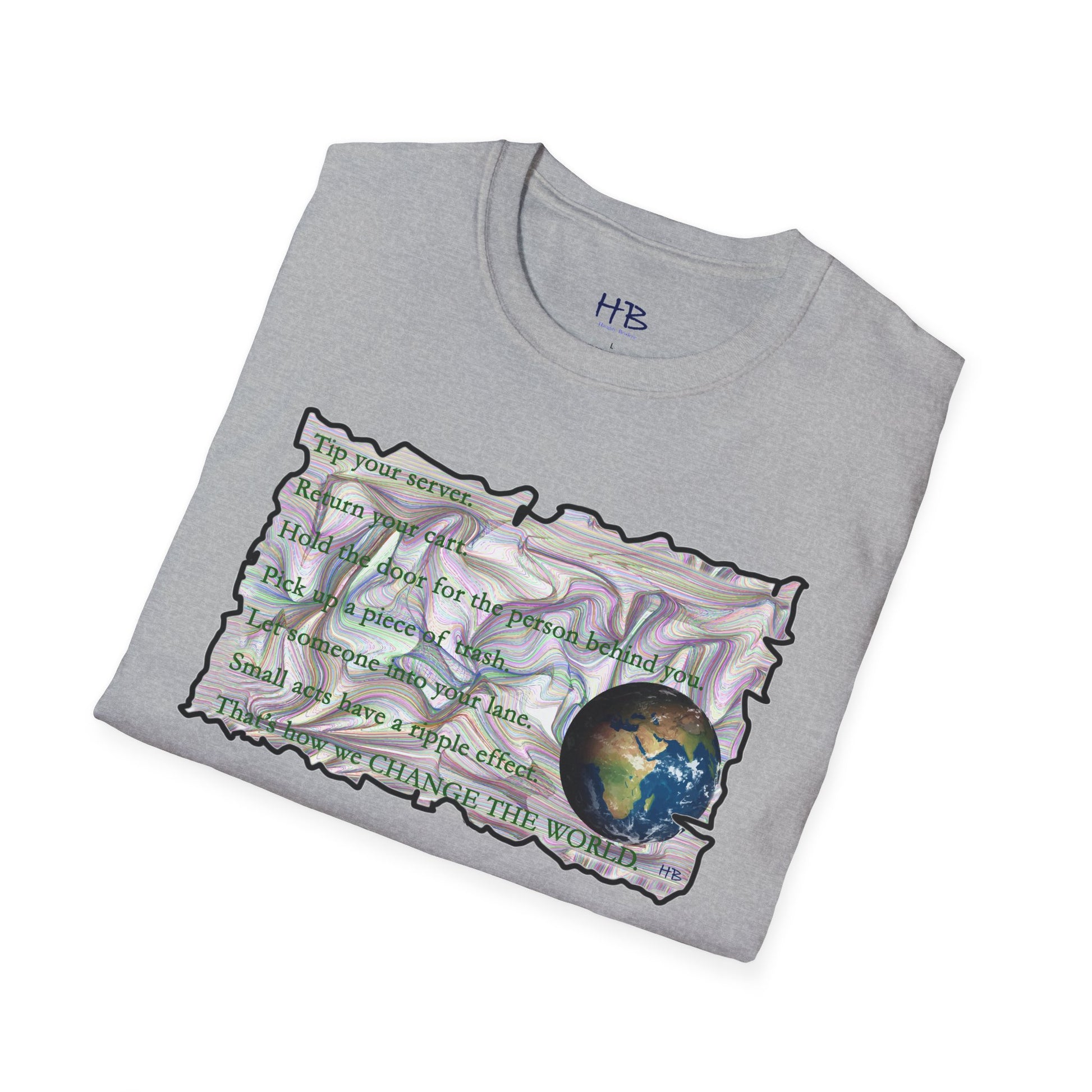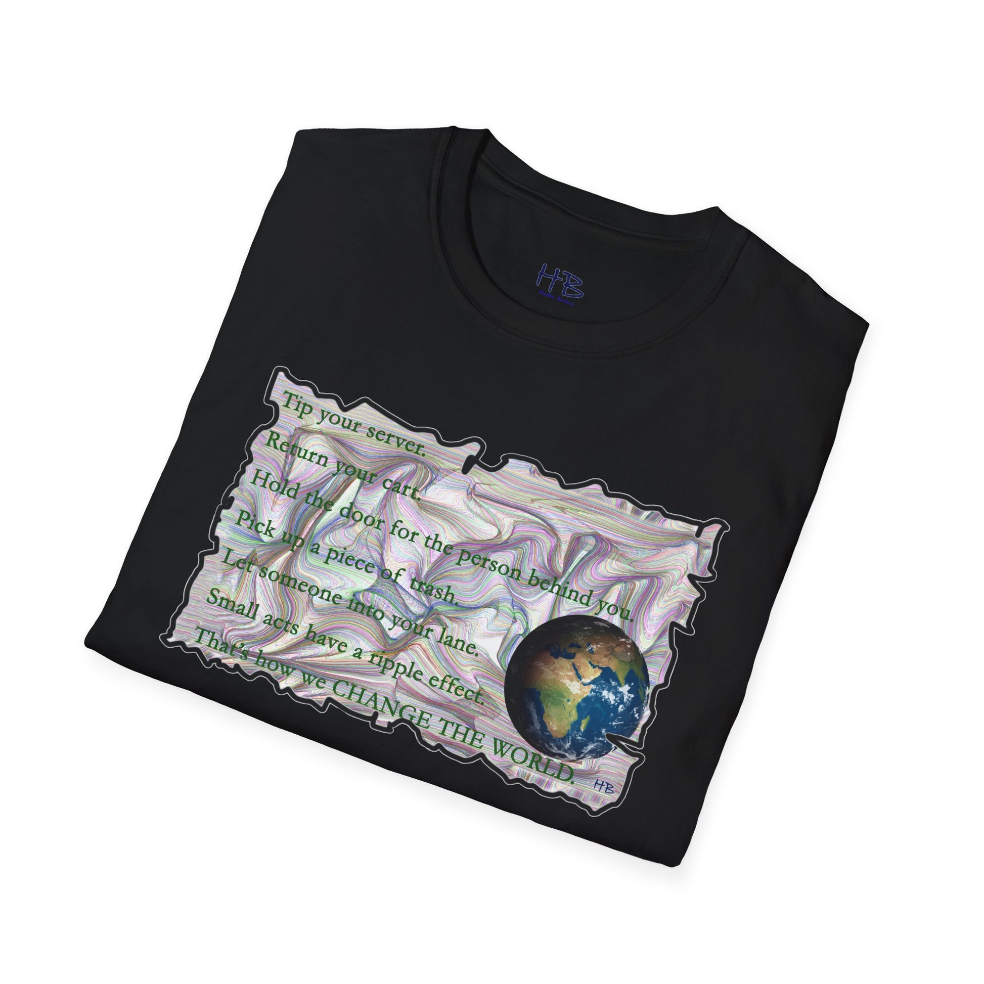 Introducing our stunning t-shirt featuring a breathtaking and vibrant wavy backdrop adorned with the gorgeous planet earth situated gracefully on its side. The design is accentuated by a powerful message presented in bold letters that reads, "Tip your server, Return your cart, Hold the door for the person behind you, Pick up a piece of trash, let someone into your lane, Small acts have a ripple effect, That's how we CHANGE THE WORLD."