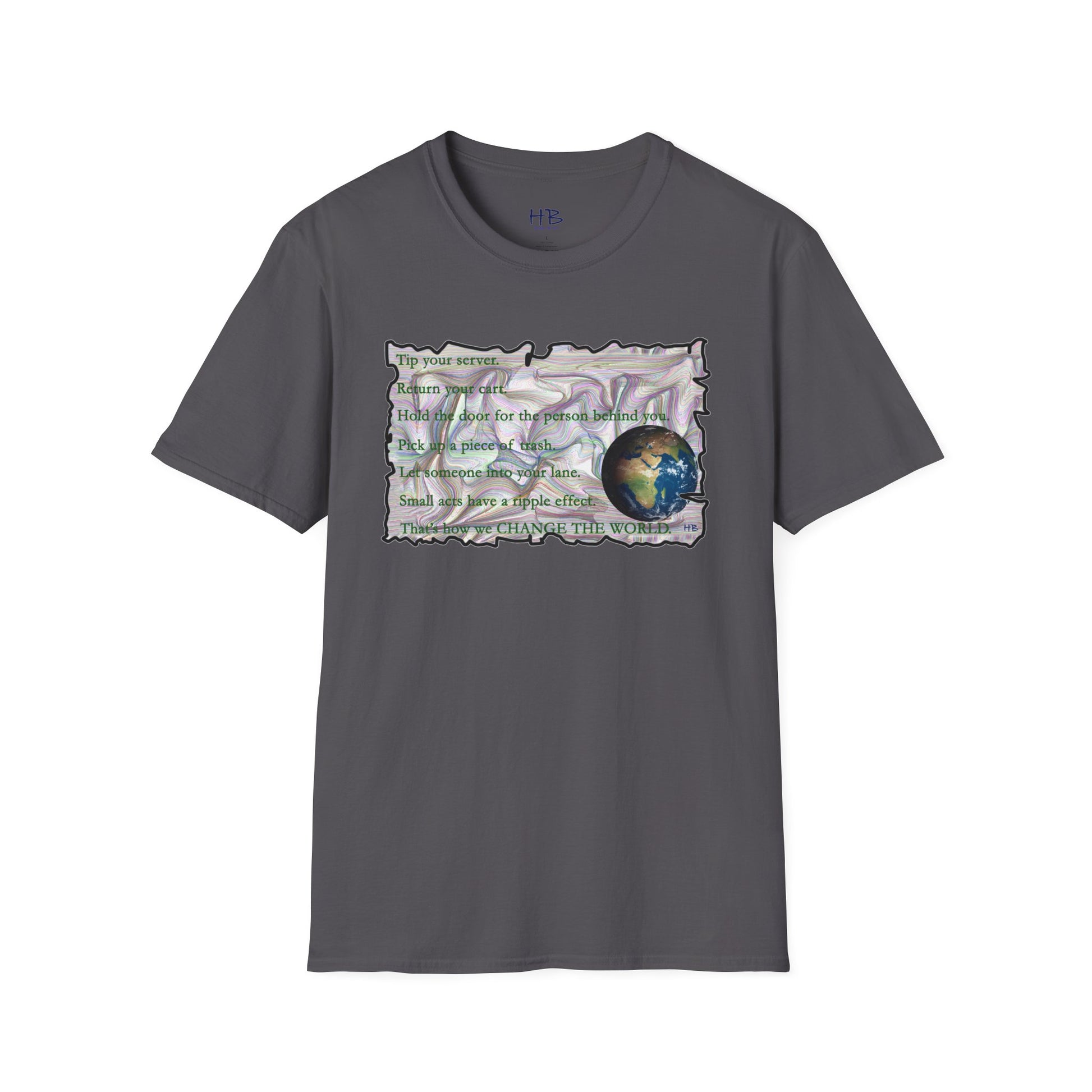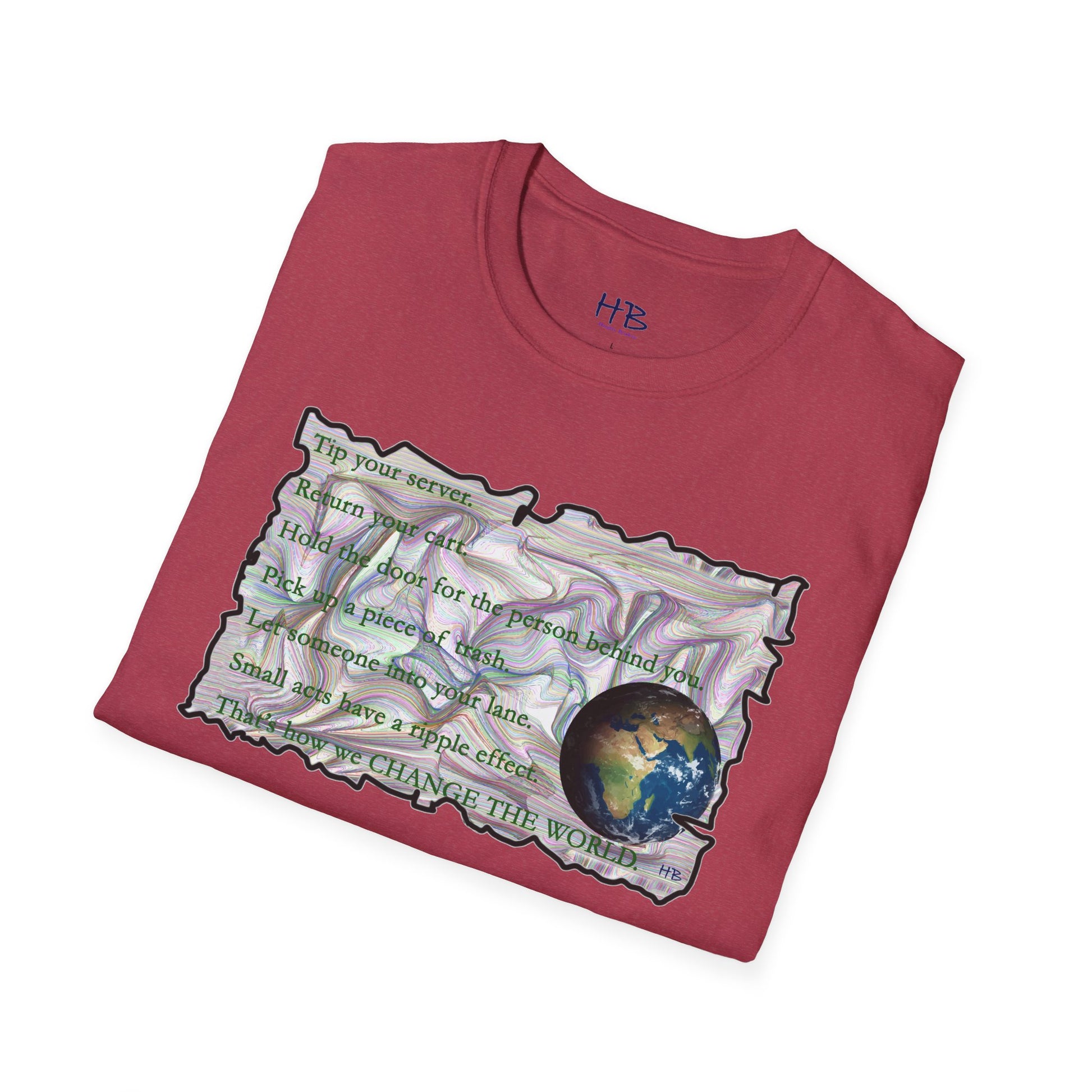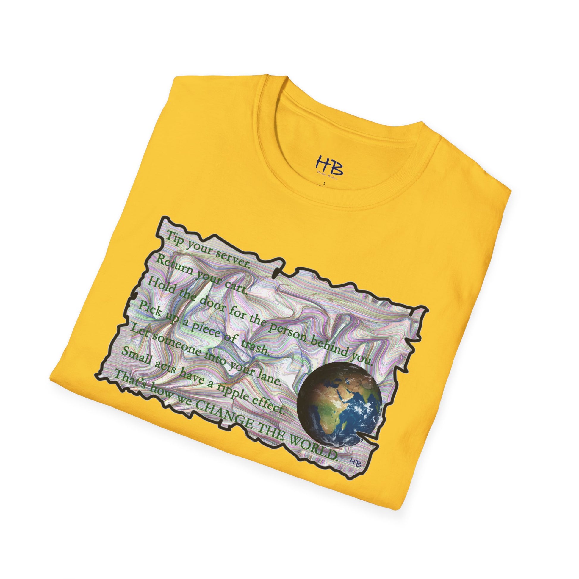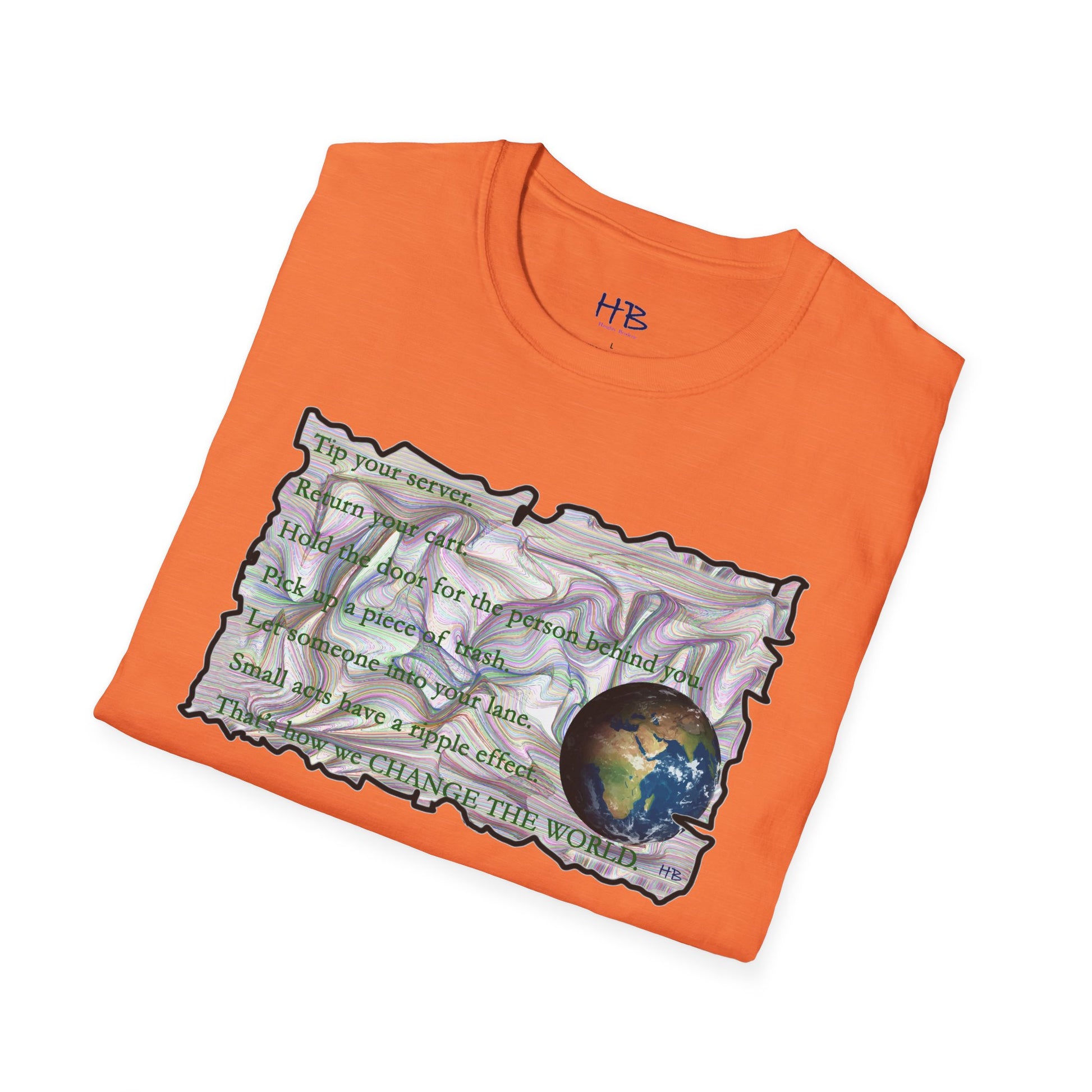 Introducing our stunning t-shirt featuring a breathtaking and vibrant wavy backdrop adorned with the gorgeous planet earth situated gracefully on its side. The design is accentuated by a powerful message presented in bold letters that reads, "Tip your server, Return your cart, Hold the door for the person behind you, Pick up a piece of trash, let someone into your lane, Small acts have a ripple effect, That's how we CHANGE THE WORLD."