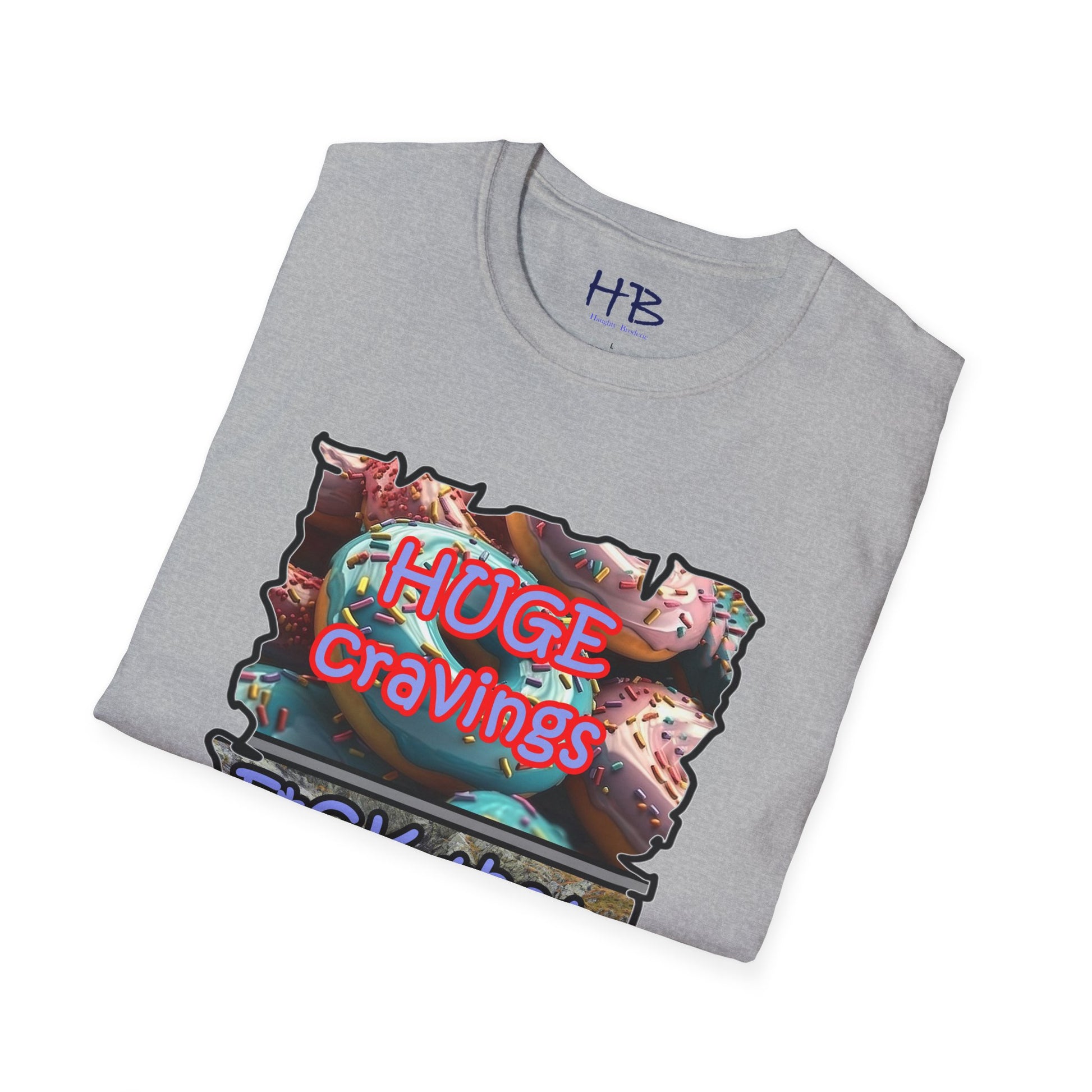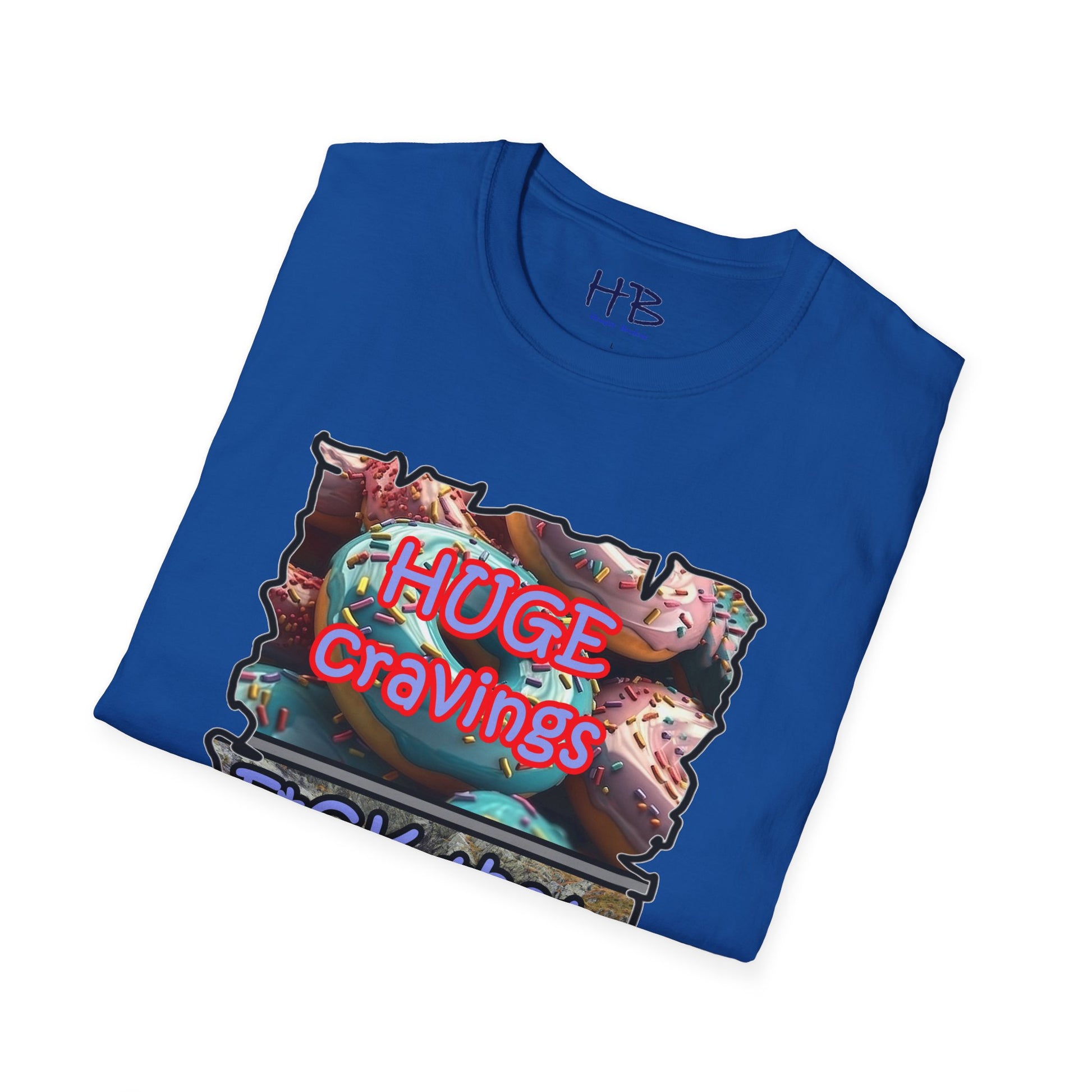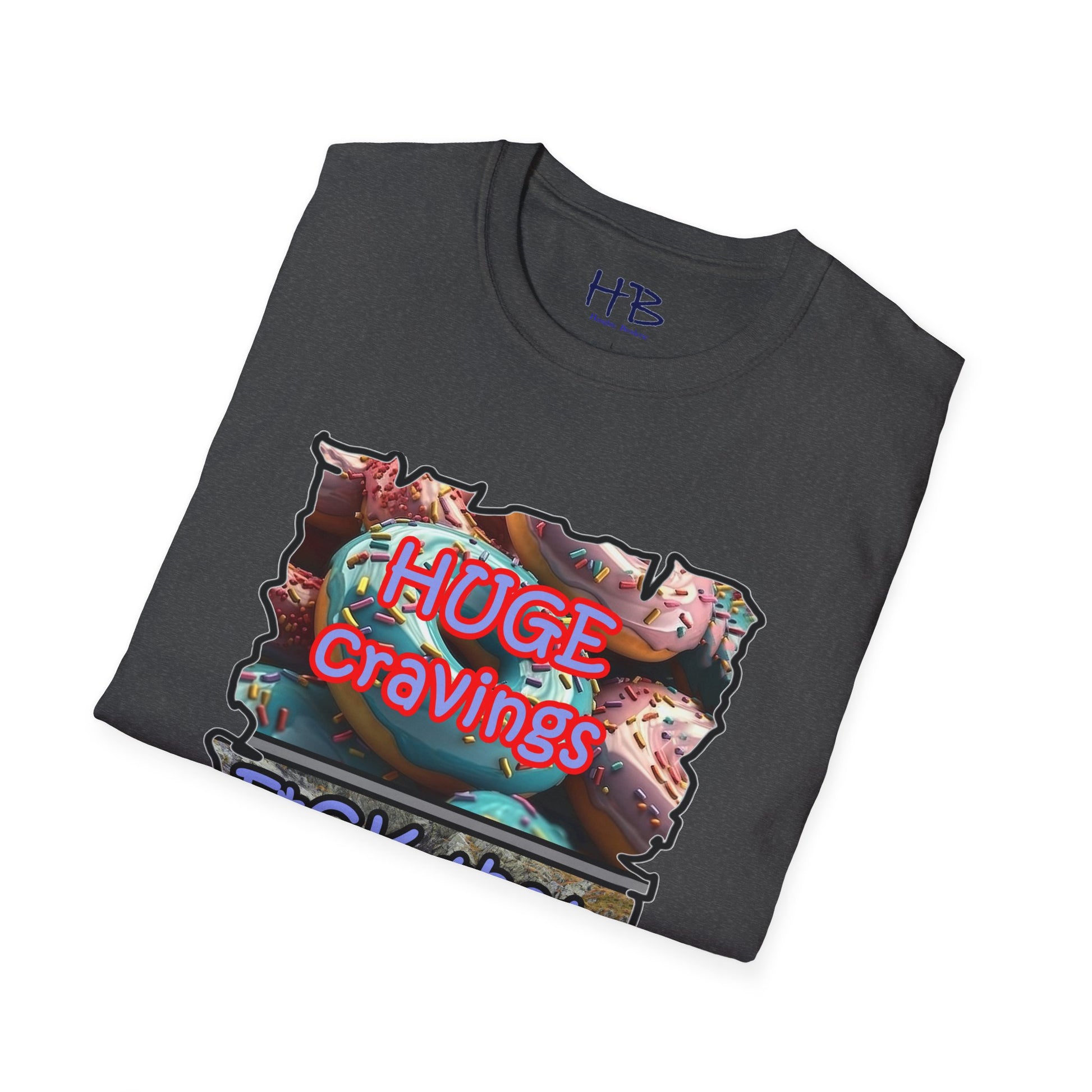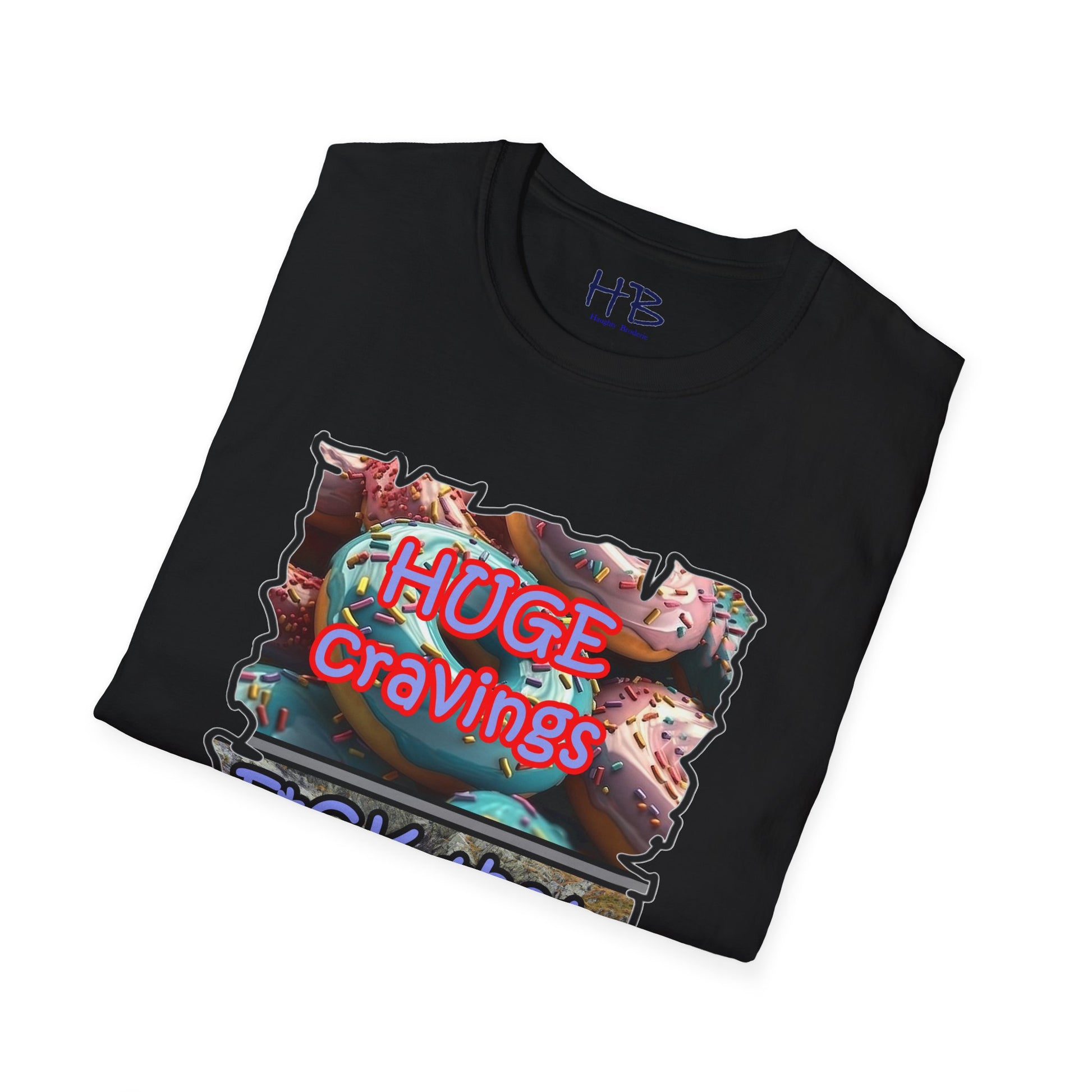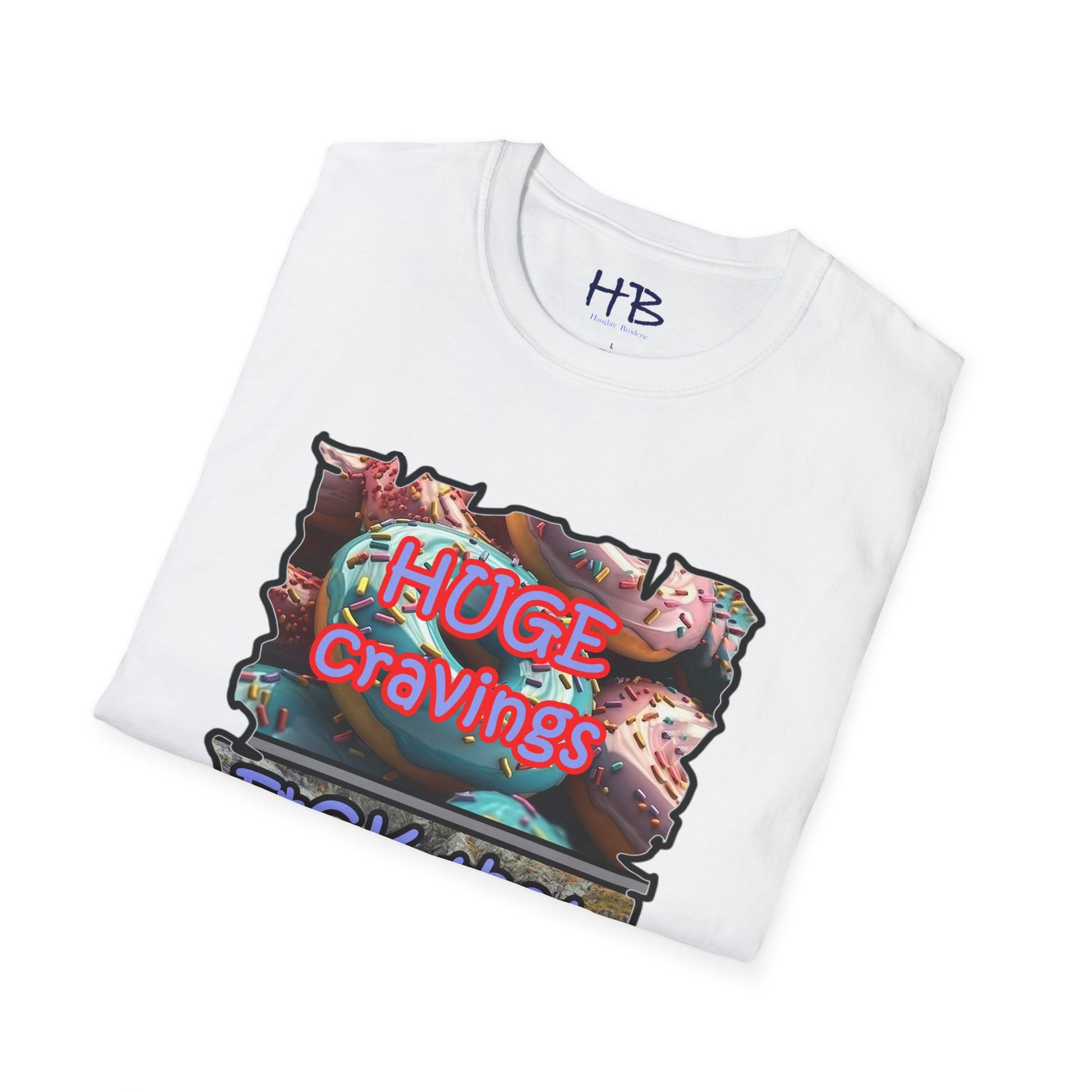 Introducing our remarkable tee shirt that combines delectable imagery and powerful messaging to make a statement in today's world. Feast your eyes on the top image, adorned with luscious glazed donuts boasting irresistible toppings. As you admire the tantalizing treats, the text boldly declares "HUGE CRAVINGS," capturing the essence of indulgence and temptation.