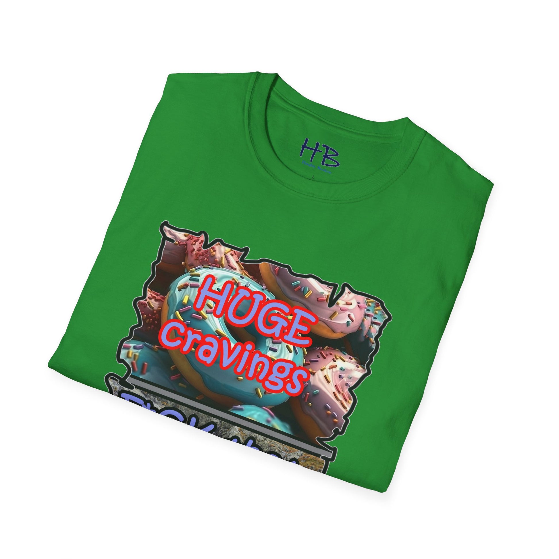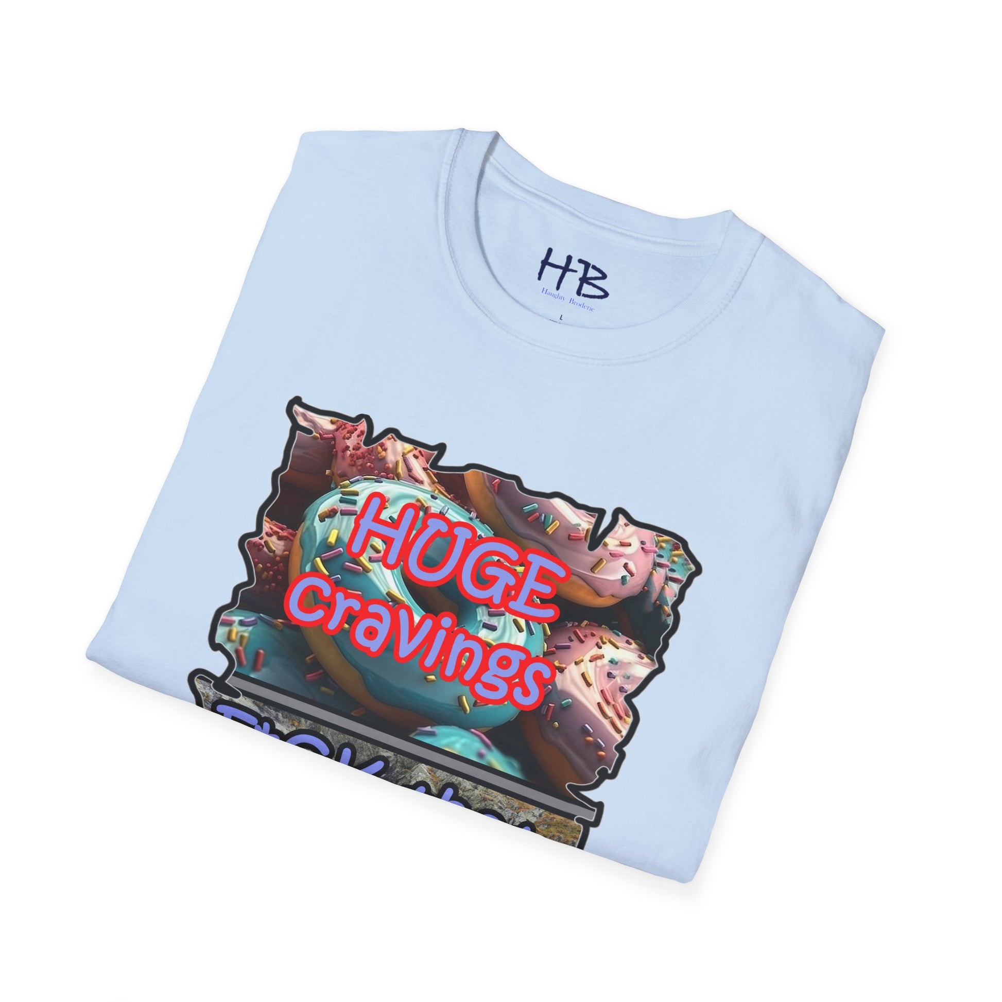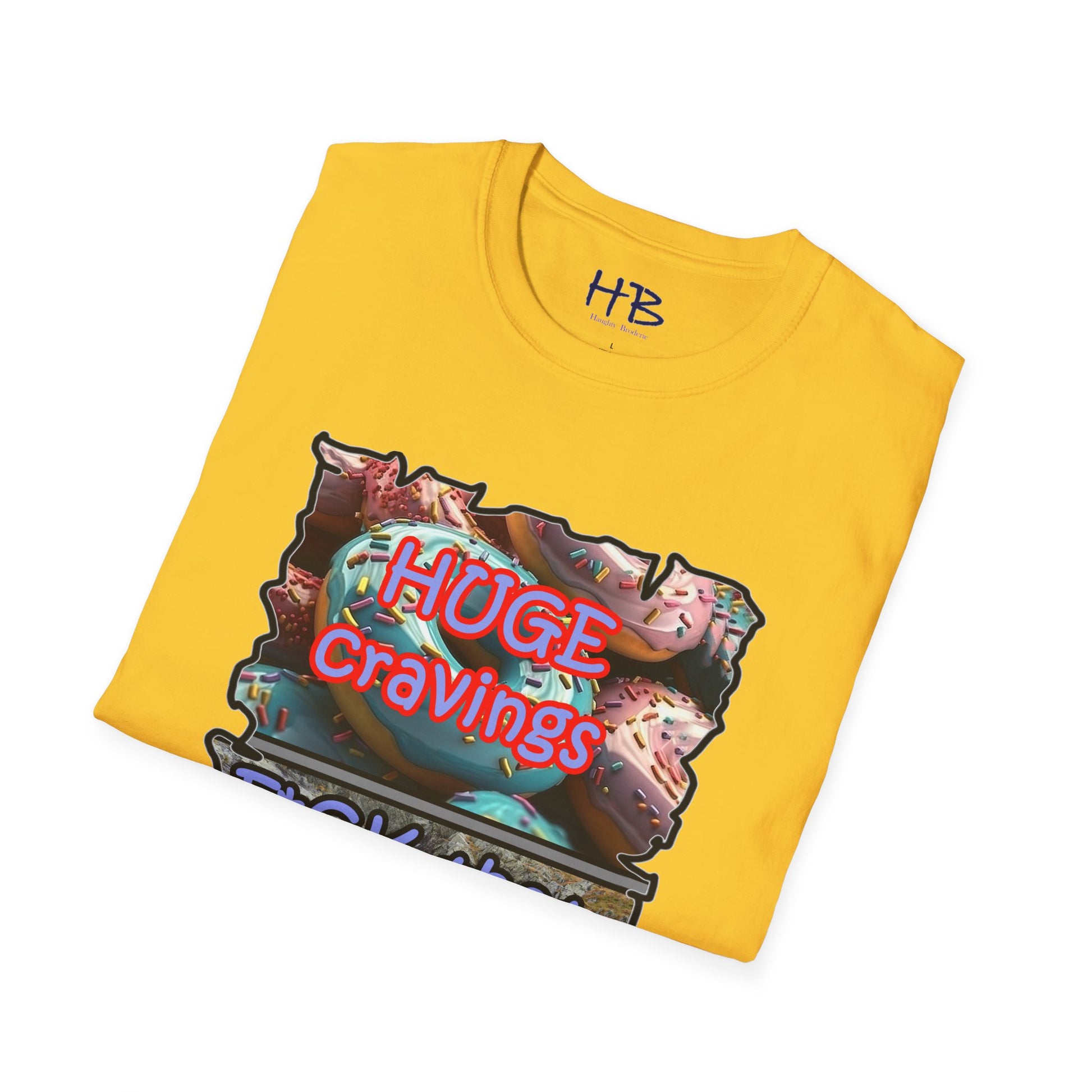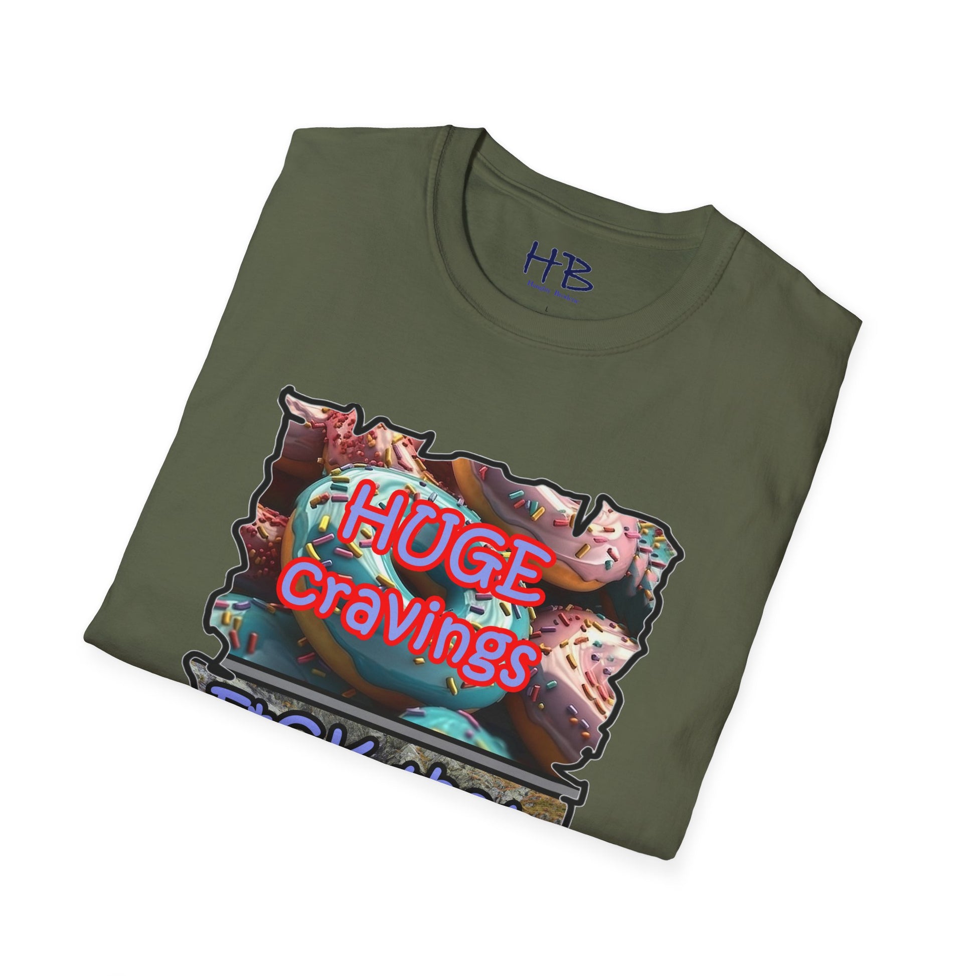Introducing our remarkable tee shirt that combines delectable imagery and powerful messaging to make a statement in today's world. Feast your eyes on the top image, adorned with luscious glazed donuts boasting irresistible toppings. As you admire the tantalizing treats, the text boldly declares "HUGE CRAVINGS," capturing the essence of indulgence and temptation.