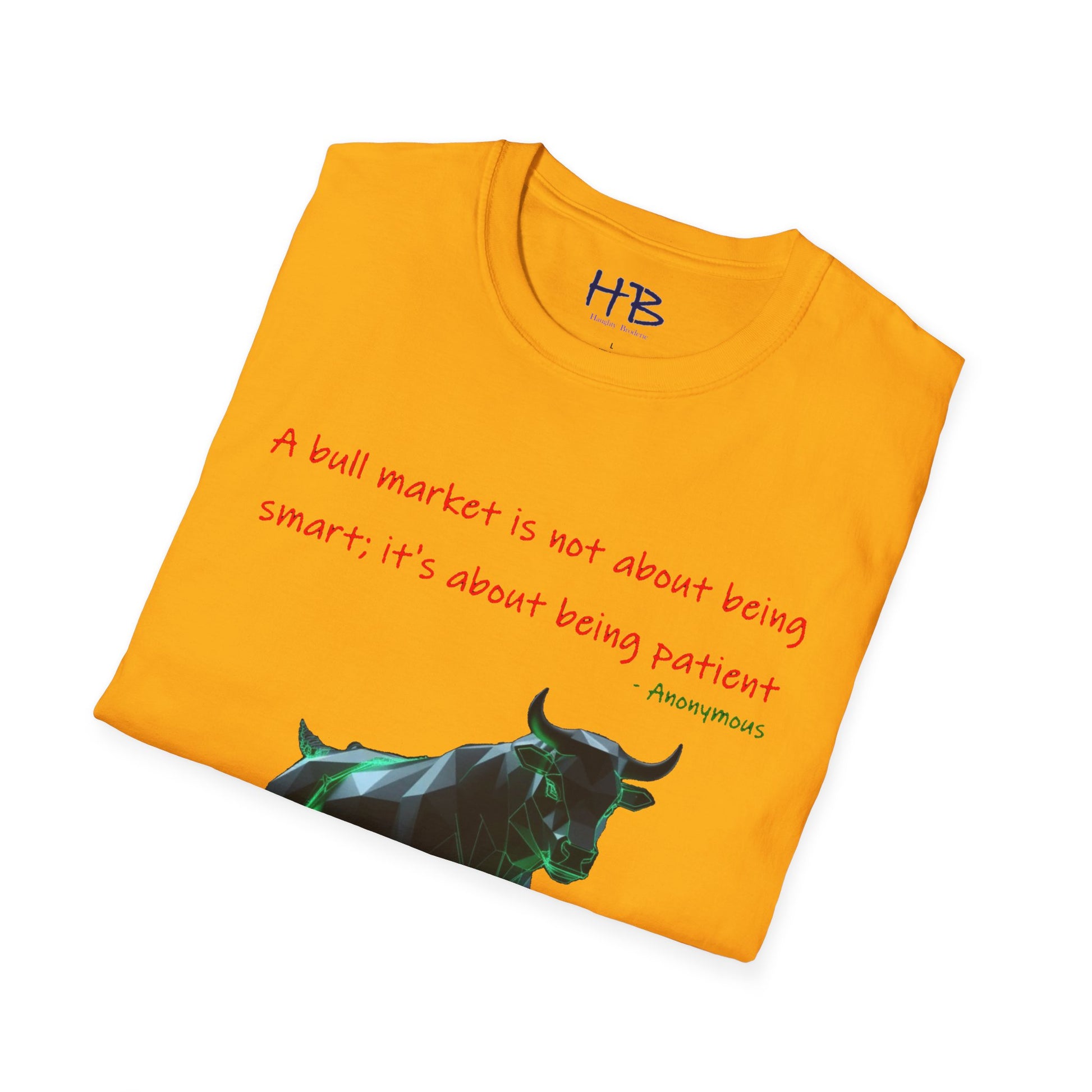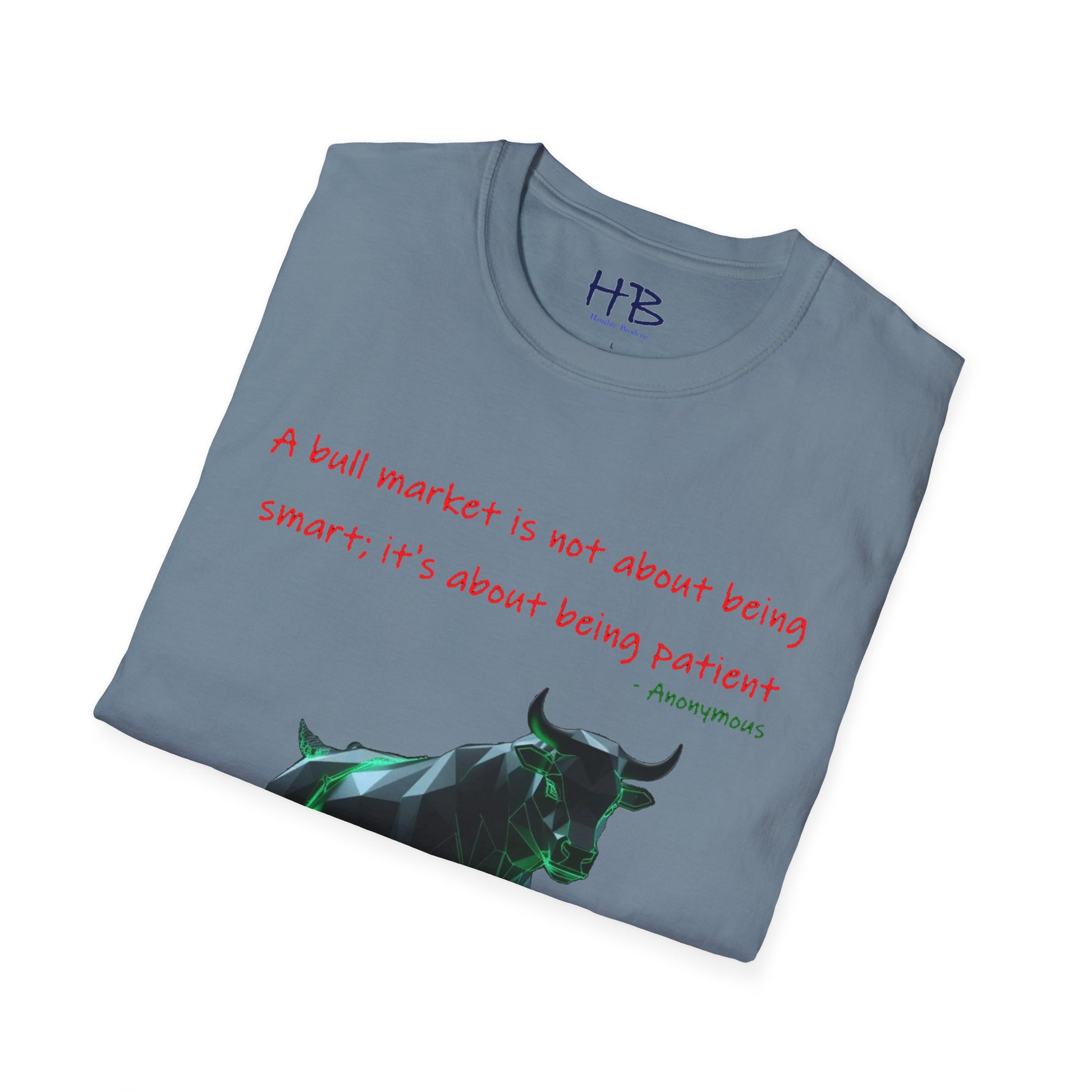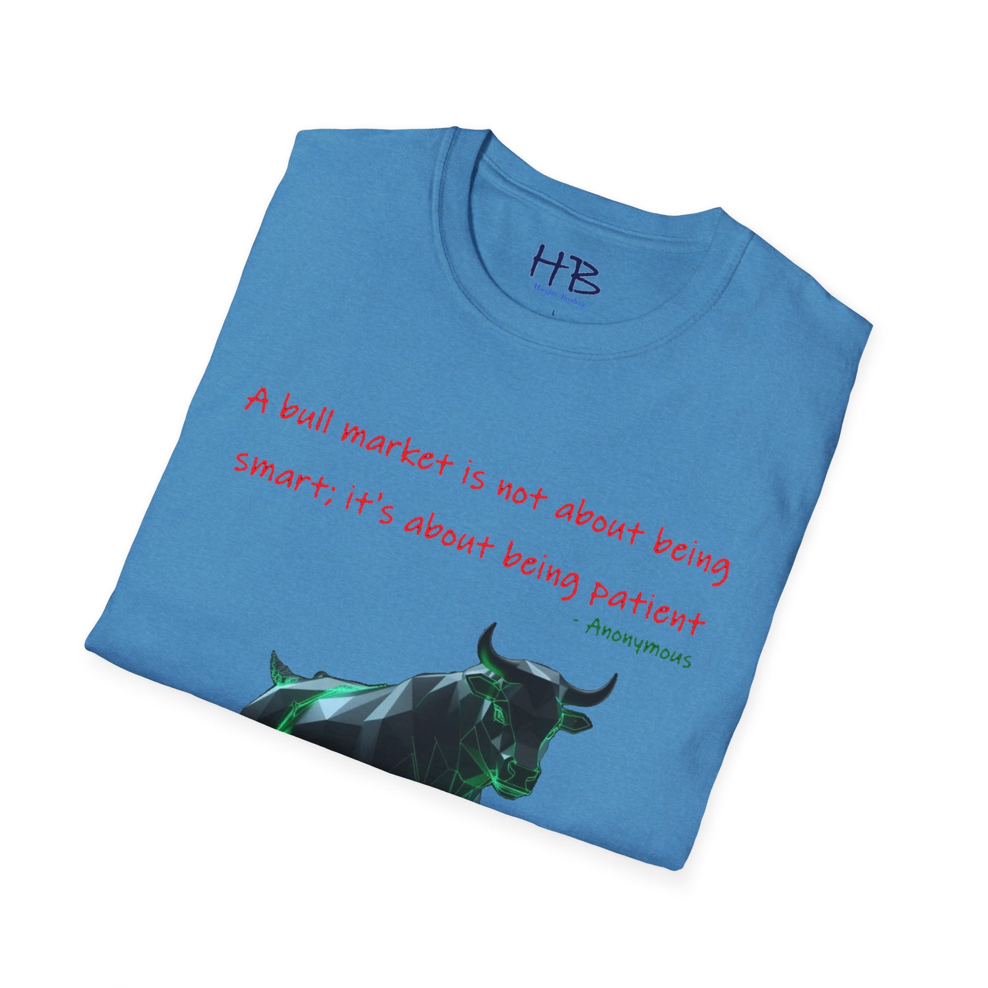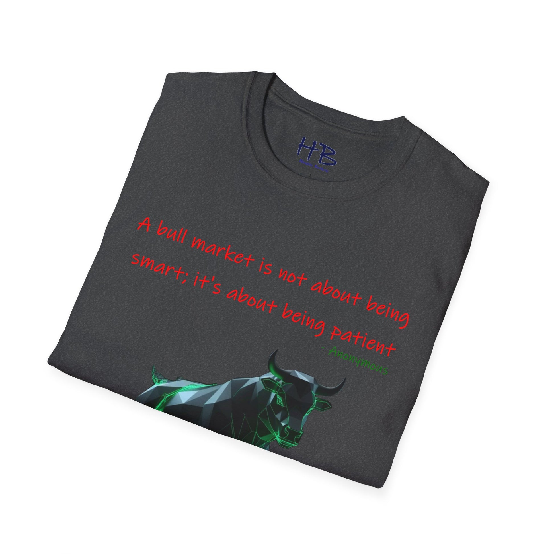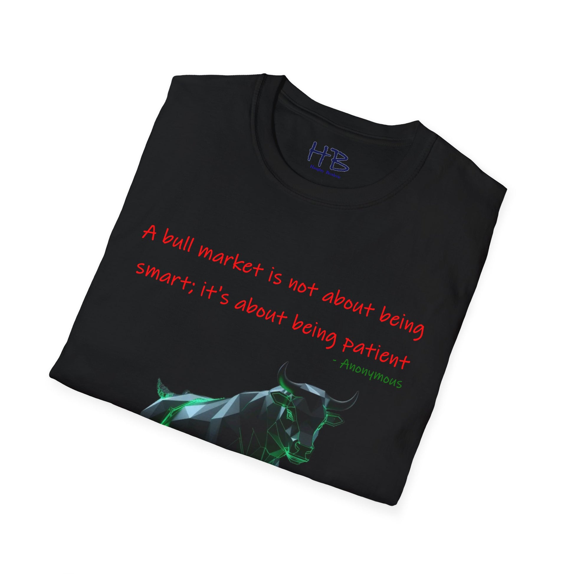 Introducing our exclusive garment adorned with a striking 3D-rendered depiction of a powerful bull, complemented by the text, "A bull market is not about being smart; it's about being patient -Anonymous." This unique tee shirt encapsulates the essence of a "bull market" in finance, reminding us that it's not merely about intellect, but rather, about the virtue of patience - a timeless sentiment anonymously echoed.