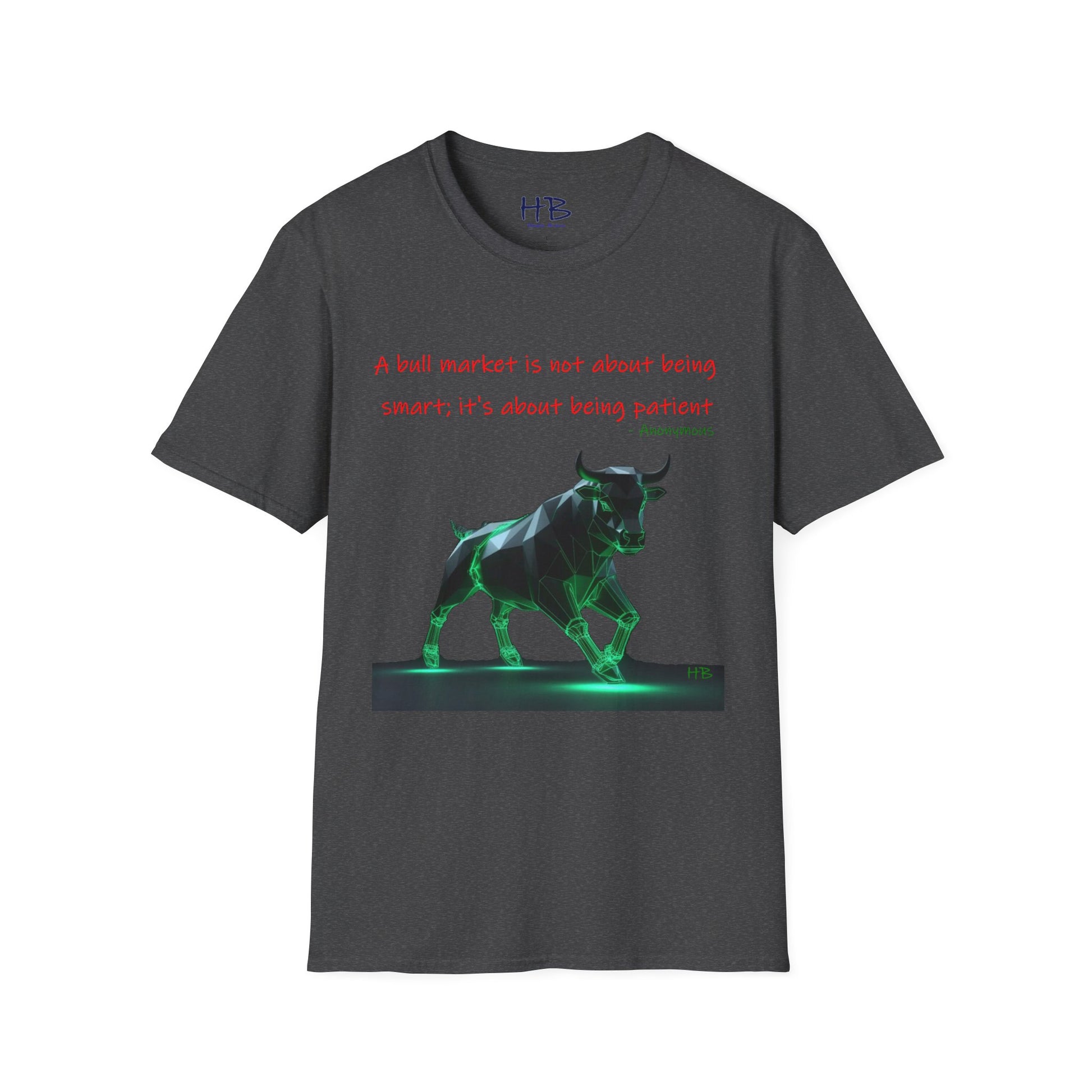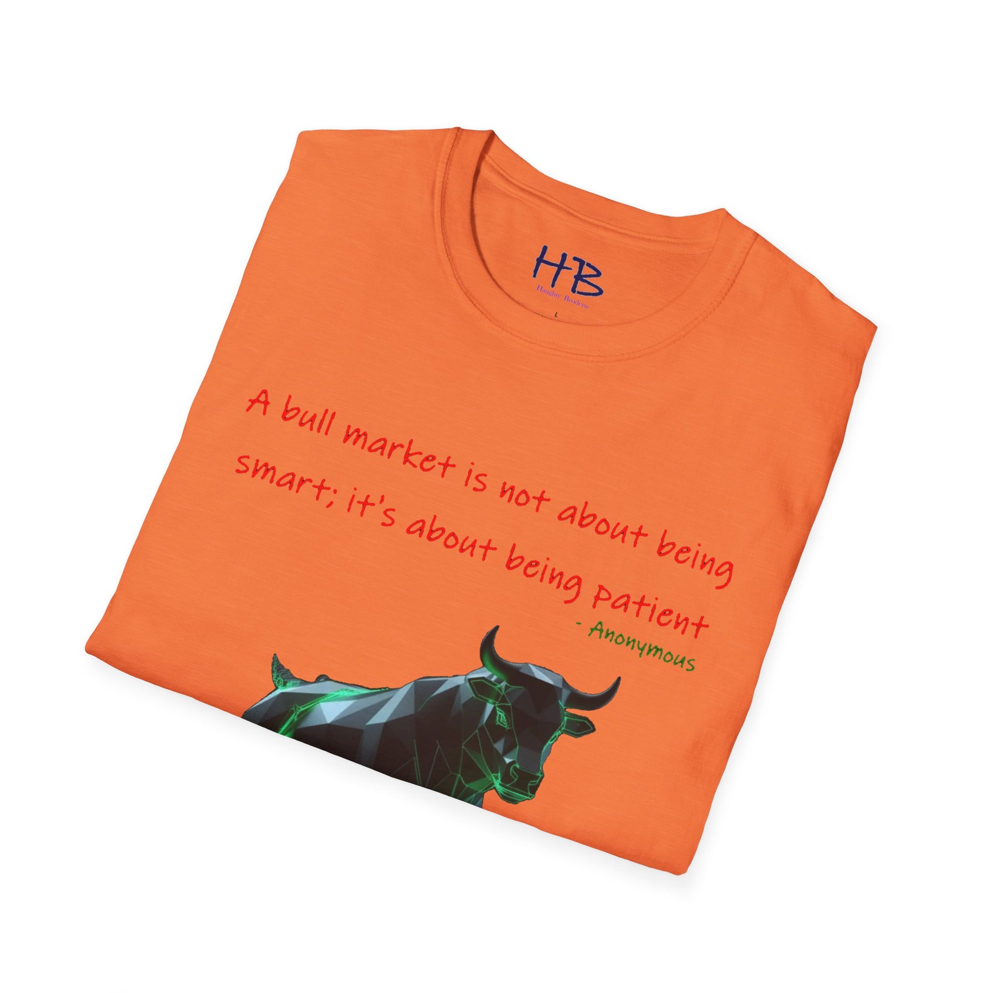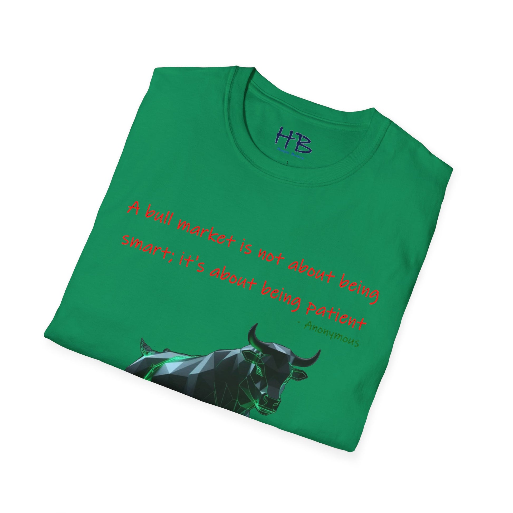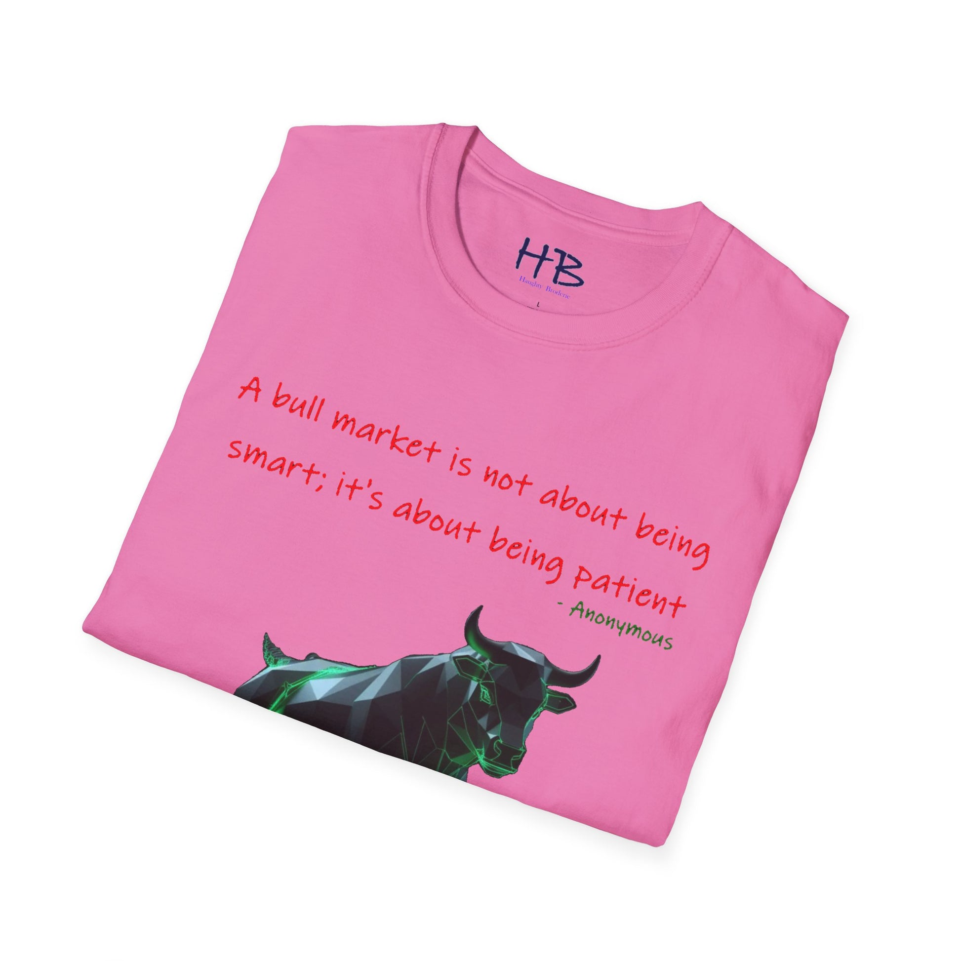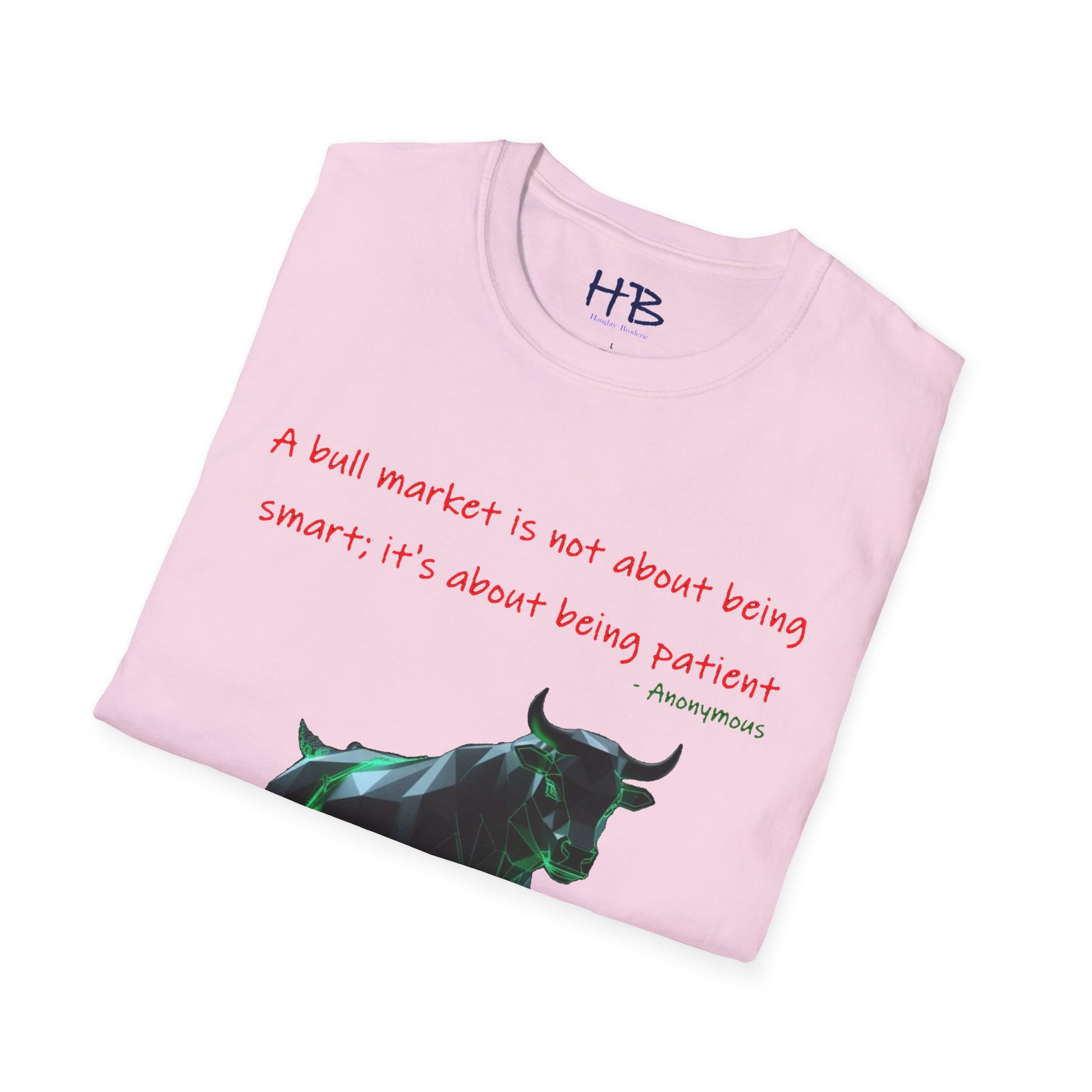 Introducing our exclusive garment adorned with a striking 3D-rendered depiction of a powerful bull, complemented by the text, "A bull market is not about being smart; it's about being patient -Anonymous." This unique tee shirt encapsulates the essence of a "bull market" in finance, reminding us that it's not merely about intellect, but rather, about the virtue of patience - a timeless sentiment anonymously echoed.