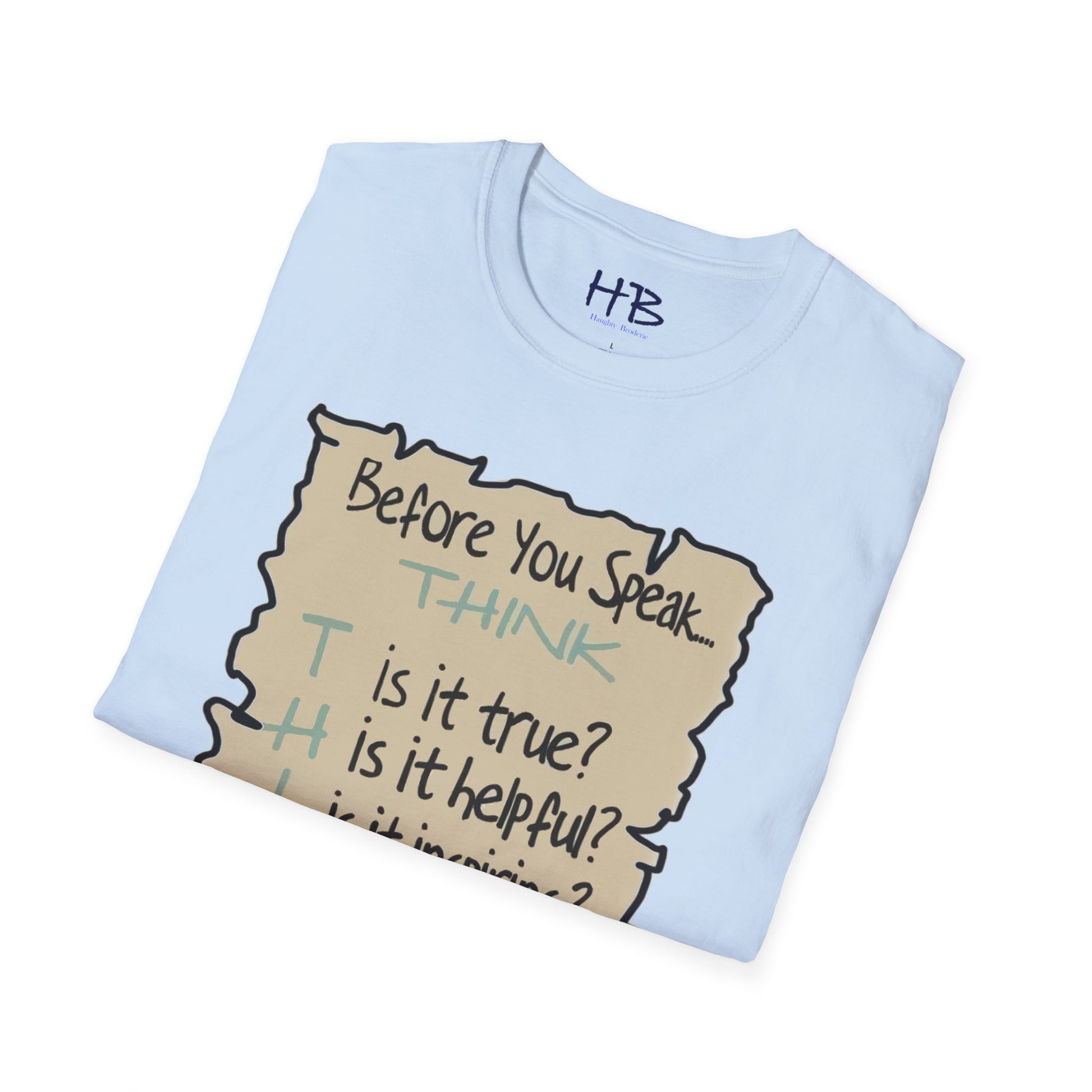 Introducing our thought-provoking and socially-conscious garment featuring the inspiring message, "Before you Speak... THINK: T is it true? H is it helpful? I is it inspiring? N is it necessary? K is it kind?" This tee shirt serves as a powerful reminder of the values we should all uphold in today's world.