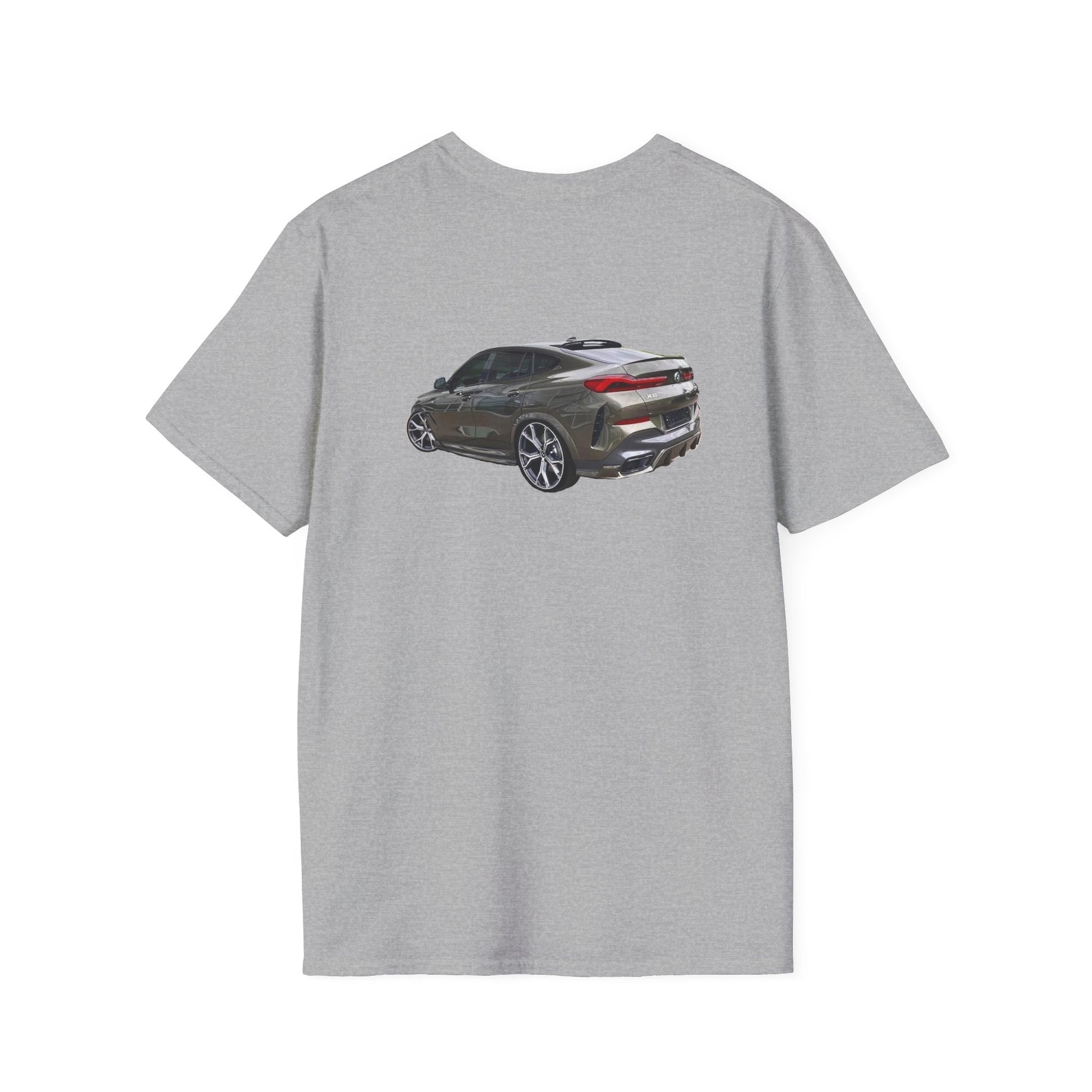 Picture yourself strolling through the city streets, adorned in this unique masterpiece. The front of the shirt showcases a striking image of the sleek, grey BMW M X6, its silhouette exuding power and prestige. The lines of the car are a harmonious blend of form and function, mirroring the standards of excellence you hold for yourself.