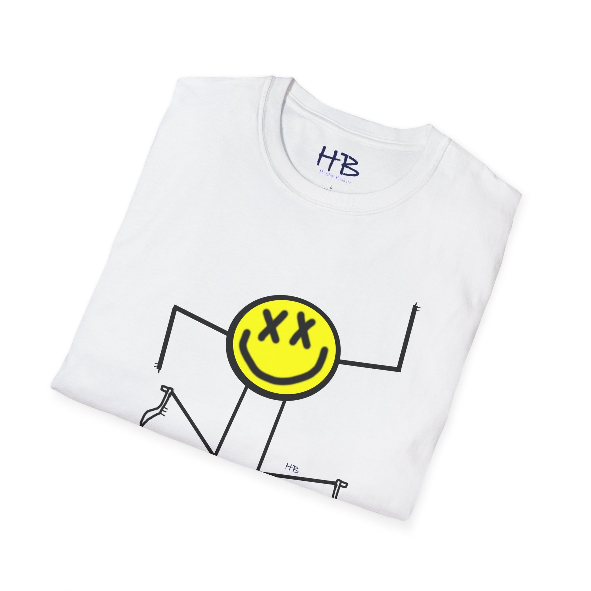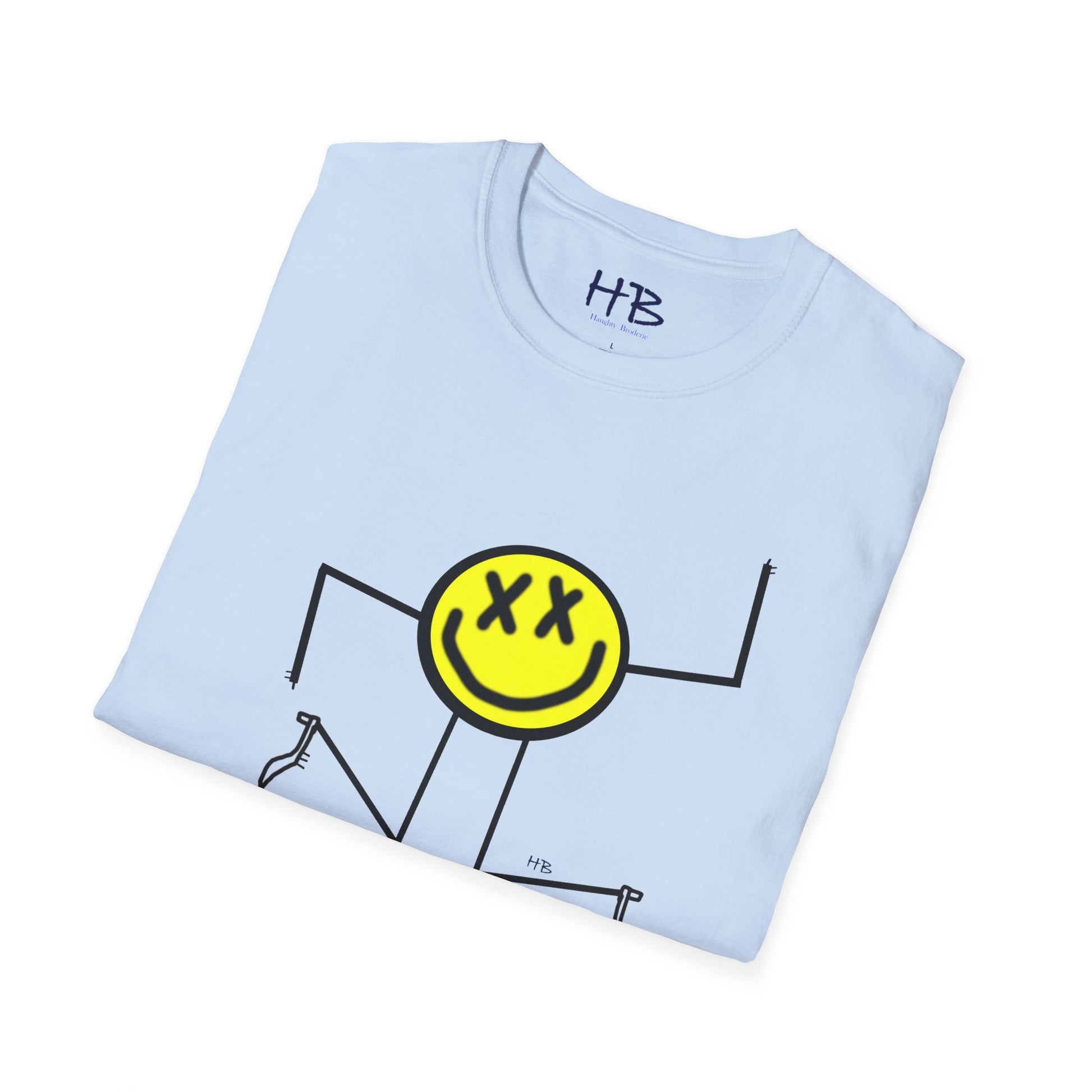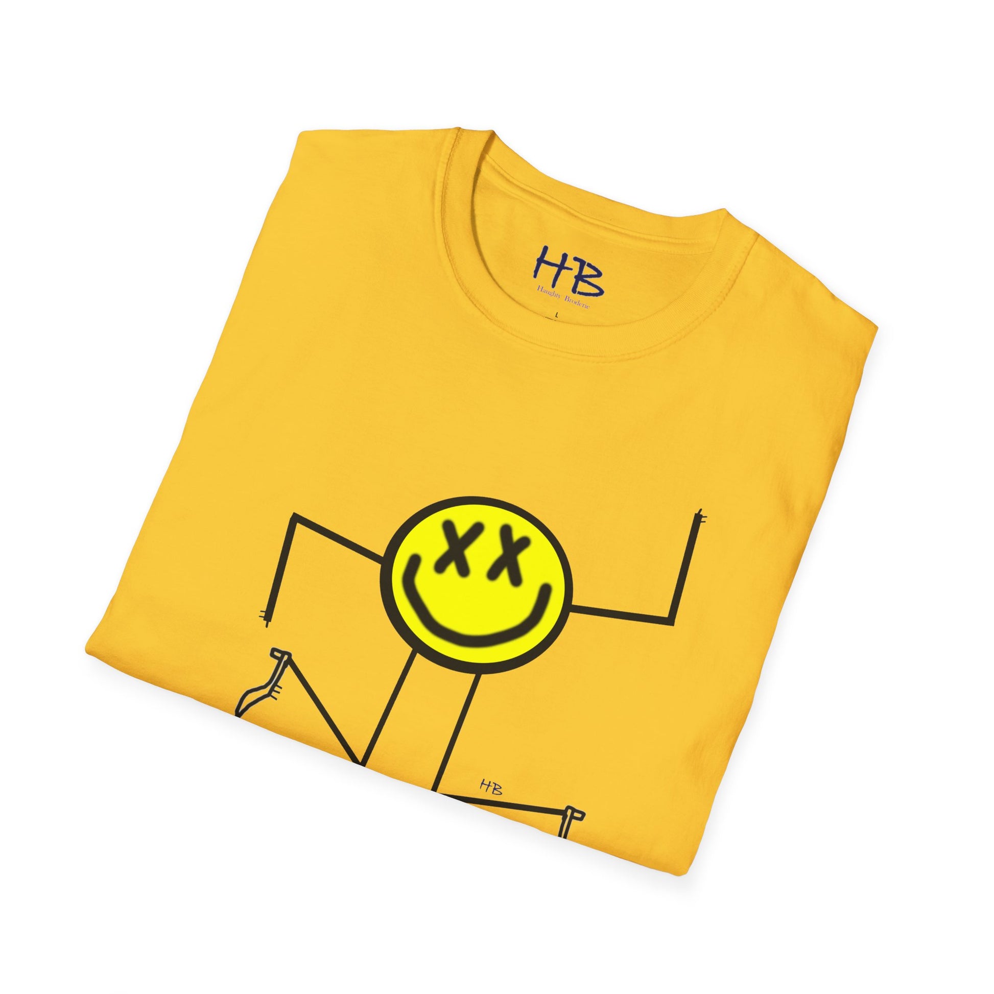 Introducing our latest creation, a remarkable garment that encapsulates joy and exuberance - the ultimate expression of positivity! Imagine a shirt that effortlessly conveys a cheerful demeanor through its captivating design. Behold a delightful visage that captures a moment of unadulterated happiness – a vibrant smiling yellow face character, with its eyes twinkling playfully as x's, merrily swaying to its own rhythm with legs that sport a charmingly crooked stance.
