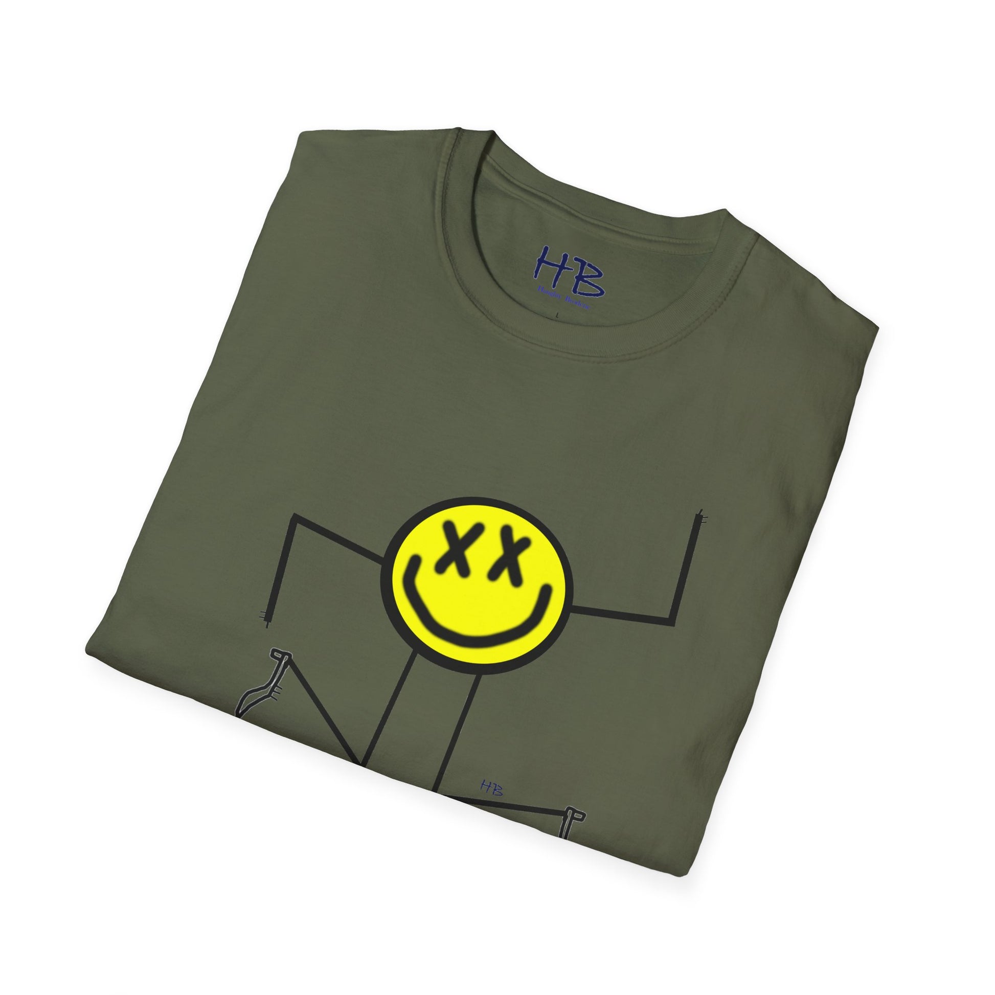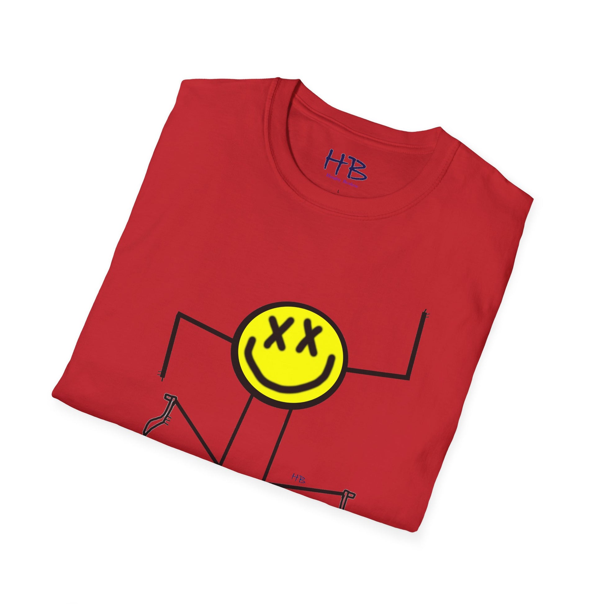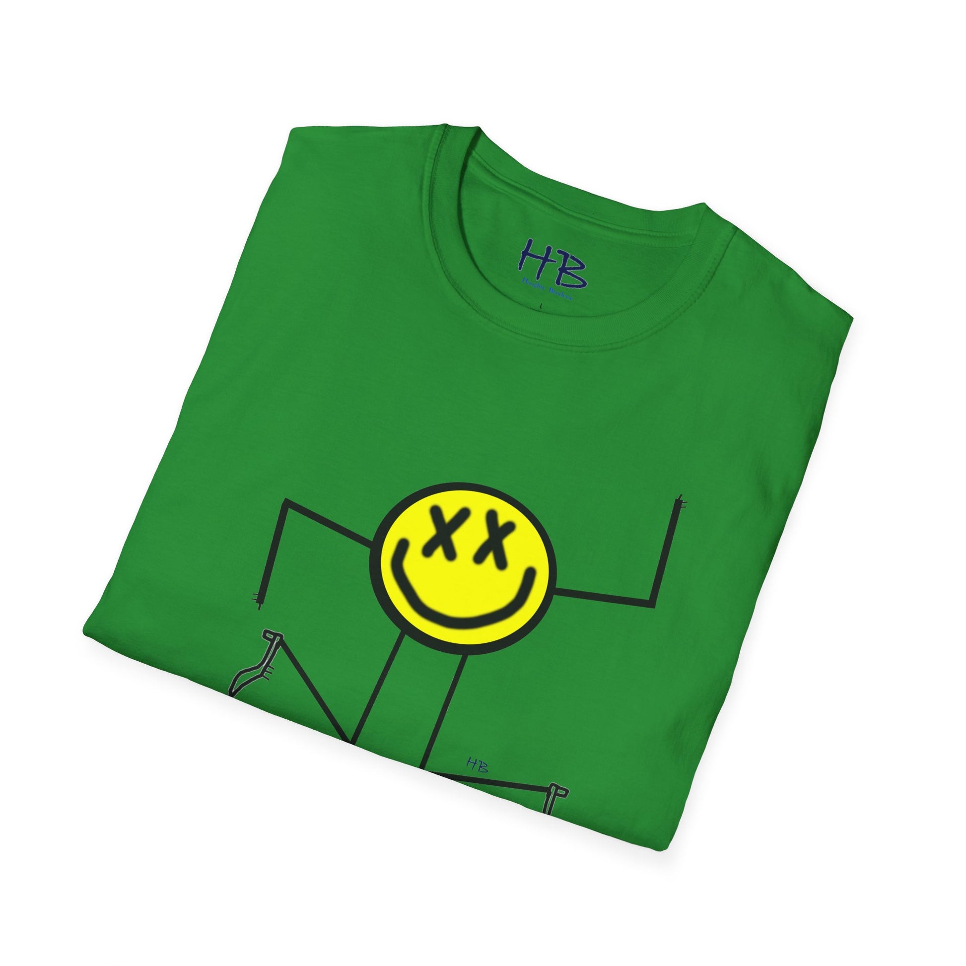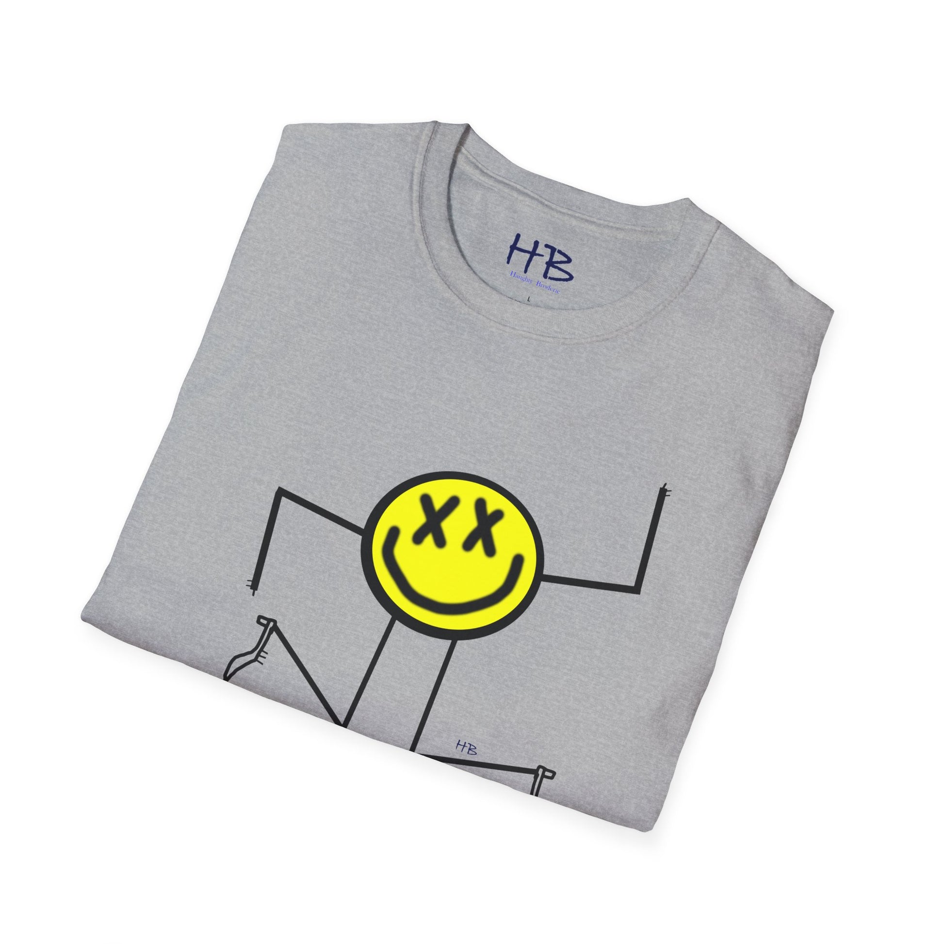 Introducing our latest creation, a remarkable garment that encapsulates joy and exuberance - the ultimate expression of positivity! Imagine a shirt that effortlessly conveys a cheerful demeanor through its captivating design. Behold a delightful visage that captures a moment of unadulterated happiness – a vibrant smiling yellow face character, with its eyes twinkling playfully as x's, merrily swaying to its own rhythm with legs that sport a charmingly crooked stance.