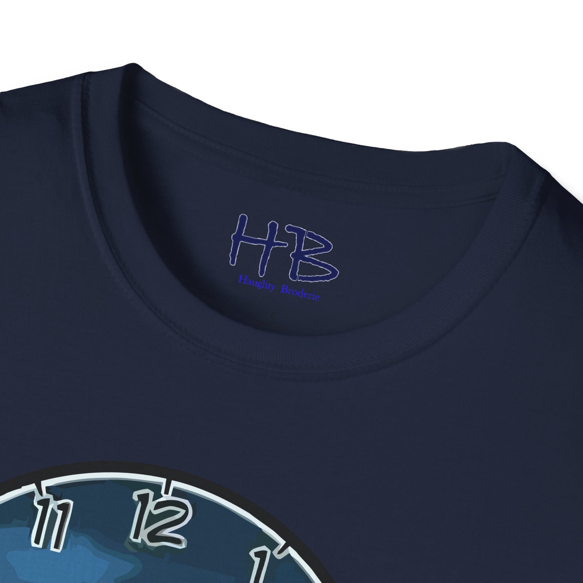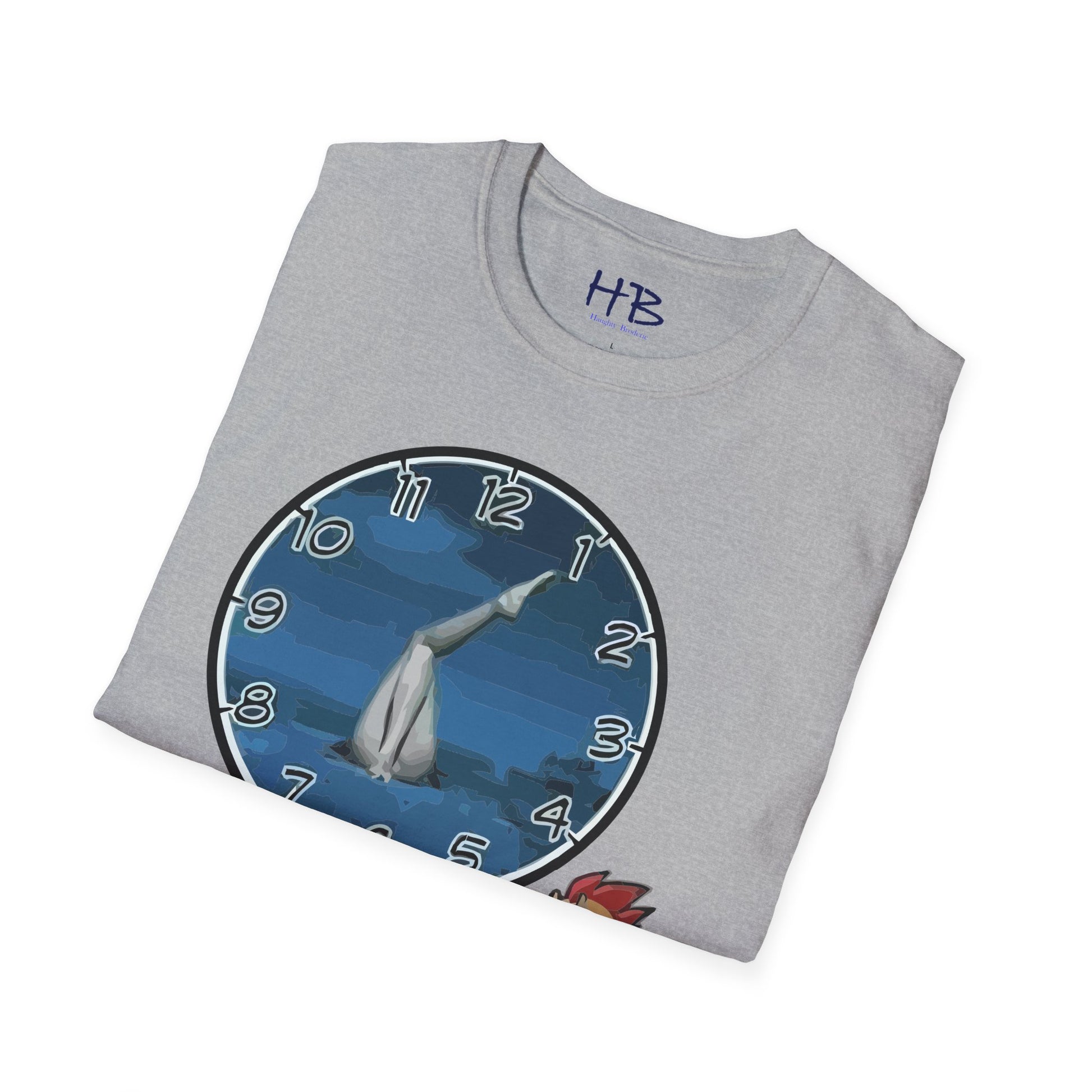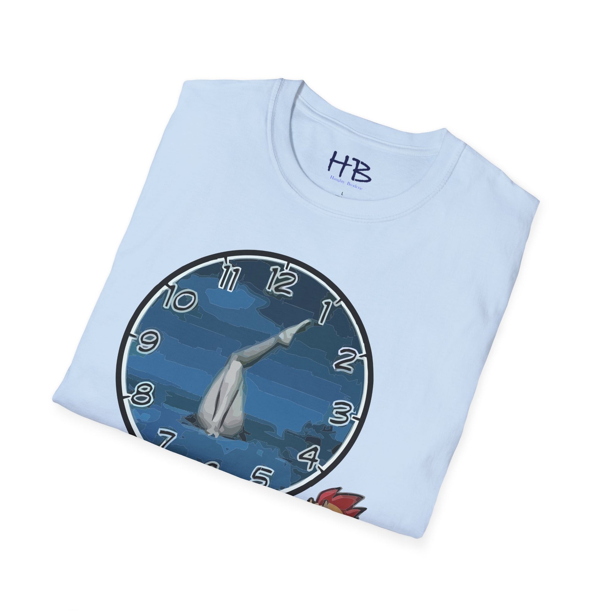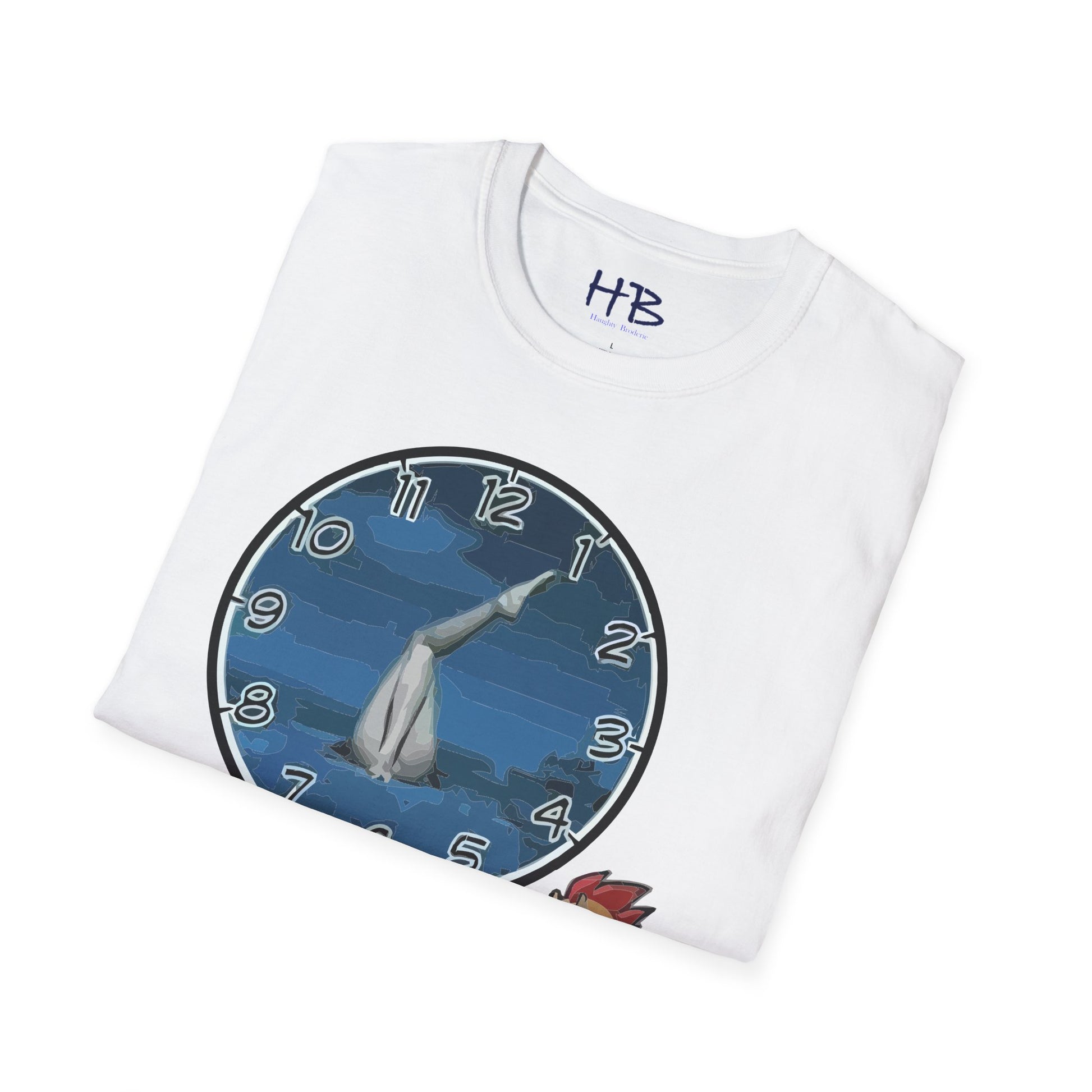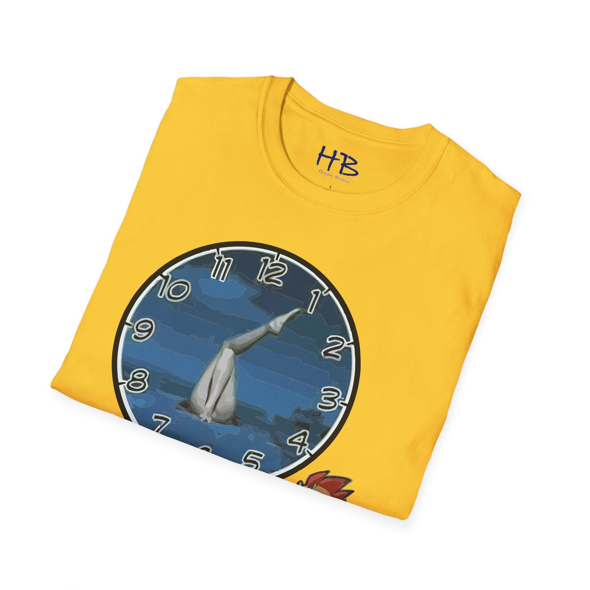 Introducing our hilarious and unique creation, the "Time for Laughter Tee!" This extraordinary tee shirt showcases a one-of-a-kind image that is guaranteed to make you burst into fits of laughter. Imagine a comical cartoon character, with a goofy expression on his face, anxiously staring at his watch. As you gaze closer, you'll notice the whimsical twist—the background of the image consists of a pair of woman's legs facing you. How cheeky!