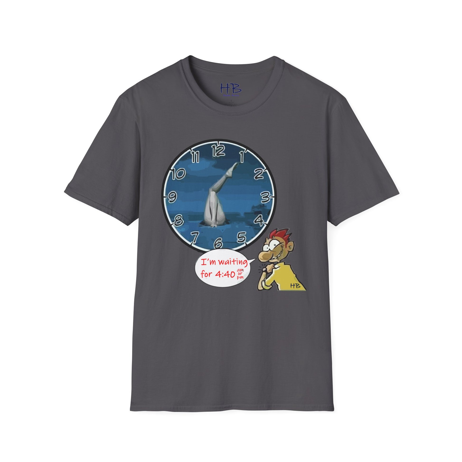 With the hour hand pointing at 06 and the minute hand at 05, our lovable dufus character eagerly awaits the moment when the clock strikes 4:40, be it AM or PM. Why, you ask? Well, because that's when the woman's legs will hilariously open up, revealing a hidden surprise. This playful and risqué concept adds an extra layer of amusement to the design, making it a conversation starter wherever you go.