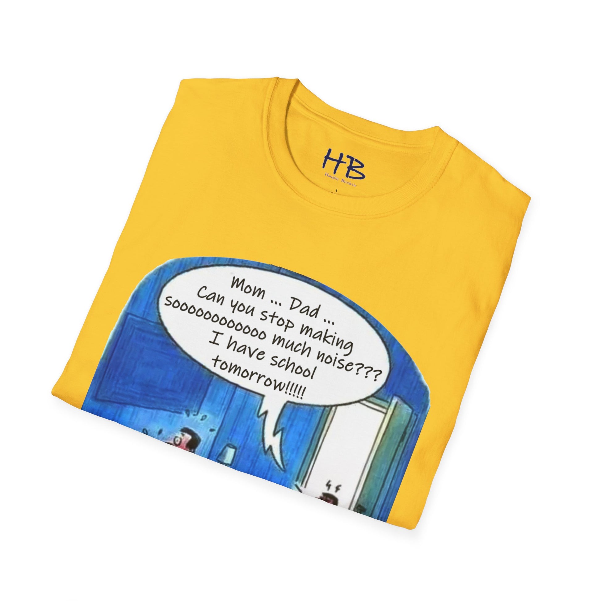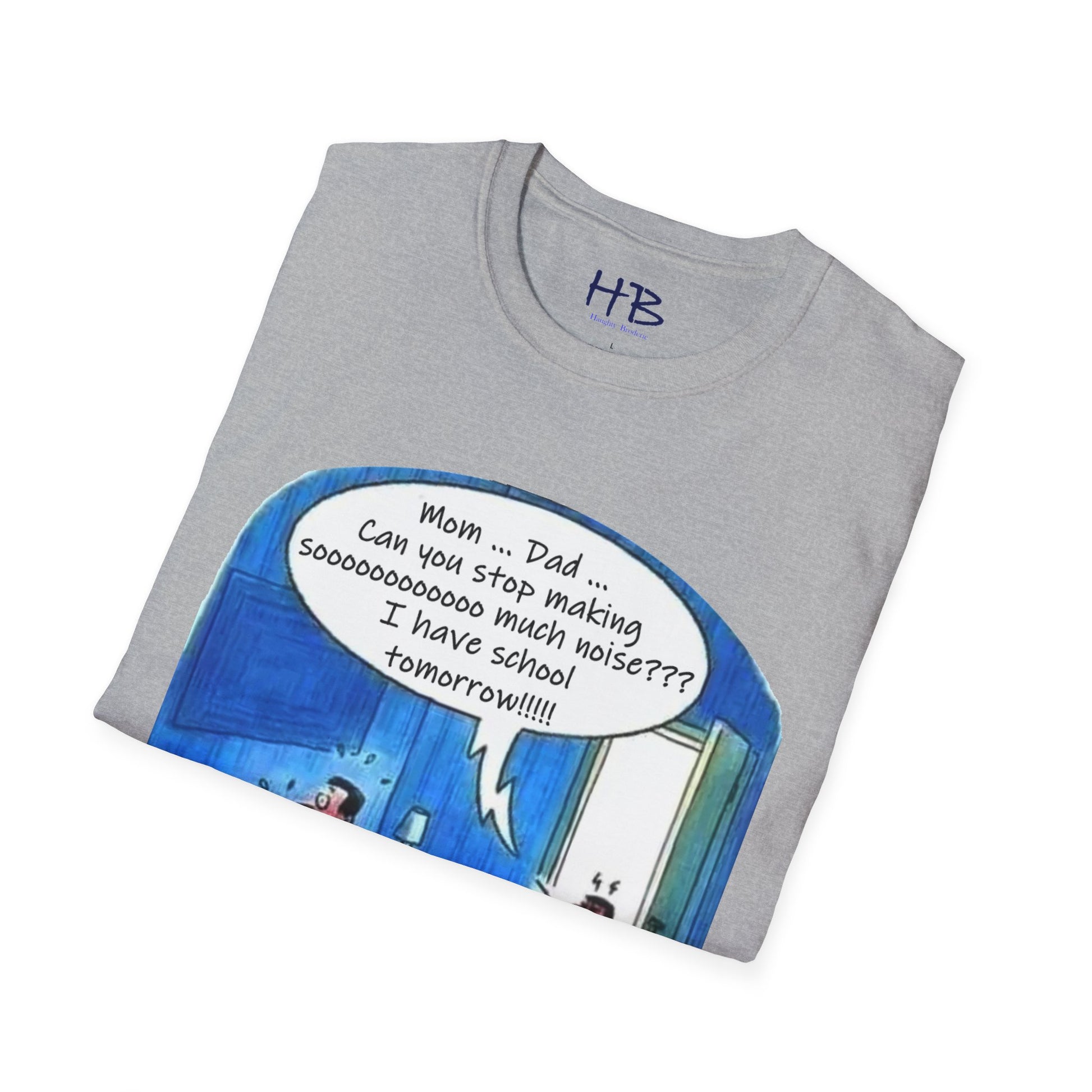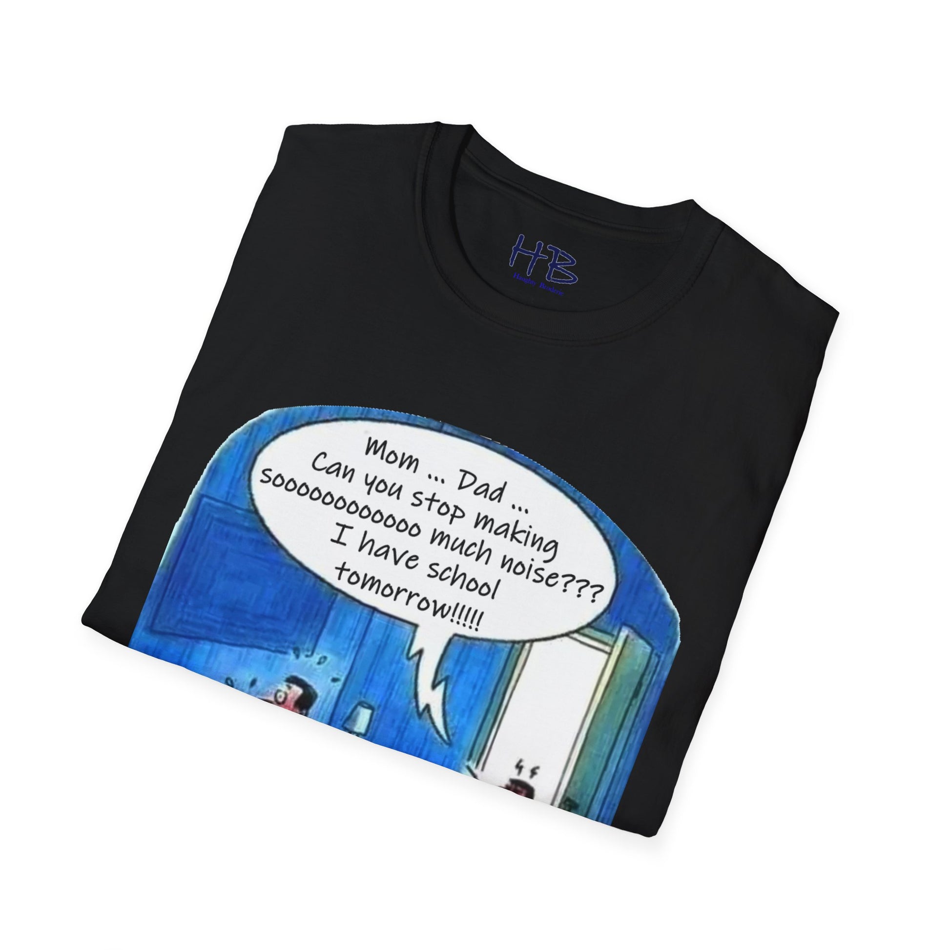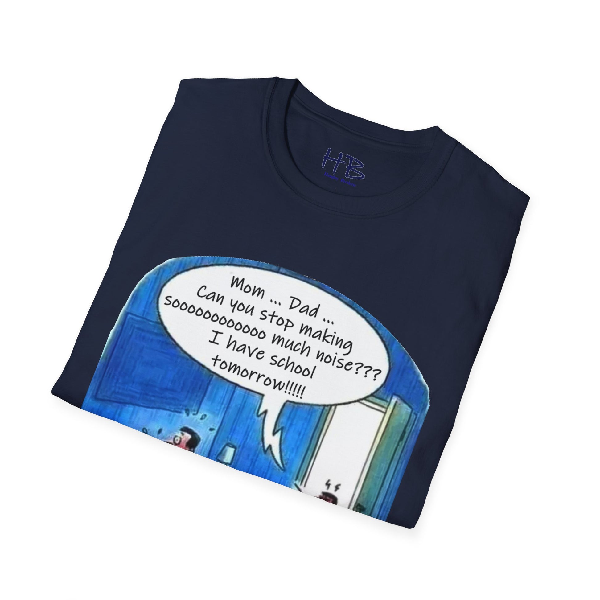 Introducing a remarkable piece of clothing that encapsulates humor and relatability like no other - a tee shirt featuring an amusing illustration. This shirt showcases a delightful scene of a disgruntled young boy, clutching his beloved teddy bear, as he throws open the bedroom door, catching his parents in the act of their nightly activities. With an exasperated expression, he exclaims, "Mom... Dad... Can you stop making soooooooooooooo much noise???? I have school tomorrow!!!!"