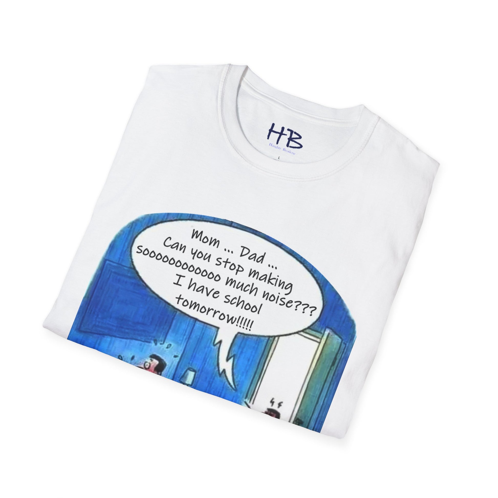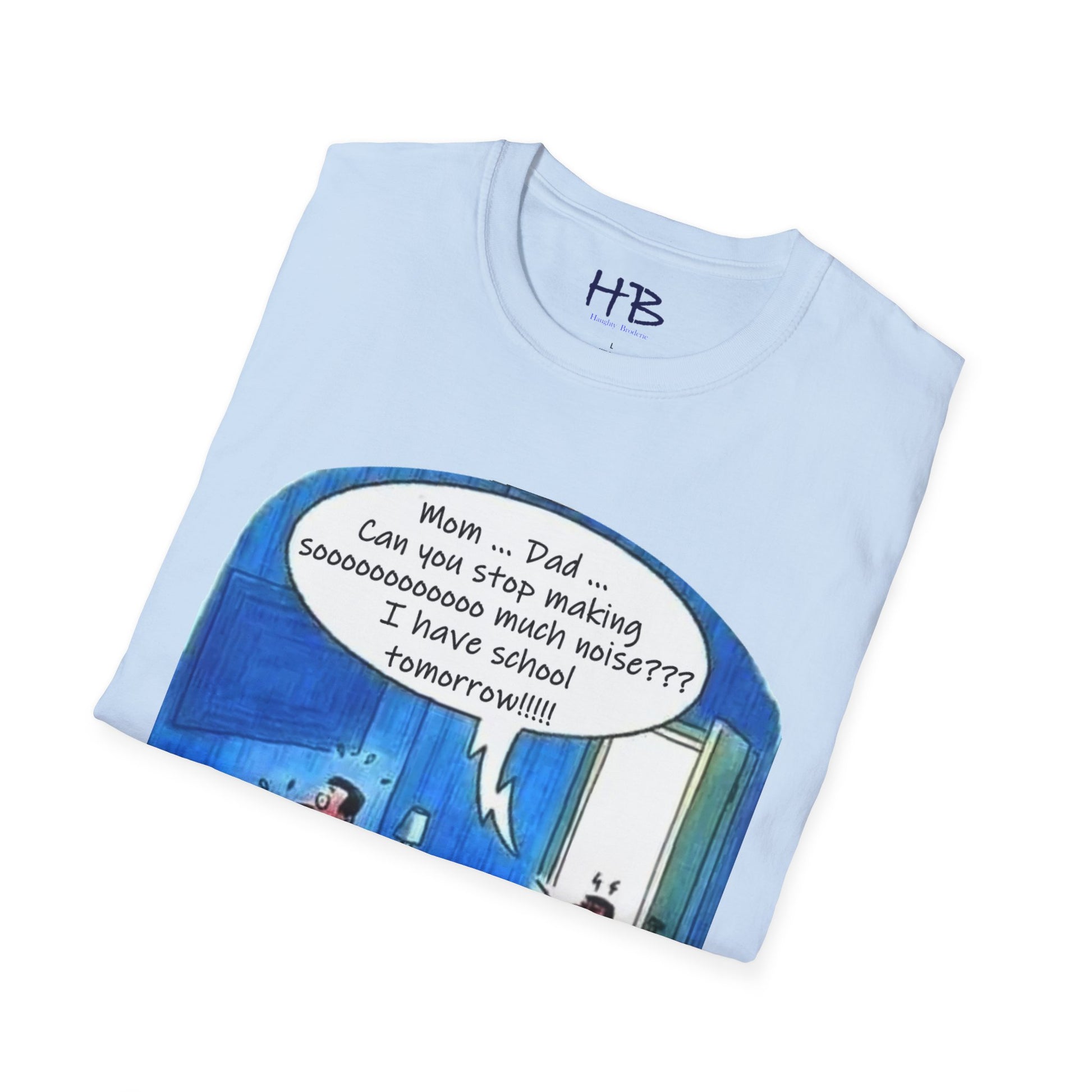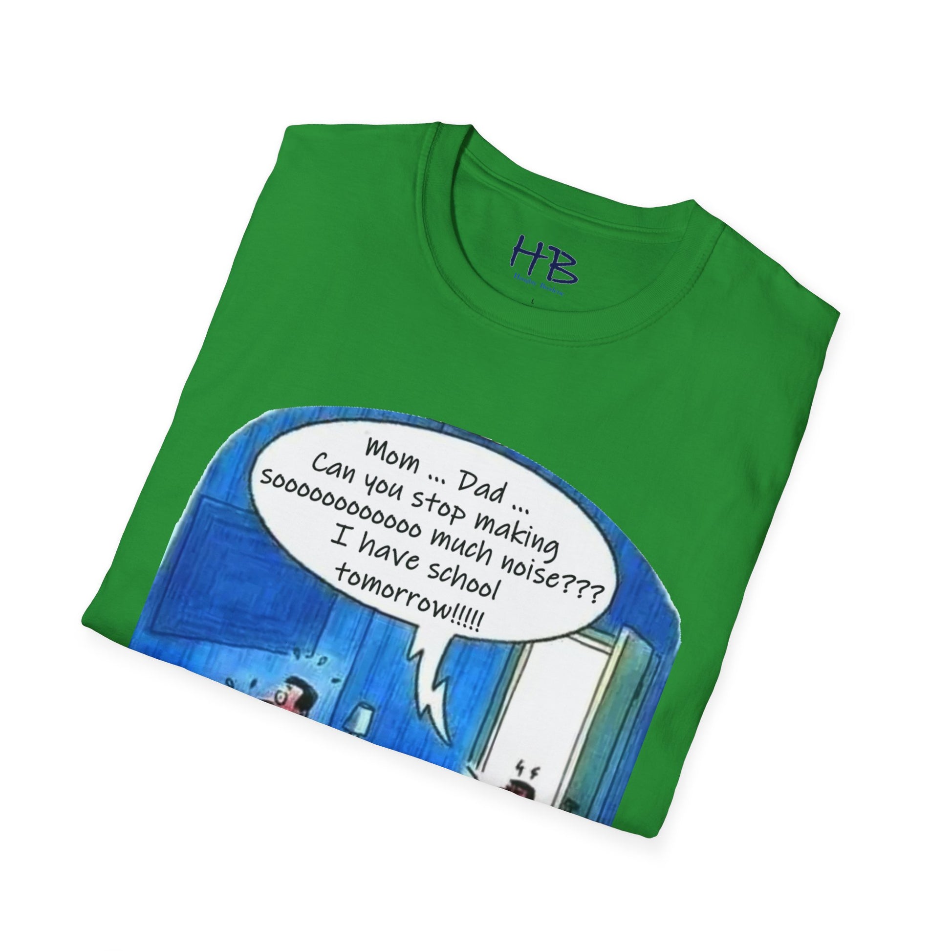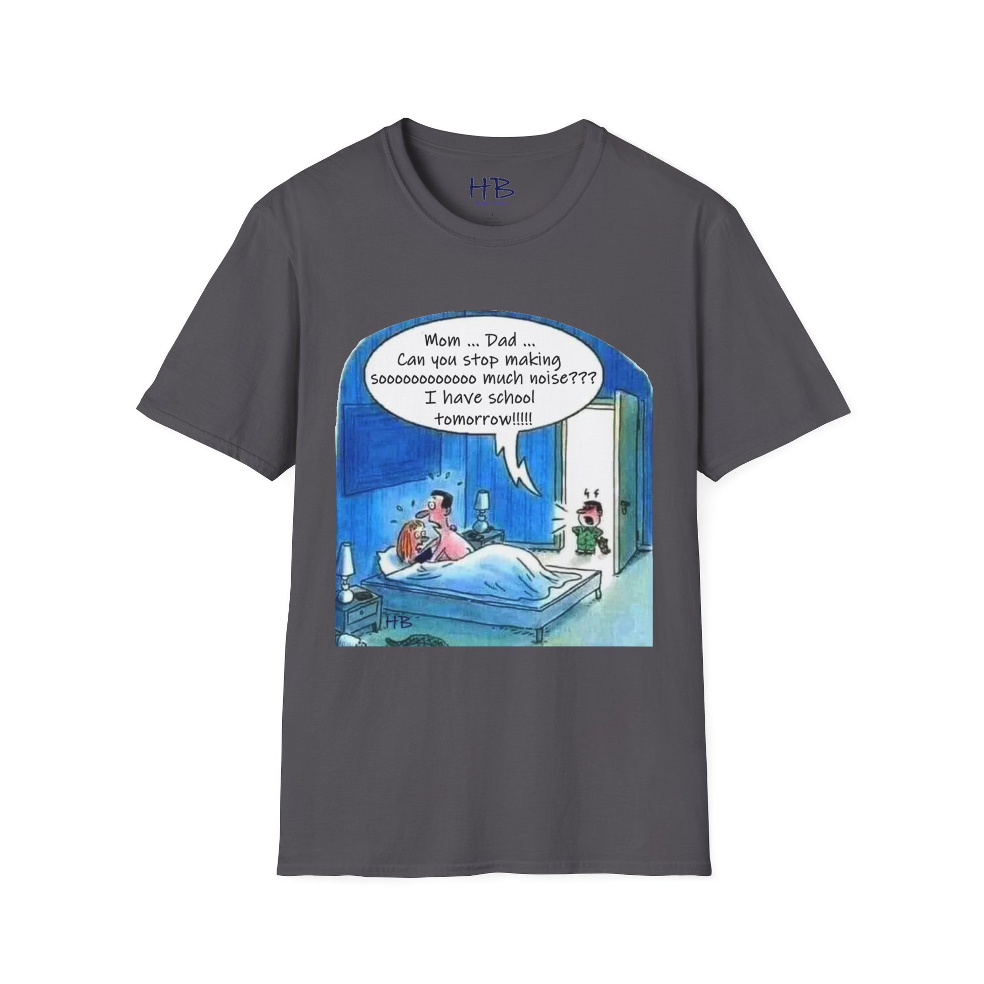 Introducing a remarkable piece of clothing that encapsulates humor and relatability like no other - a tee shirt featuring an amusing illustration. This shirt showcases a delightful scene of a disgruntled young boy, clutching his beloved teddy bear, as he throws open the bedroom door, catching his parents in the act of their nightly activities. With an exasperated expression, he exclaims, "Mom... Dad... Can you stop making soooooooooooooo much noise???? I have school tomorrow!!!!"