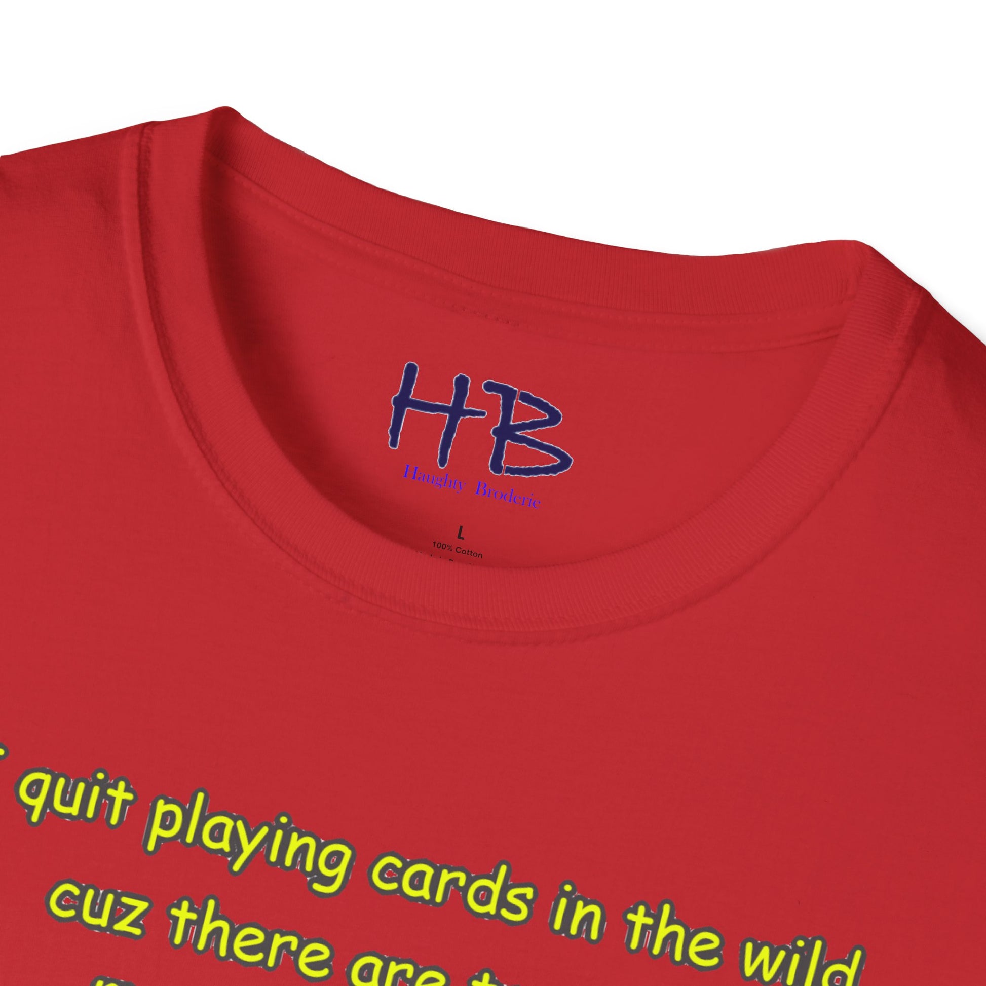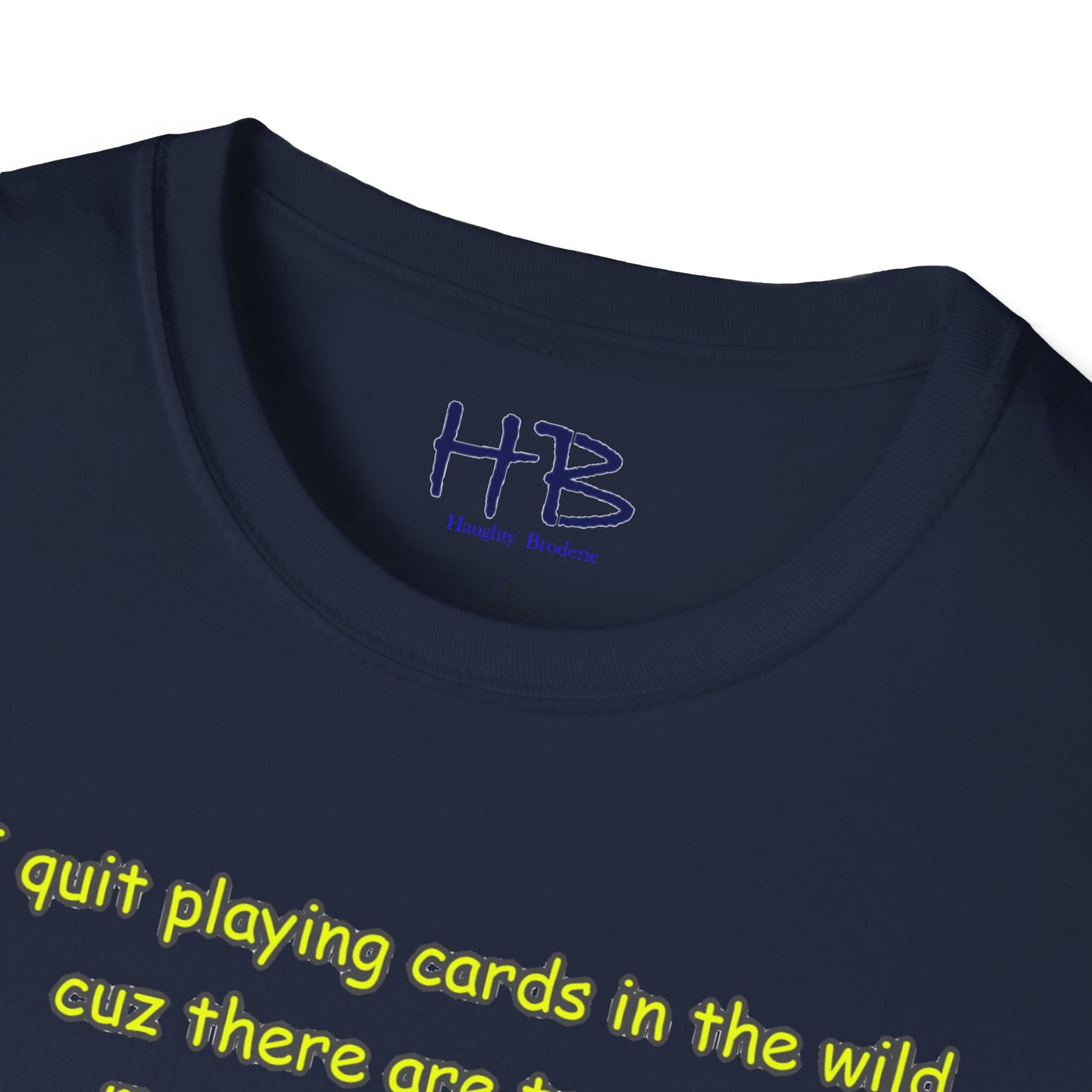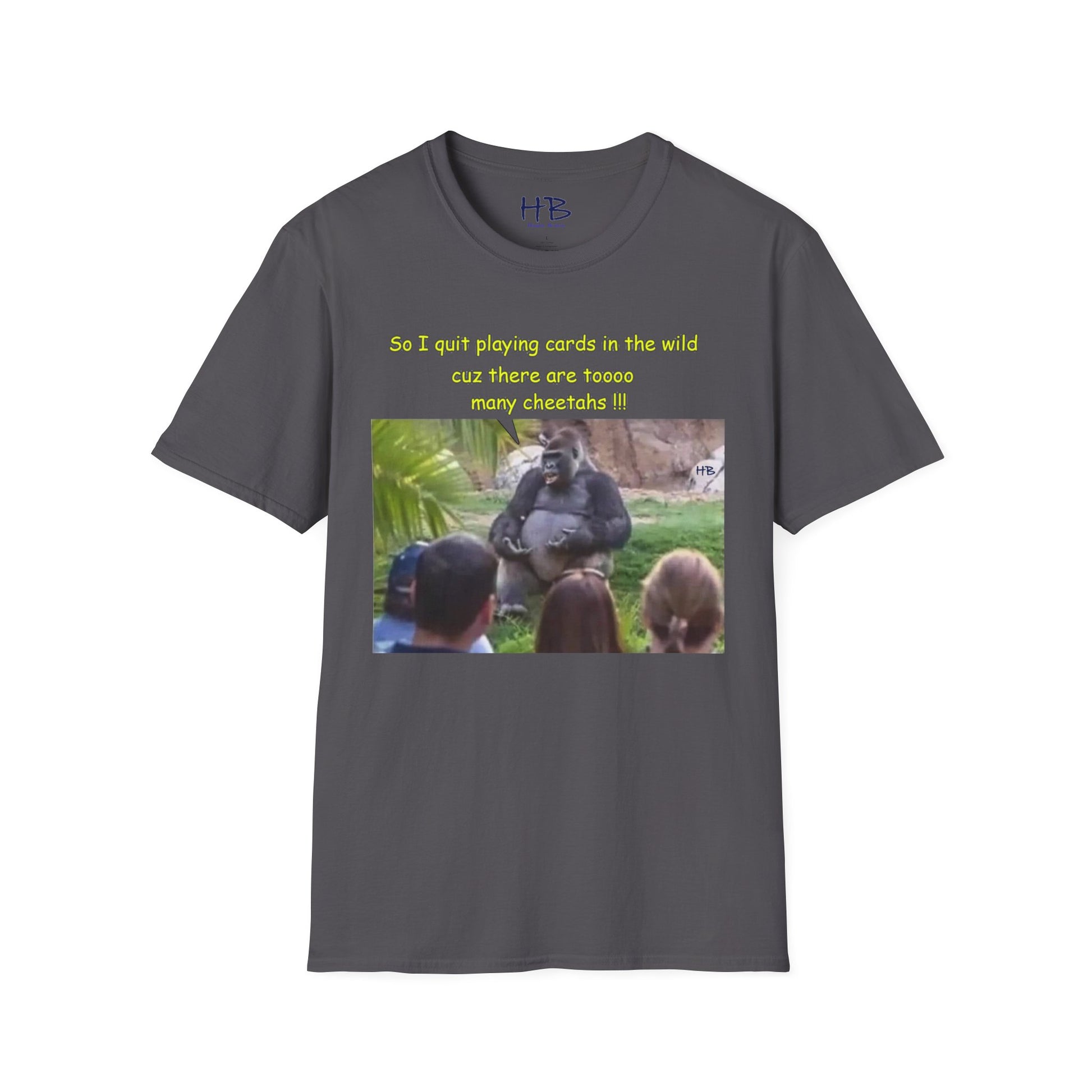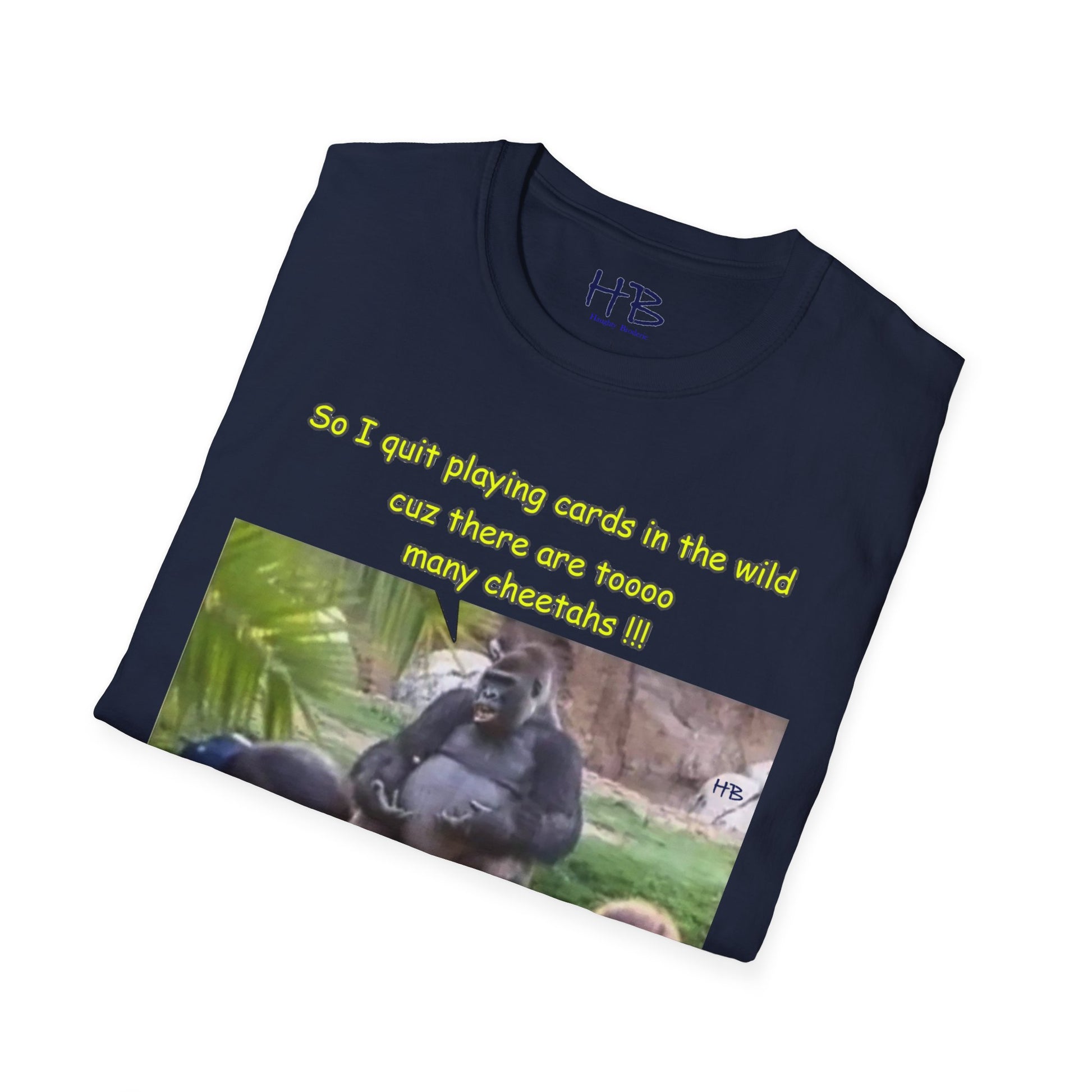 The image is accompanied by a witty text that reads, "So I quit playing cards in the wild cuz there are toooo many cheetahs." This playful phrase adds an extra layer of amusement to the design, reinforcing the comical nature of the scene.