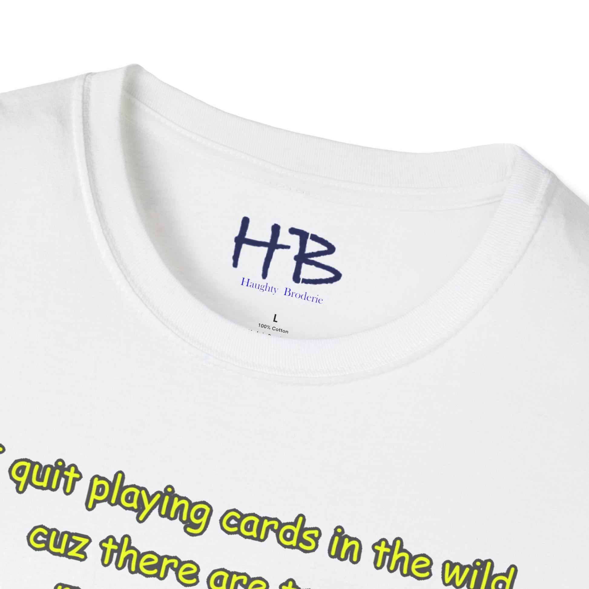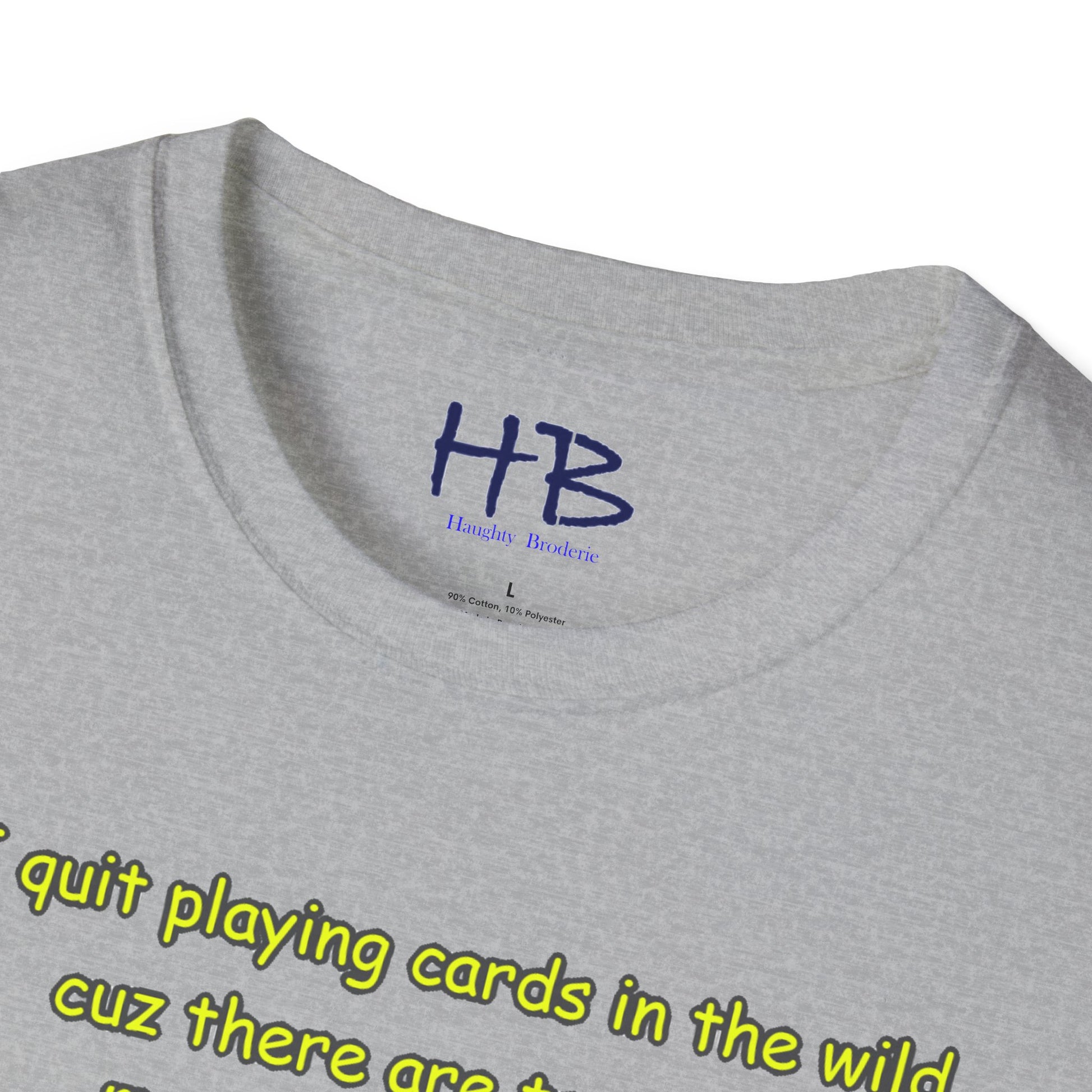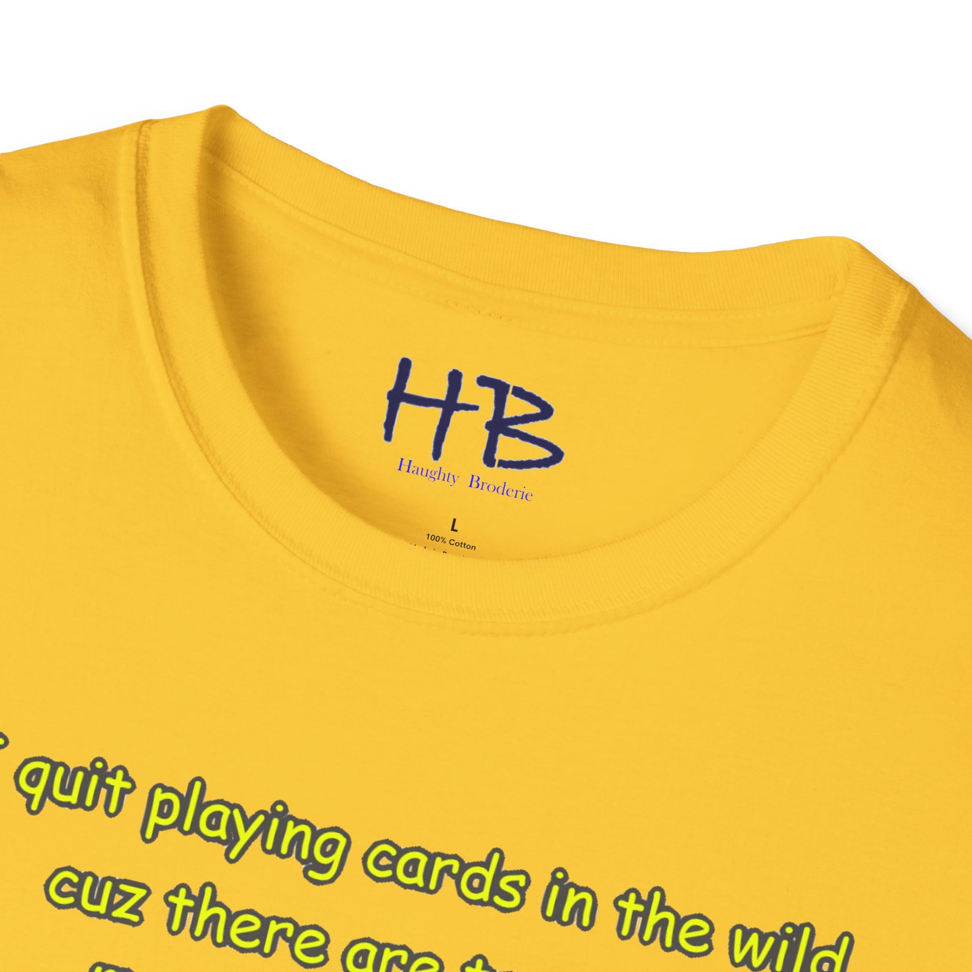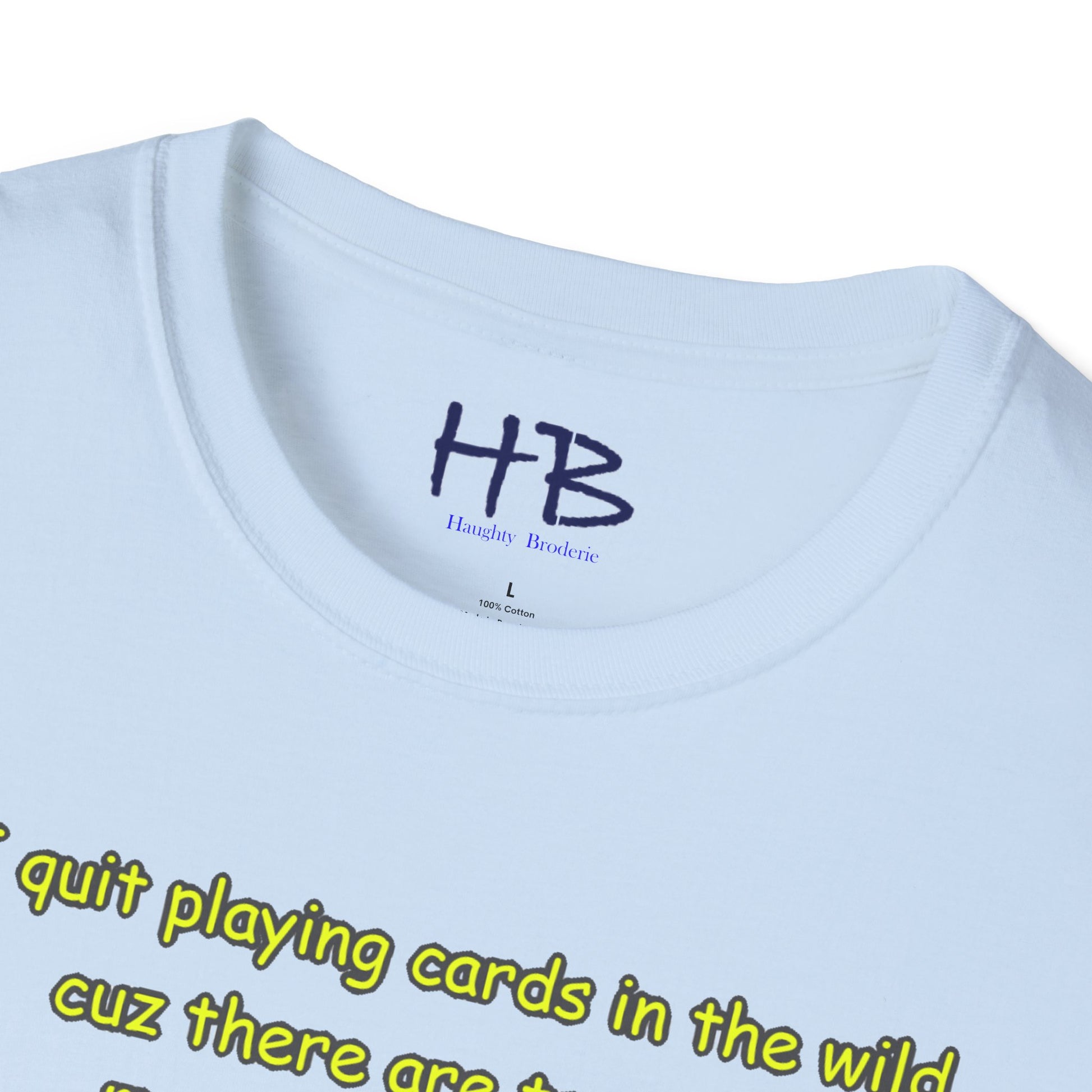 The image is accompanied by a witty text that reads, "So I quit playing cards in the wild cuz there are toooo many cheetahs." This playful phrase adds an extra layer of amusement to the design, reinforcing the comical nature of the scene.