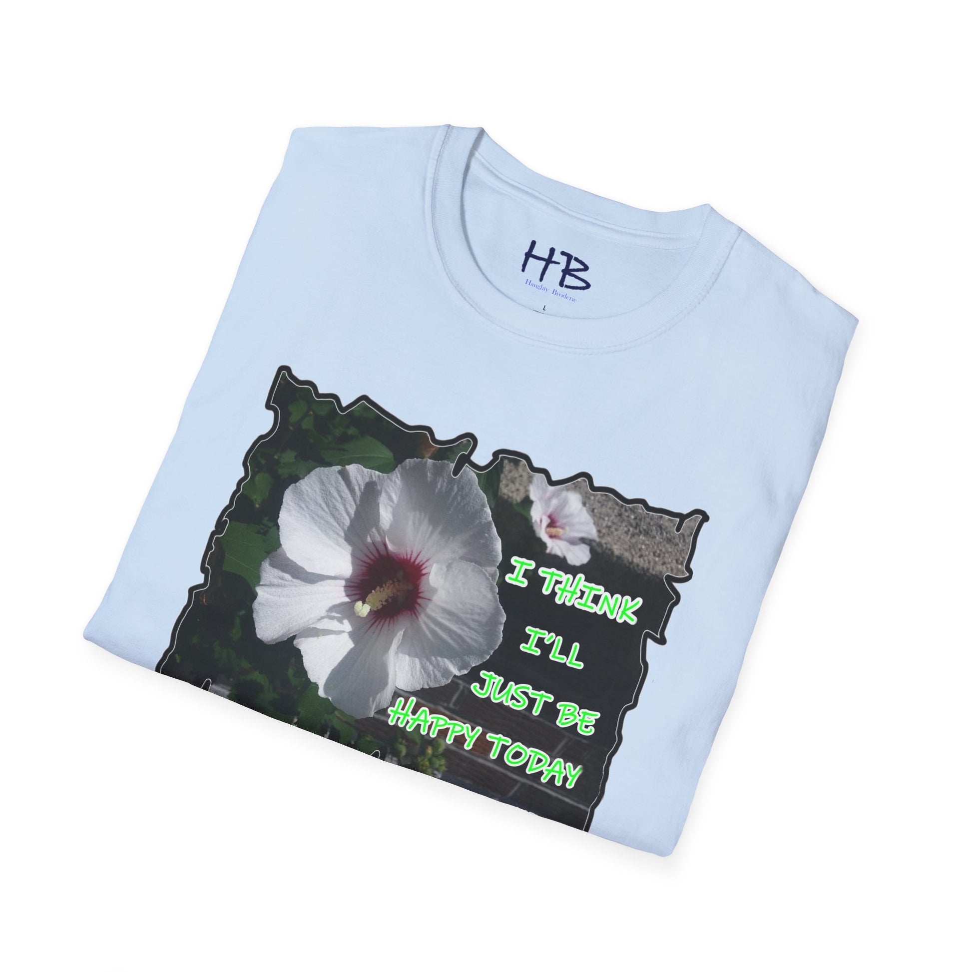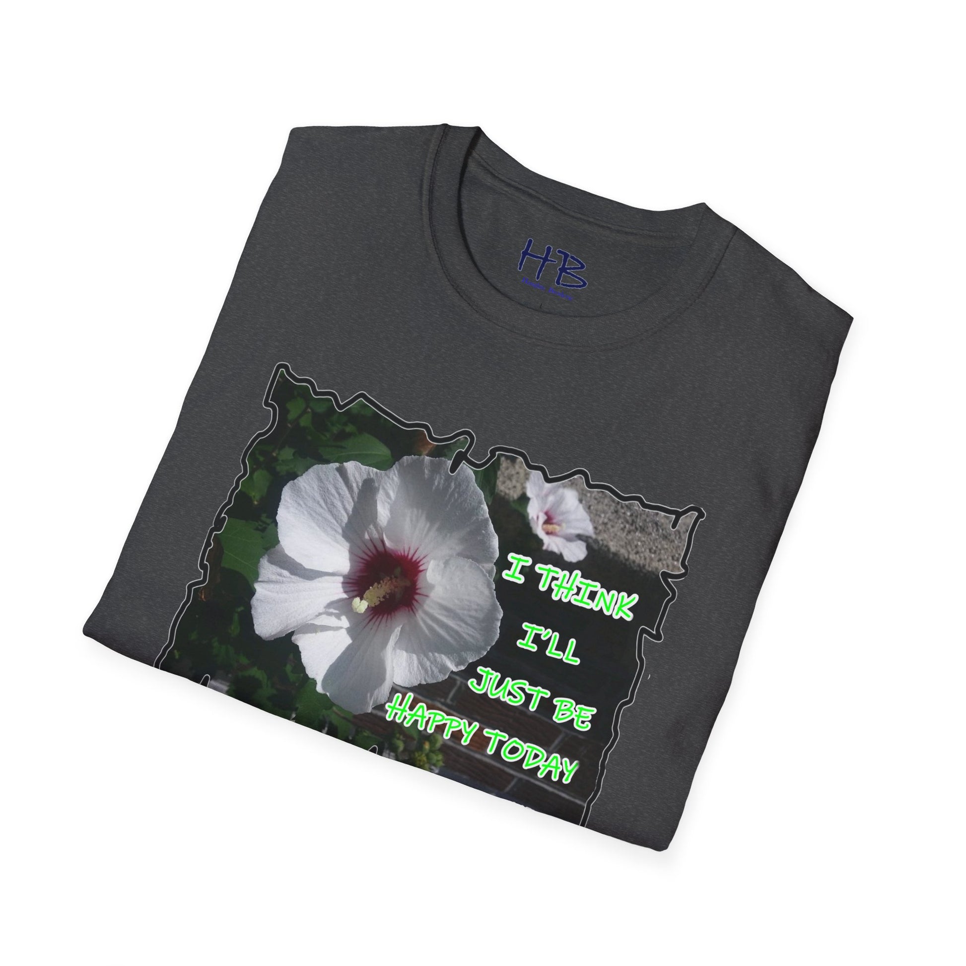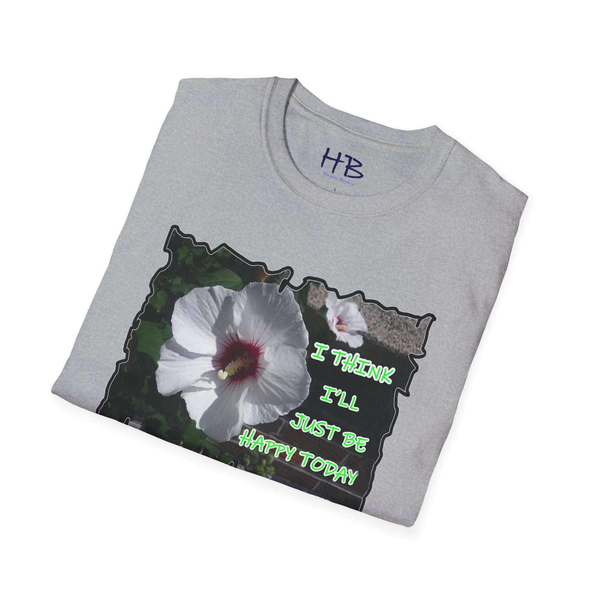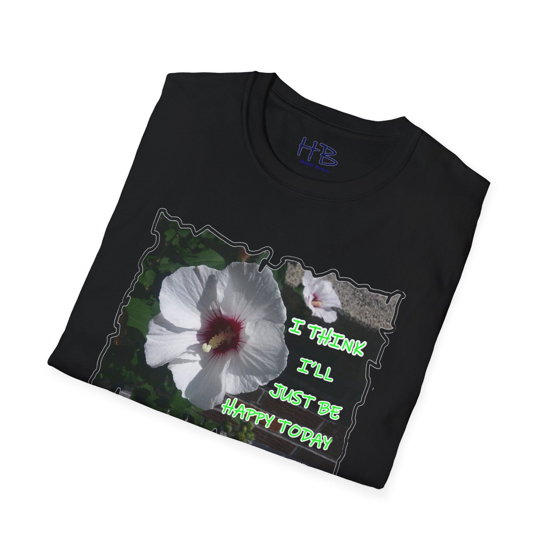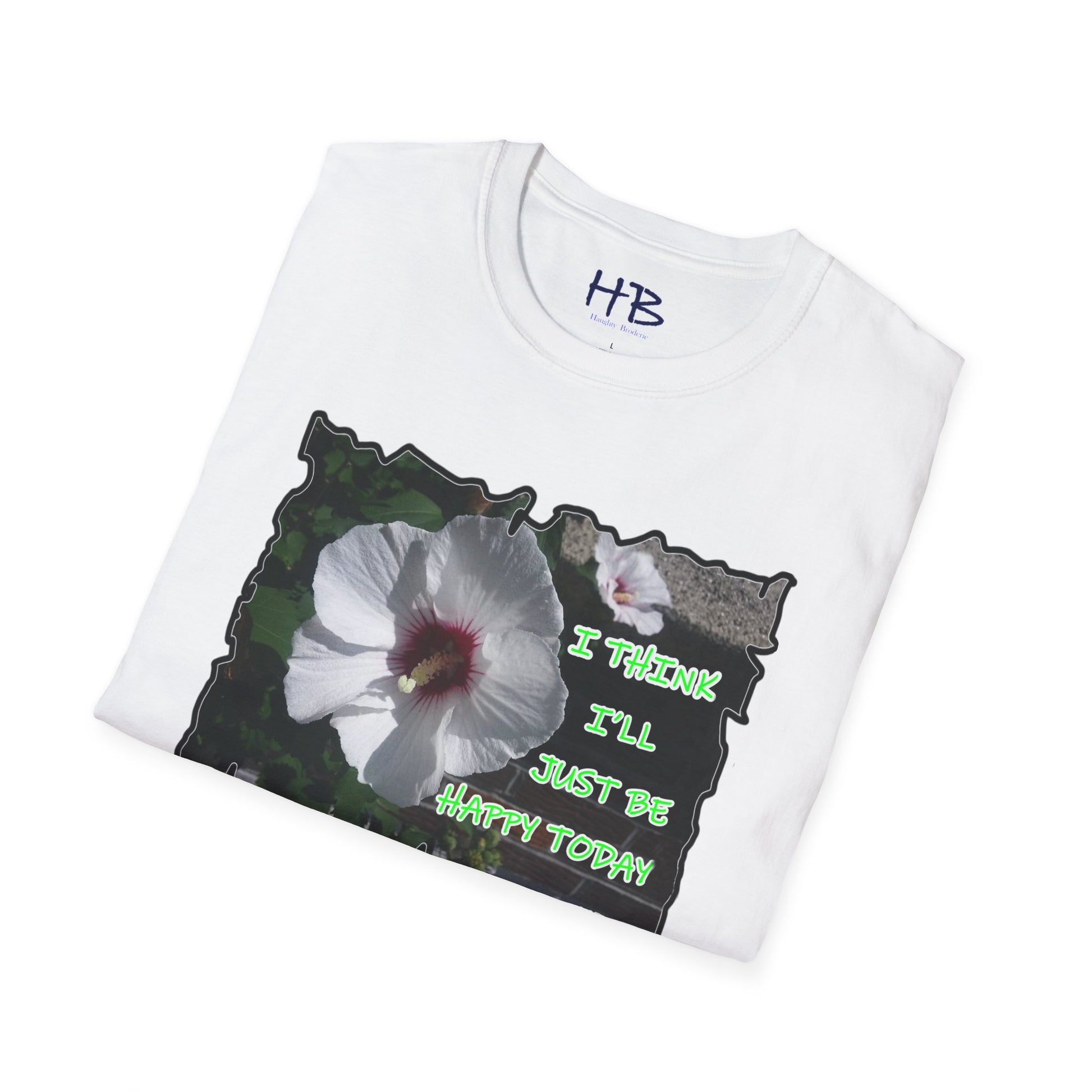 Introducing our latest addition to the collection - a remarkable garment that exudes pure delight and happiness. Behold the beauty of this tee shirt featuring an elegant ivory blossom, adorned with vibrant hues of pink and red at its center. With the words "I THINK I'LL JUST BE HAPPY TODAY" elegantly displayed, this tee shirt not only captures attention but also conveys a profound message.