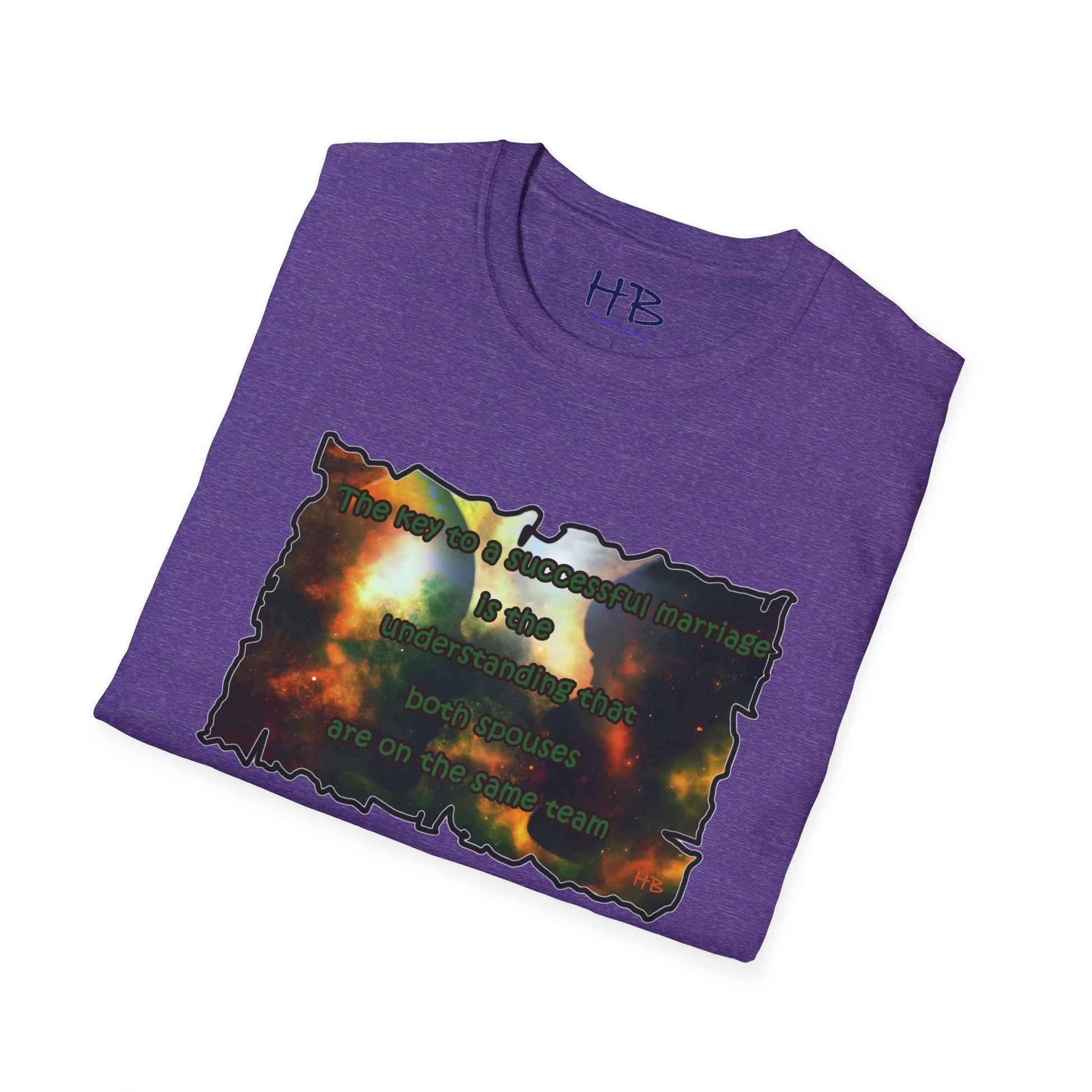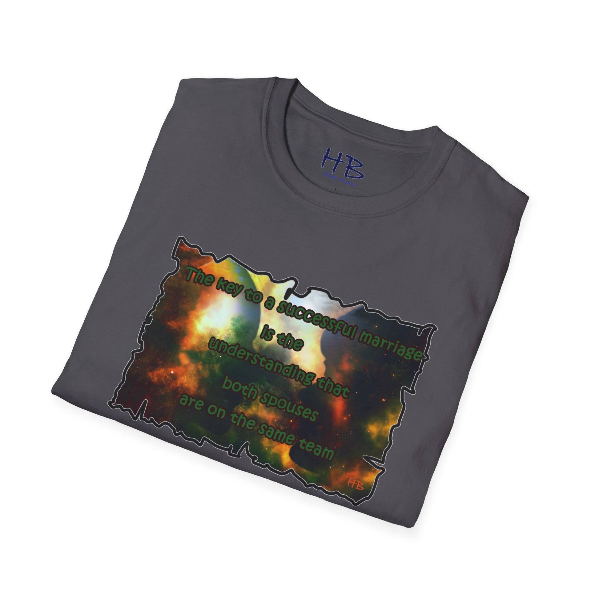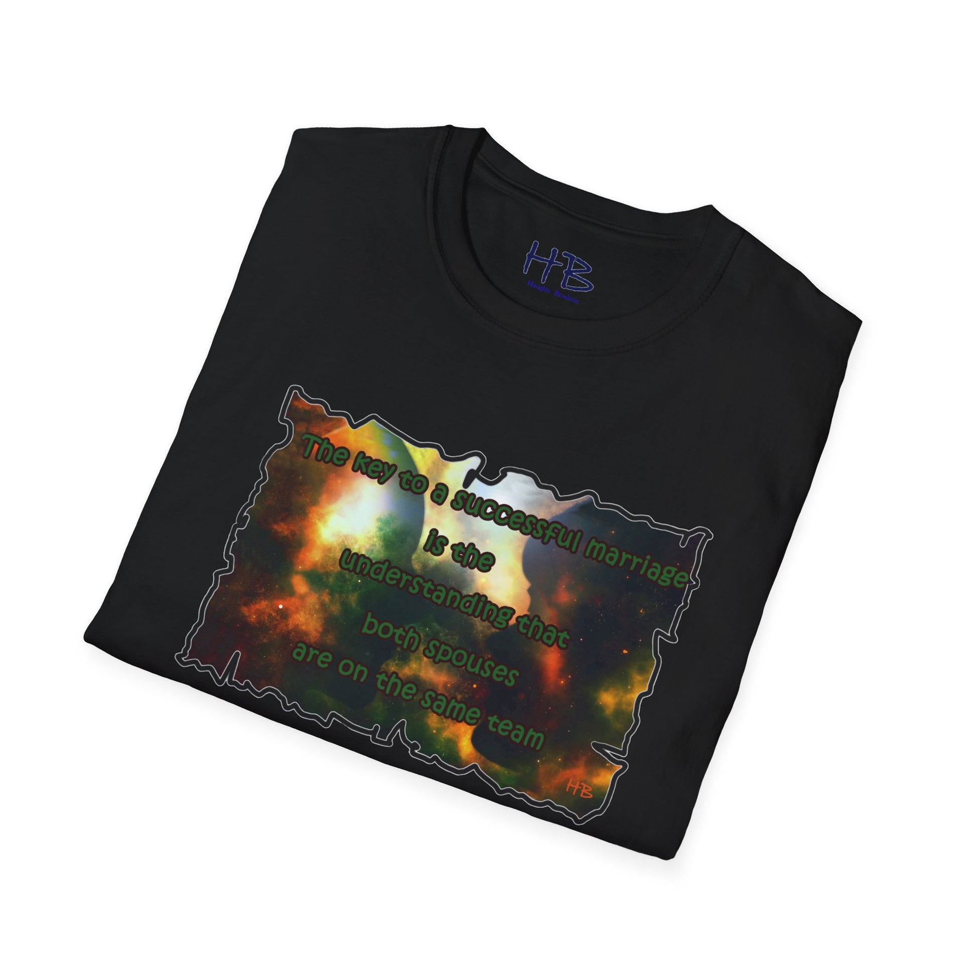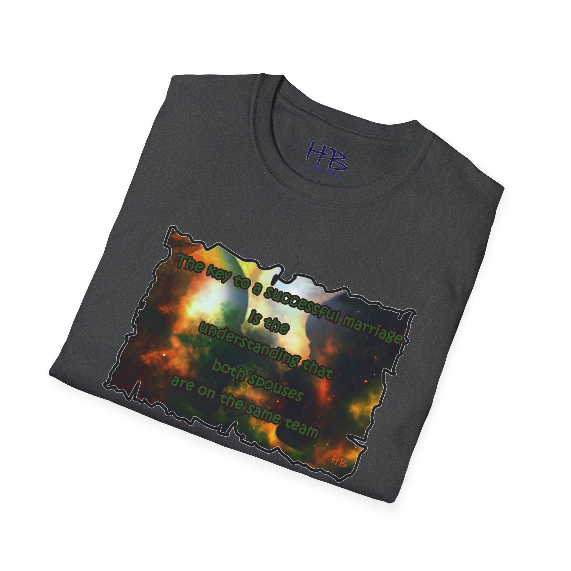 Introducing our celestial-inspired tee shirt that features a mesmerizing galaxy backdrop, complete with dark shadows of a man and woman. The design is accompanied by a powerful message that emphasizes the crucial ingredient for a prosperous marriage: the comprehension that both partners are working towards a common goal.