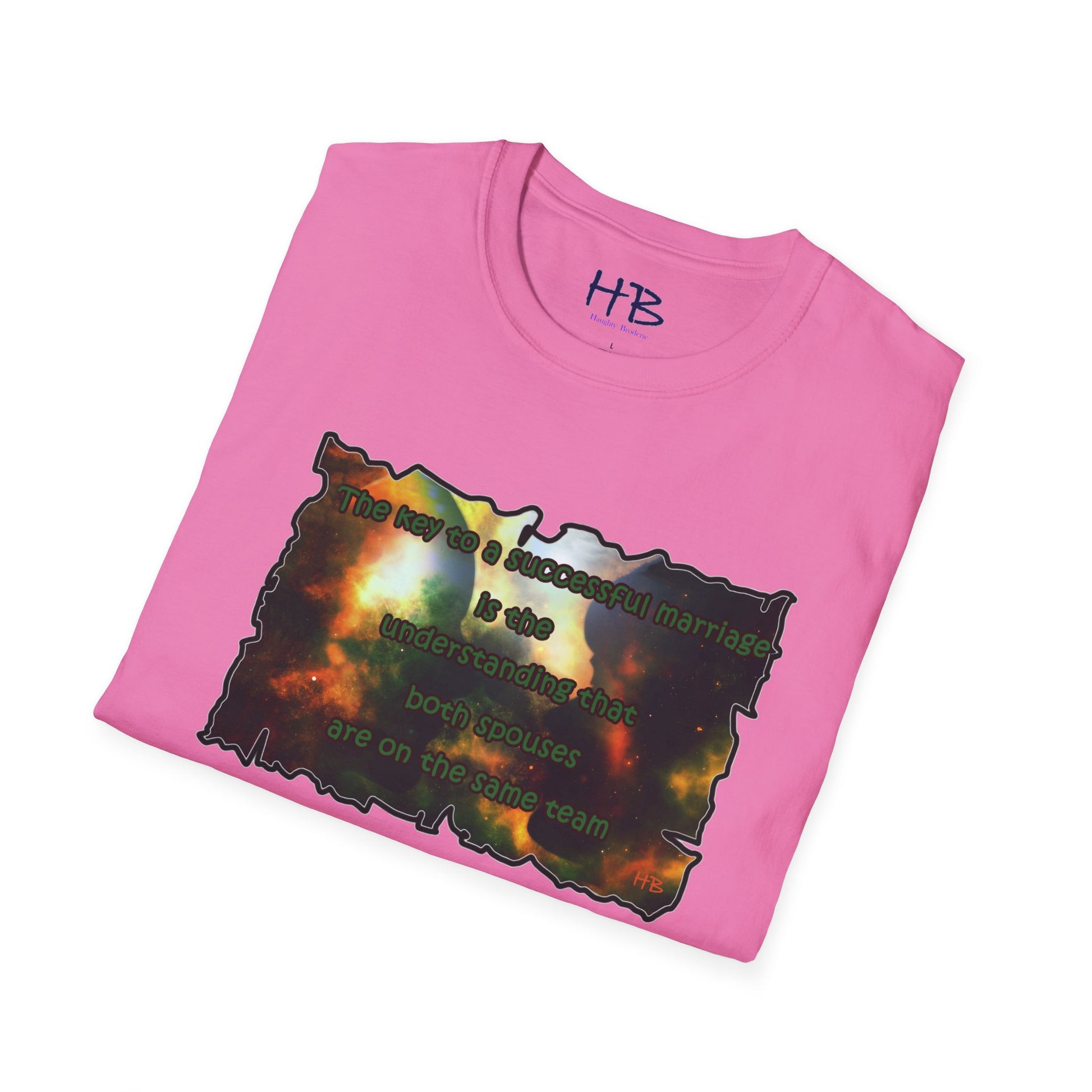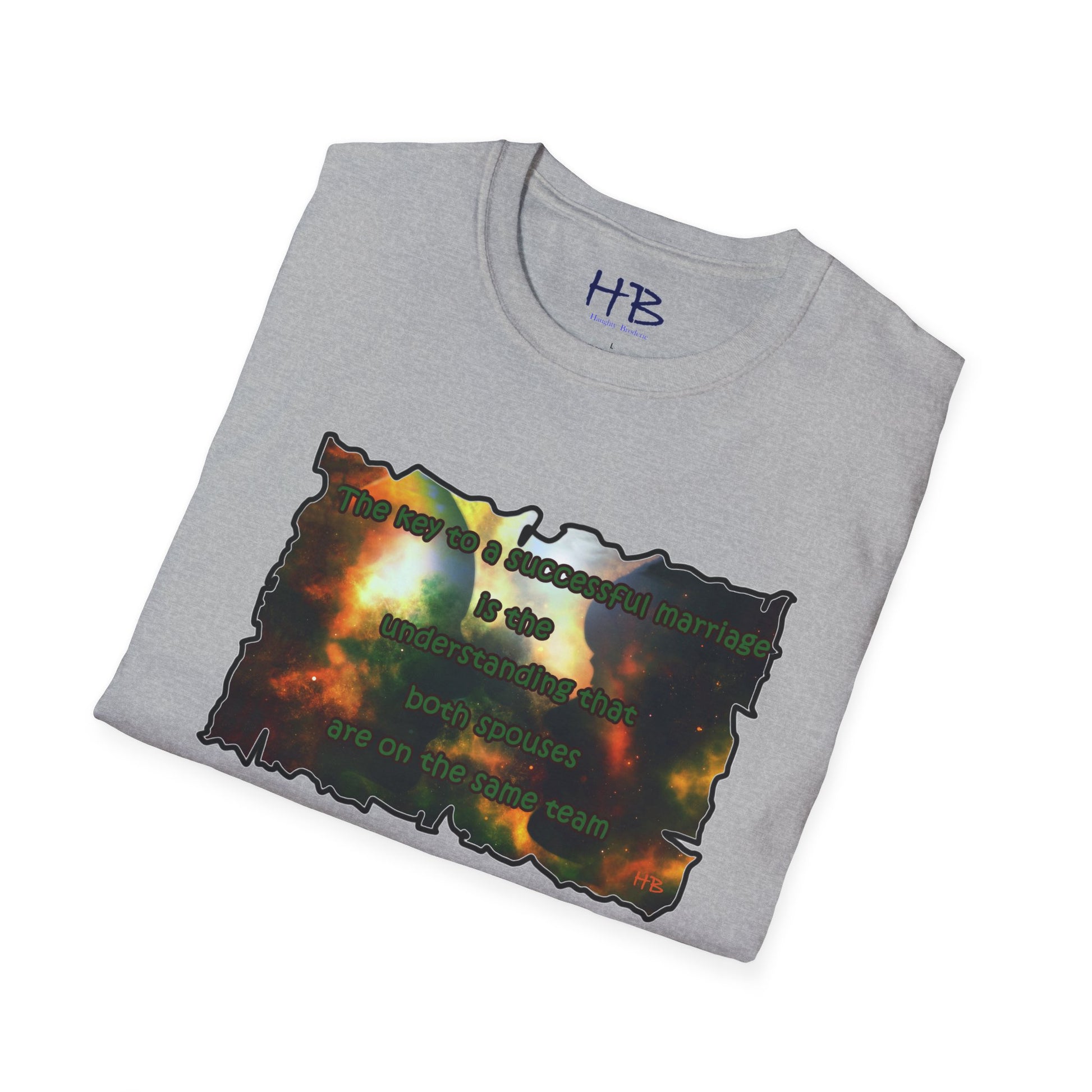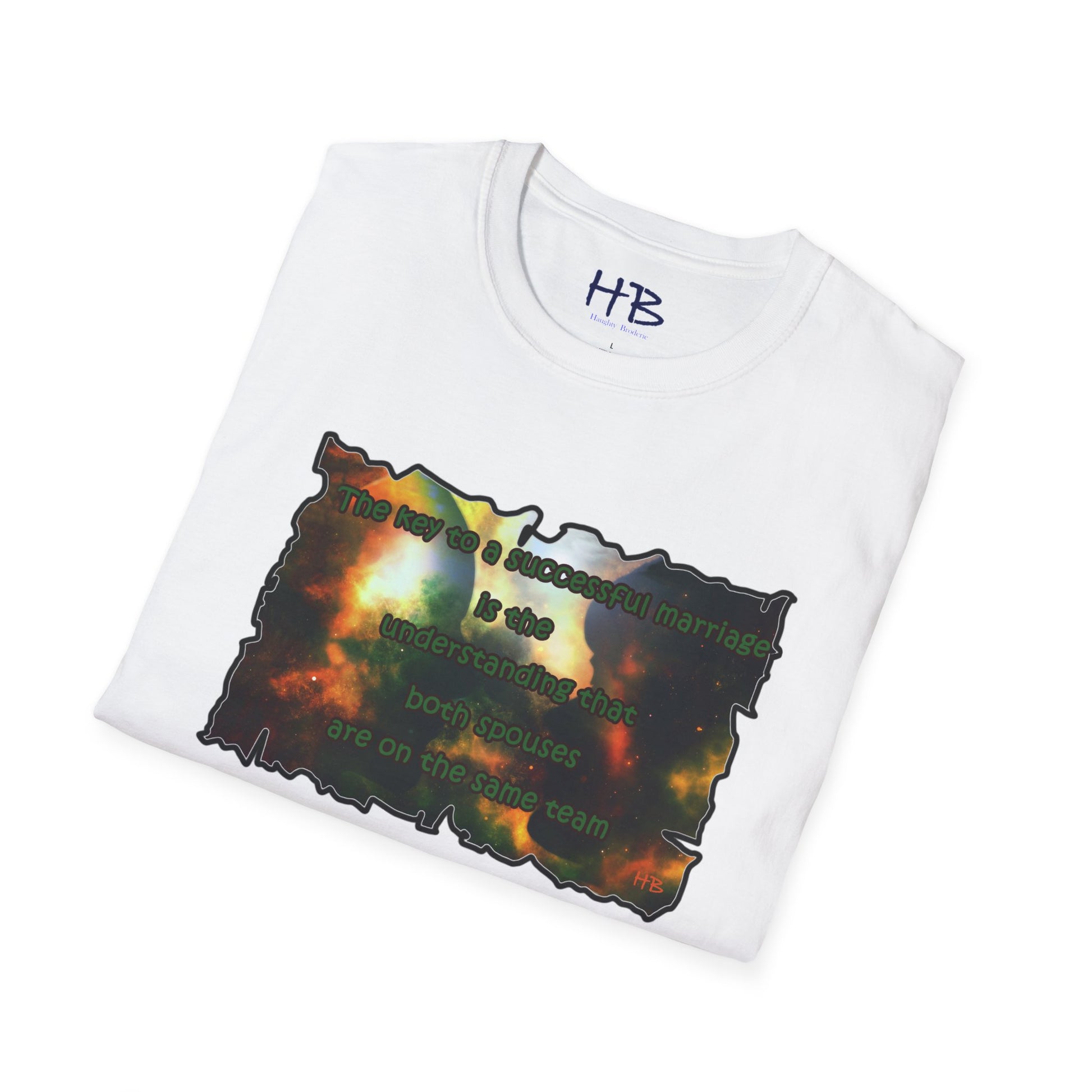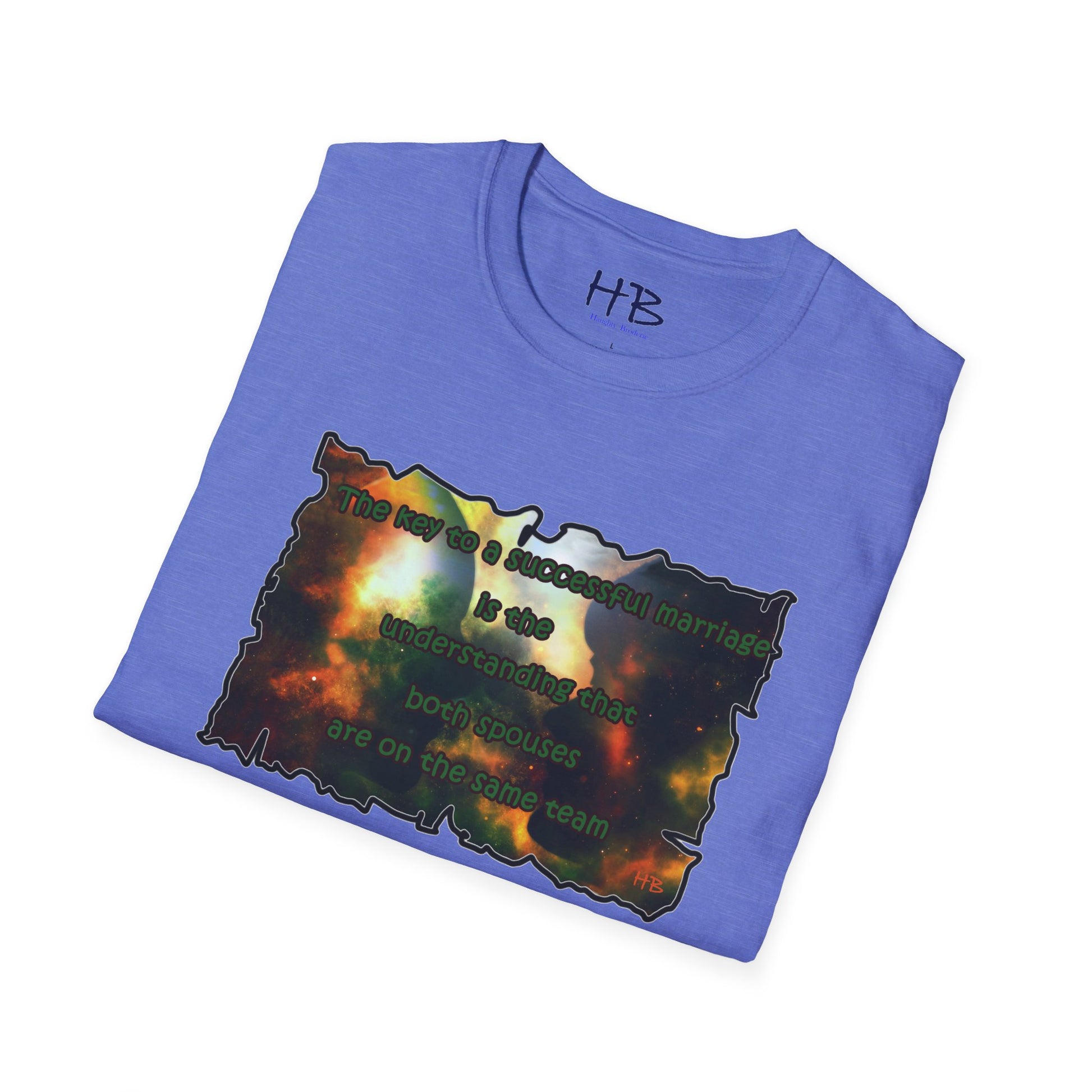 Introducing our celestial-inspired tee shirt that features a mesmerizing galaxy backdrop, complete with dark shadows of a man and woman. The design is accompanied by a powerful message that emphasizes the crucial ingredient for a prosperous marriage: the comprehension that both partners are working towards a common goal.