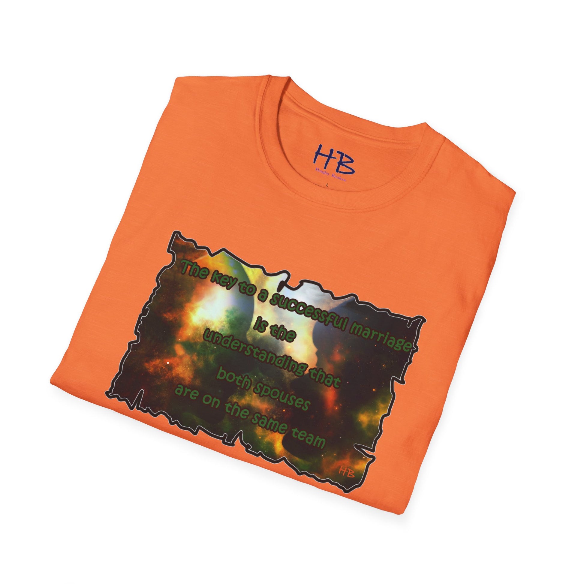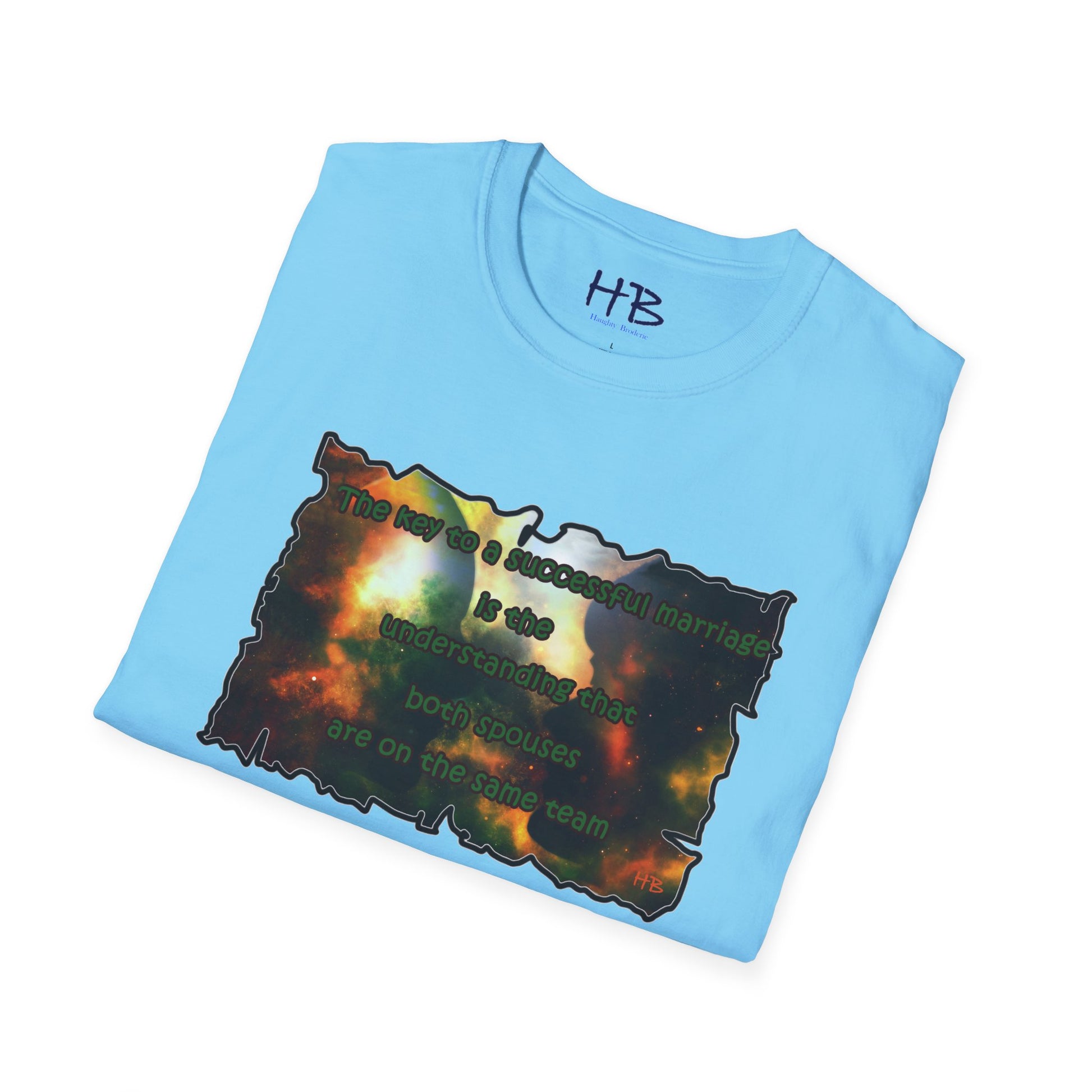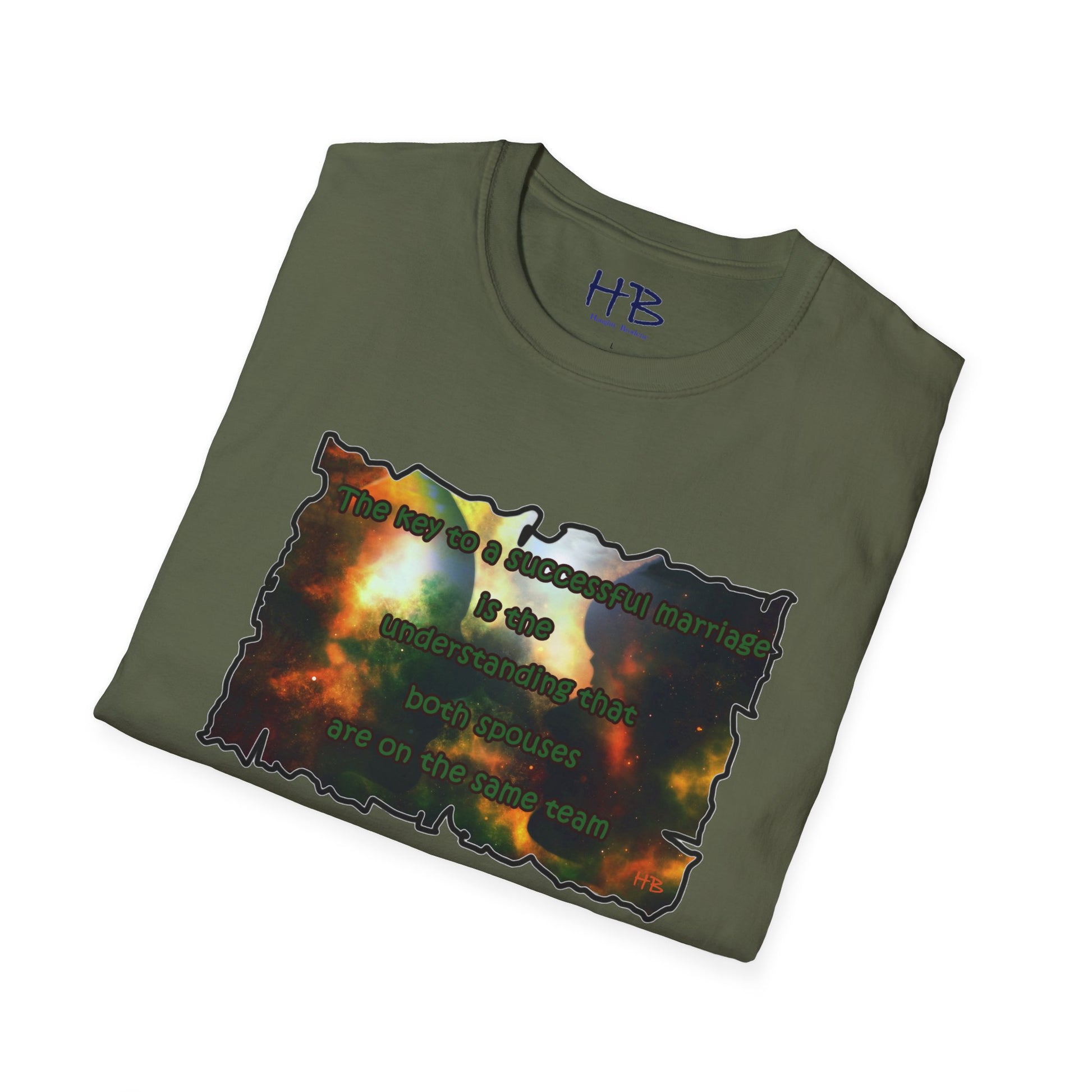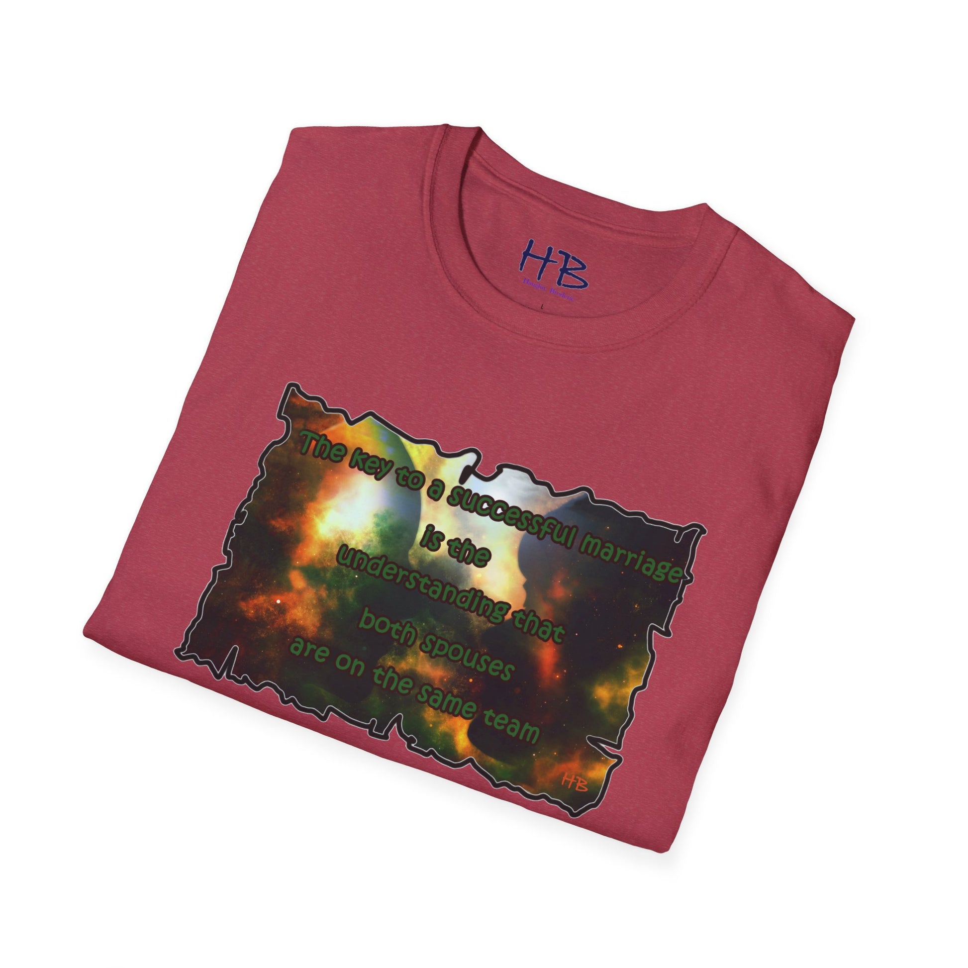 Introducing our celestial-inspired tee shirt that features a mesmerizing galaxy backdrop, complete with dark shadows of a man and woman. The design is accompanied by a powerful message that emphasizes the crucial ingredient for a prosperous marriage: the comprehension that both partners are working towards a common goal.
