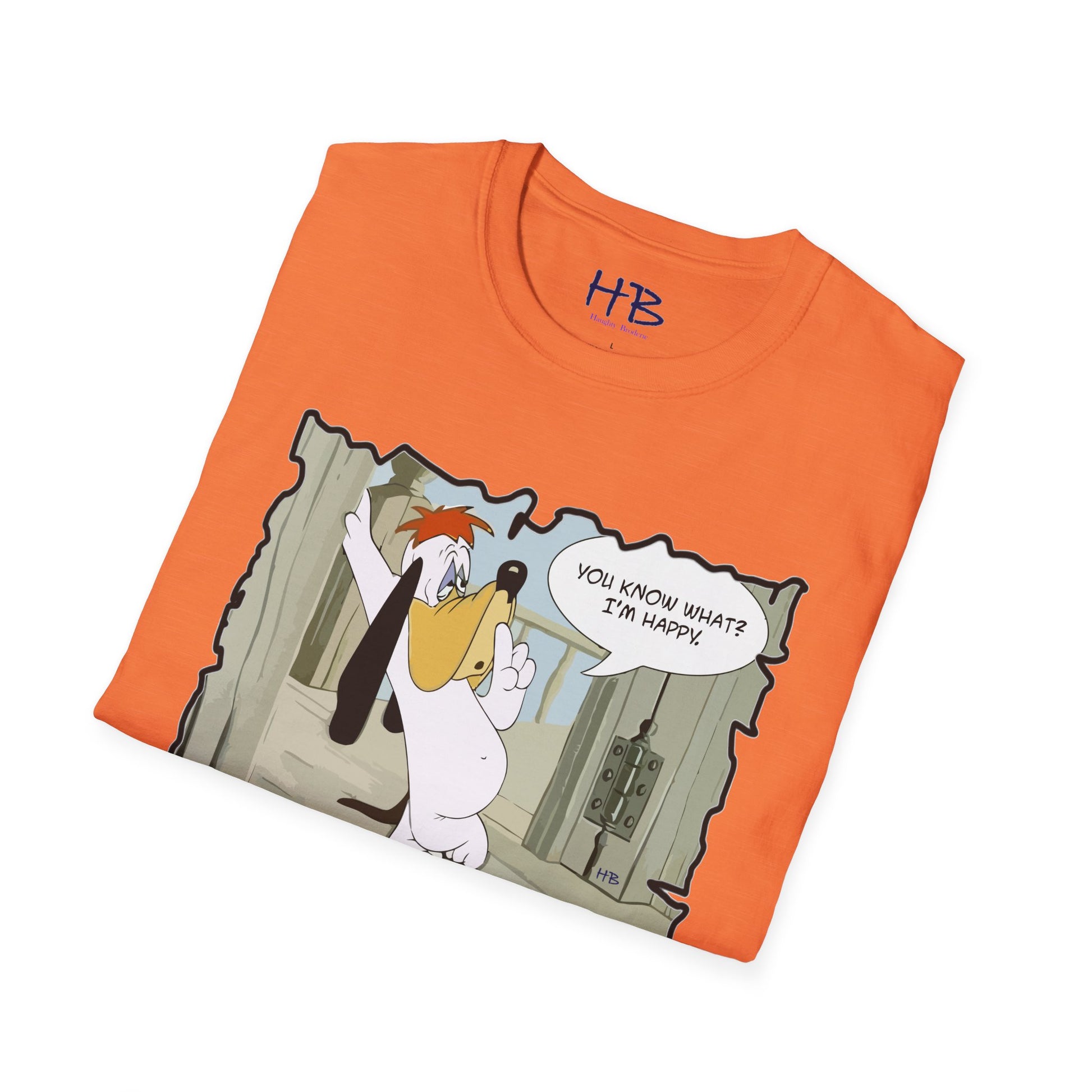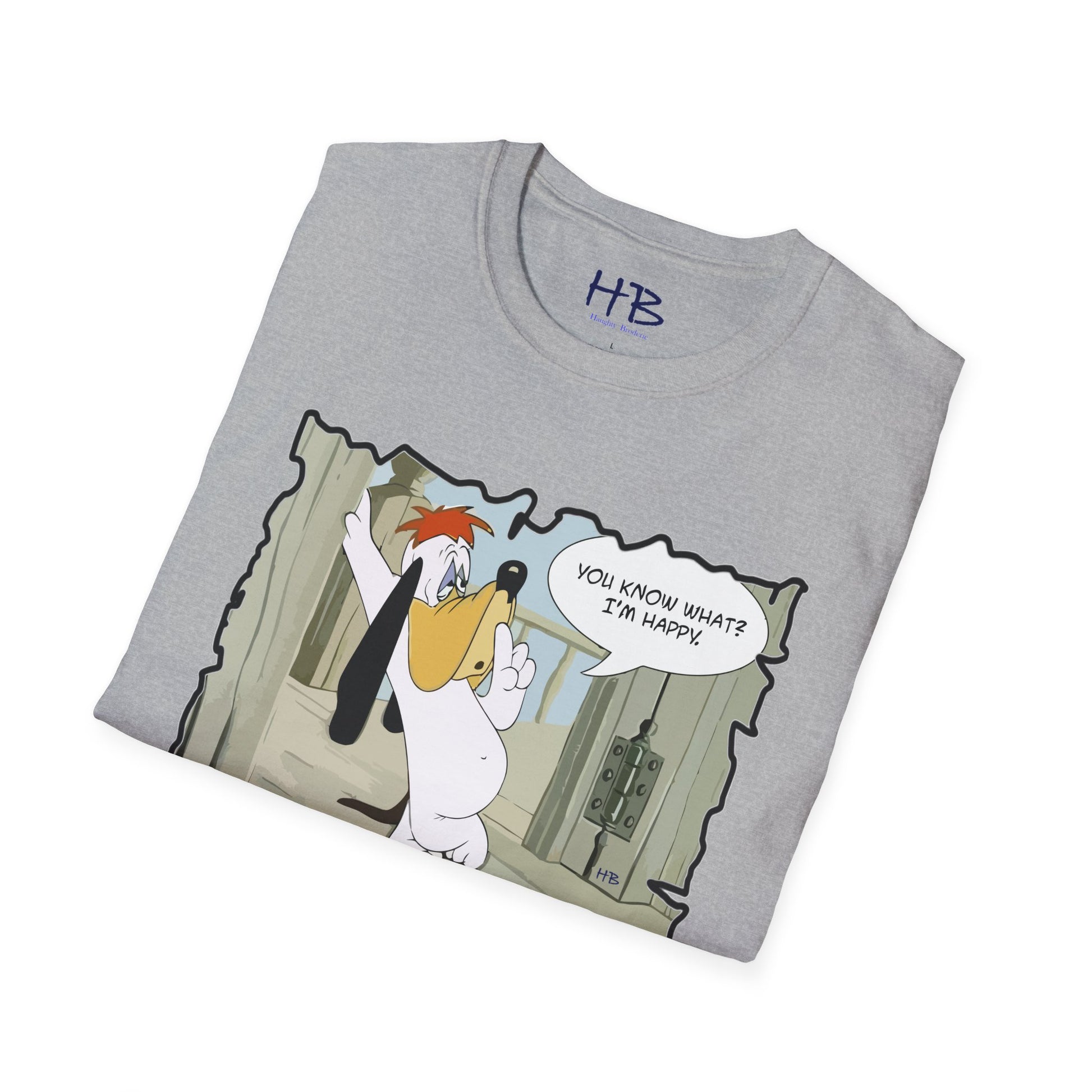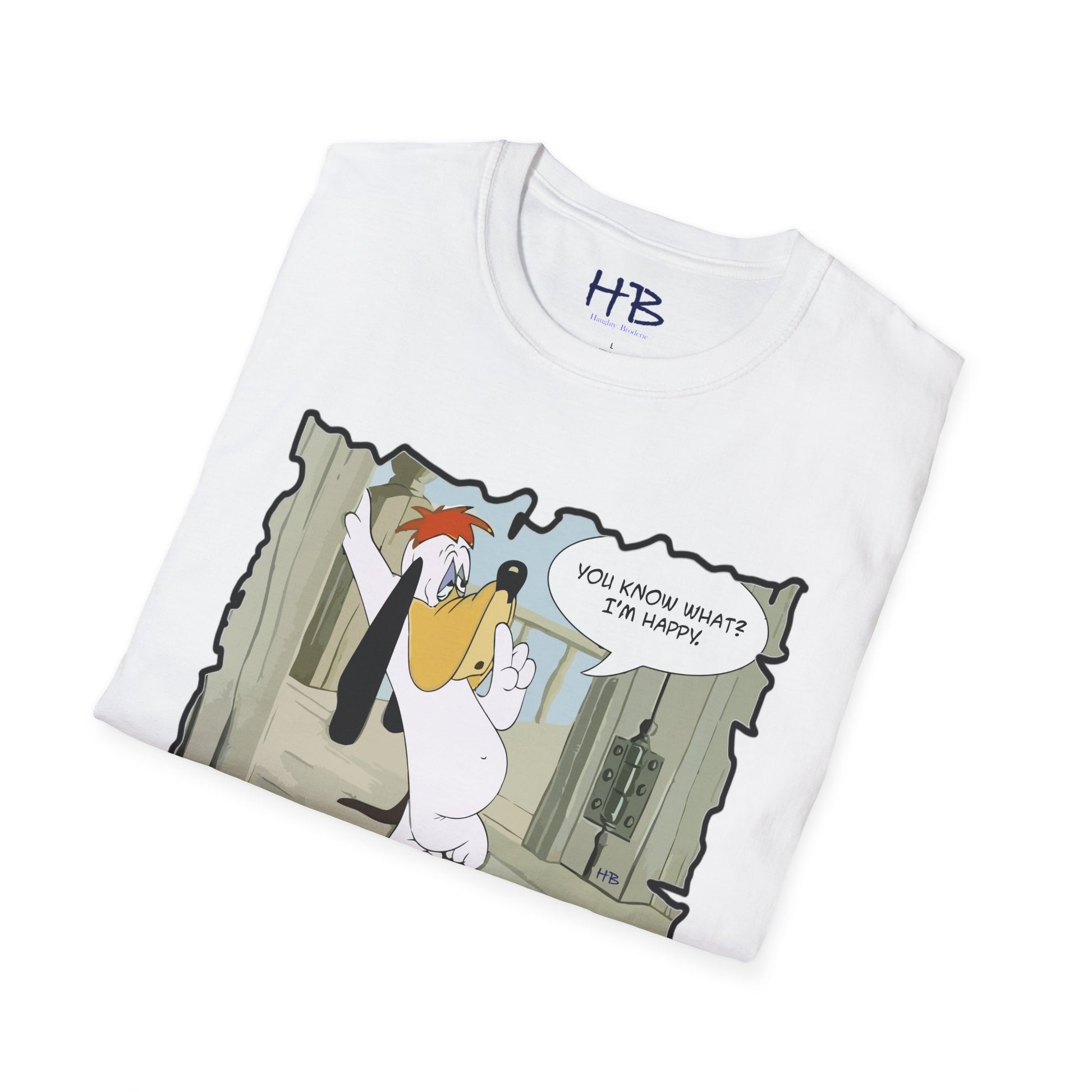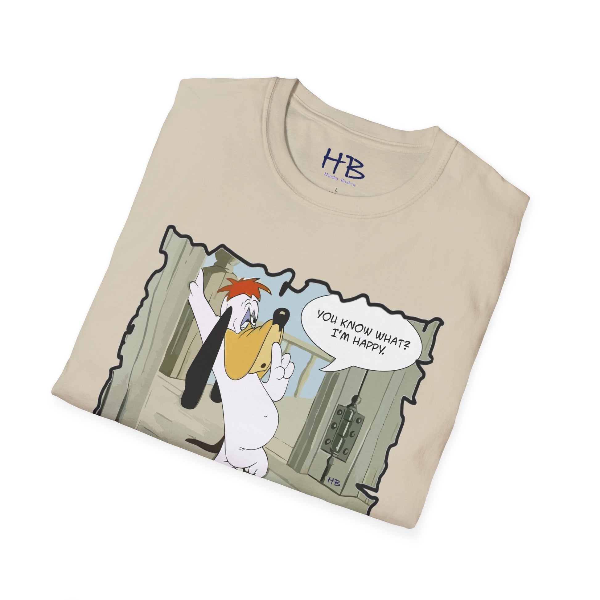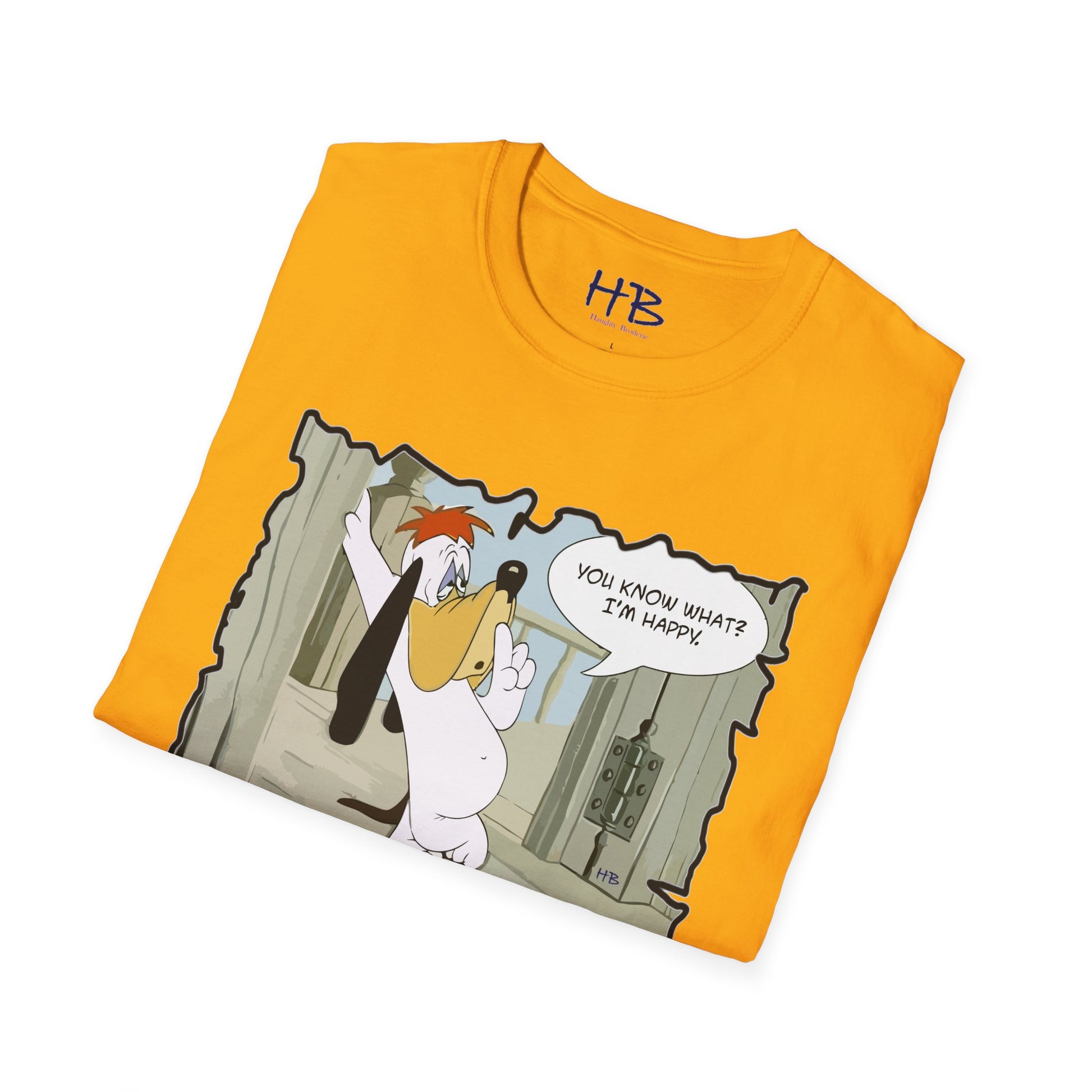 Introducing our newest tee shirt design featuring our beloved canine character who never fails to make us burst into laughter with every word that escapes its lips. This design showcases a memorable moment where our furry friend utters the most fantastic quote in the most heartwarming tone possible. Can you guess what it is? "You know what? I'm happy."