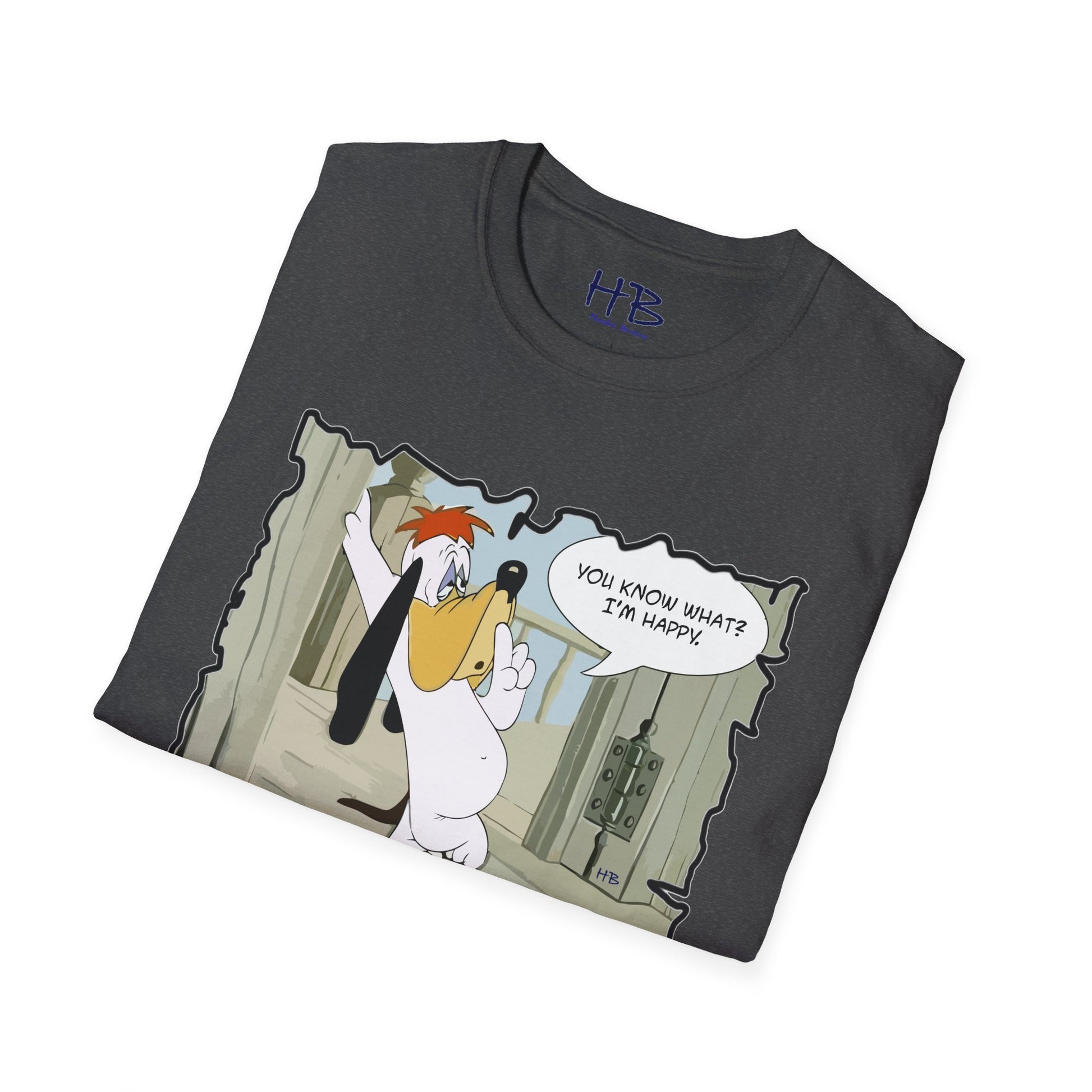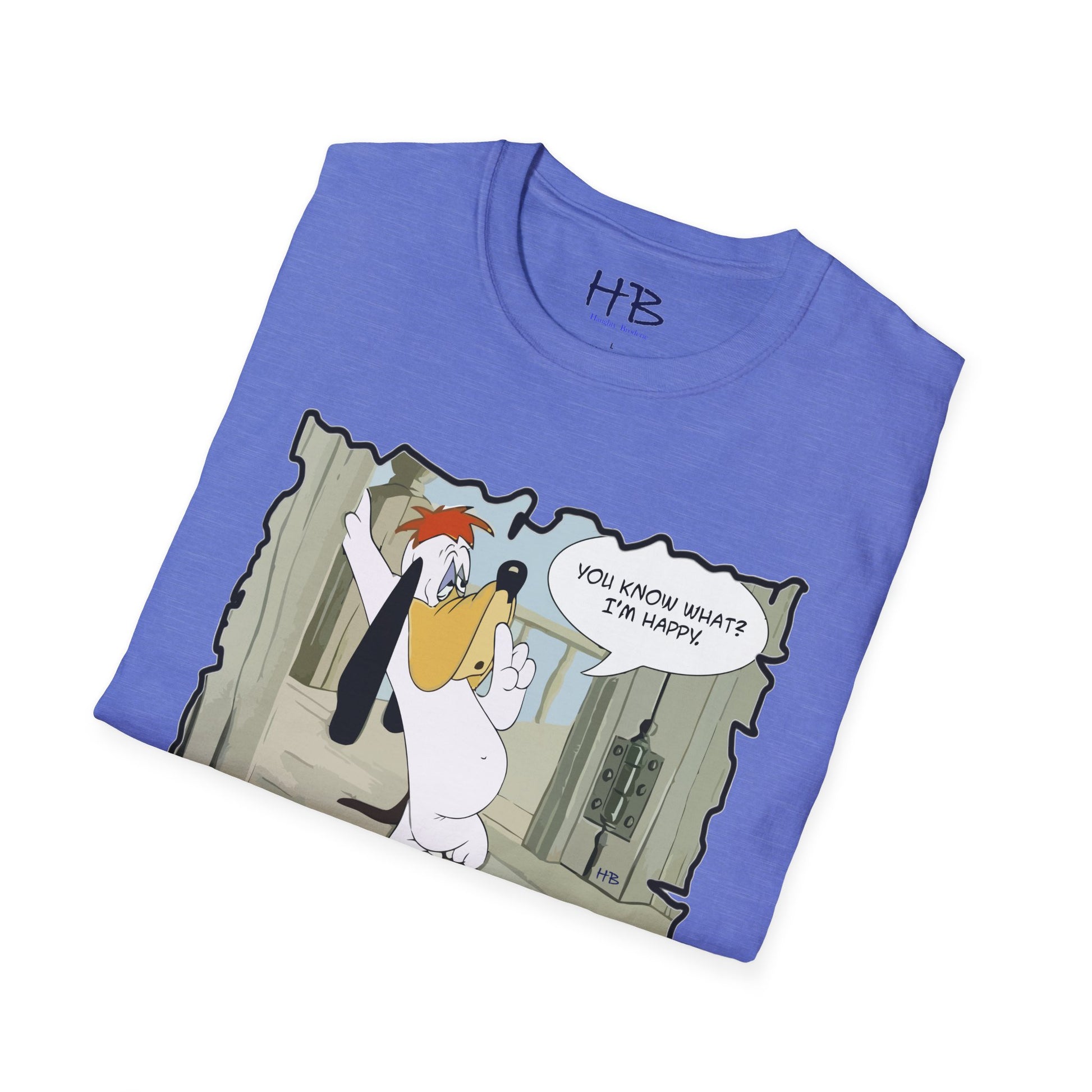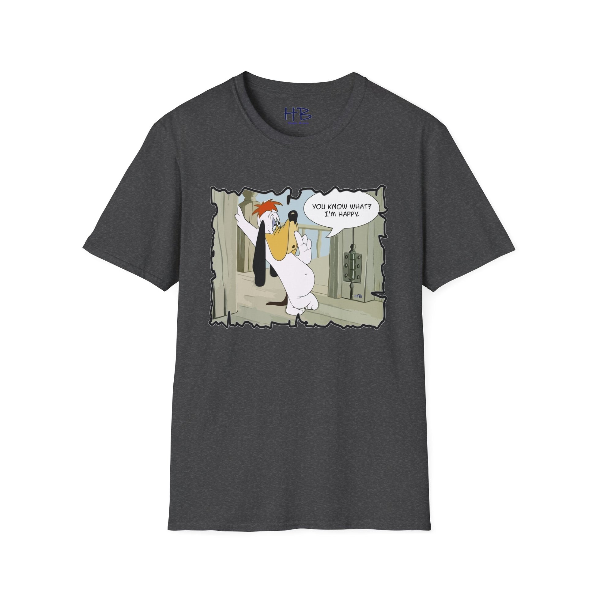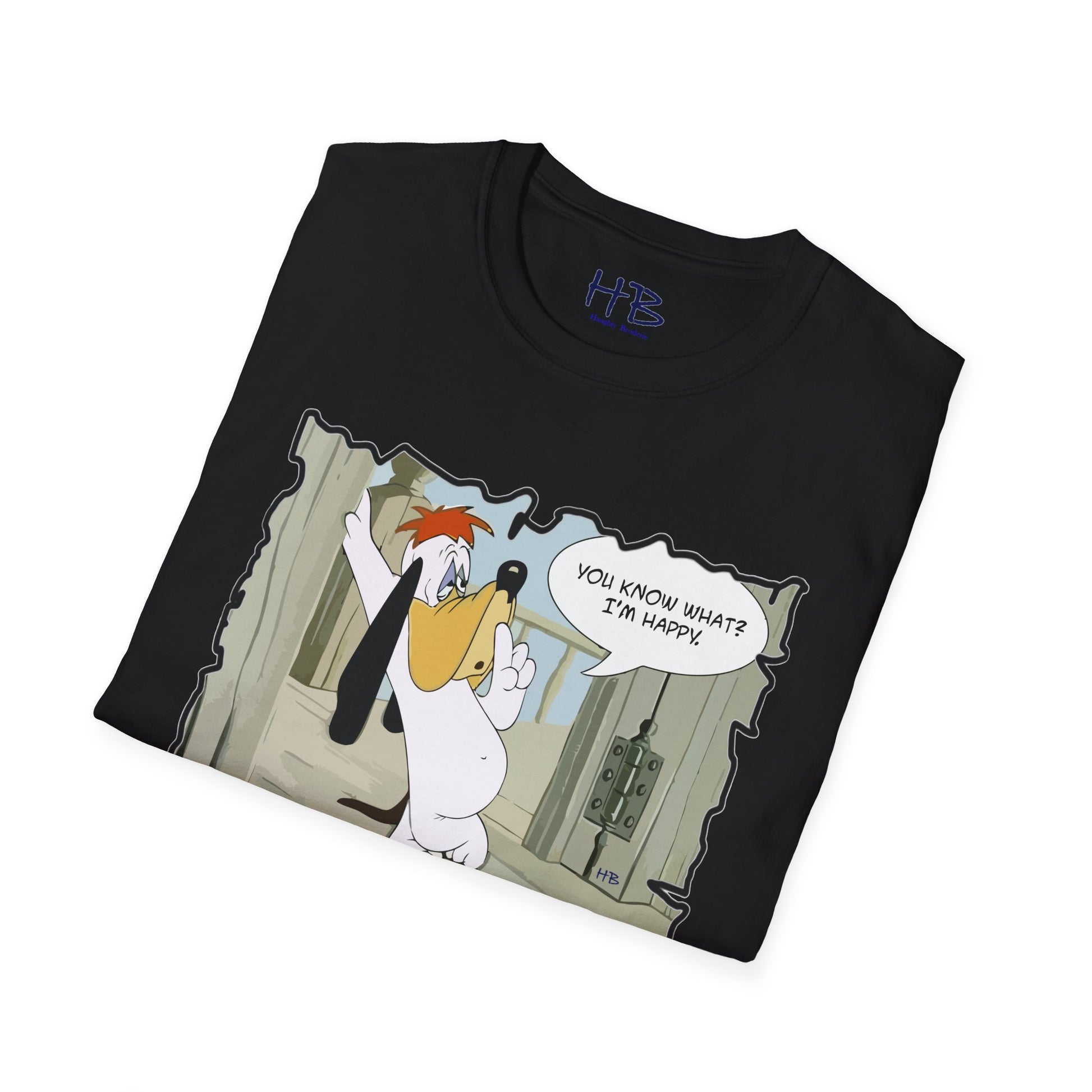 Introducing our newest tee shirt design featuring our beloved canine character who never fails to make us burst into laughter with every word that escapes its lips. This design showcases a memorable moment where our furry friend utters the most fantastic quote in the most heartwarming tone possible. Can you guess what it is? "You know what? I'm happy."