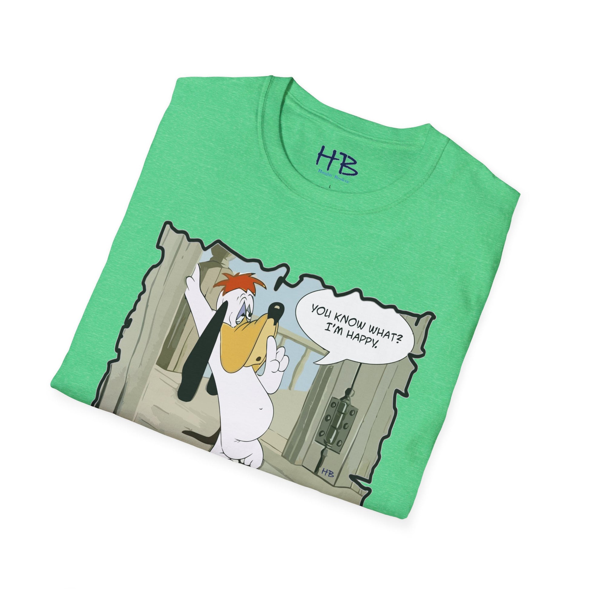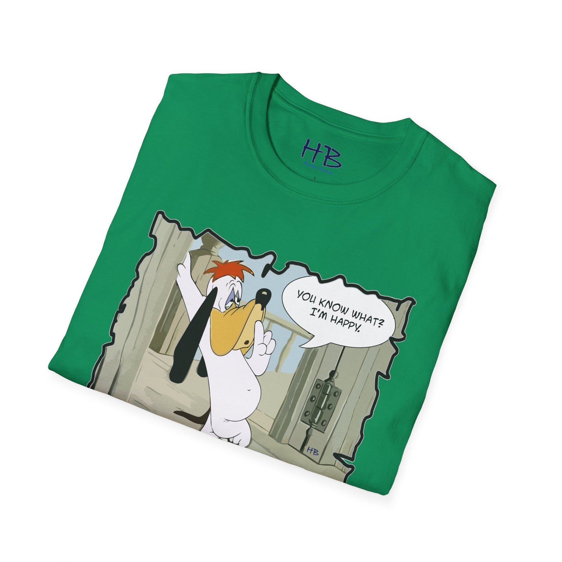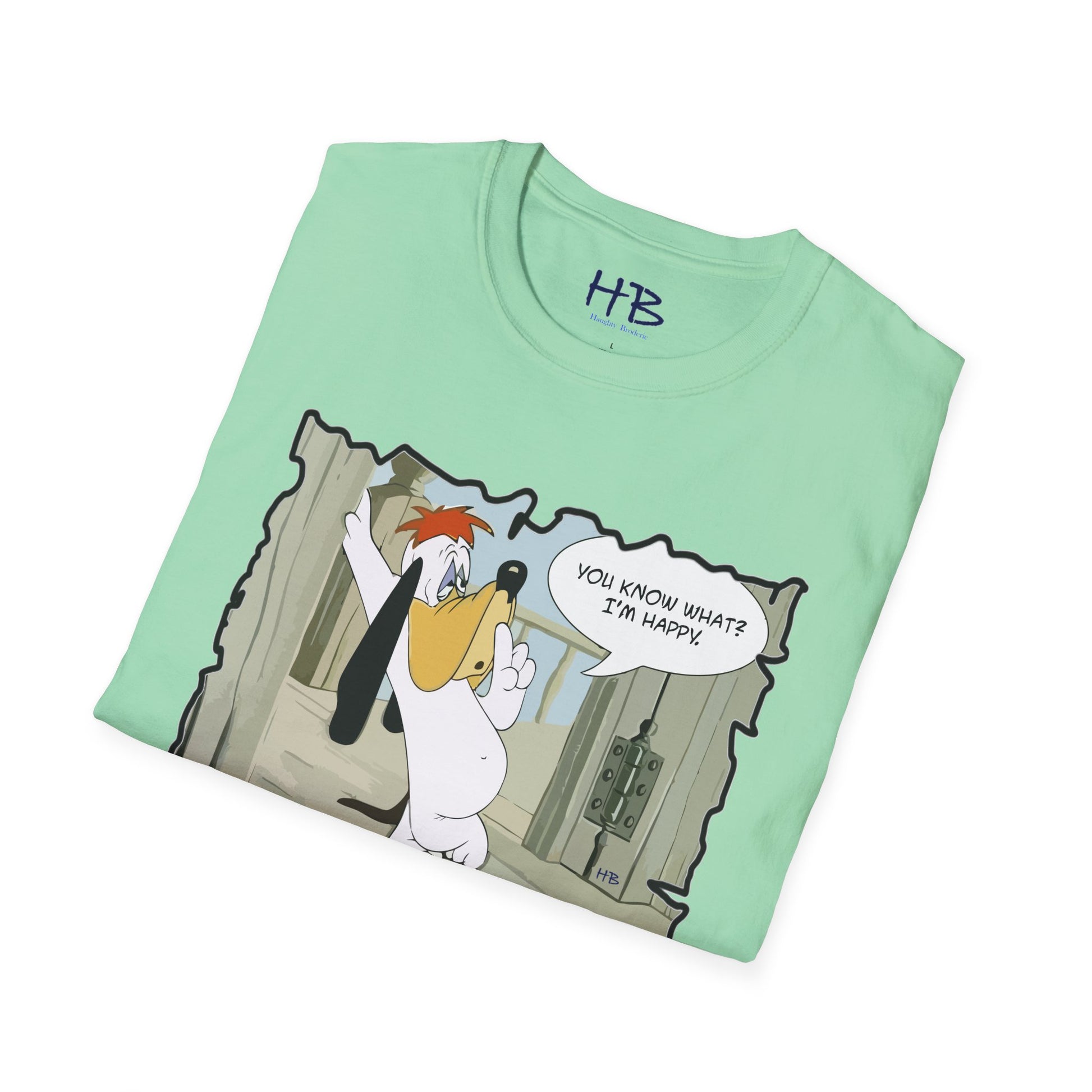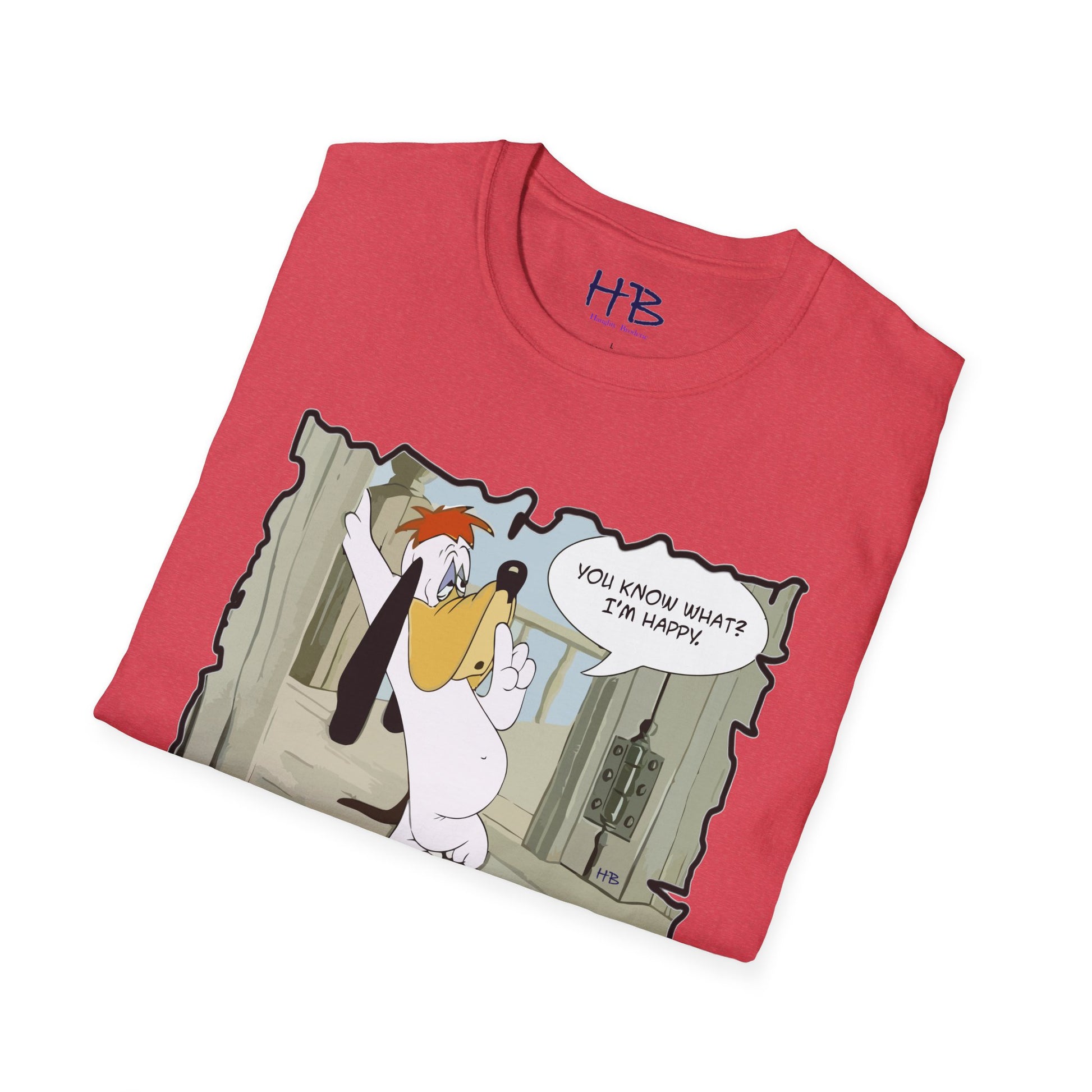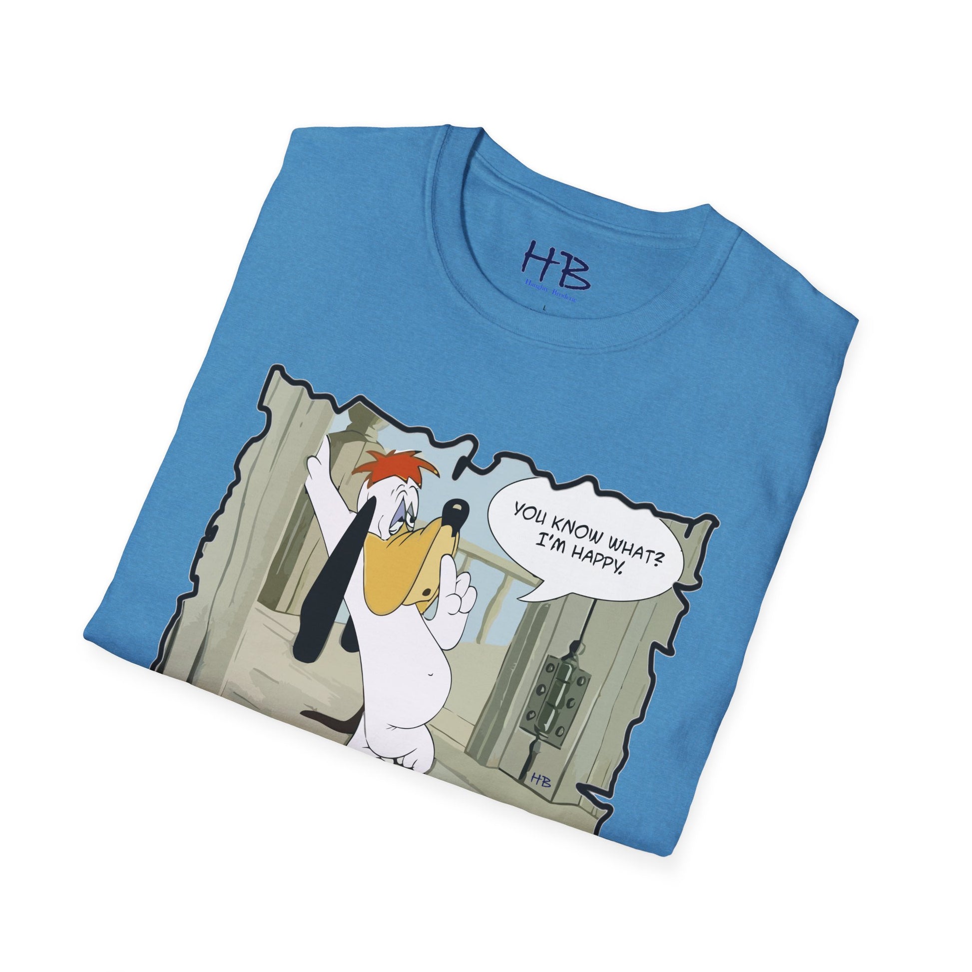Introducing our newest tee shirt design featuring our beloved canine character who never fails to make us burst into laughter with every word that escapes its lips. This design showcases a memorable moment where our furry friend utters the most fantastic quote in the most heartwarming tone possible. Can you guess what it is? "You know what? I'm happy."