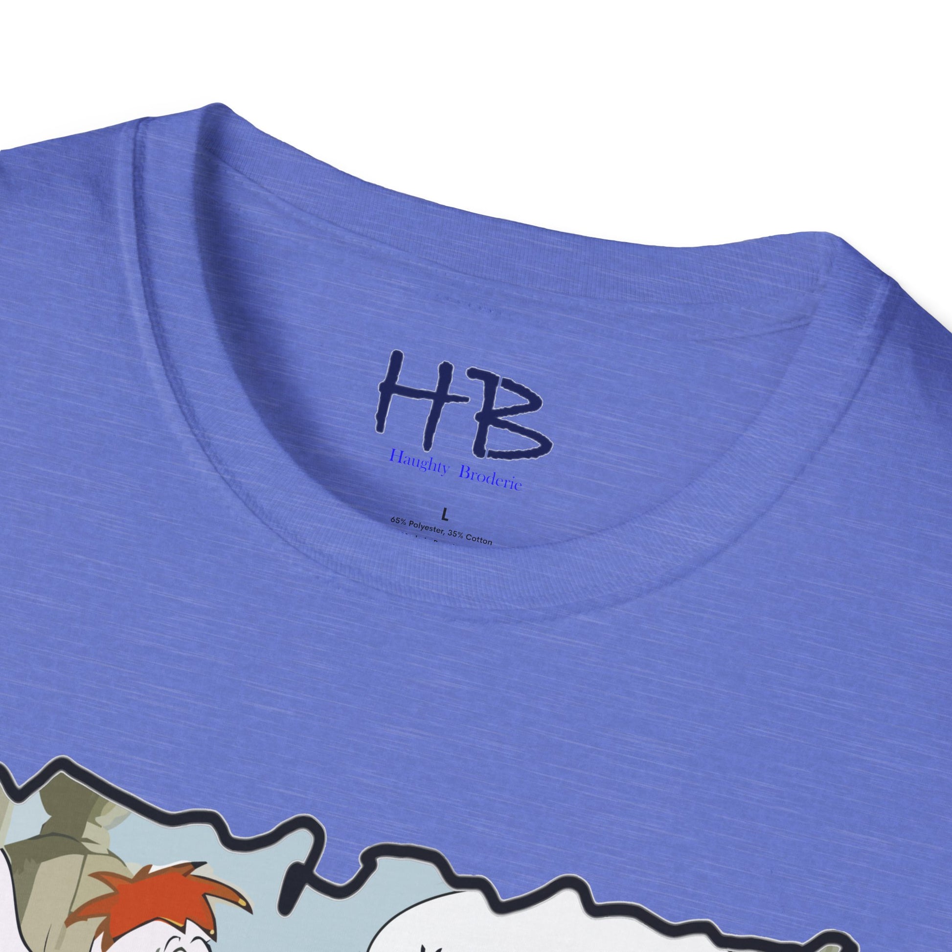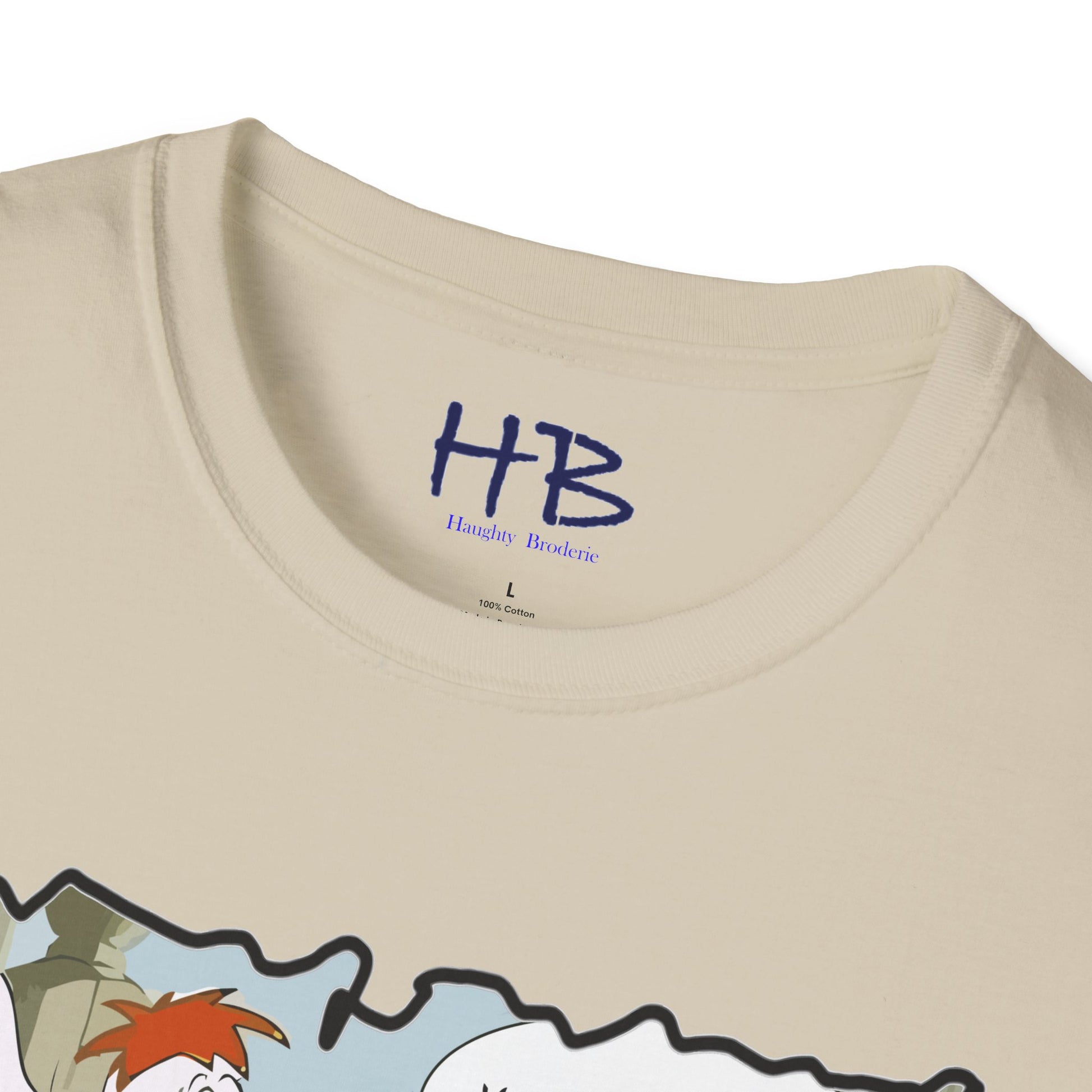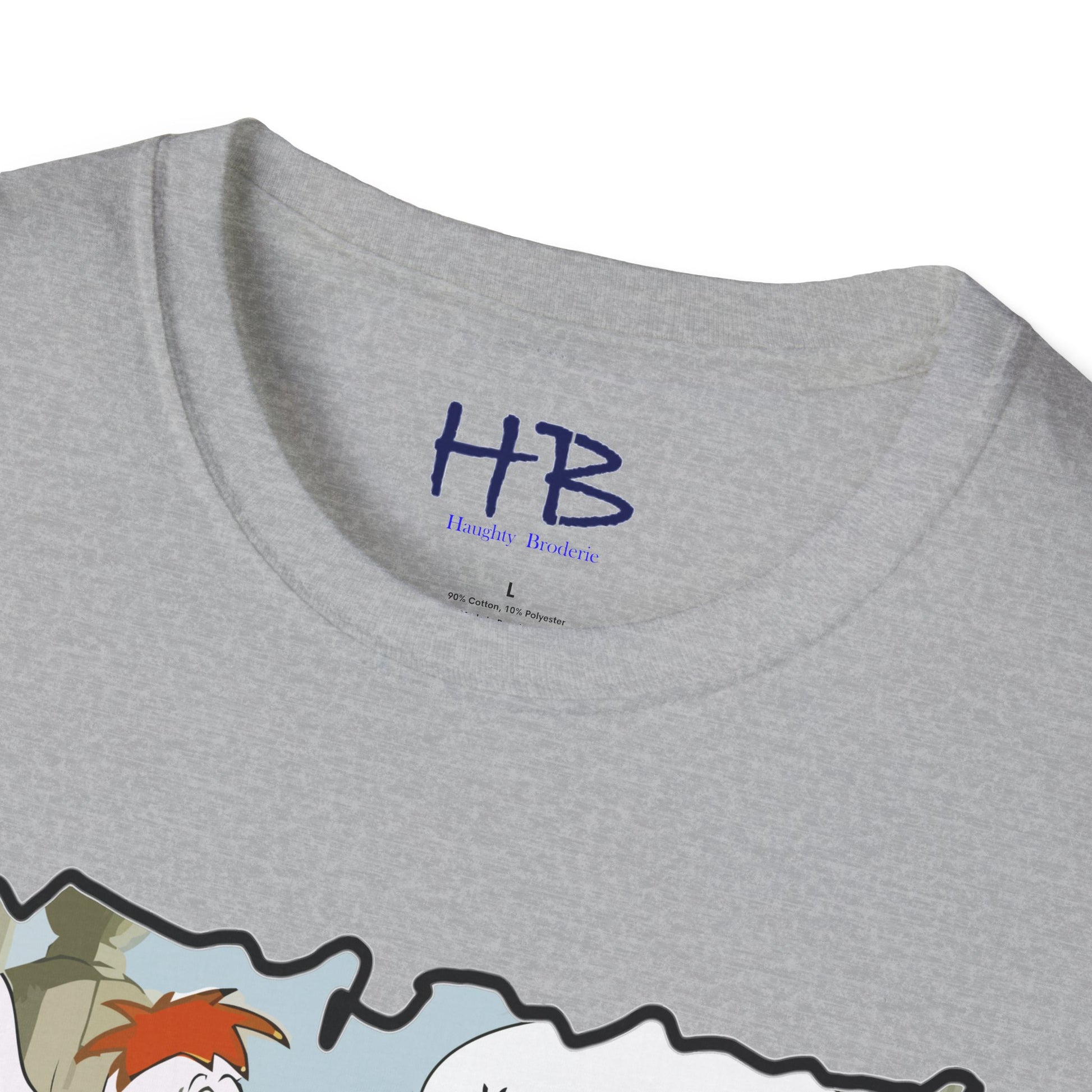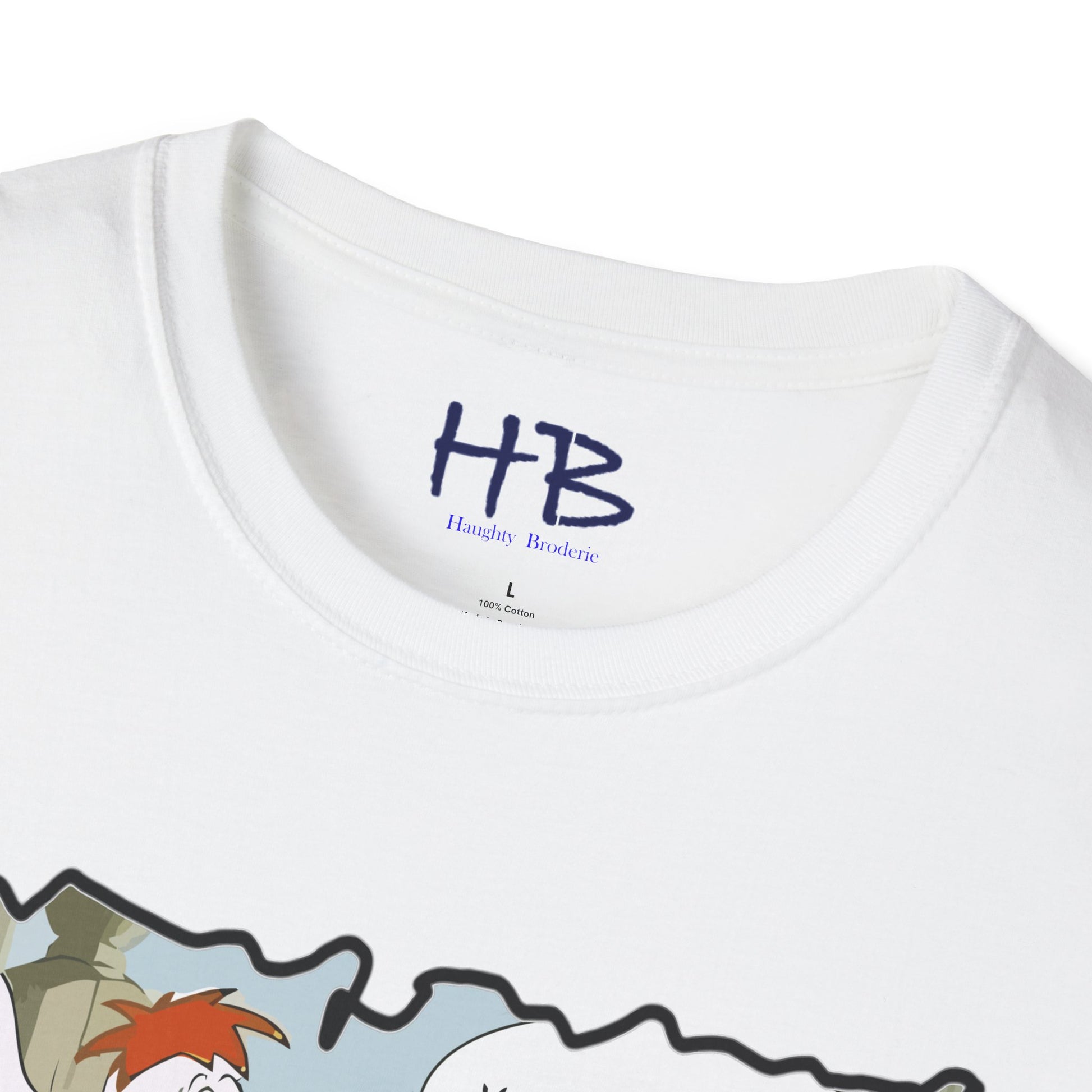 But this tee shirt design is not just about our lovable cartoon companion's amusing antics. It also represents a profound message about happiness. Our four-legged friend doesn't outwardly express empathy or happiness, but we know it's there just by the words it speaks. It reminds us that we don't have to show our happiness to be happy inside.