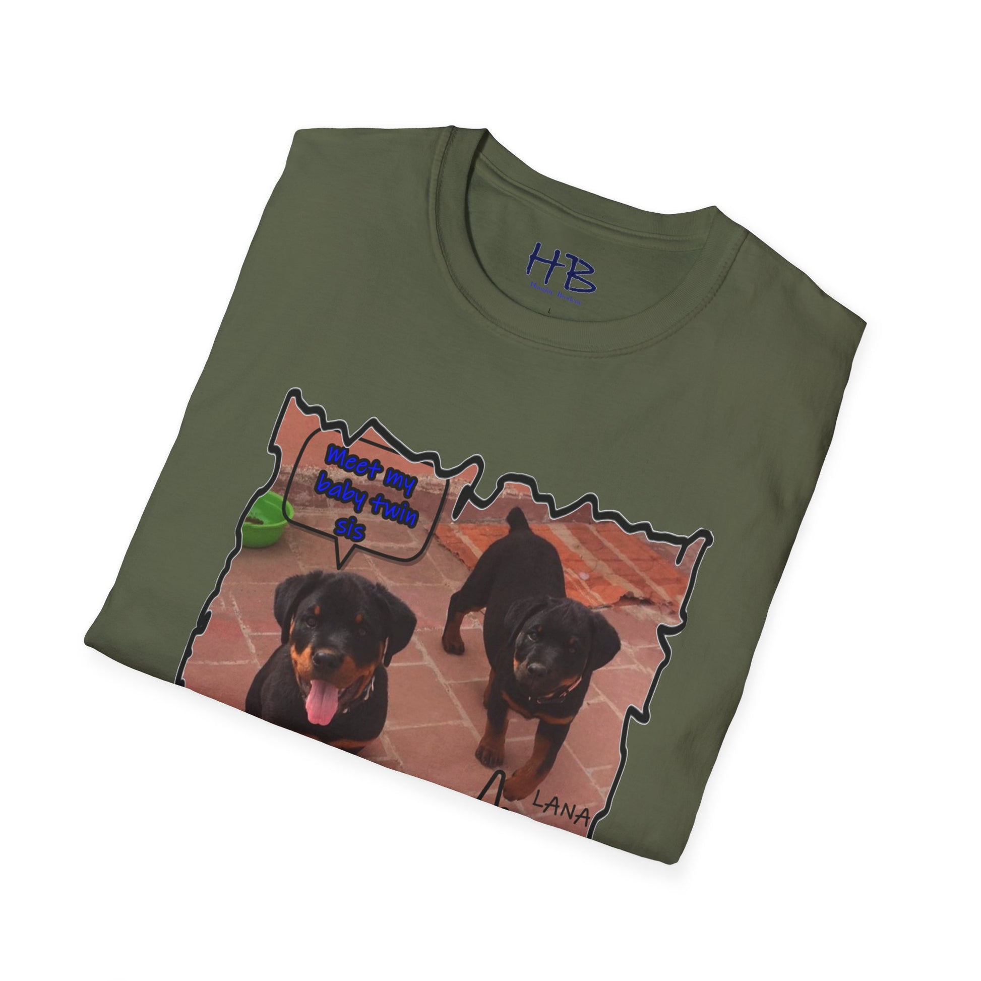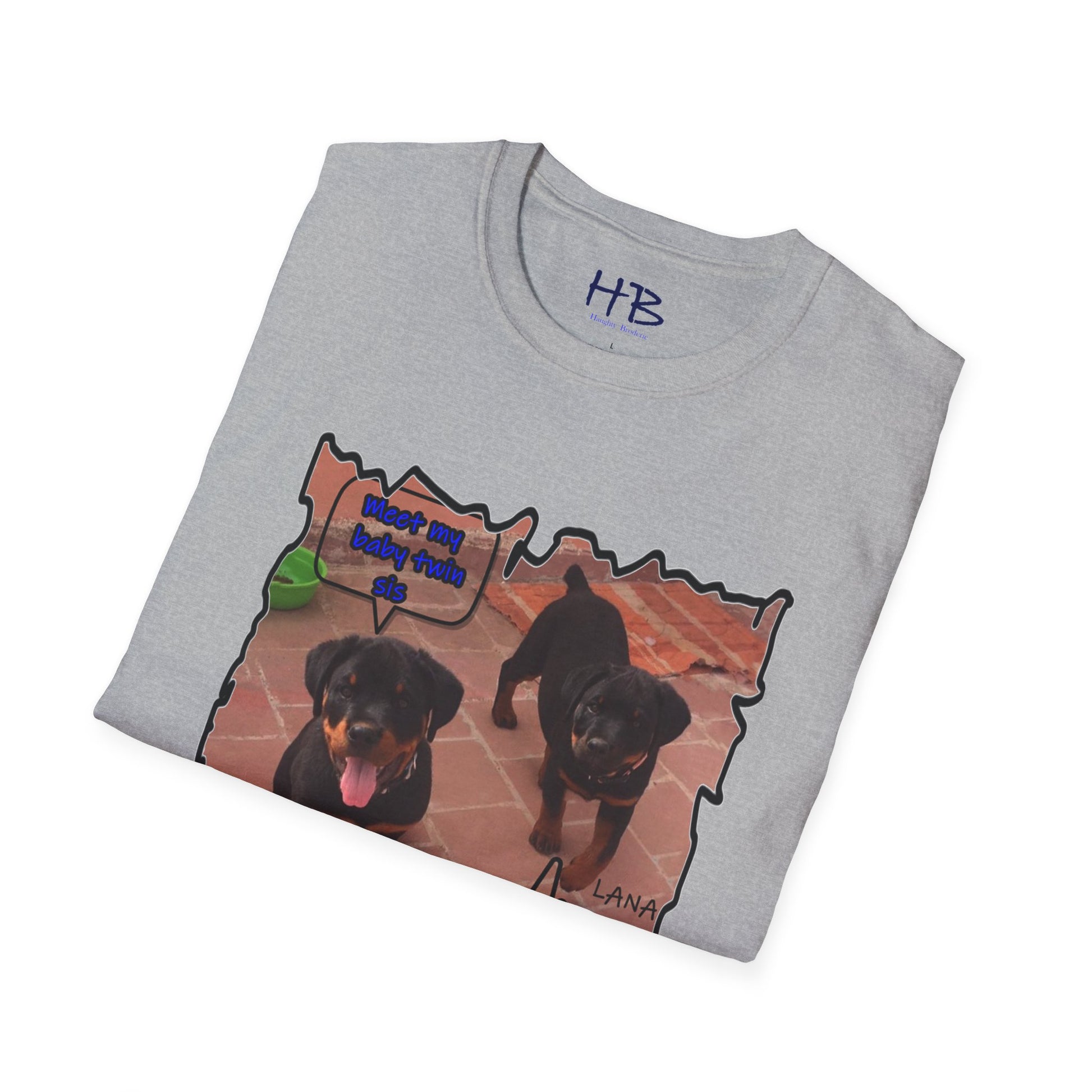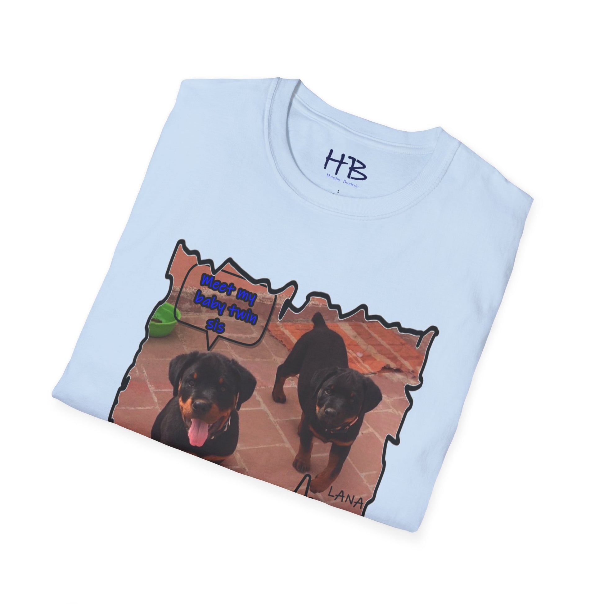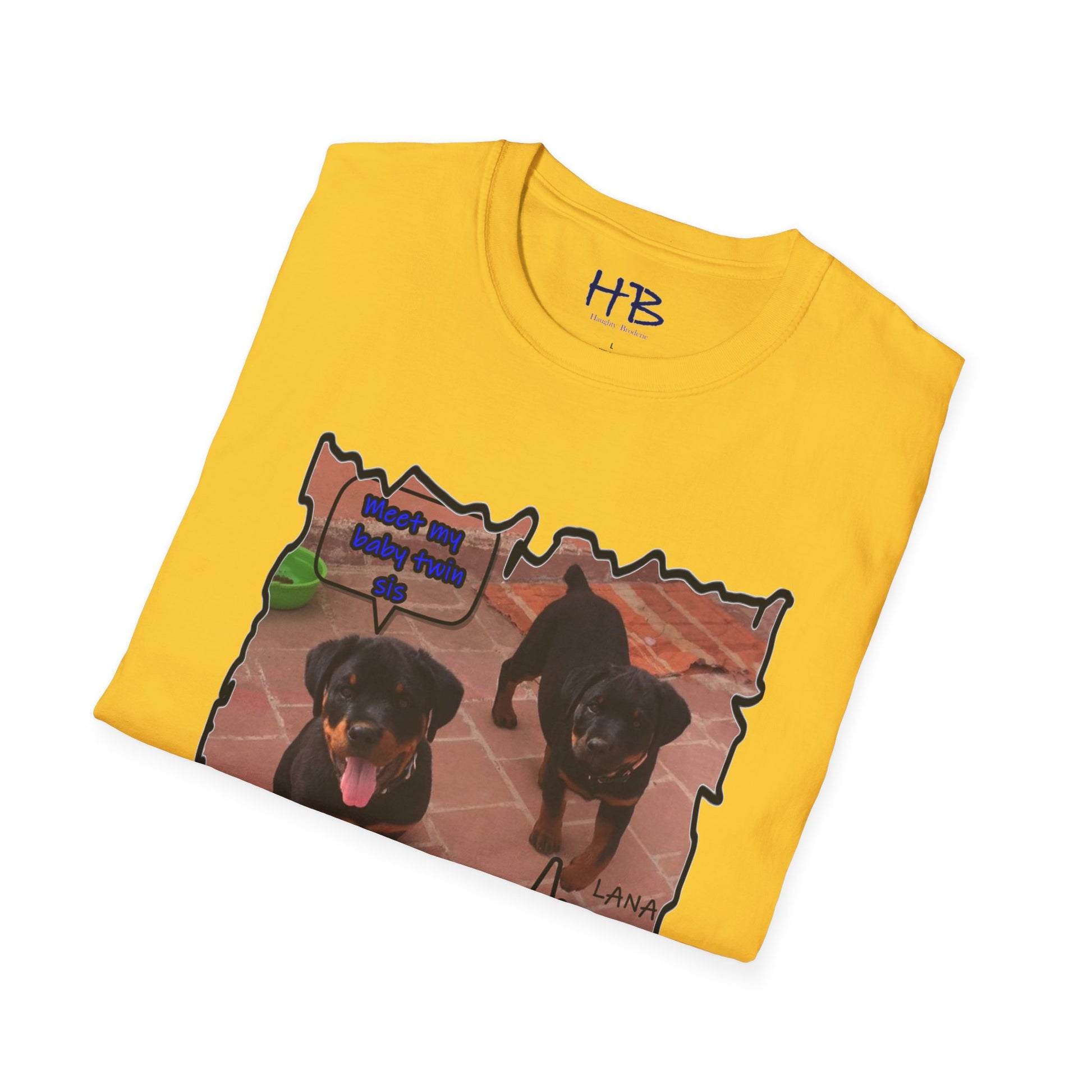 Introducing our remarkable garment featuring an enchanting depiction of two adorable baby Rothweillers engaged in a playful interaction. In this captivating design, Luke, the distinguished male Rothweiller, proudly introduces his baby twin sister, Lana, to the world.