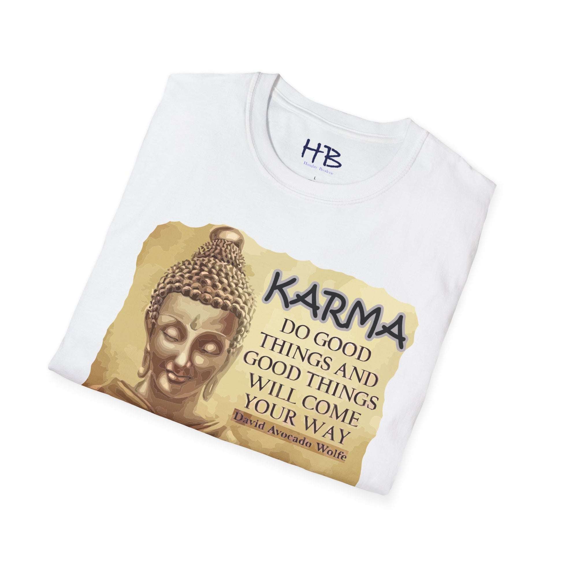 Introducing our captivating tee shirt, featuring a mesmerizing image that encapsulates the essence of karma and the power of positive actions. Picture a serene statue of a meditating person, radiating tranquility and inner peace. Emblazoned with the wise words of David Avocado Wolfe, the text boldly states, "KARMA: Do good things and good things will come your way."