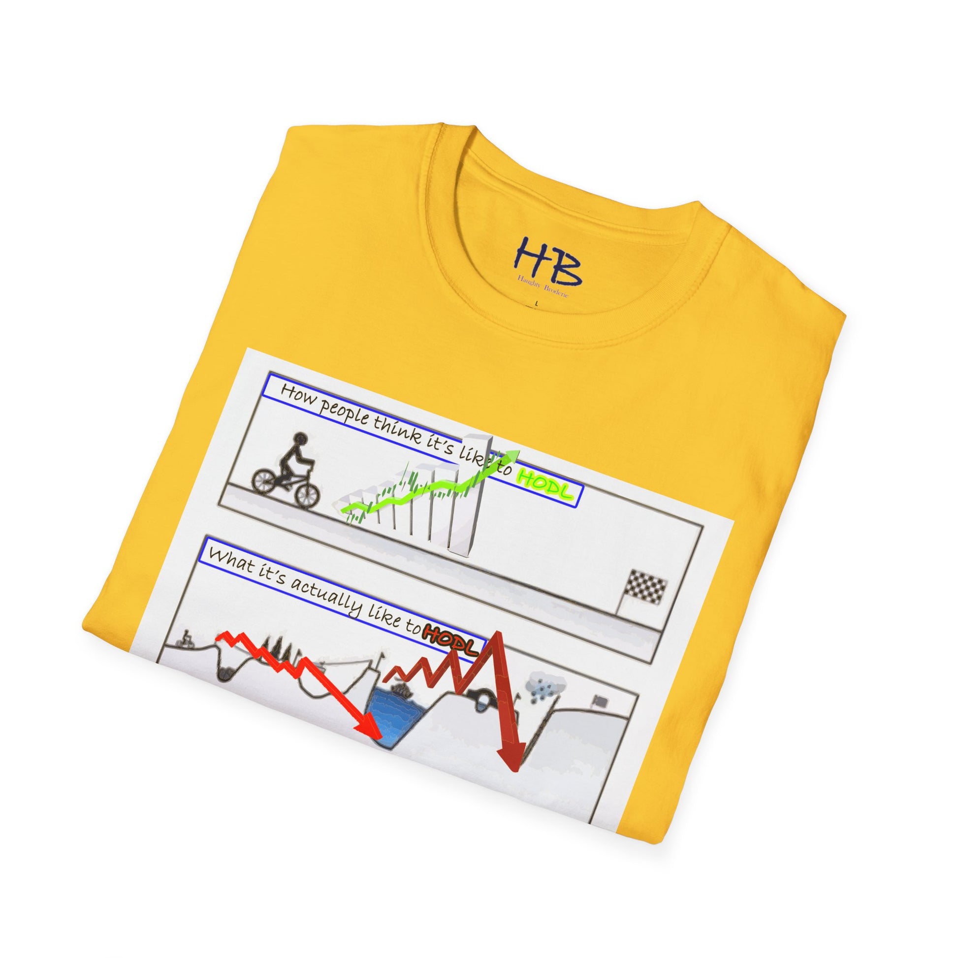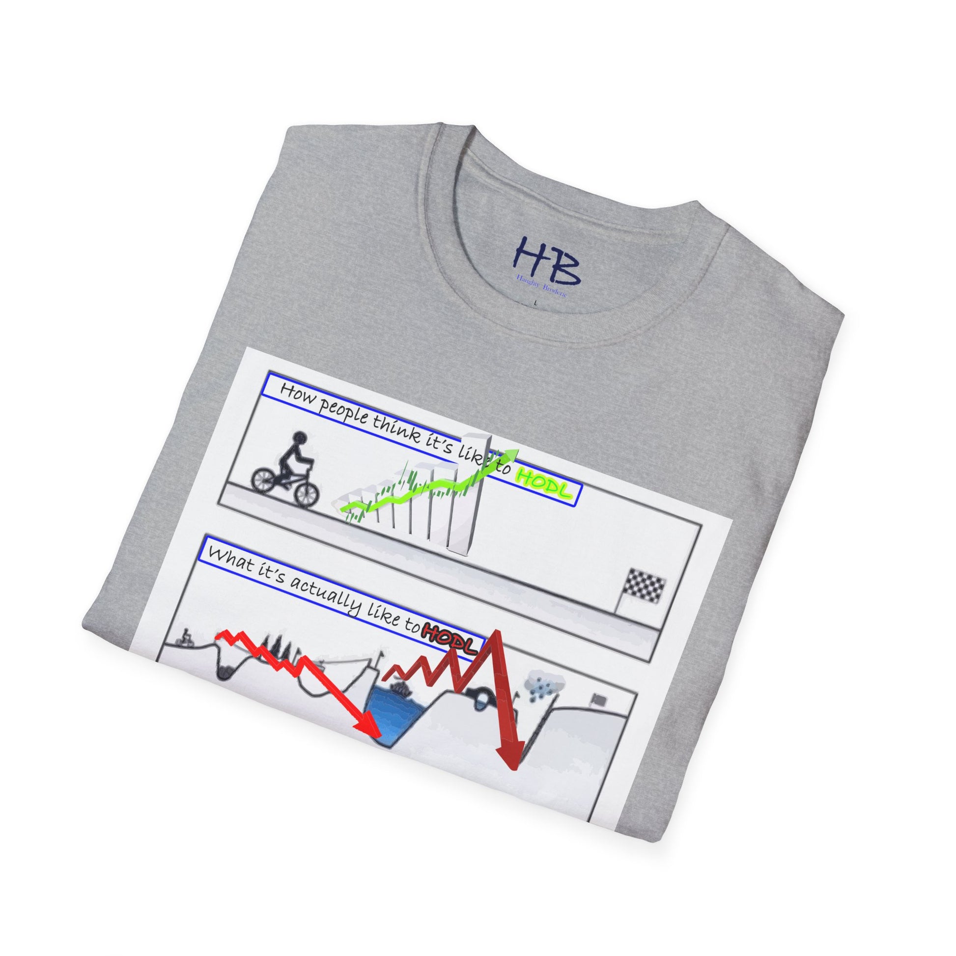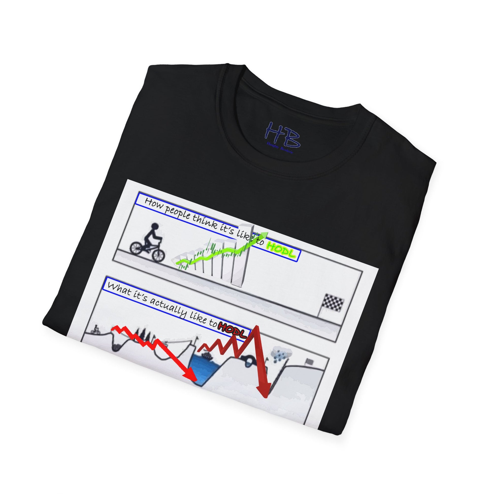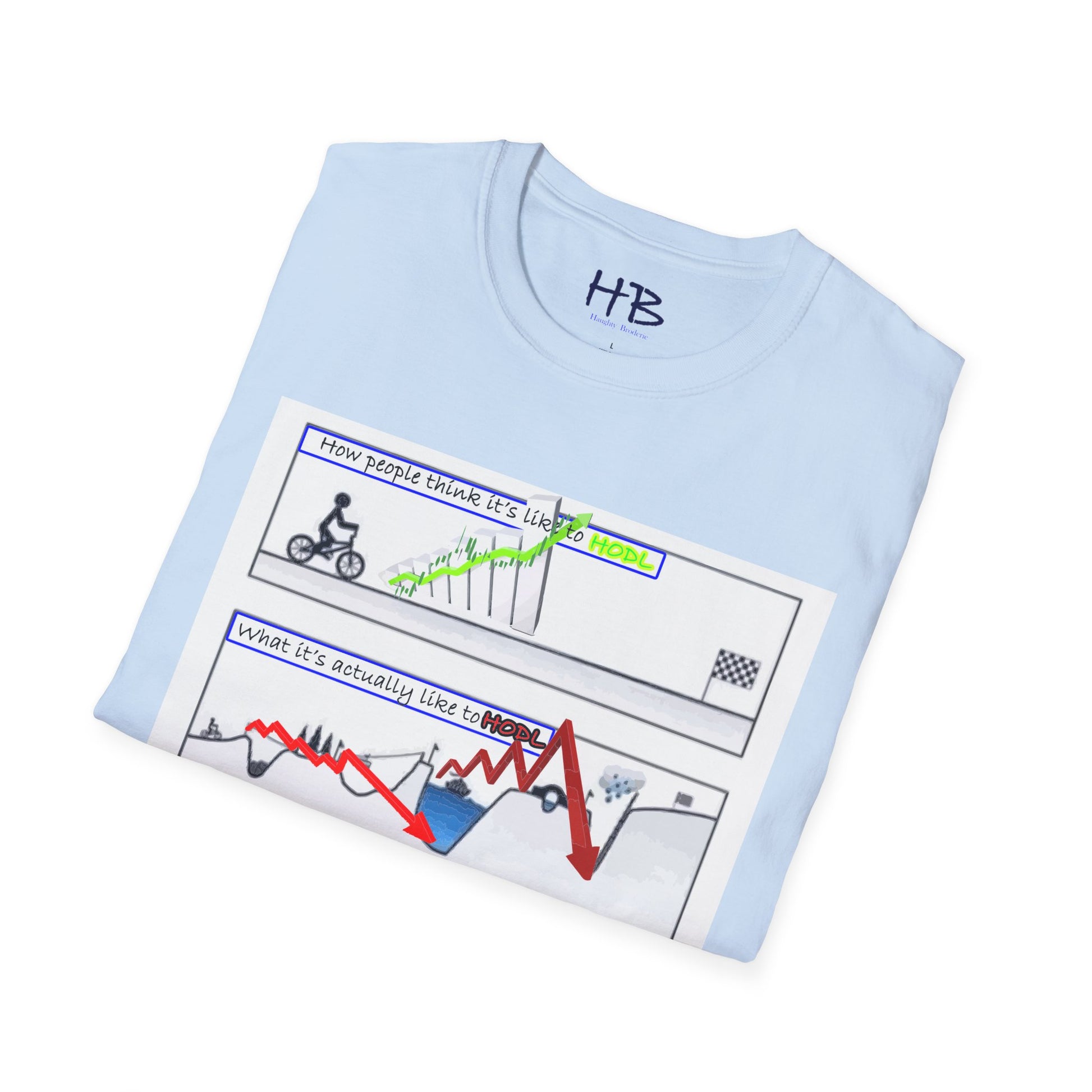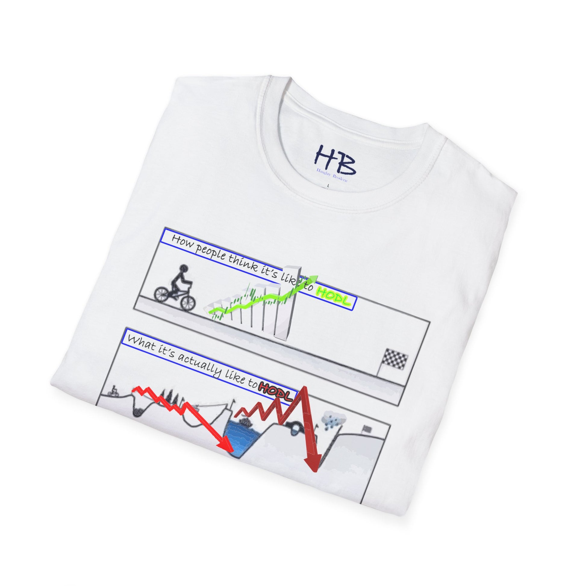 Introducing our new tee shirt - a must-have for all stock market enthusiasts out there! Our tee shirt features an intriguing image detailing two boxes - the first box showcases a stick man riding a bicycle with a stock market chart going long and stock candles all going green, leading to a finish line flag at the end of a straight line. The text reads "How people think it's like to HODL."