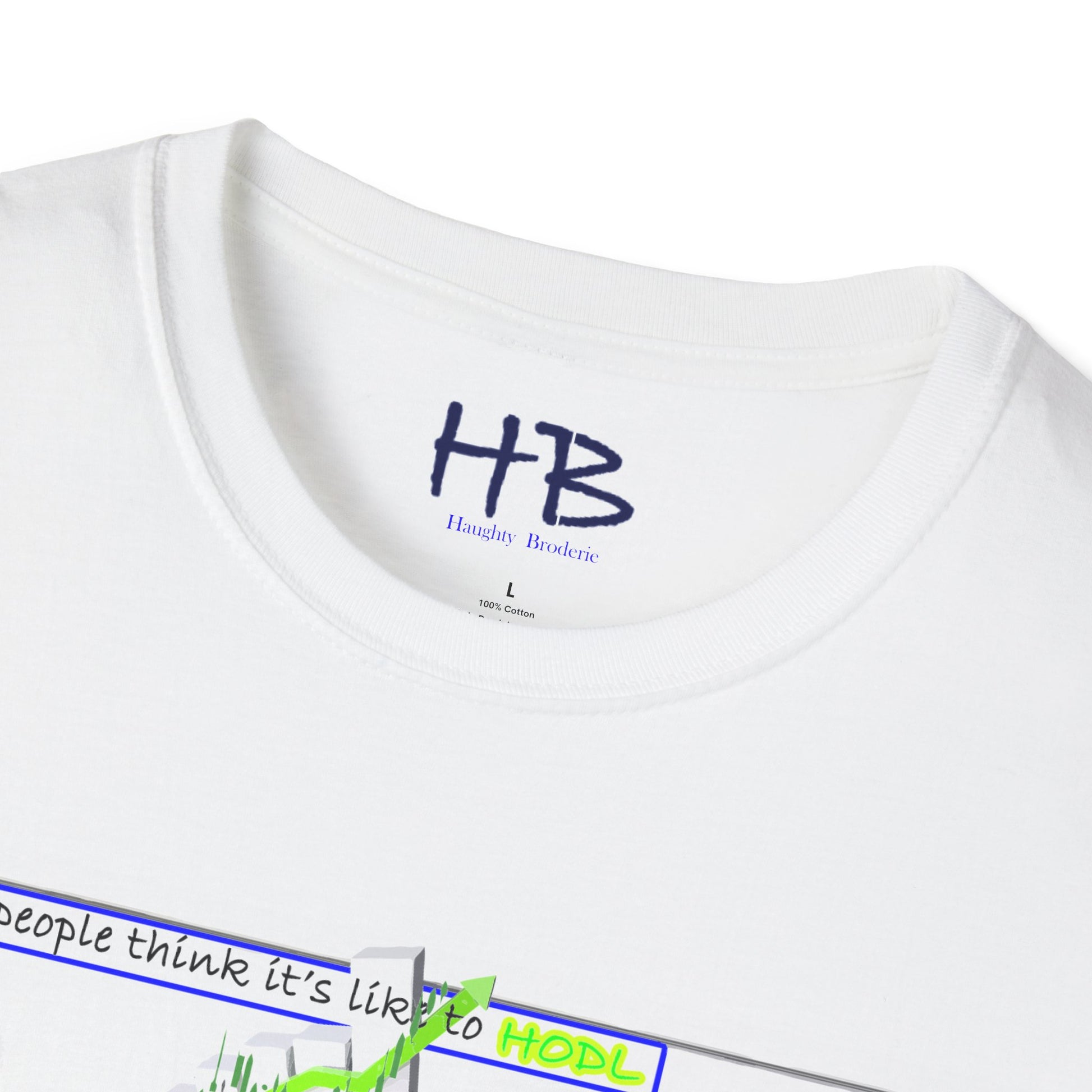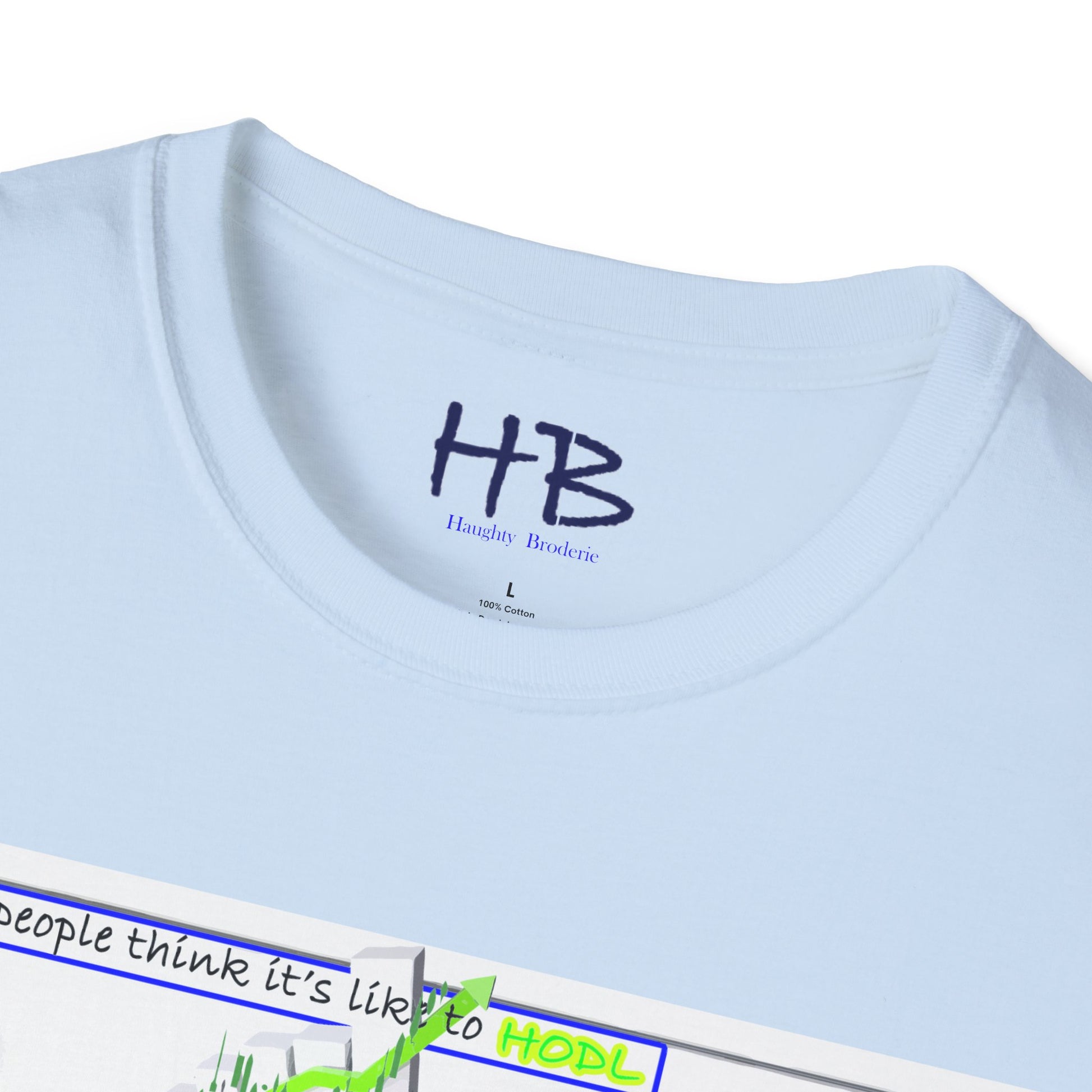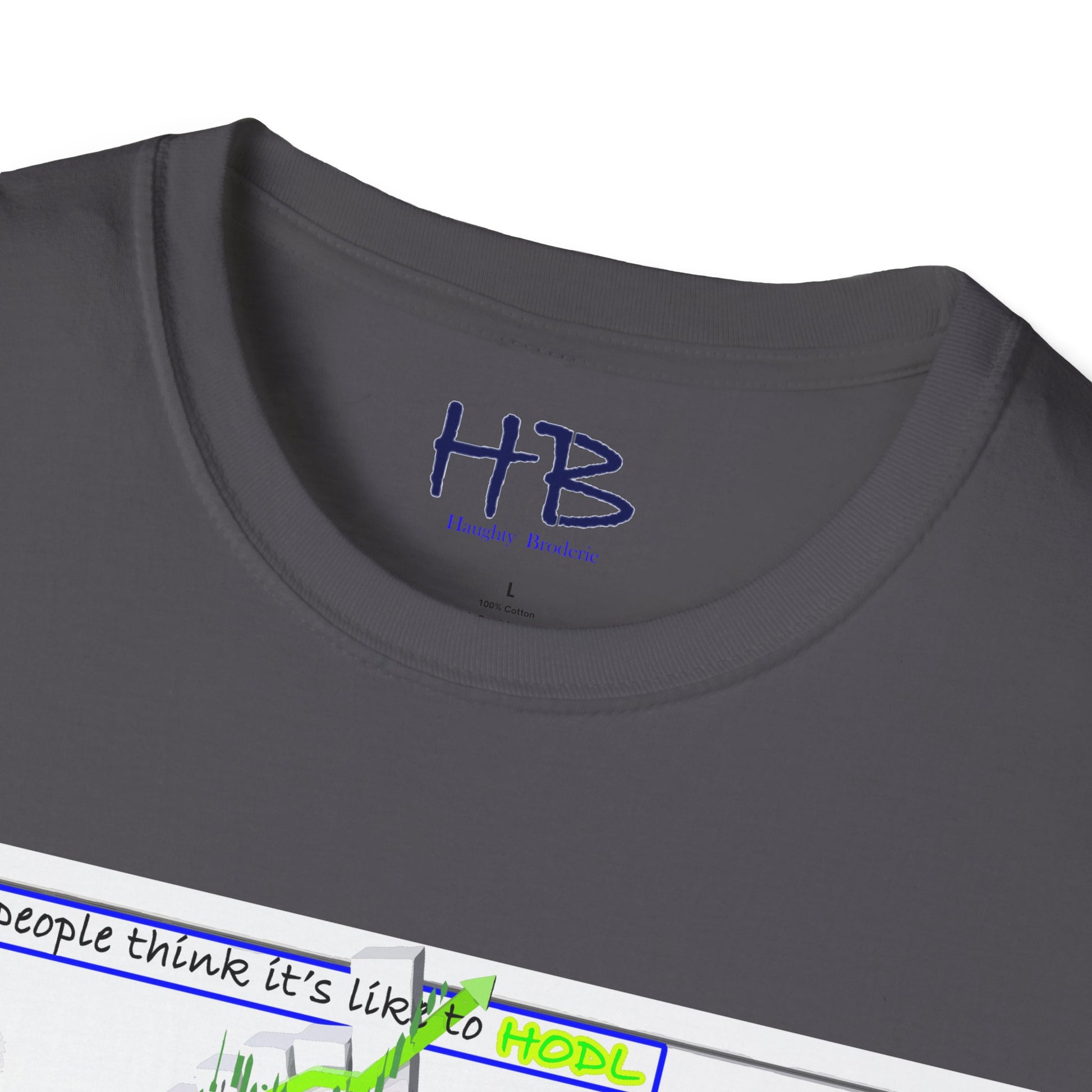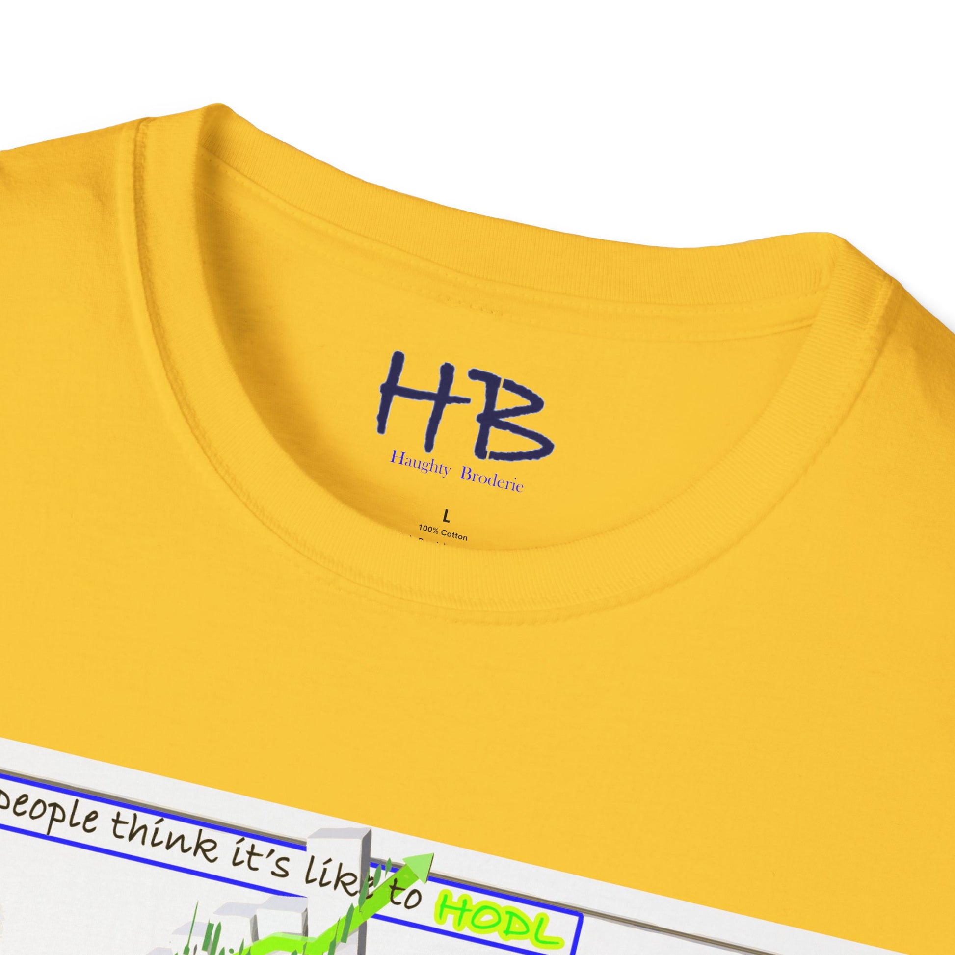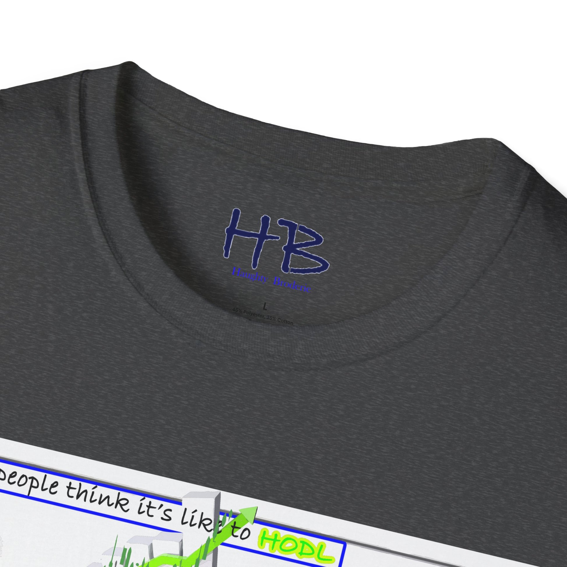 Introducing our new tee shirt - a must-have for all stock market enthusiasts out there! Our tee shirt features an intriguing image detailing two boxes - the first box showcases a stick man riding a bicycle with a stock market chart going long and stock candles all going green, leading to a finish line flag at the end of a straight line. The text reads "How people think it's like to HODL."
