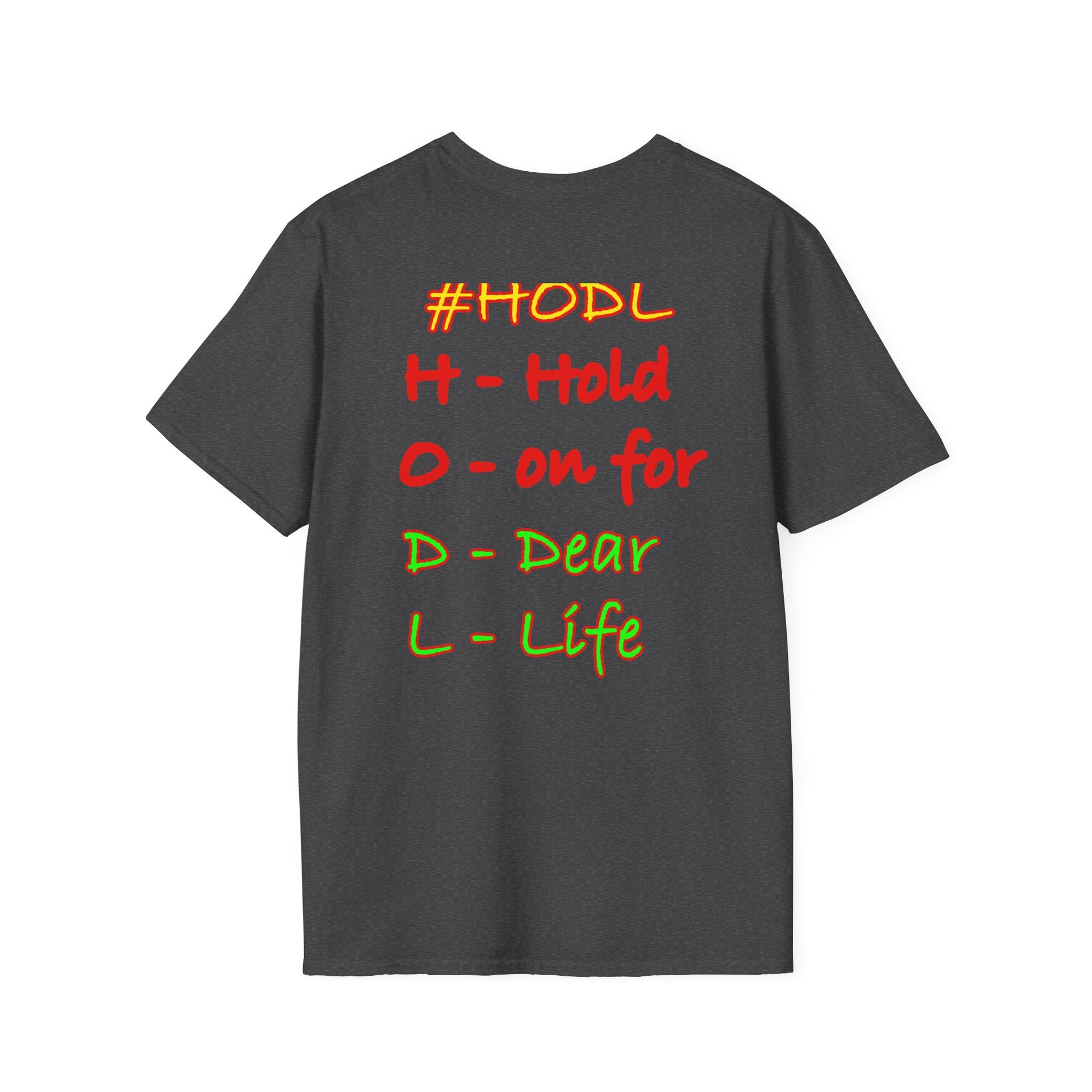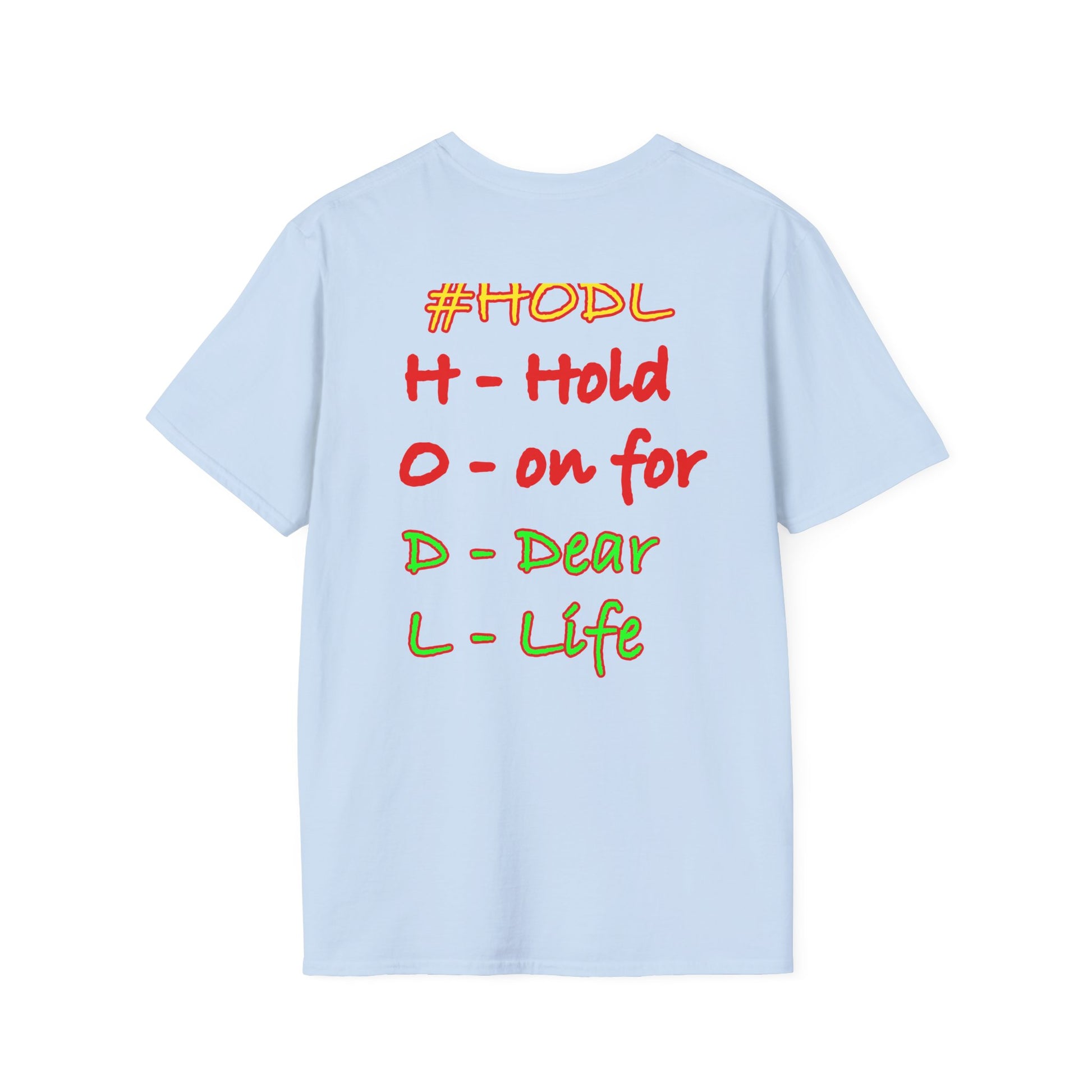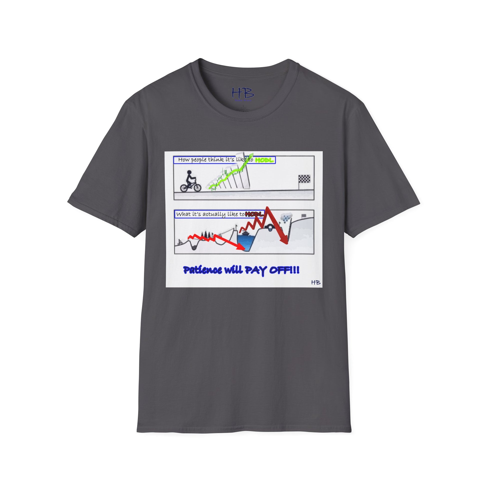 The lower text of the image sends an encouraging message, "Patience will PAY OFF." On the back of the tee shirt, you will find the initials H O D L along with their meanings - H for Hodl, O for On for, D for Dear, and L for Life.