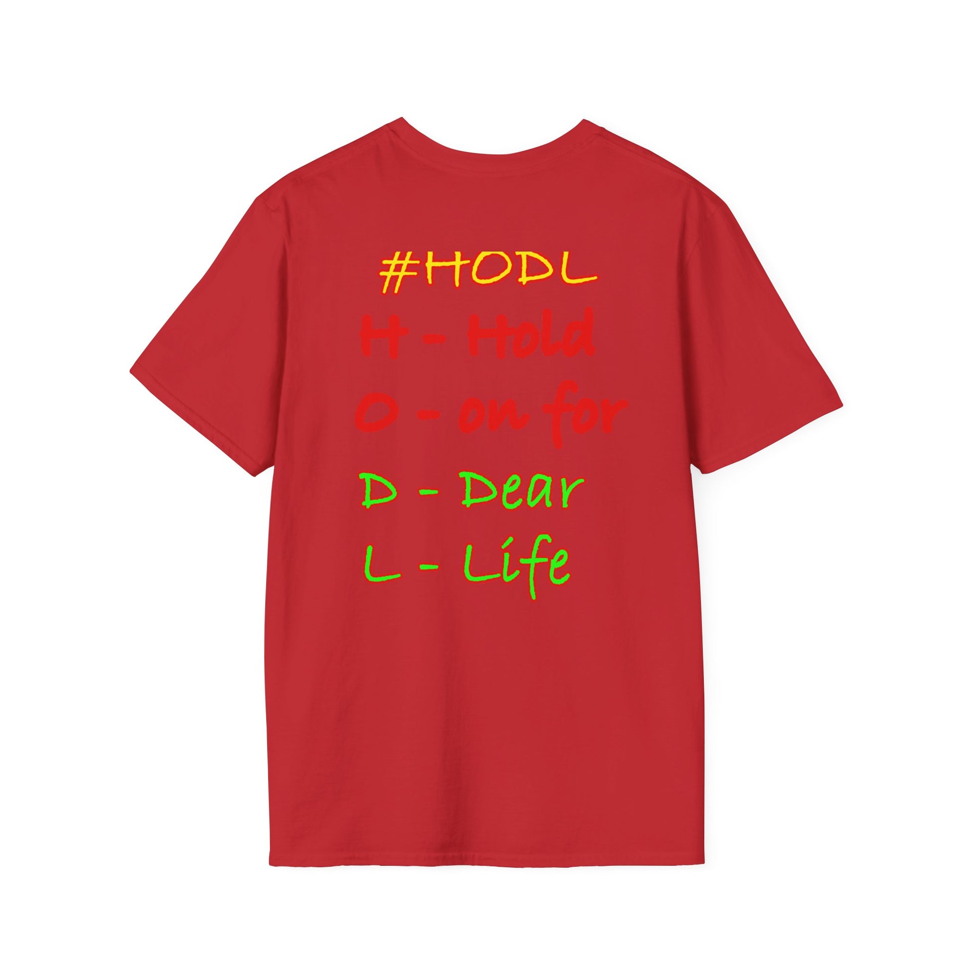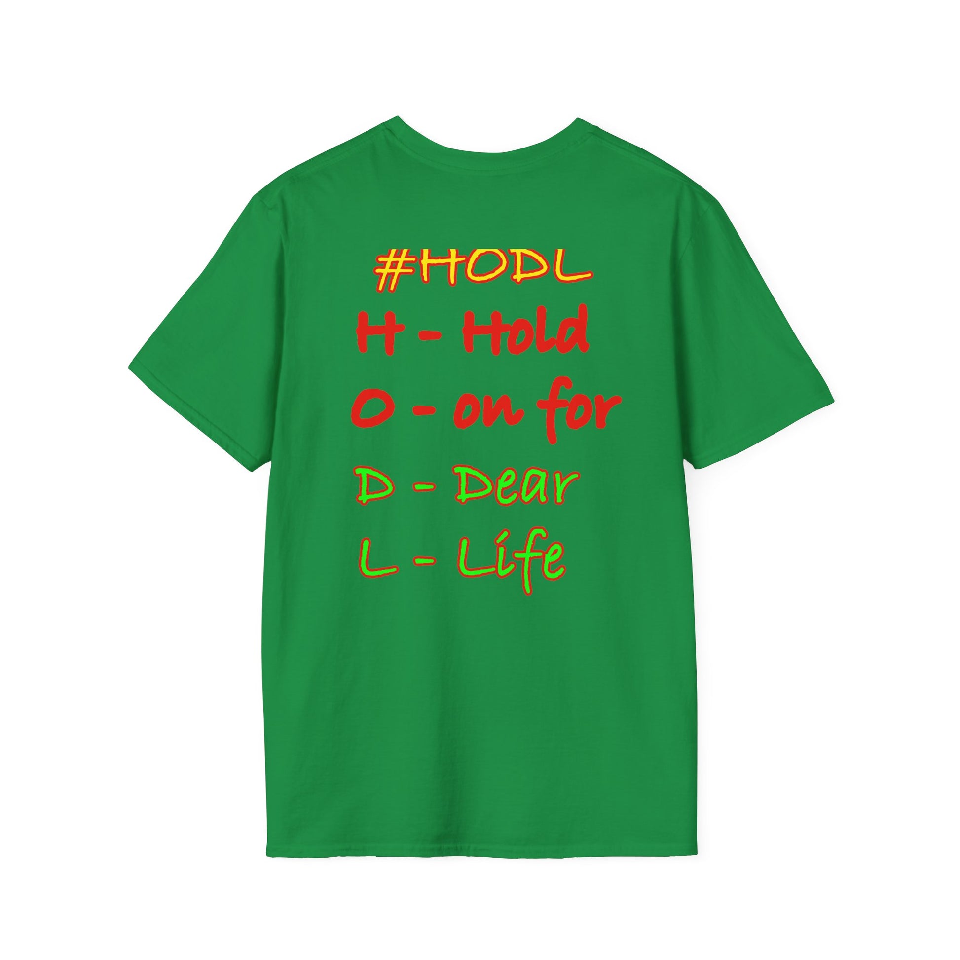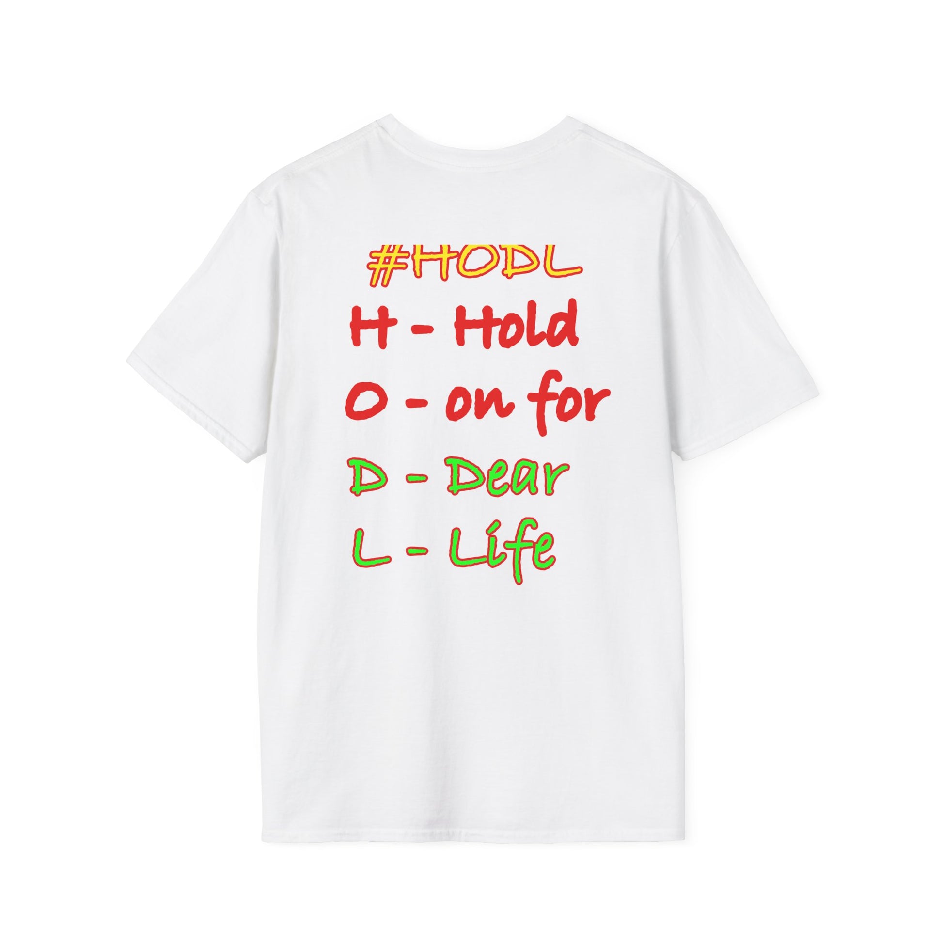 The lower text of the image sends an encouraging message, "Patience will PAY OFF." On the back of the tee shirt, you will find the initials H O D L along with their meanings - H for Hodl, O for On for, D for Dear, and L for Life.