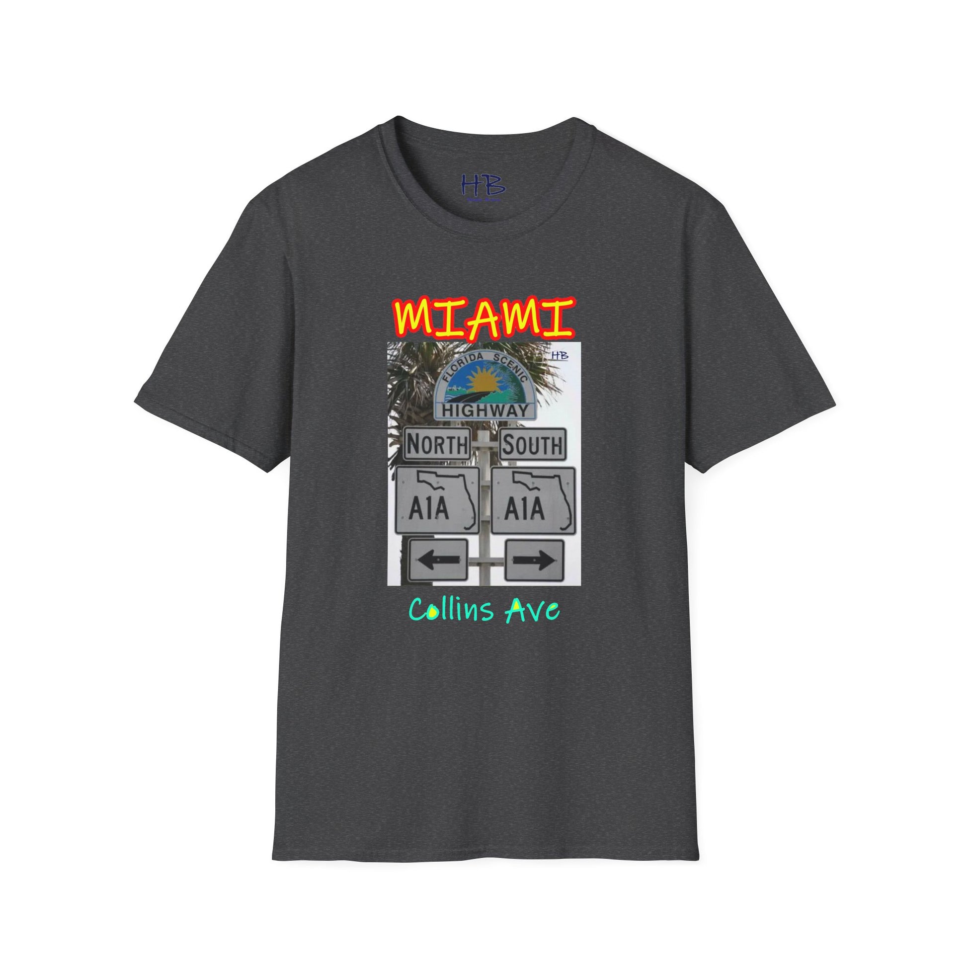 This unique tee shirt prominently showcases a picturesque street sign, an artistic depiction of North and South A1A, elegantly set against the silhouette of the state of Florida. The combination of the sign's quintessential blue-and-green color scheme and the captivating MIAMI Collins Ave inscription evokes the vibrant energy of this world-renowned destination. This design invites you to embark on a journey through Miami's most iconic thoroughfare, where moments of fun, luxury, and adventure are waiting to be discovered.