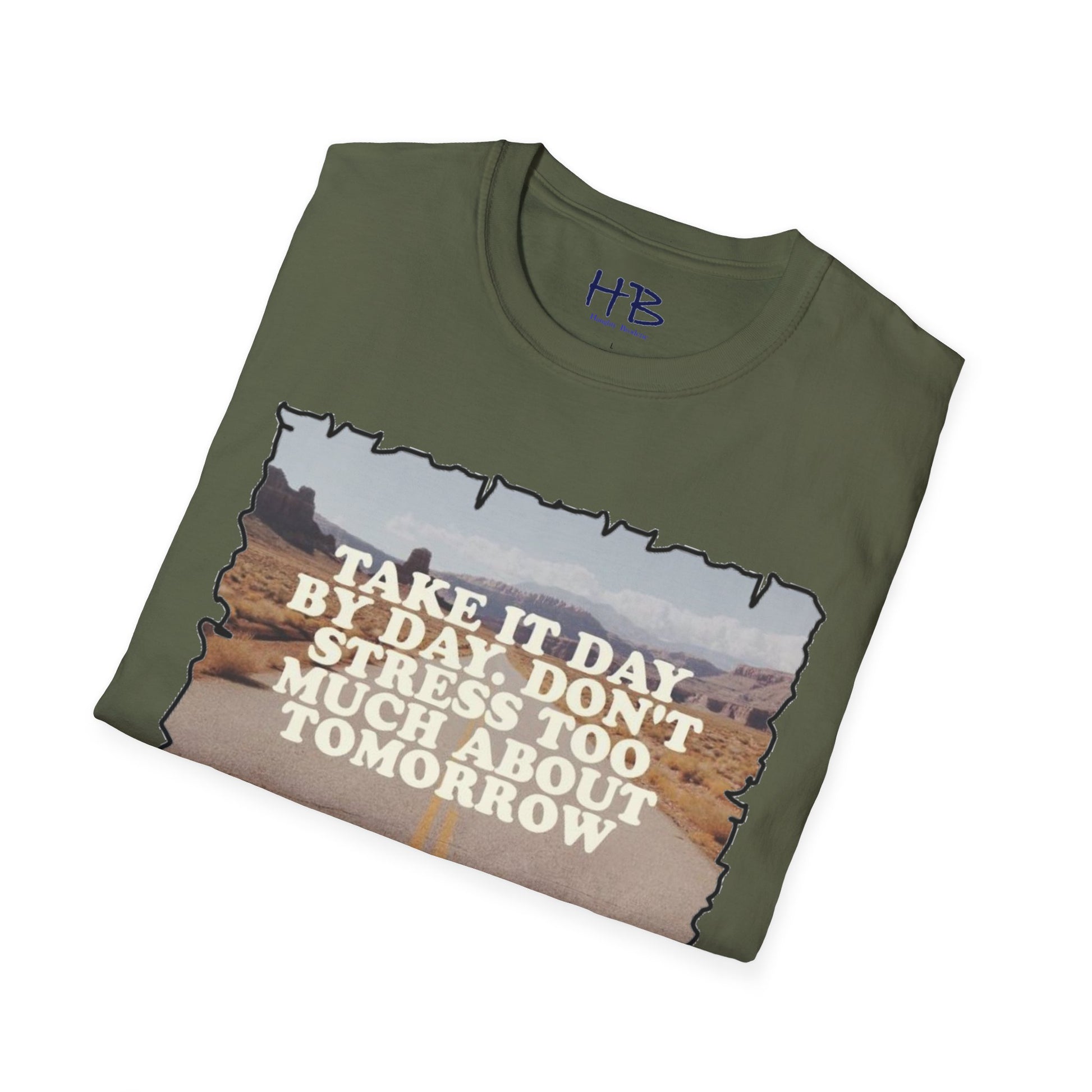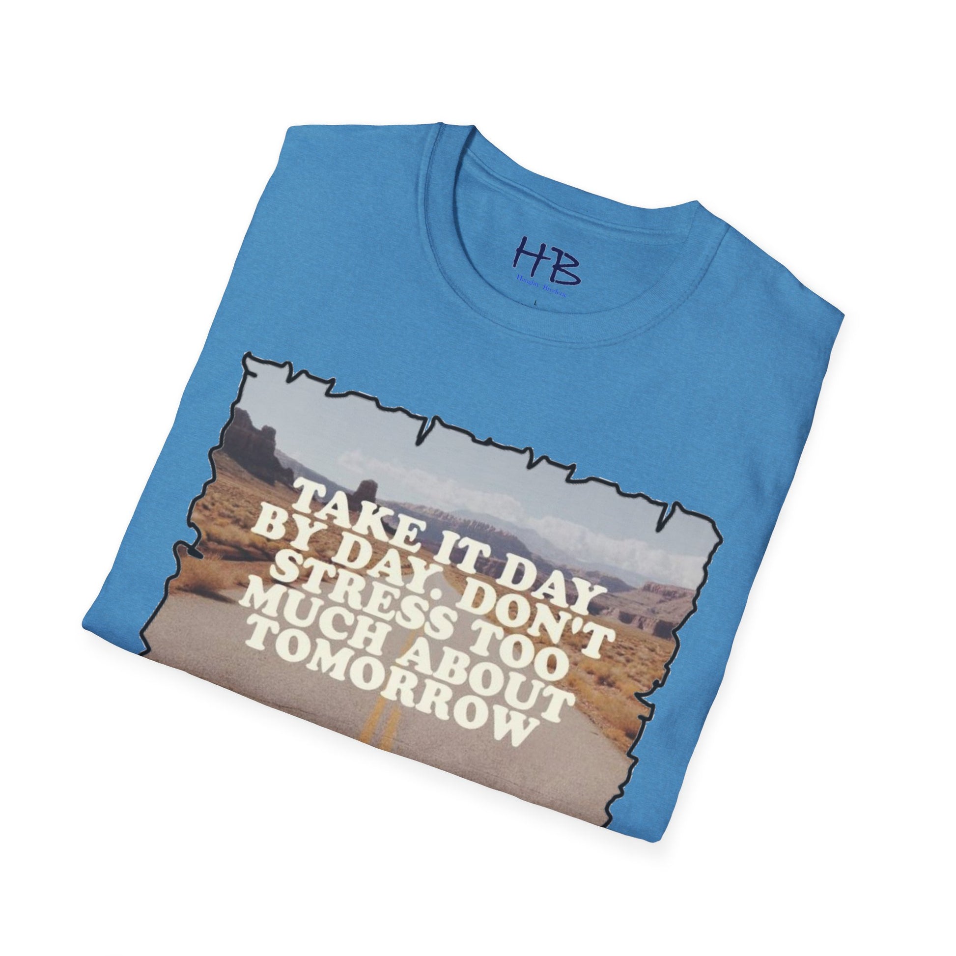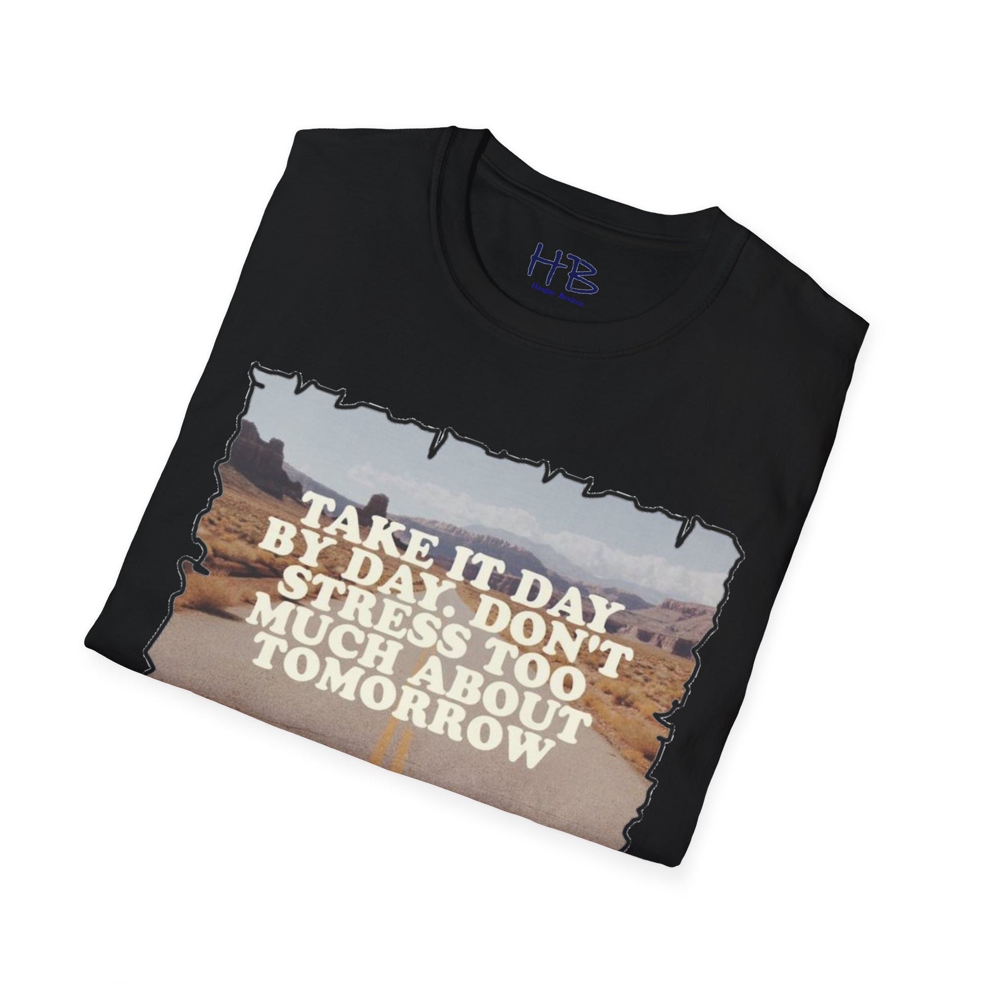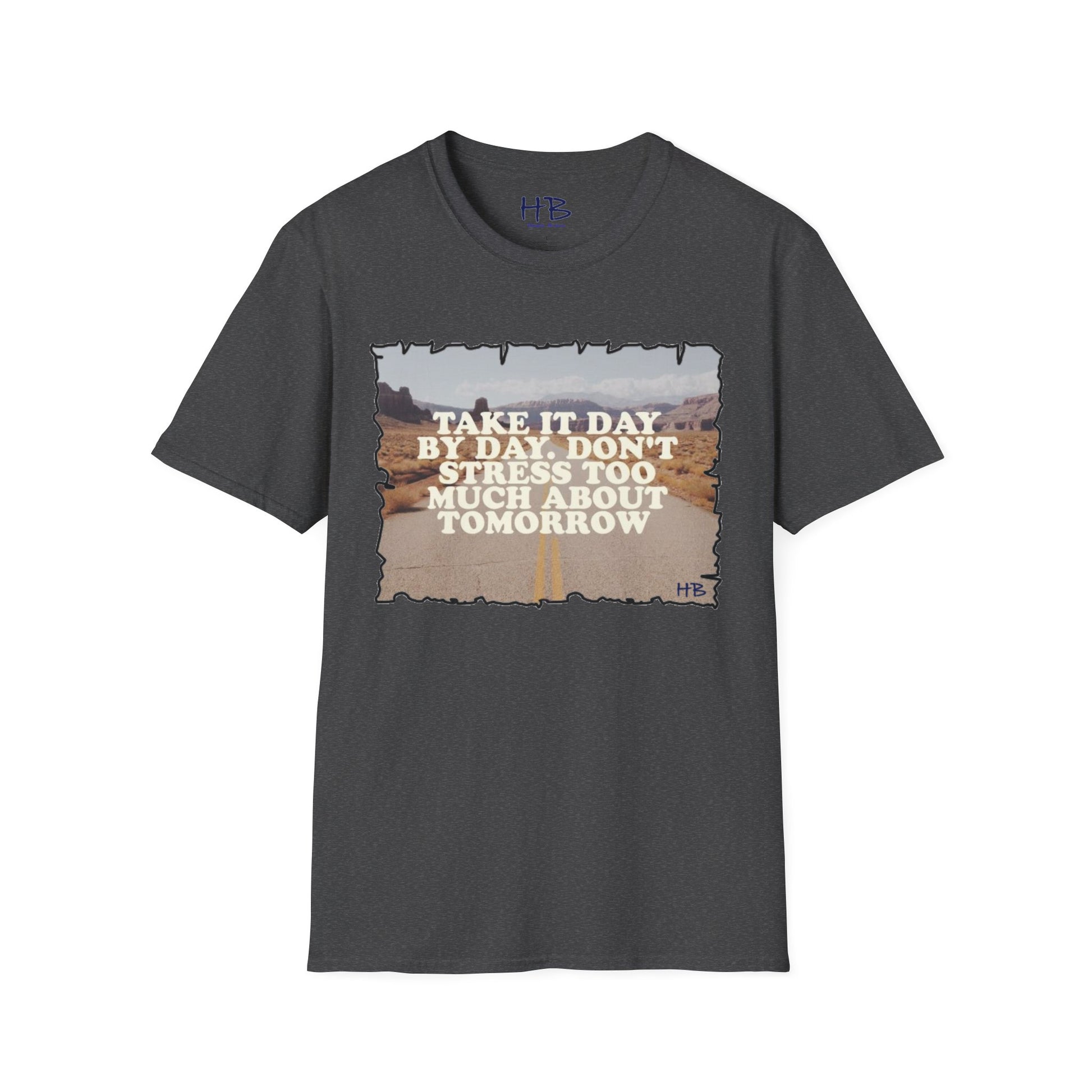 Introducing our captivating tee shirt featuring a mesmerizing view of Highway 66 leading to an unending expanse of the horizon. Accompanied by the profound statement, "Take it day by day. Don't stress too much about Tomorrow," this tee shirt holds profound significance in today's world.