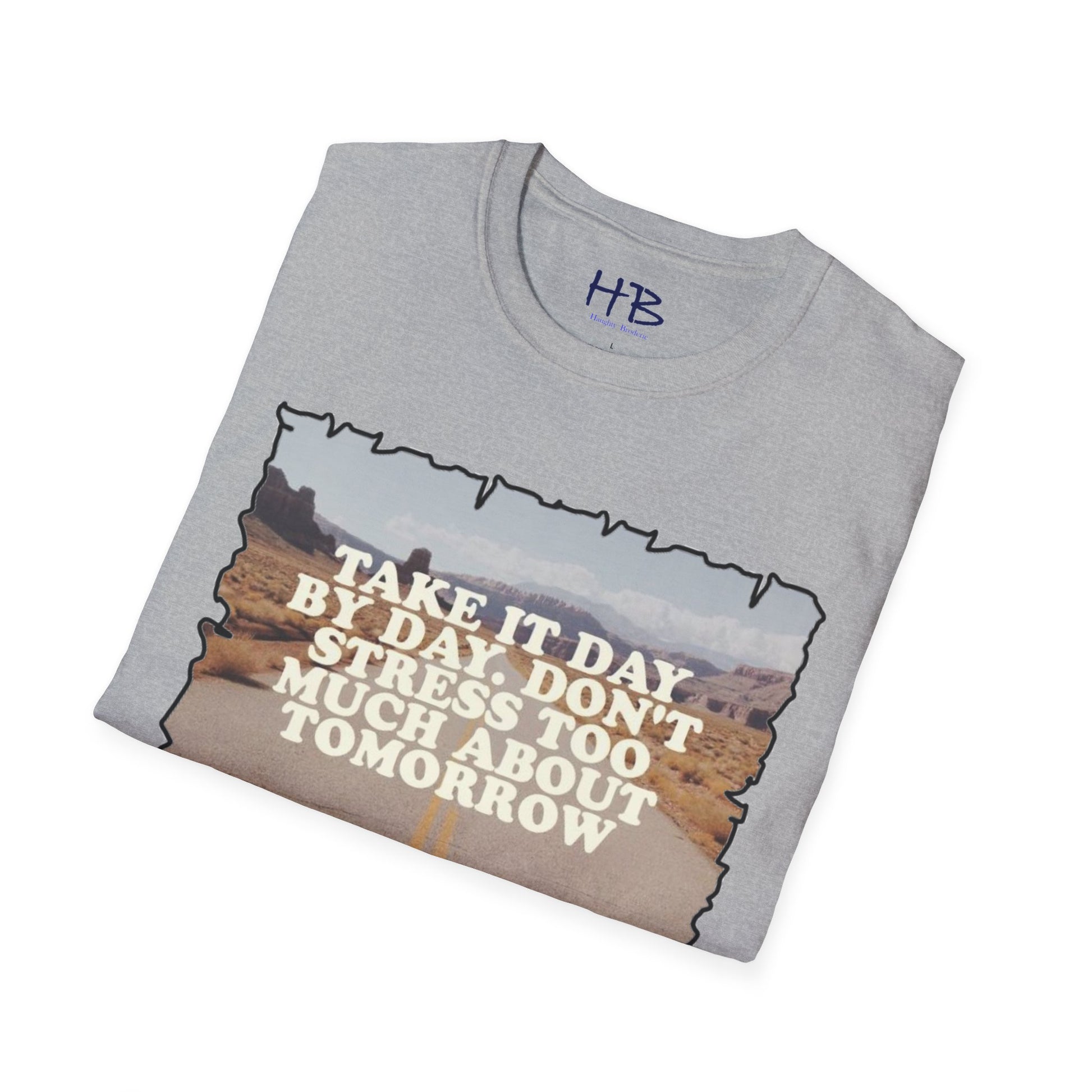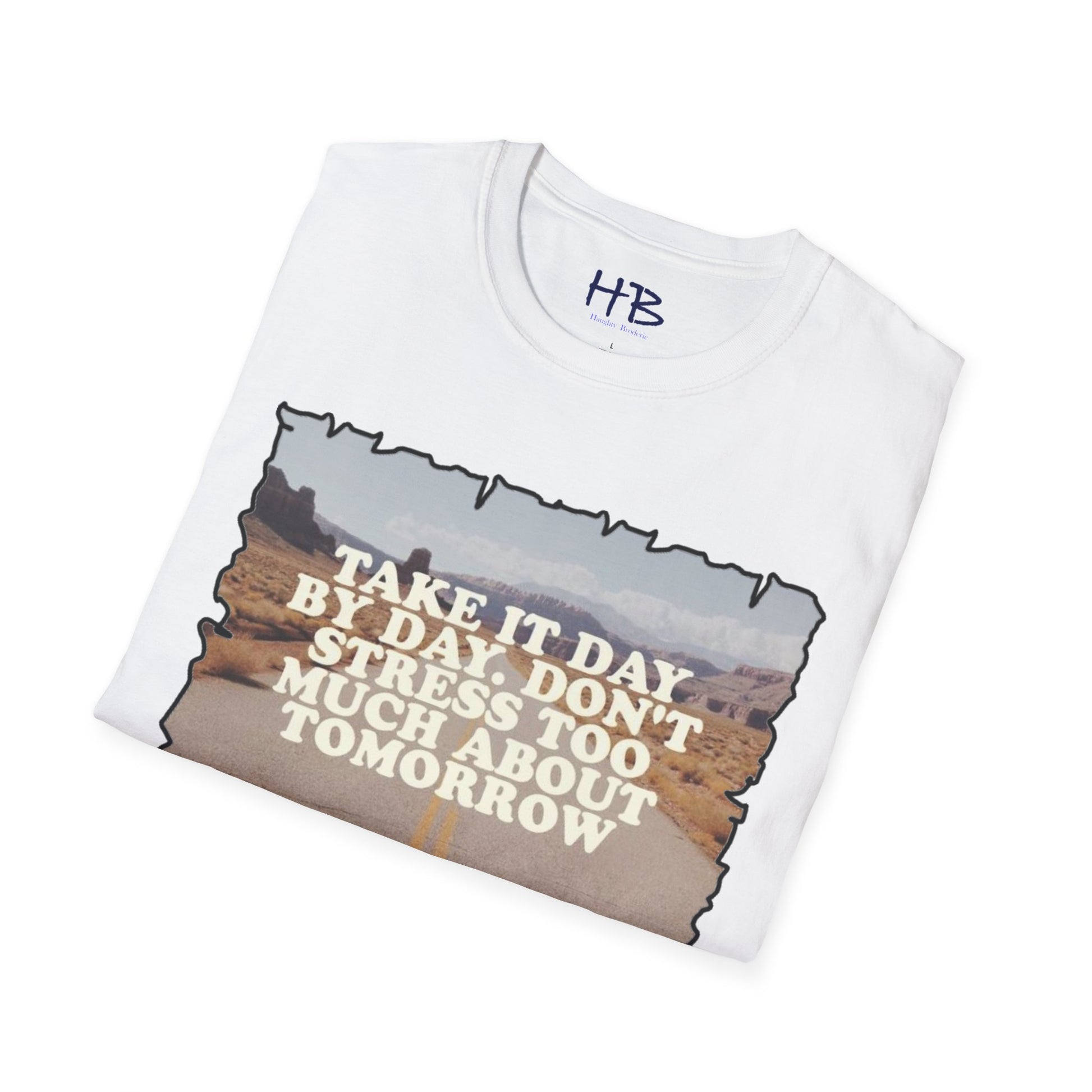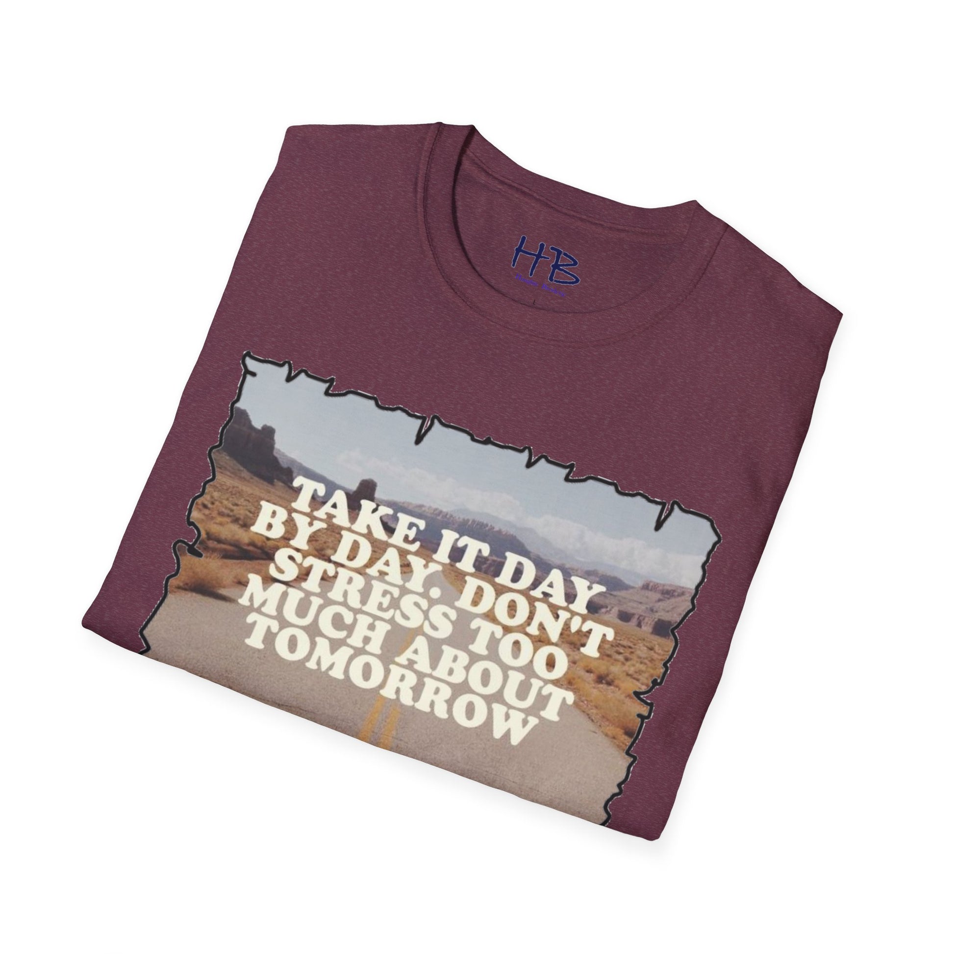 Introducing our captivating tee shirt featuring a mesmerizing view of Highway 66 leading to an unending expanse of the horizon. Accompanied by the profound statement, "Take it day by day. Don't stress too much about Tomorrow," this tee shirt holds profound significance in today's world.
