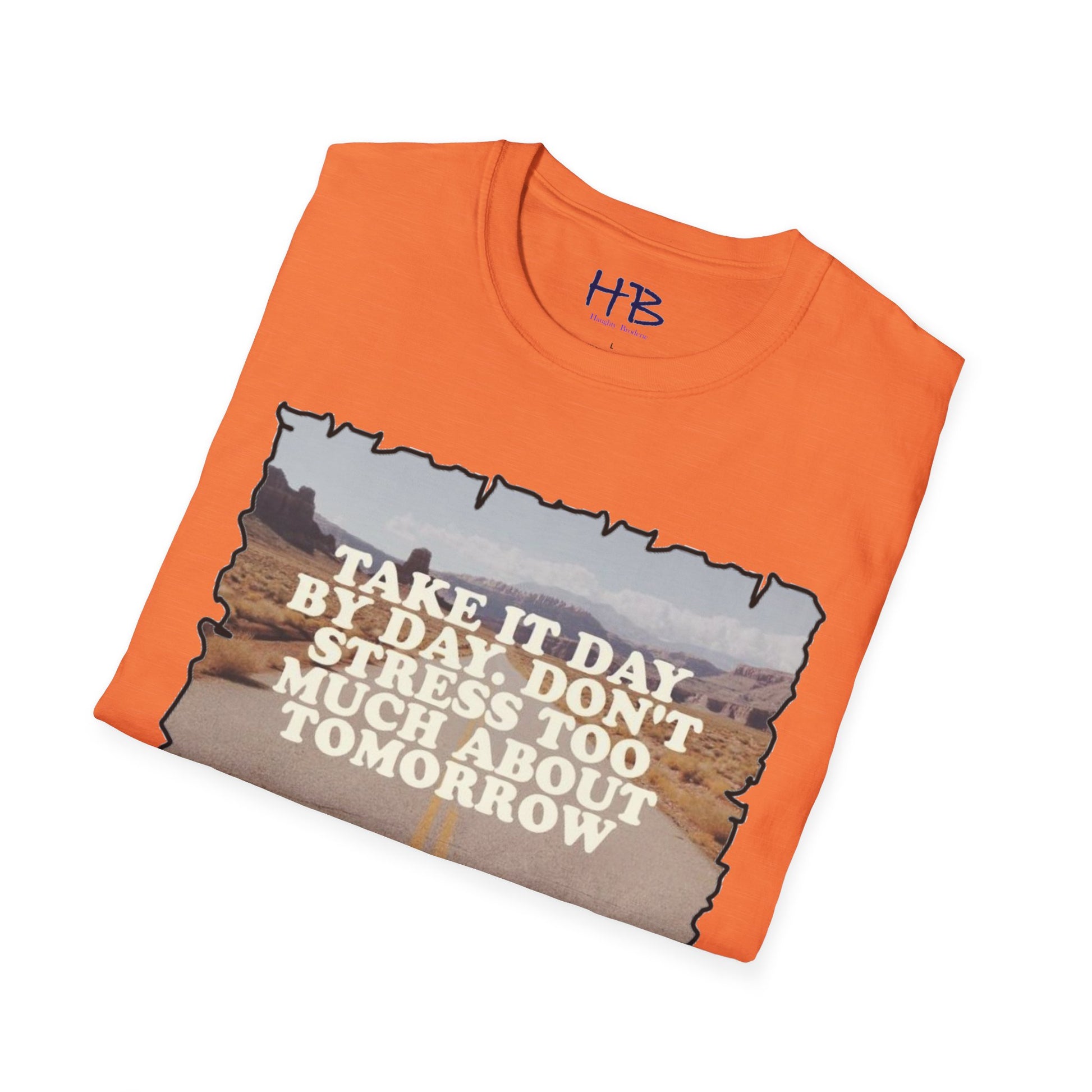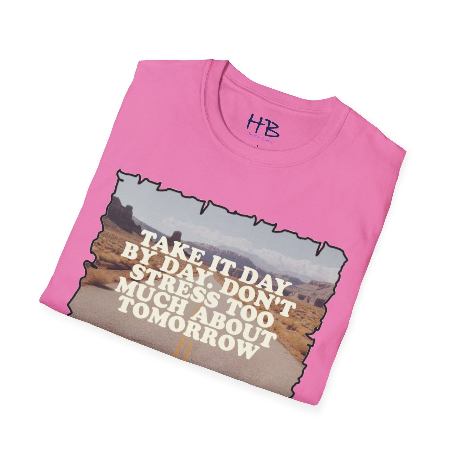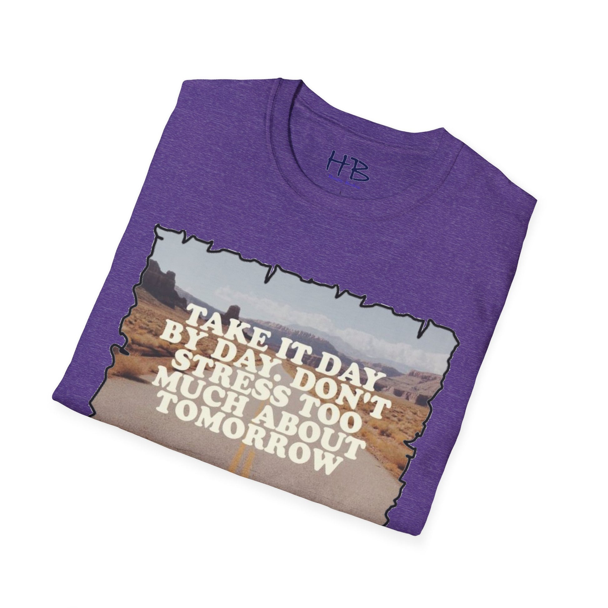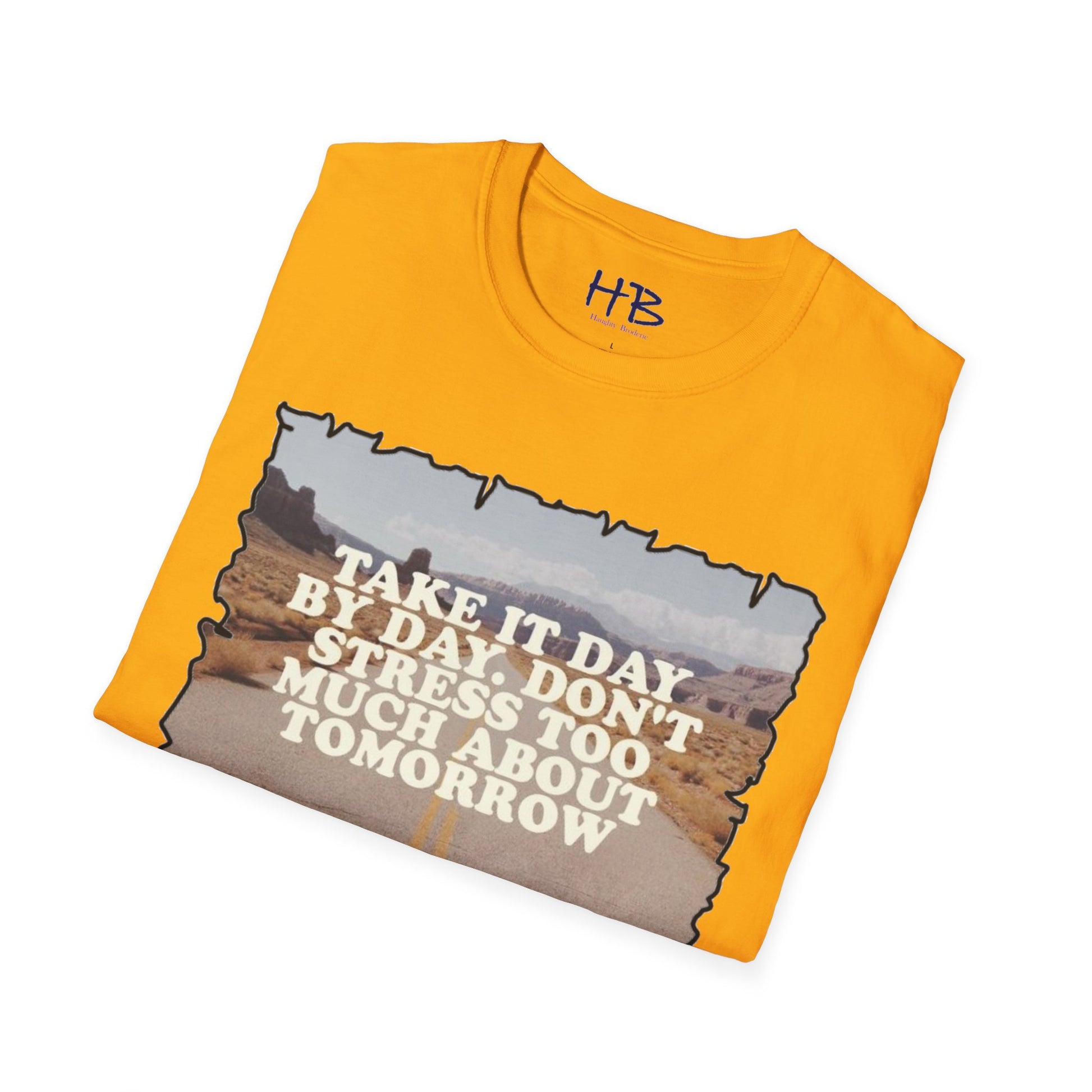 Introducing our captivating tee shirt featuring a mesmerizing view of Highway 66 leading to an unending expanse of the horizon. Accompanied by the profound statement, "Take it day by day. Don't stress too much about Tomorrow," this tee shirt holds profound significance in today's world.